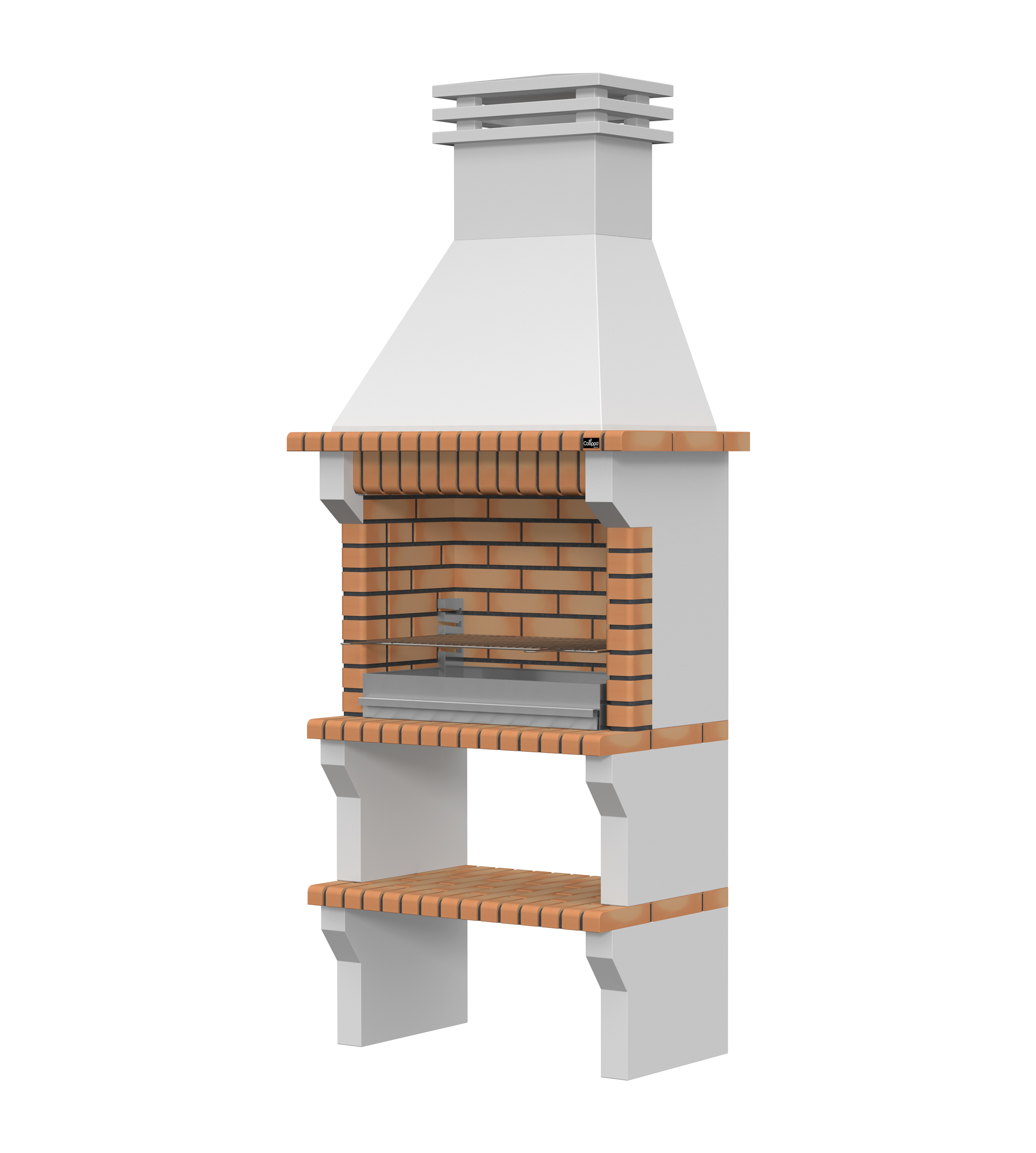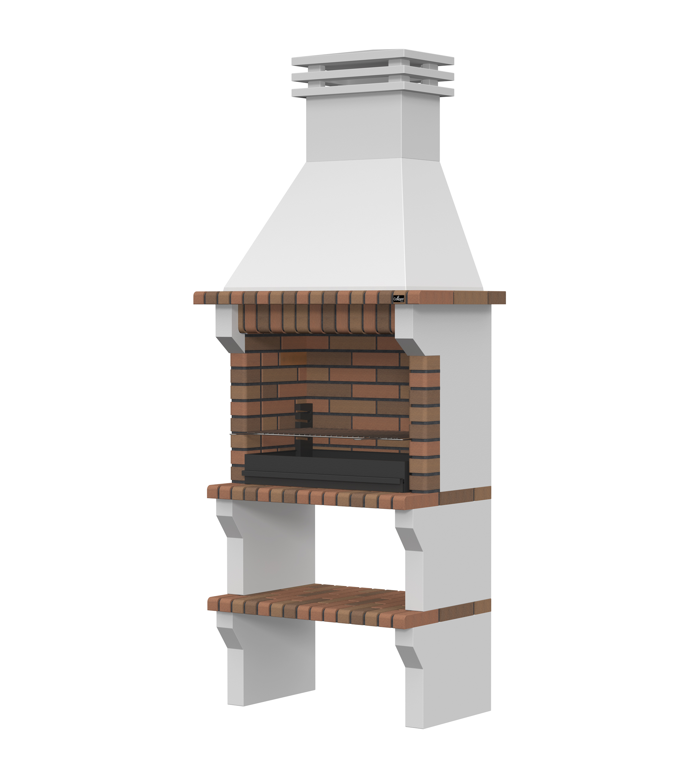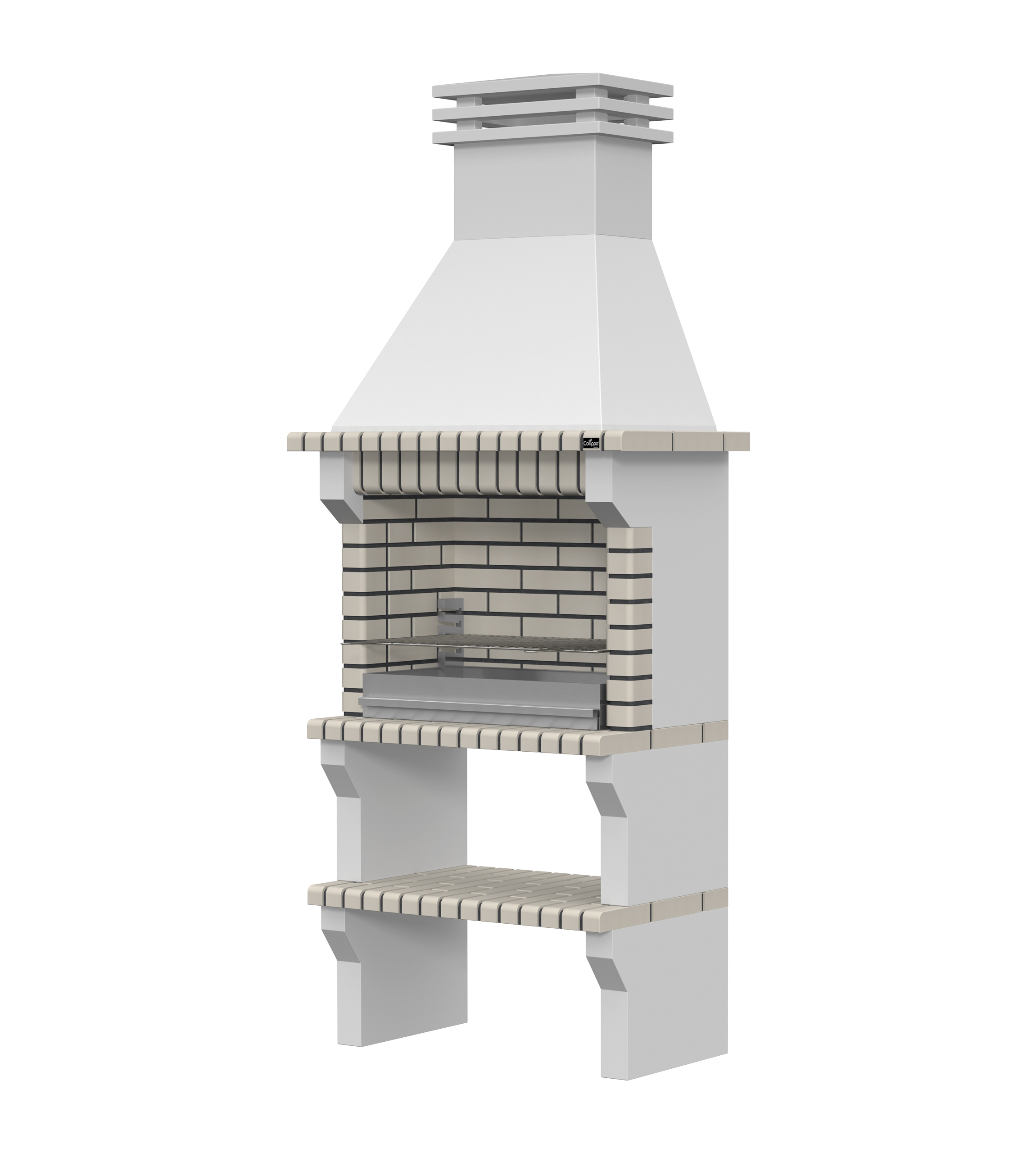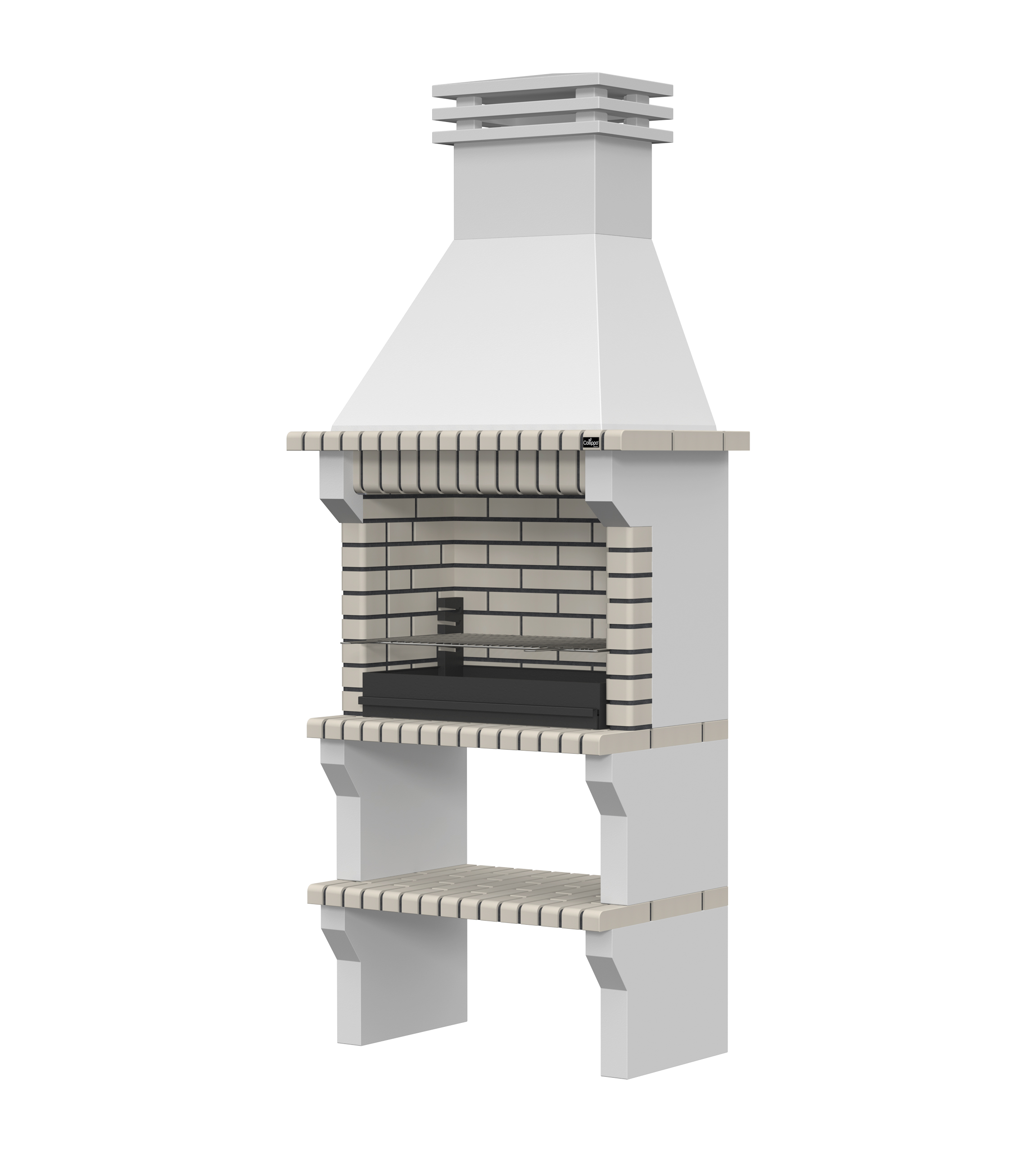 Peças em micro betão cinzento liso e micro betão cinzento texturado; zona de fogo em tijolo e cimento refractário