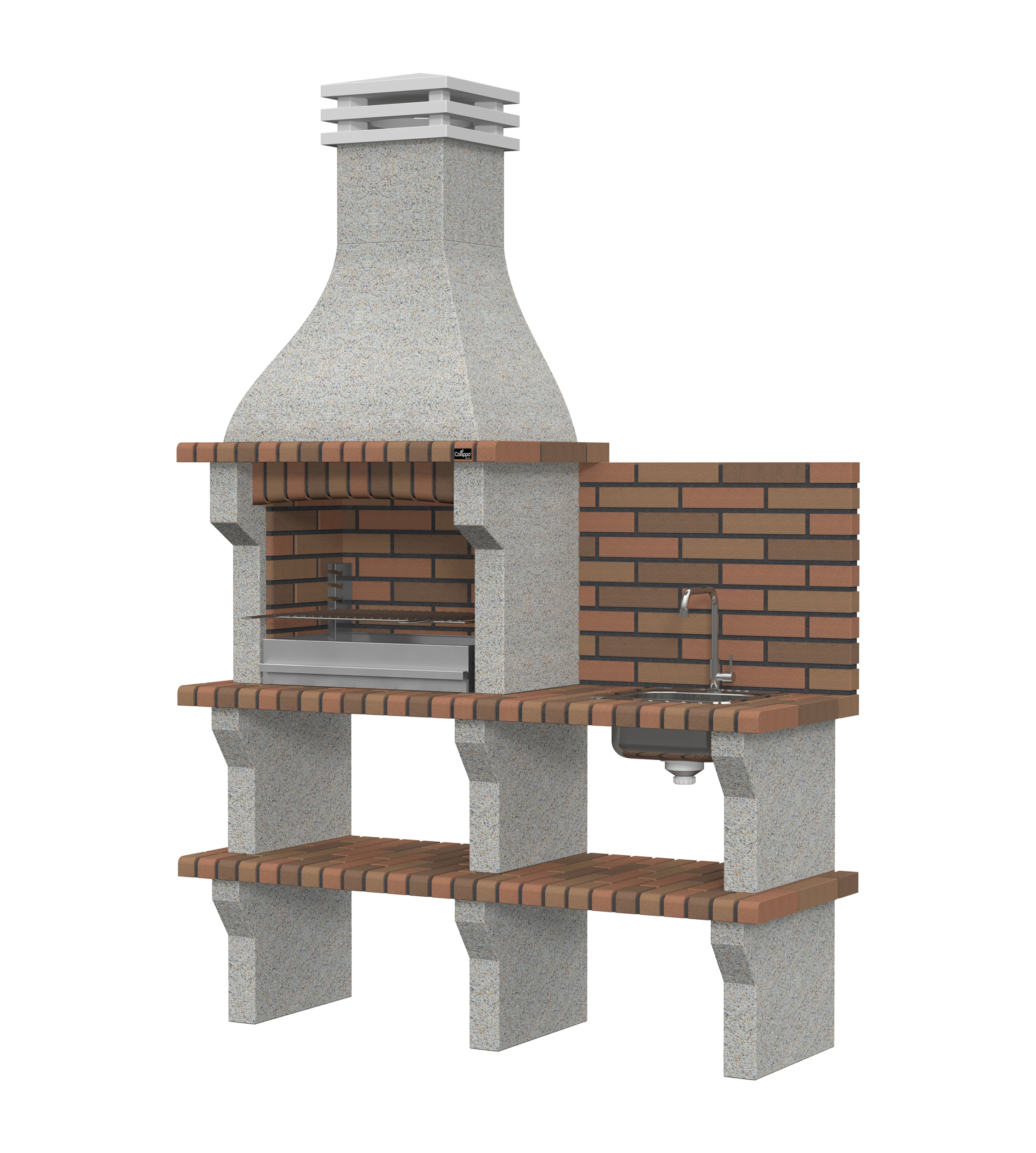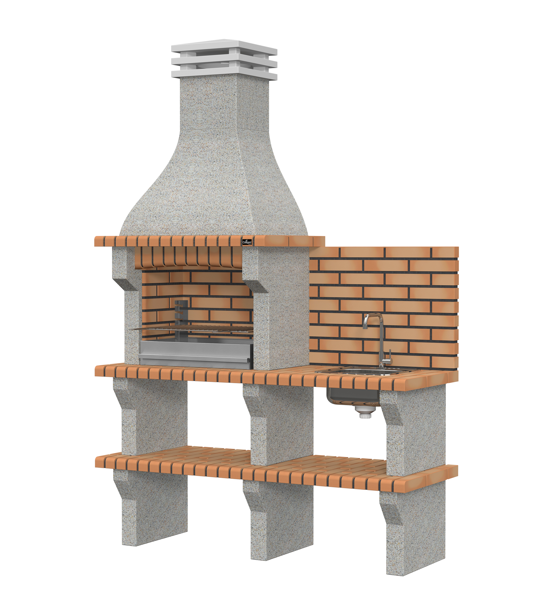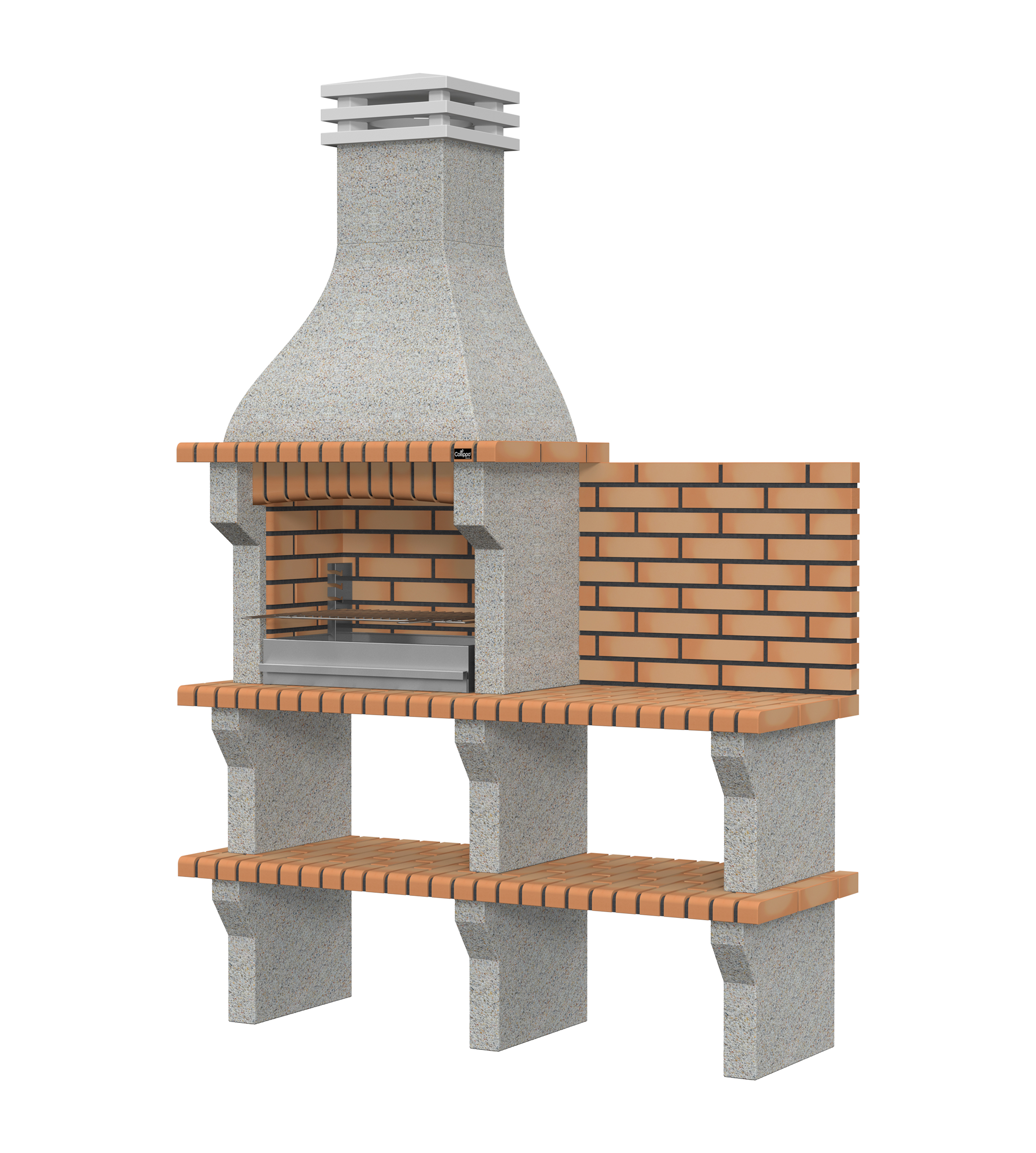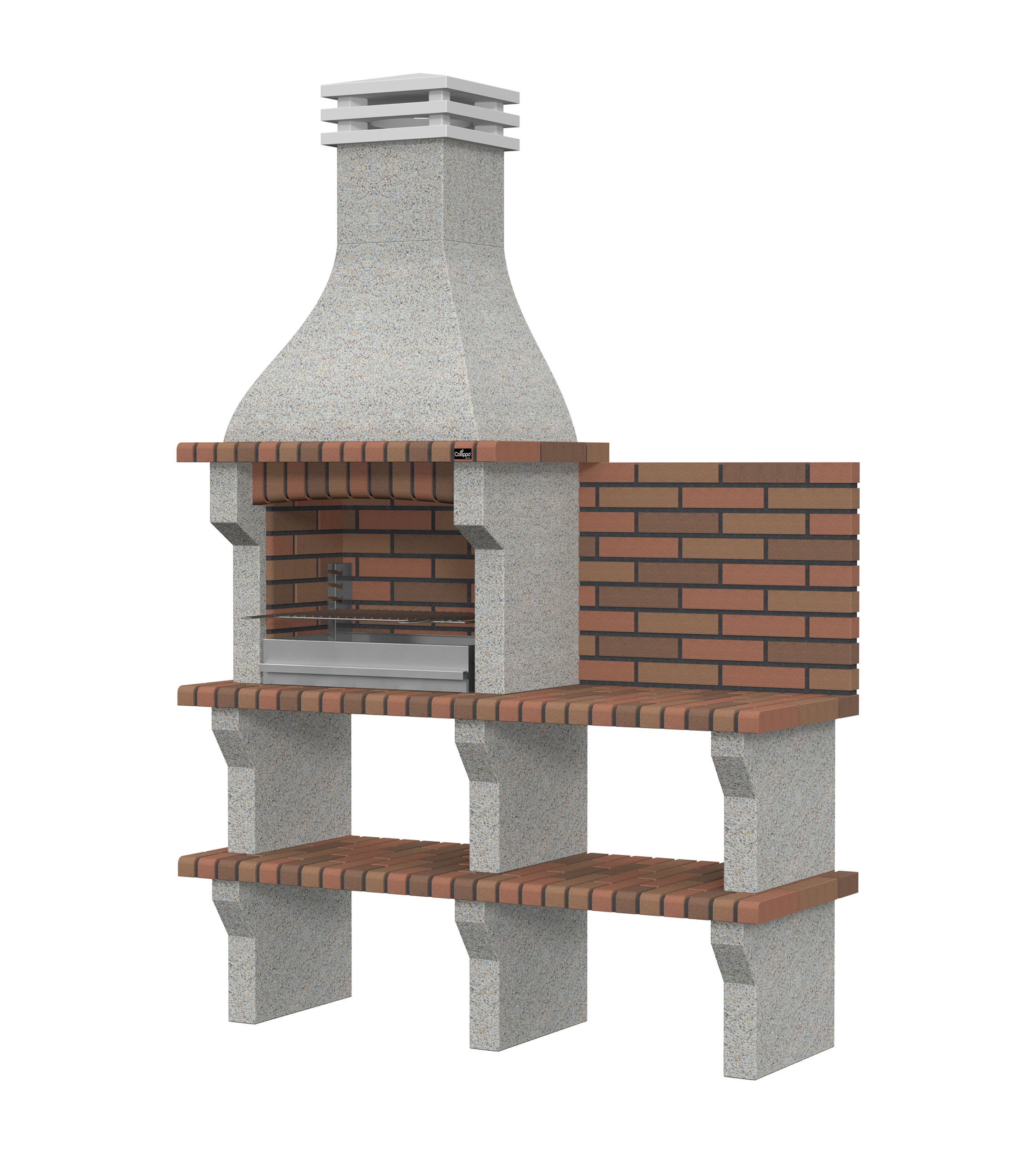 Micro betão branco escovado com brita creme; bancadas em tijolo.