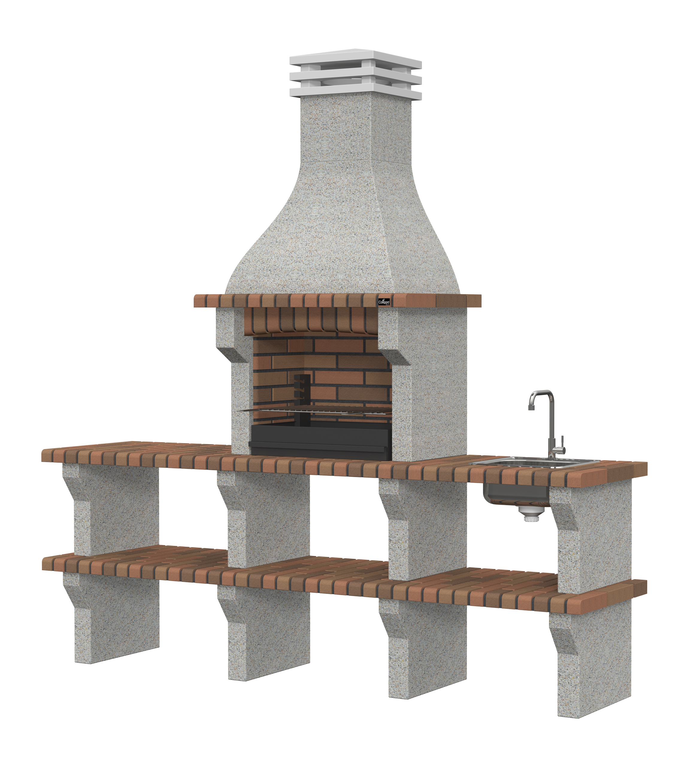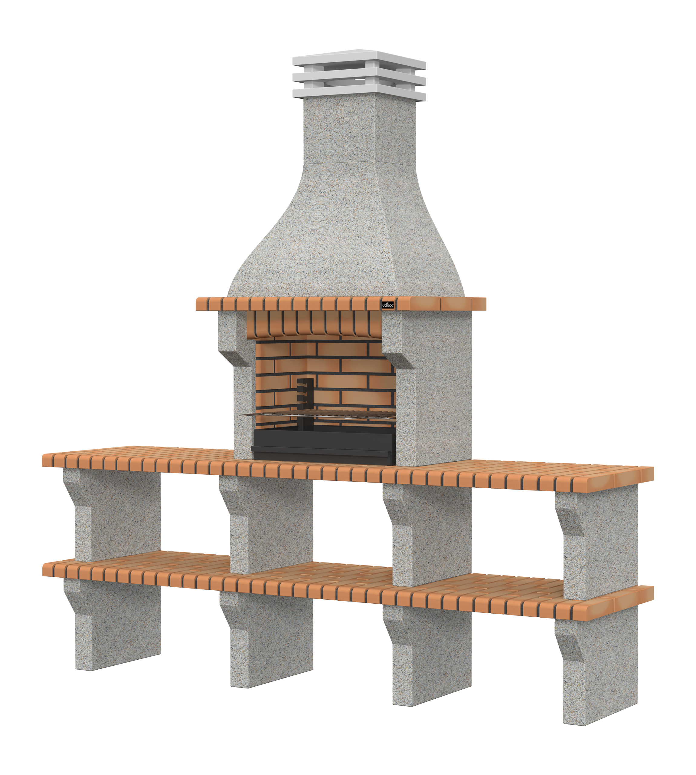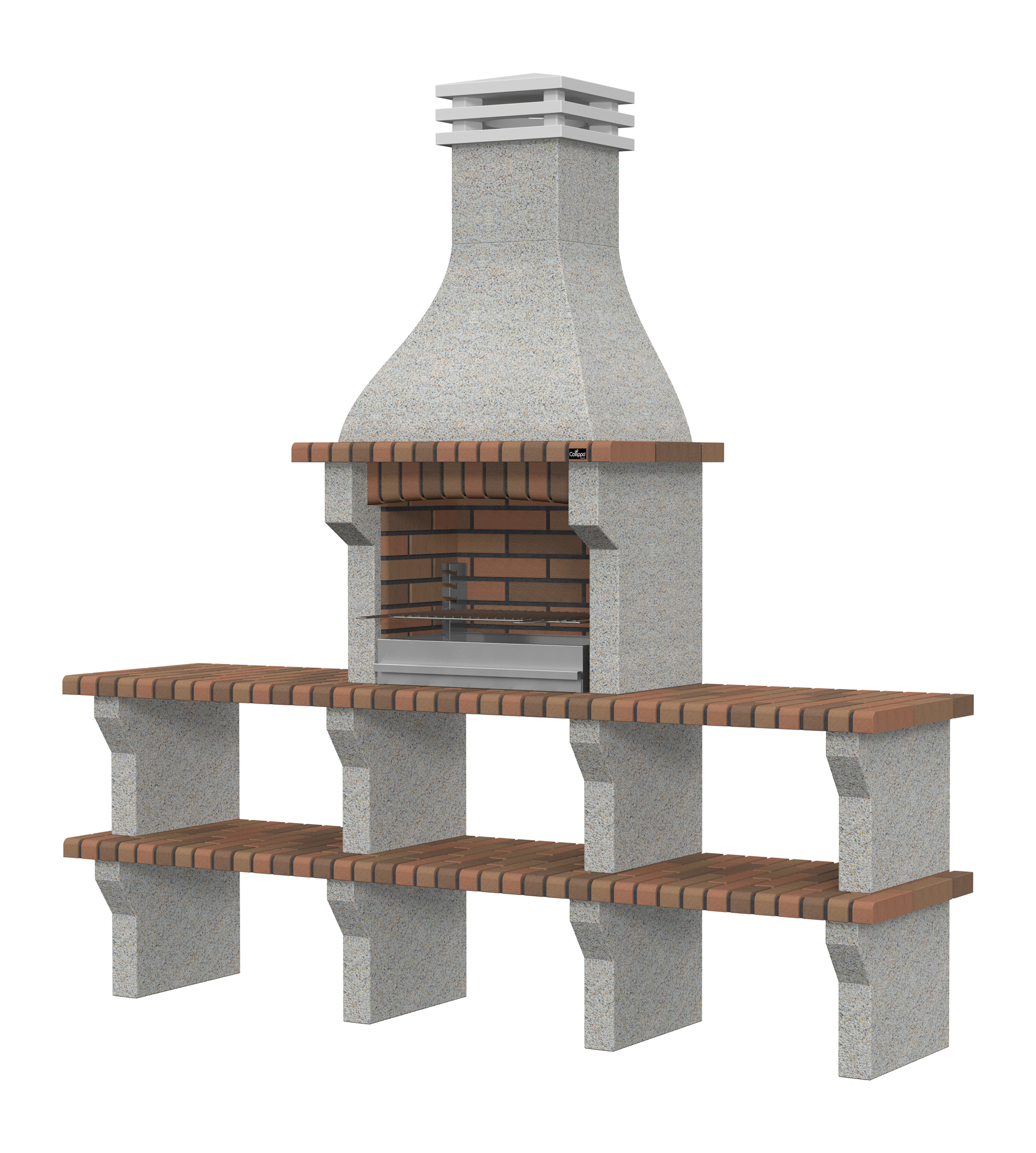 Micro betão branco escovado com brita creme; bancadas em tijolo.