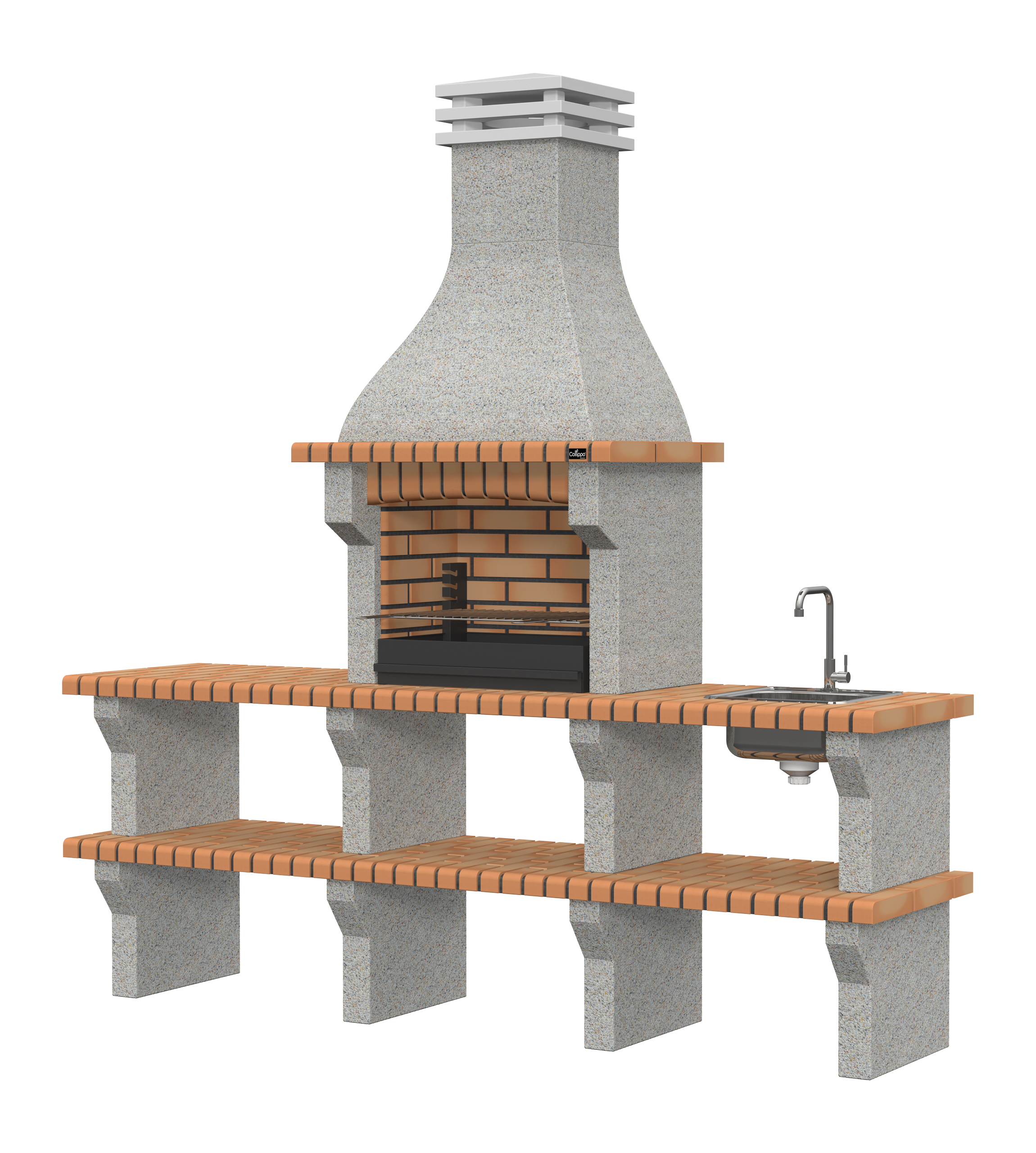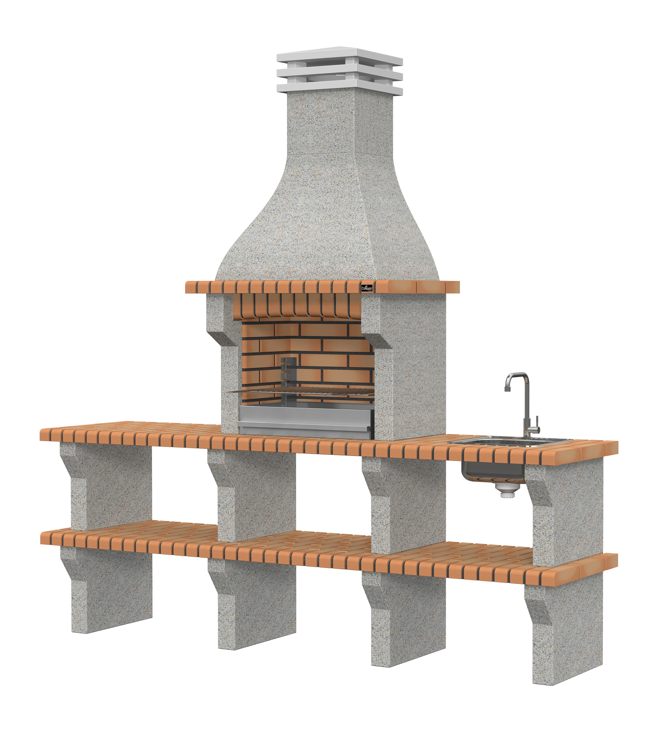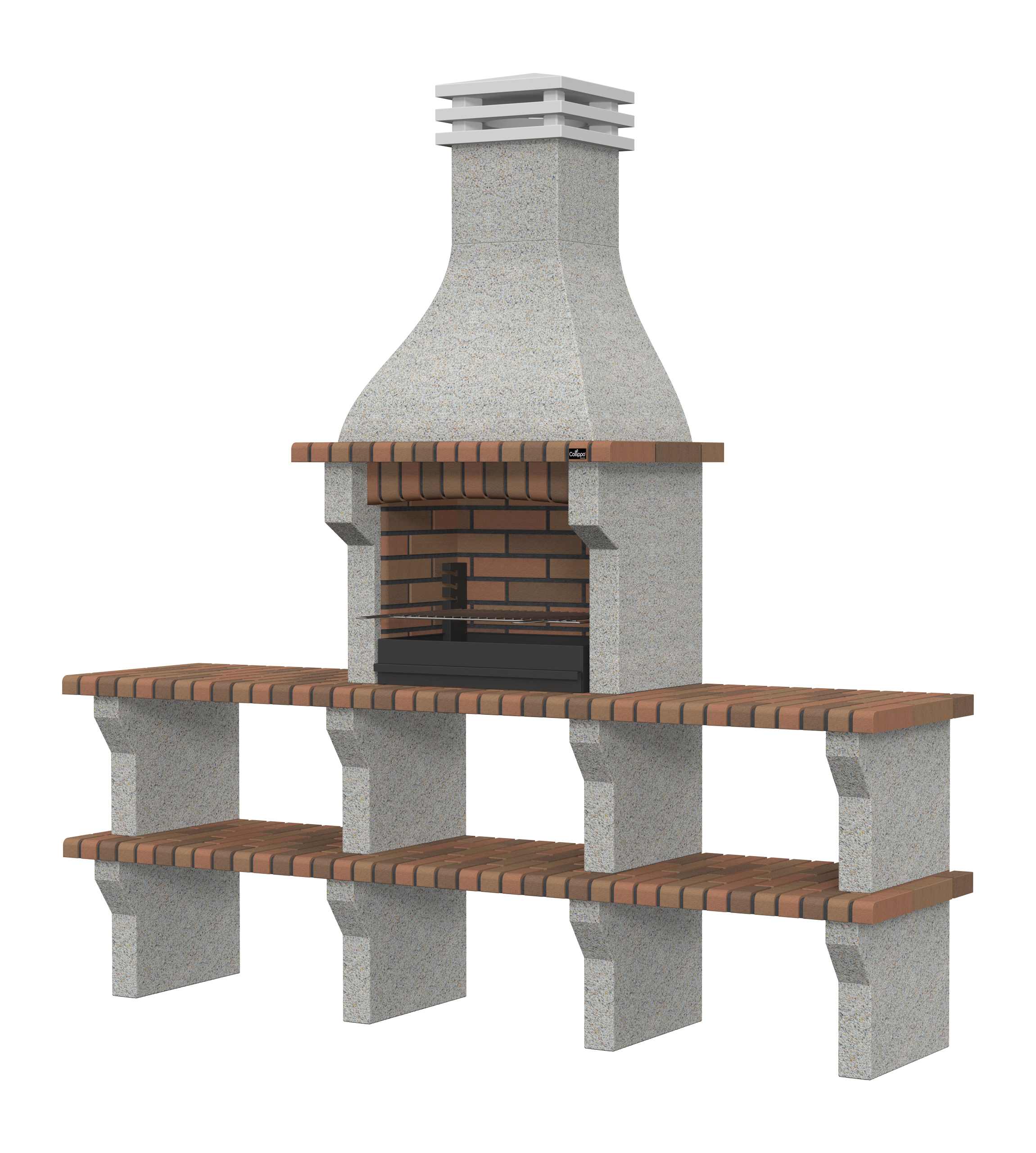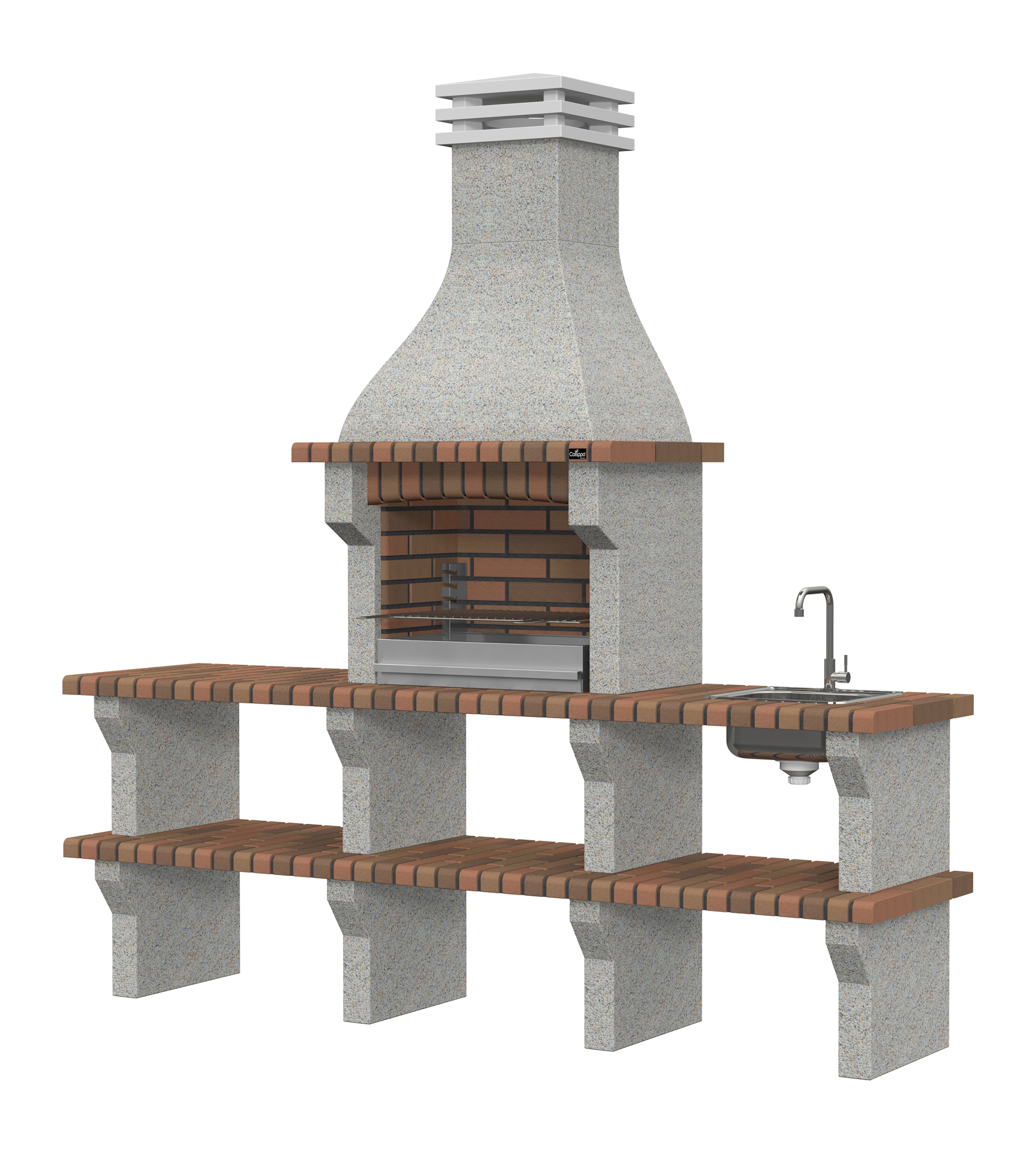 Micro betão branco escovado com brita creme; bancadas em tijolo.