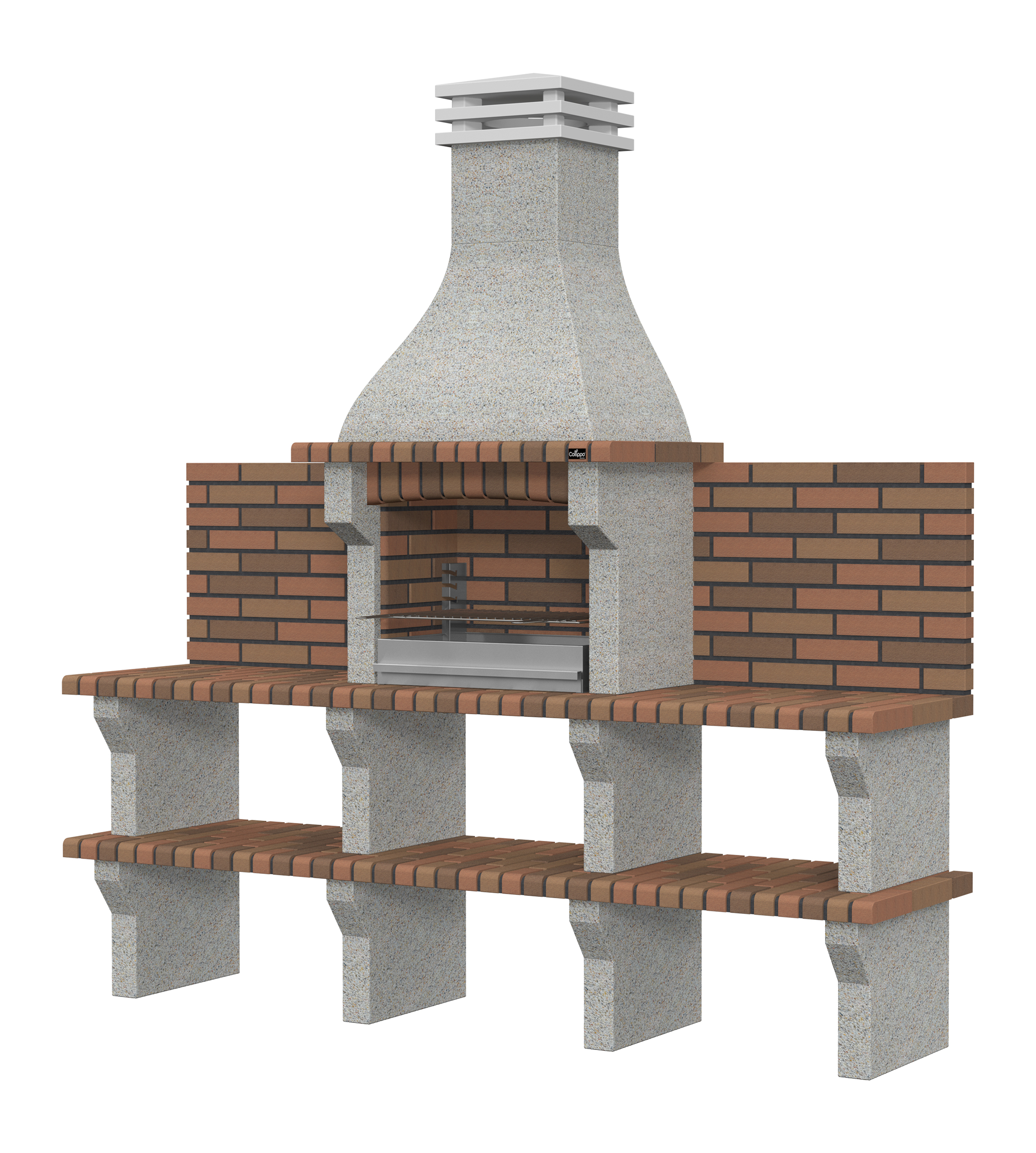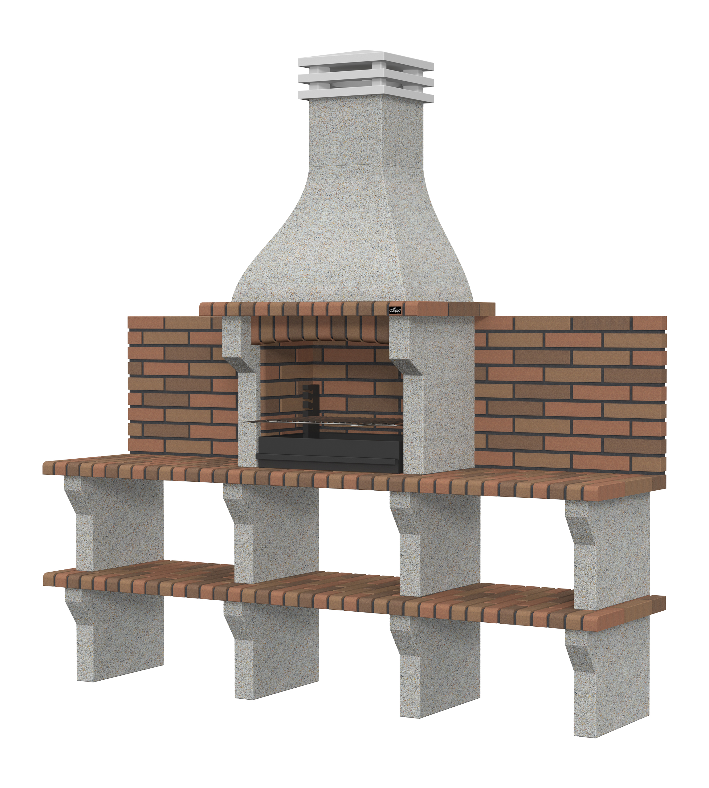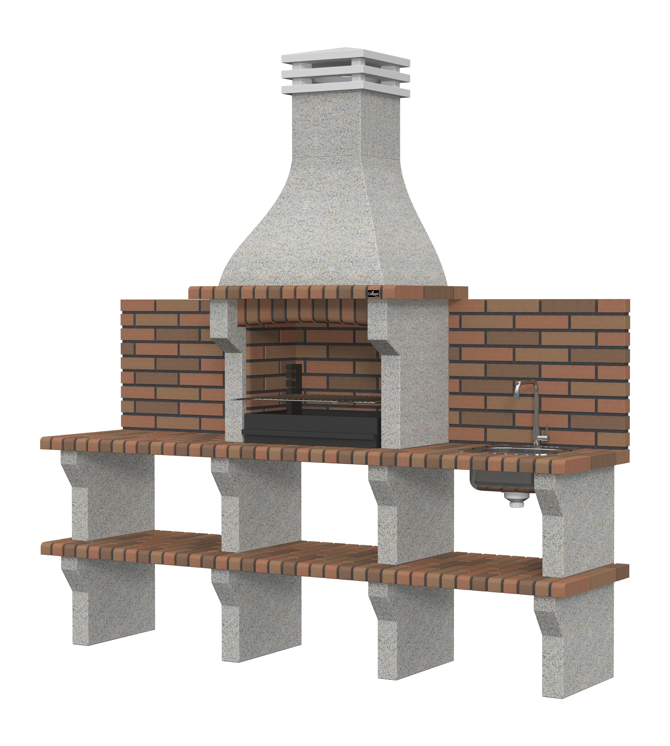 Micro betão branco escovado com brita creme; bancadas em tijolo.