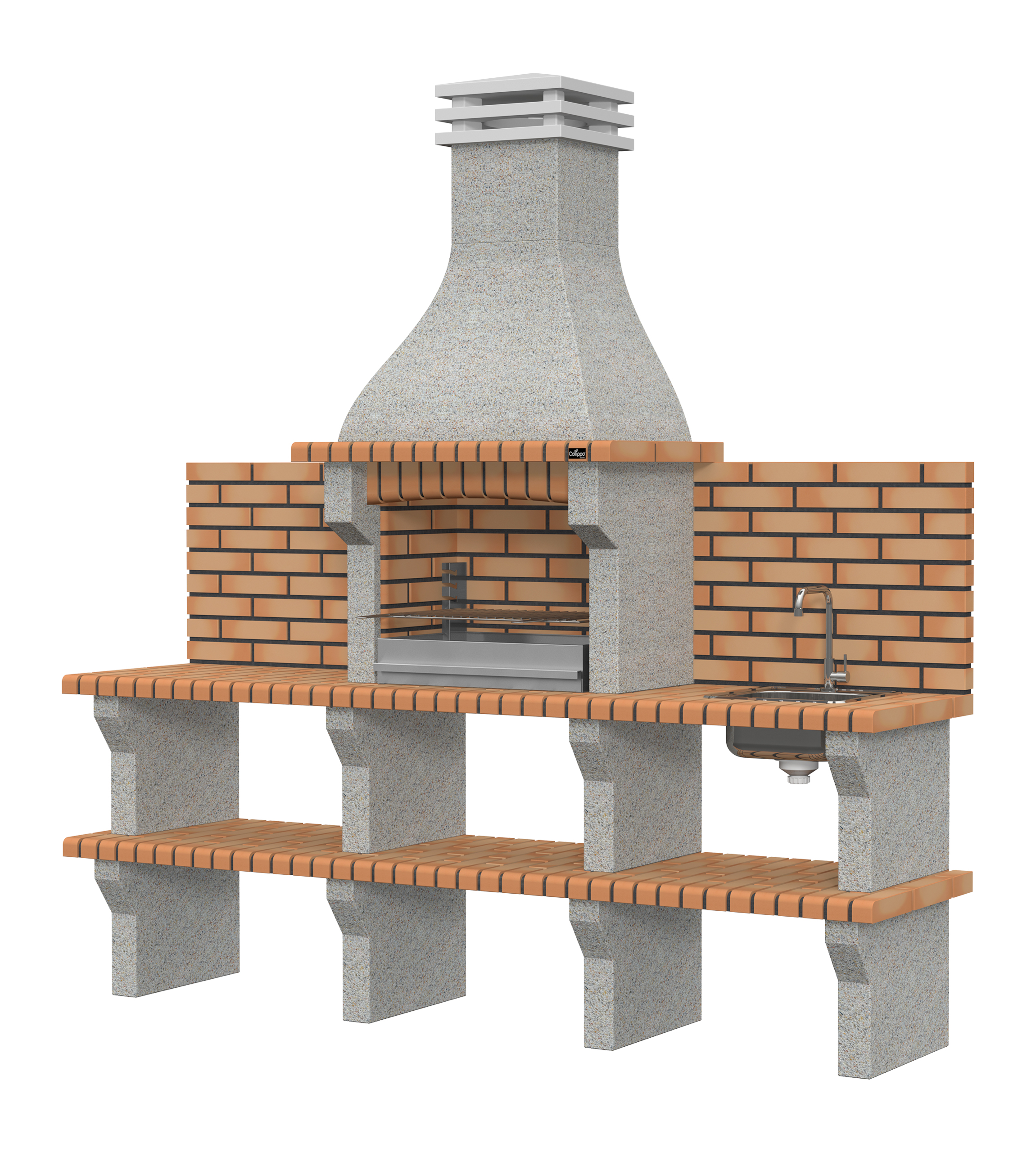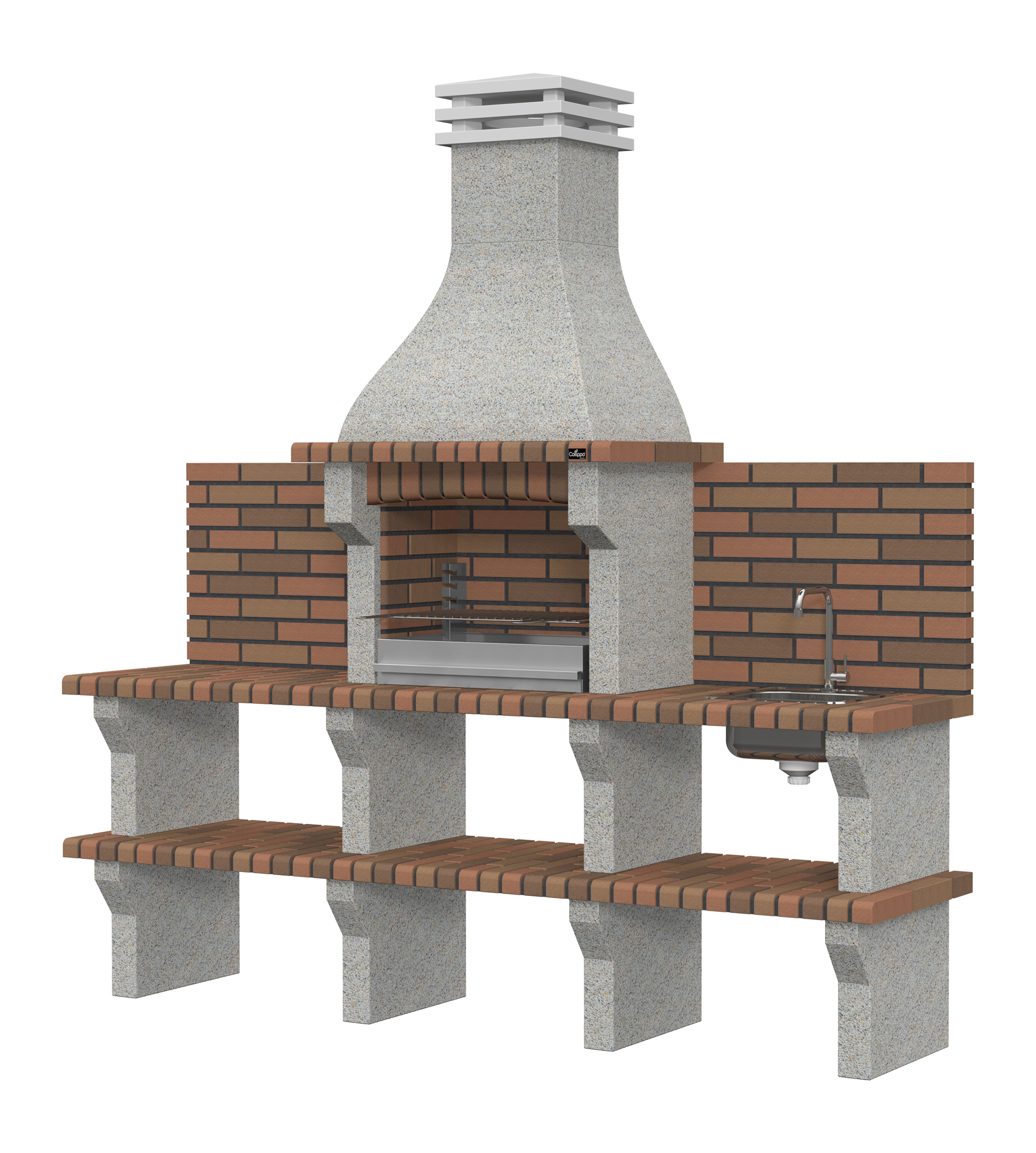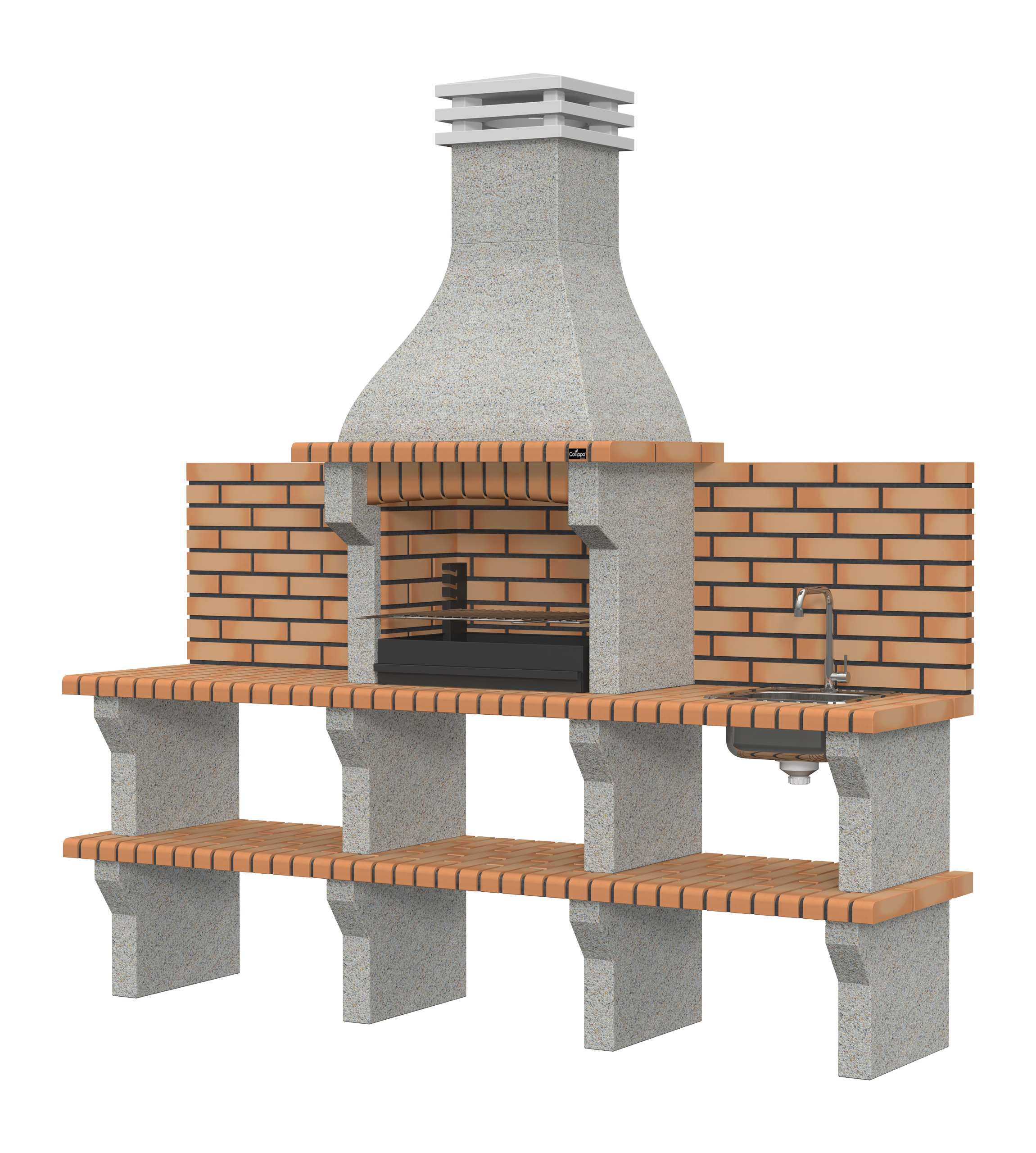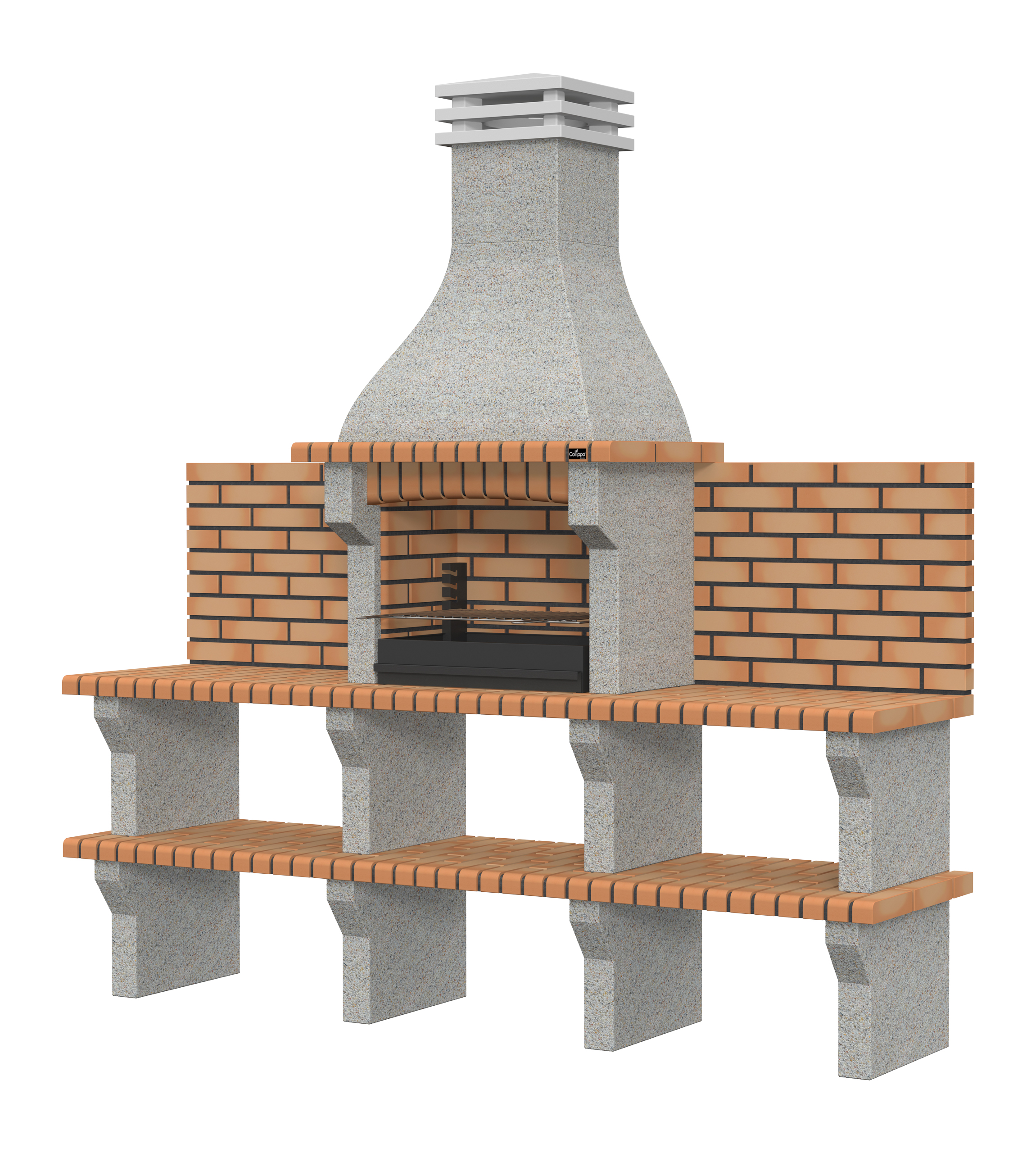 Micro betão branco escovado com brita creme; bancadas em tijolo.