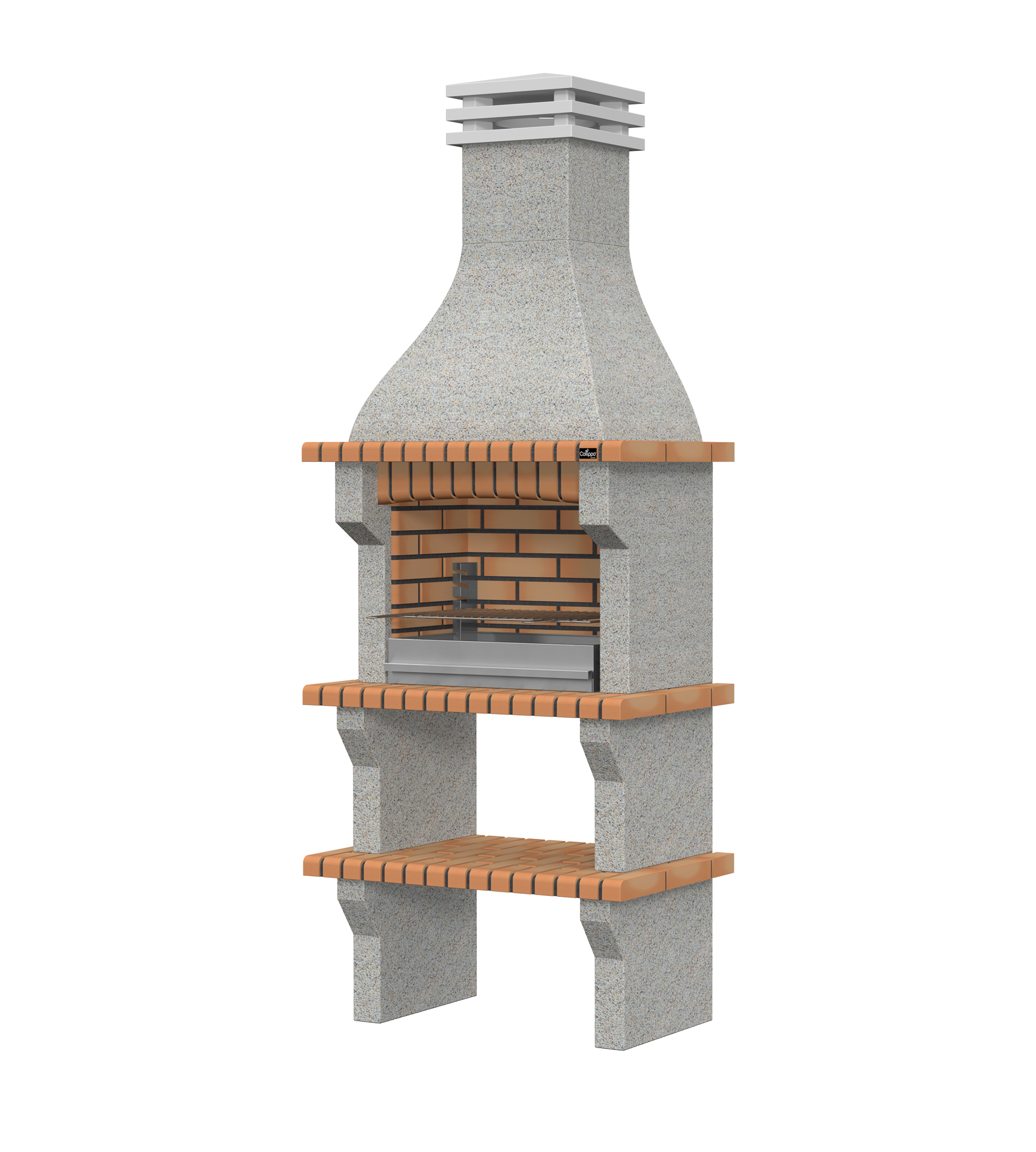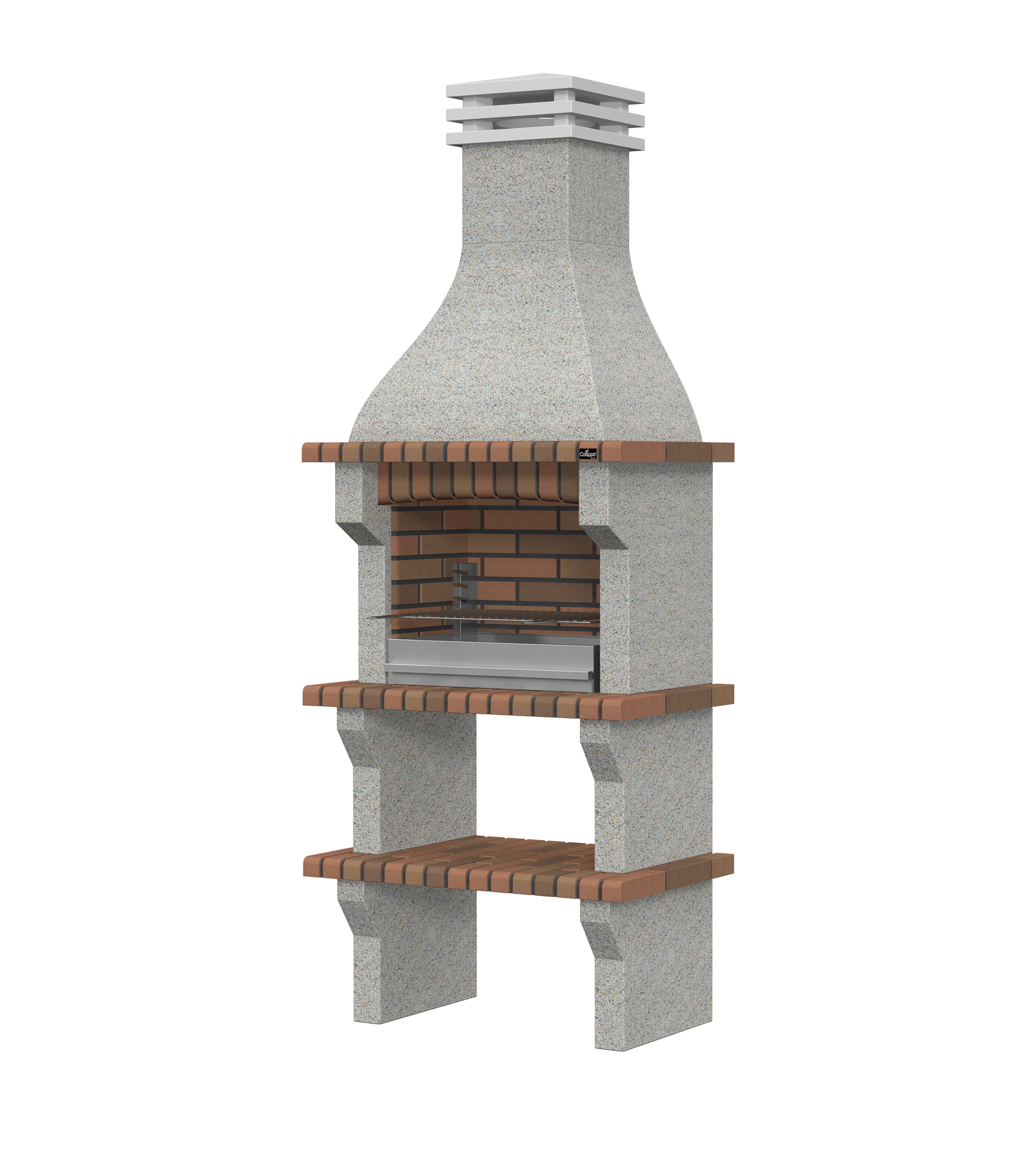 Micro betão branco escovado com brita creme; bancadas em tijolo.