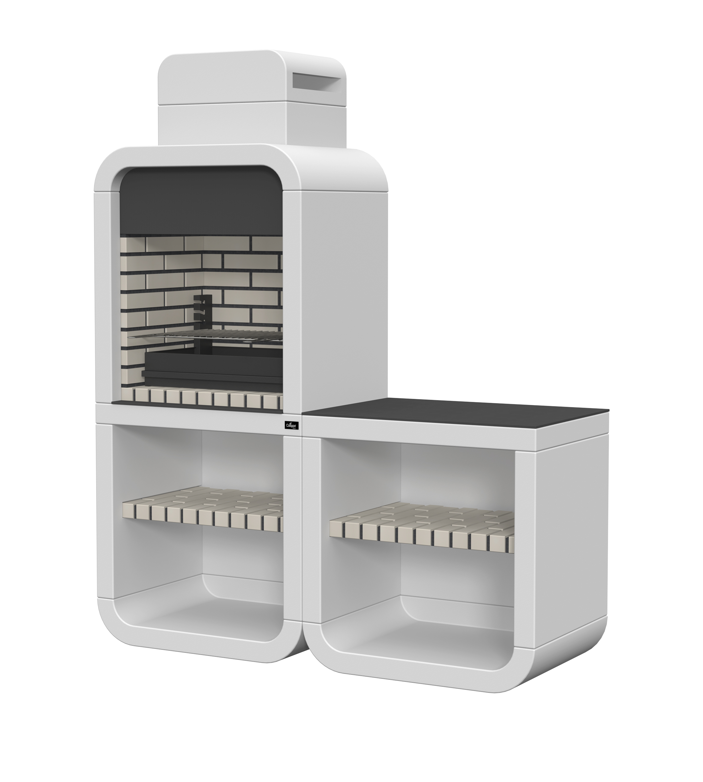 Micro betão liso branco; peças com pintura preta; bancadas em pedra preta; zona de fogo em tijolo e cimento refractário.