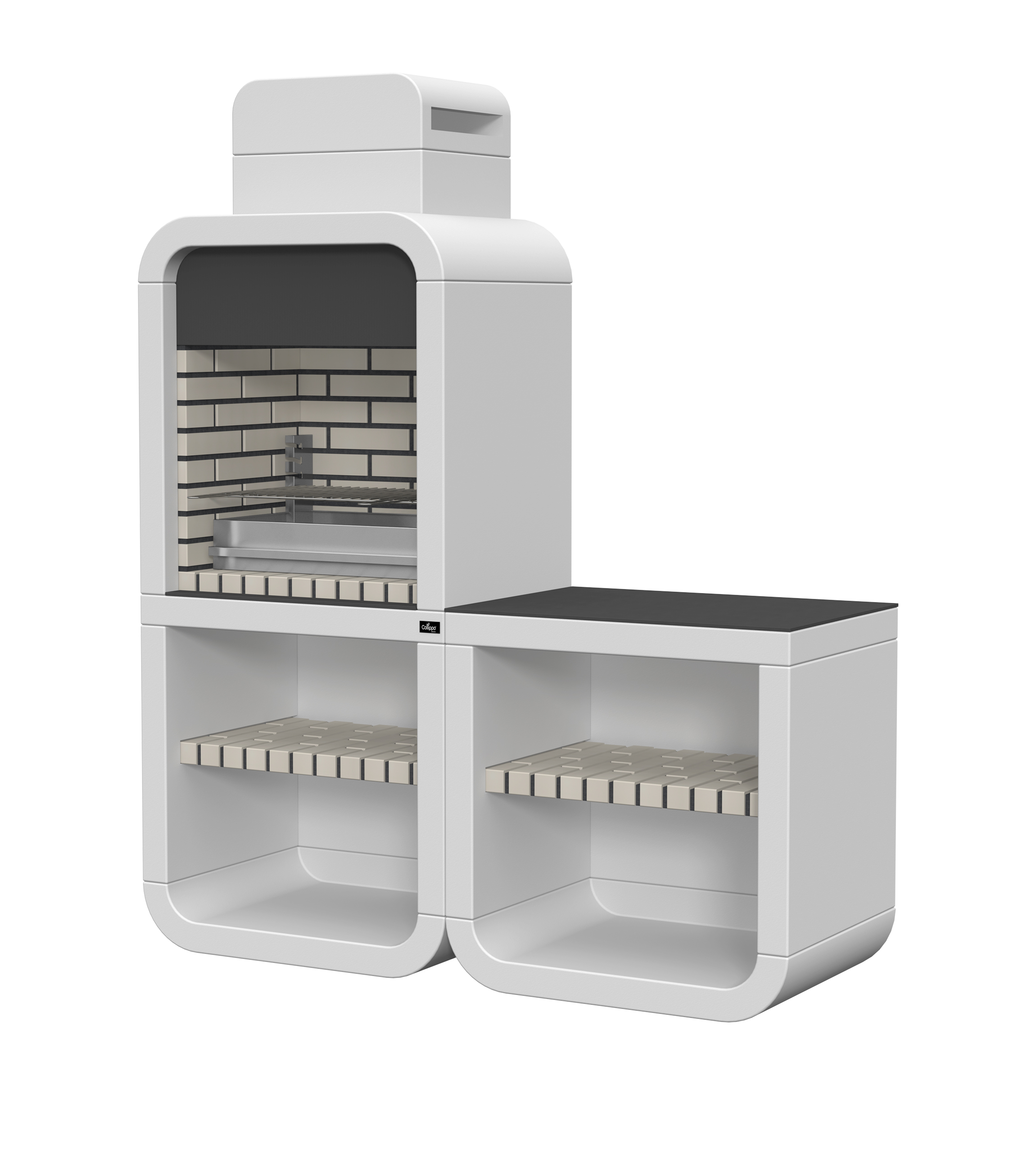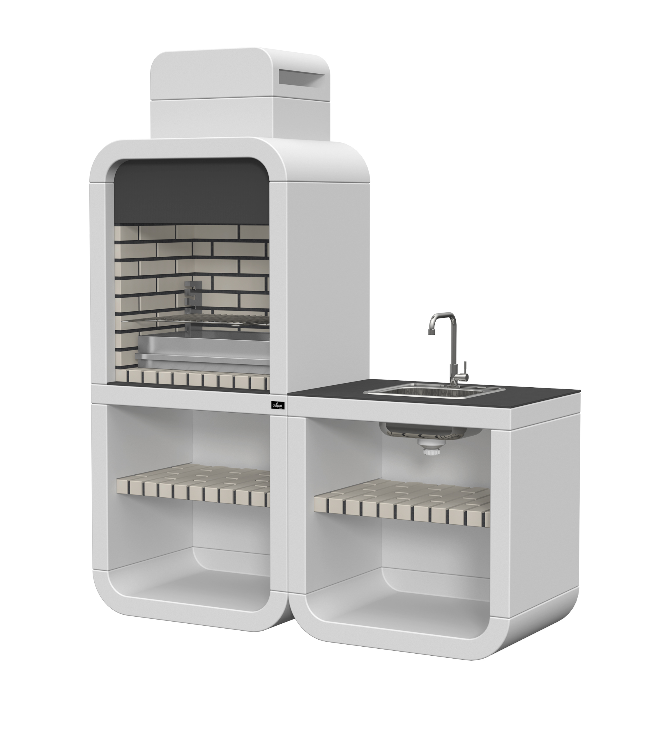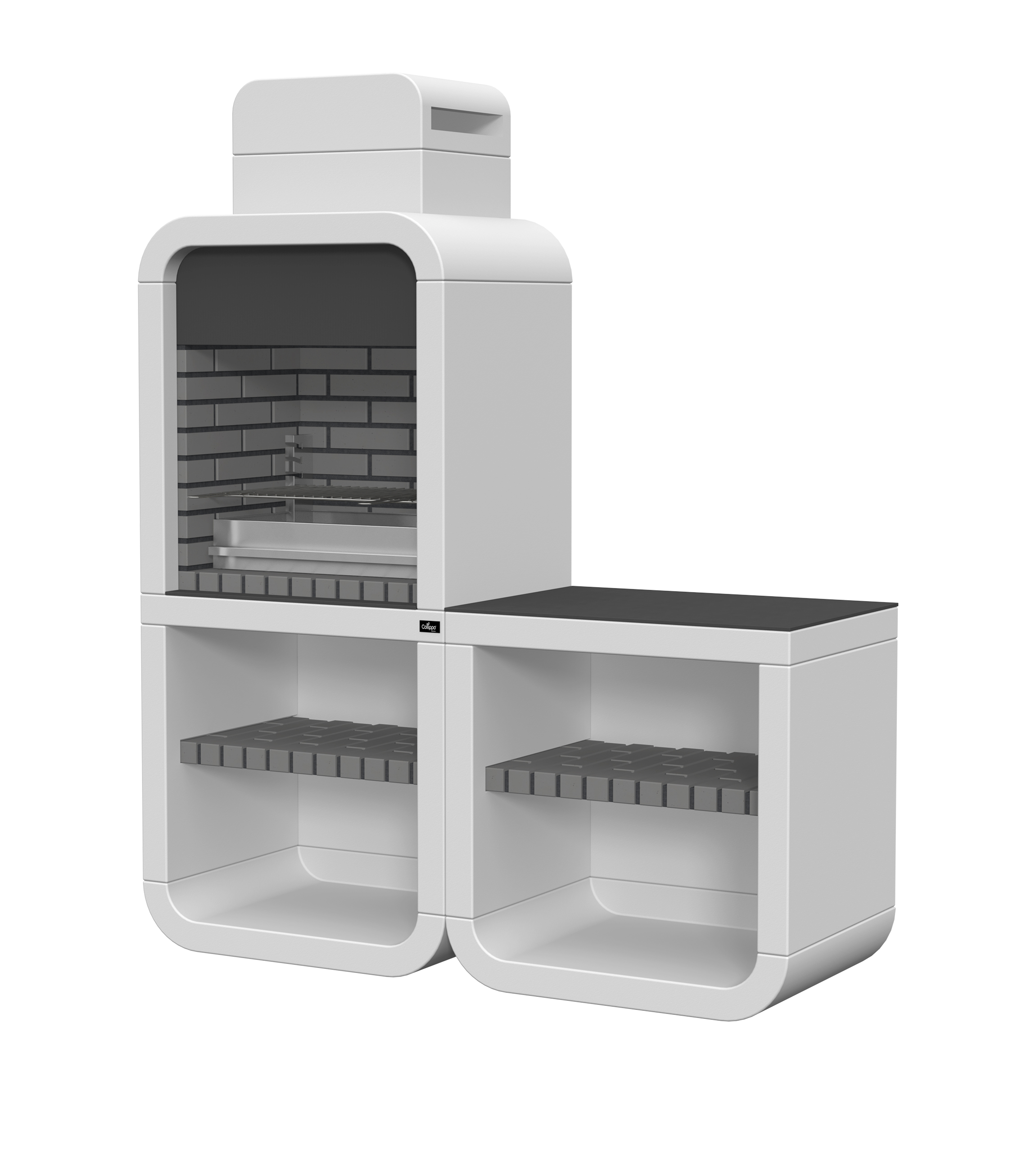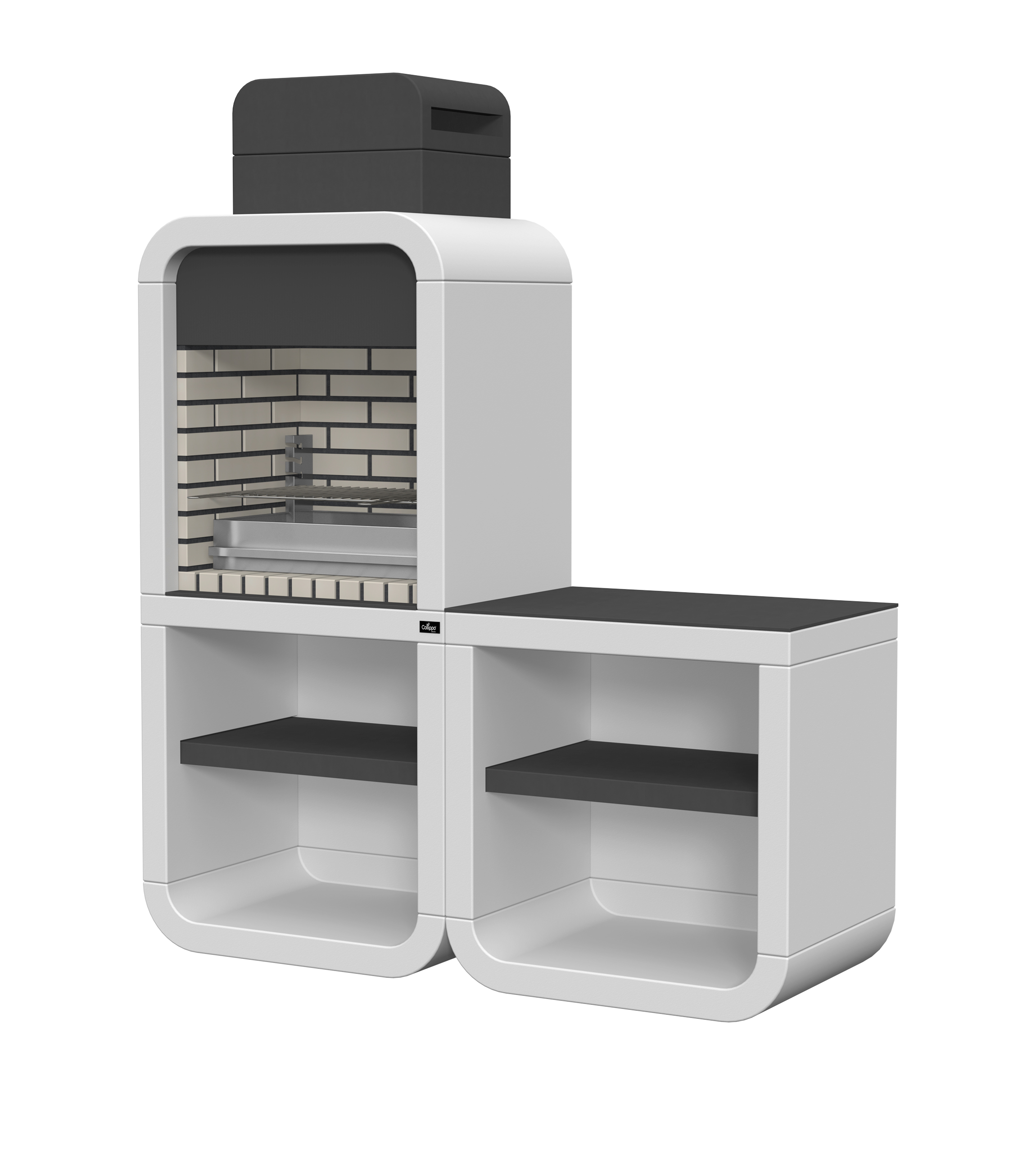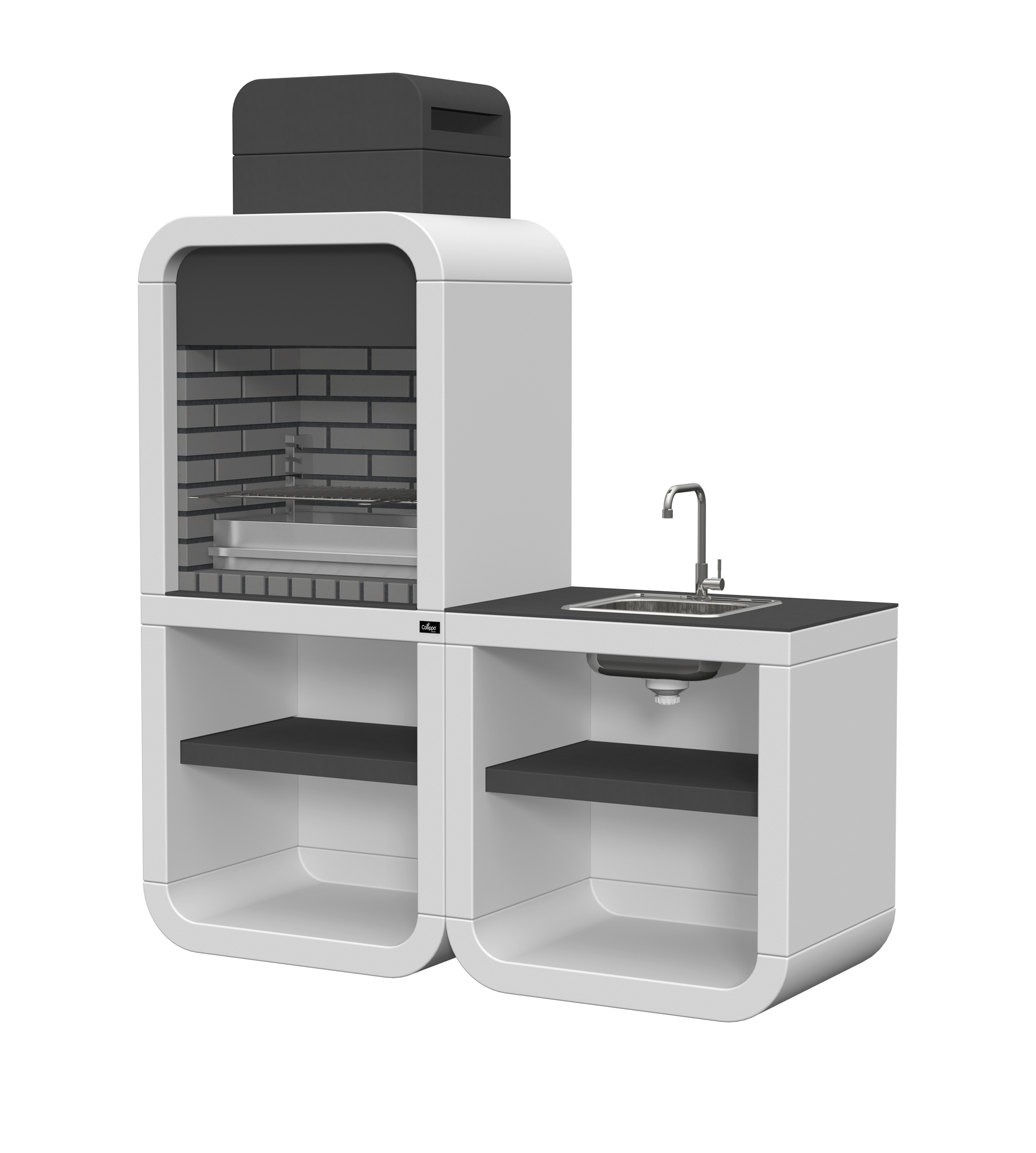 Micro betão liso branco; peças com pintura preta; bancada em DEKTON preto; zona de fogo em tijolo e cimento refractário.