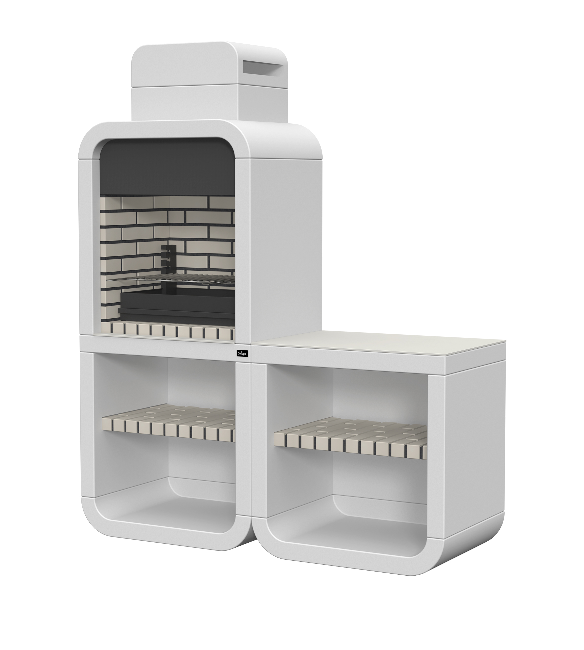 Micro betão liso branco; peças com pintura preta; bancadas em pedra preta; zona de fogo em tijolo e cimento refractário.
