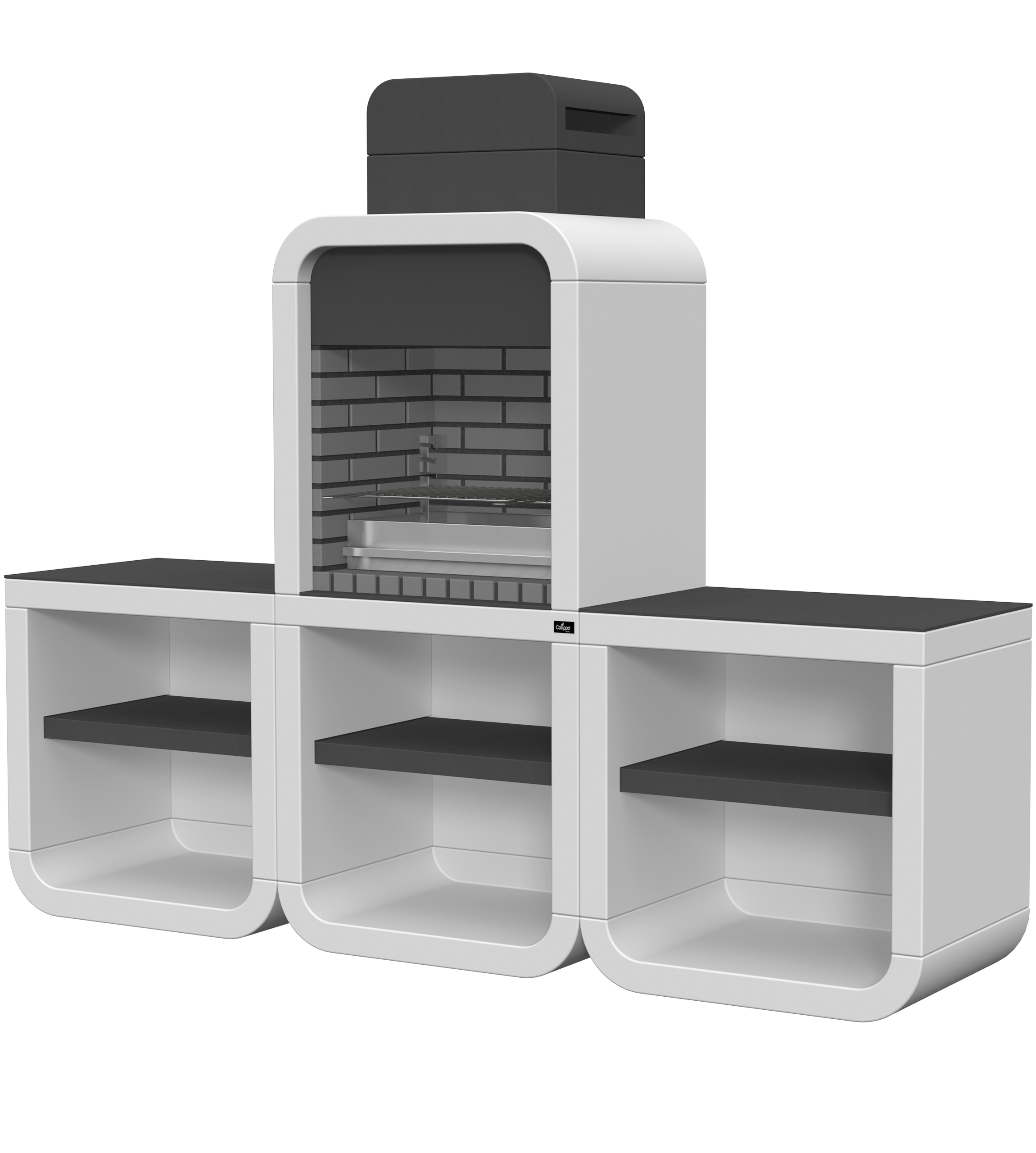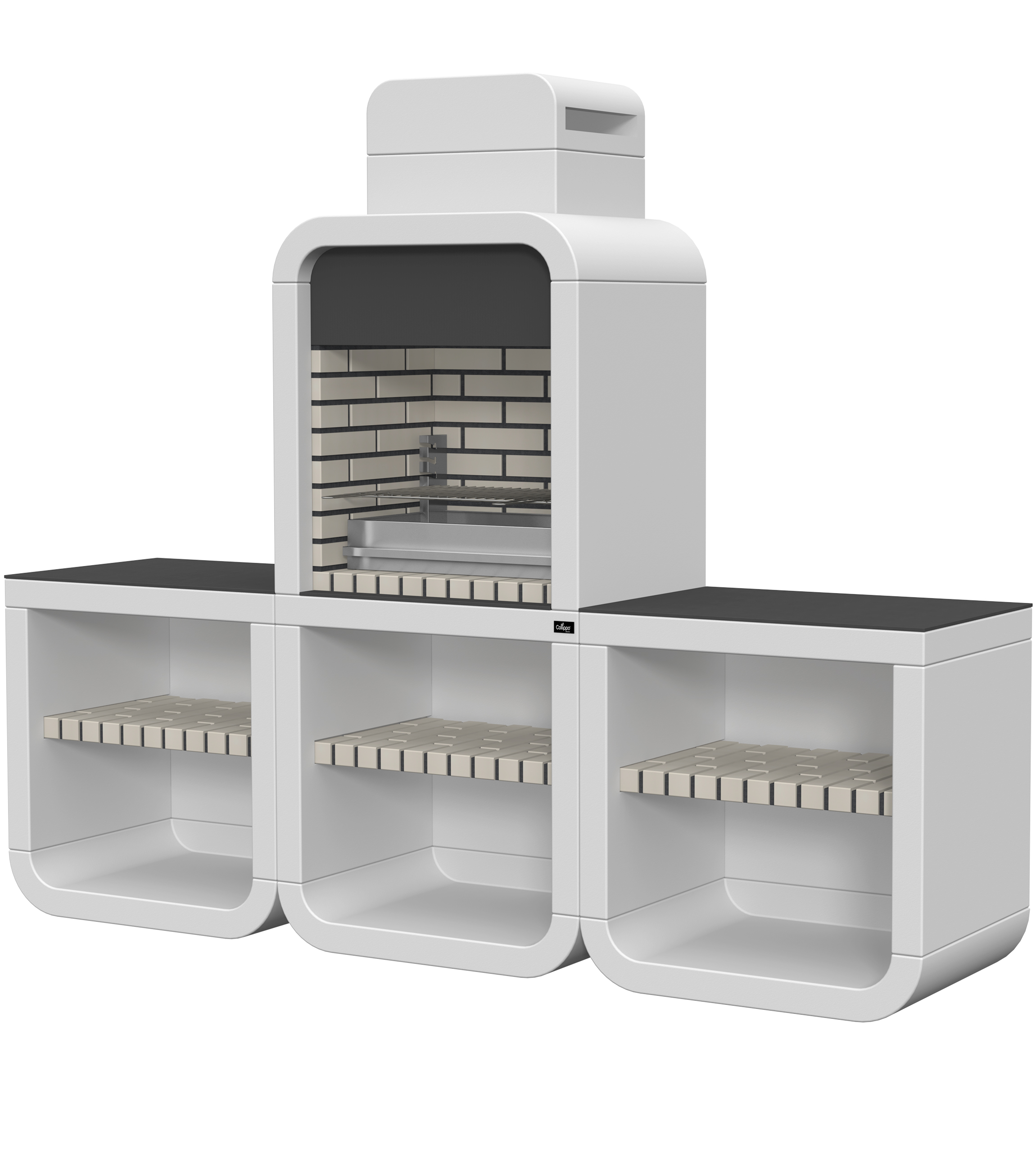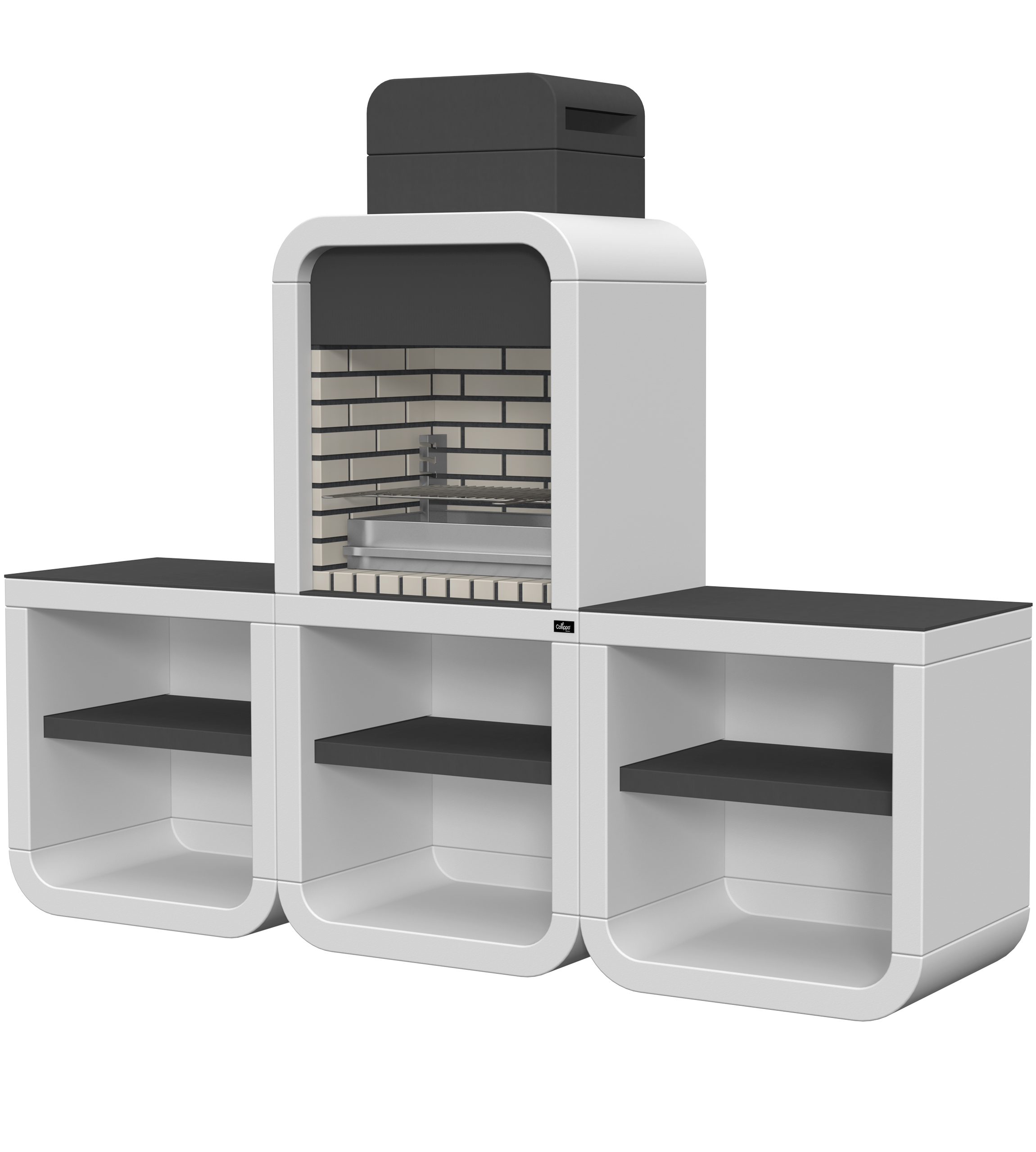 Micro betão liso branco; peças com pintura preta; bancadas em DEKTON preto; zona de fogo em tijolo e cimento refractário.