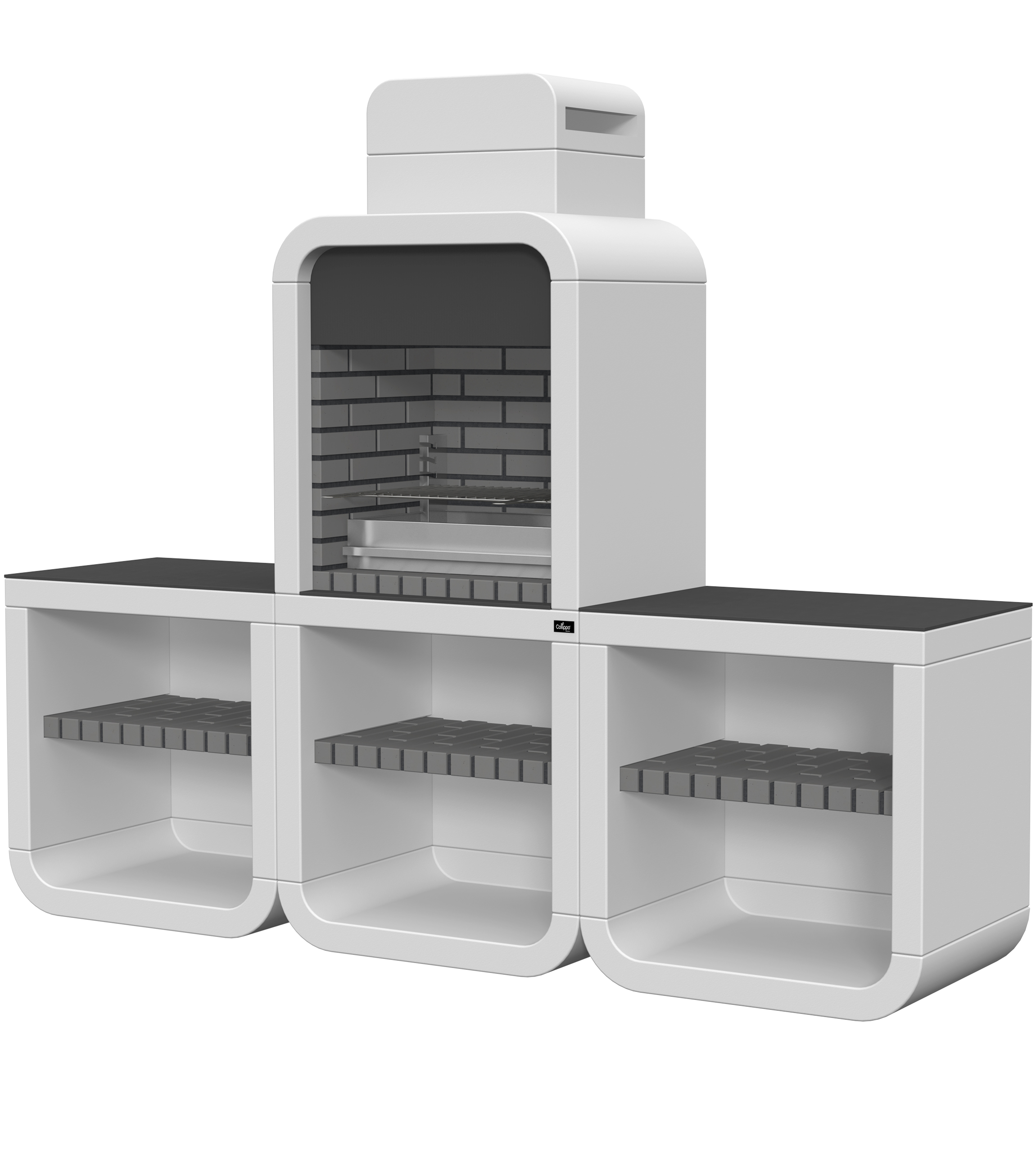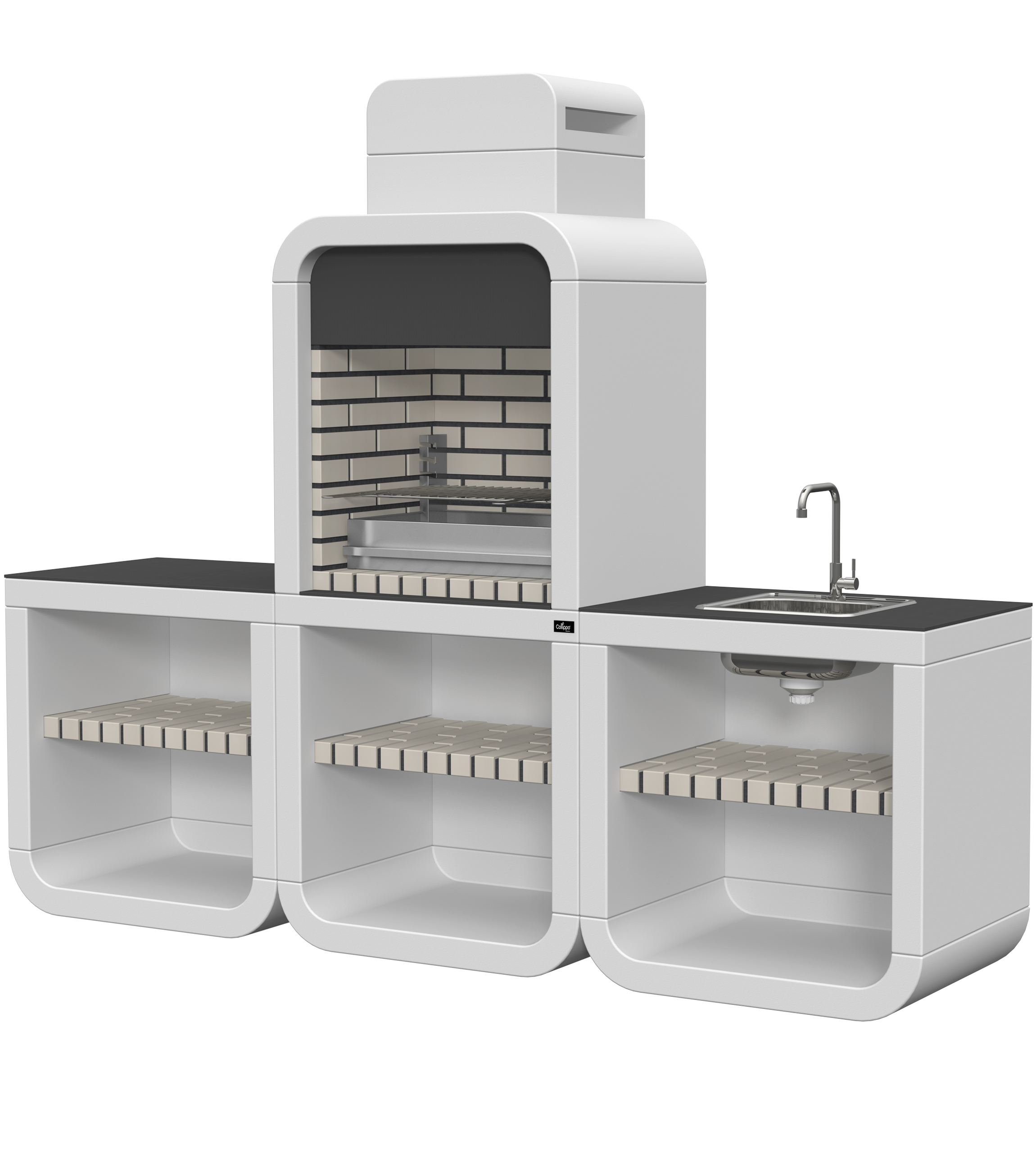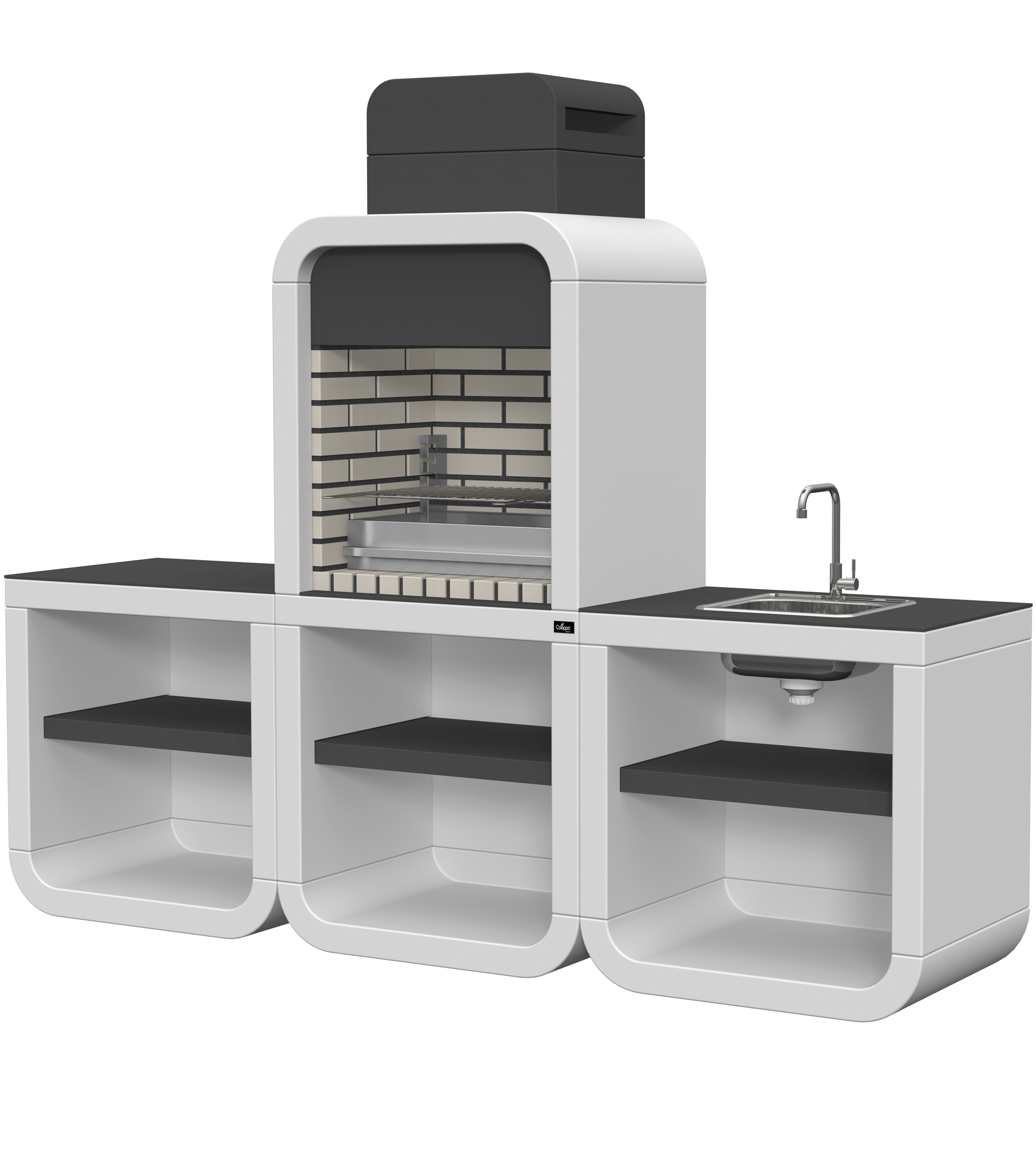 Micro betão liso branco; peças com pintura preta; bancadas em DEKTON preto; zona de fogo em tijolo e cimento refractário.