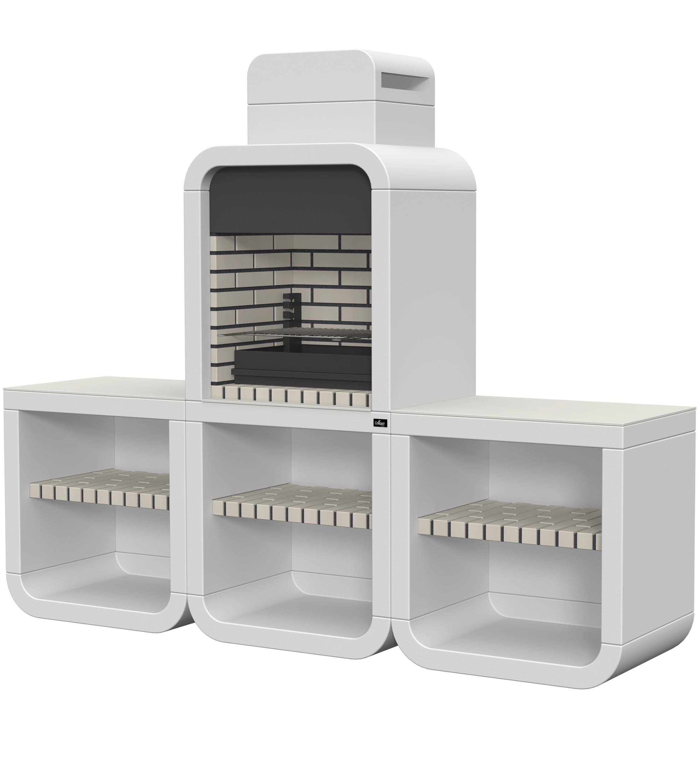 Micro betão liso branco; peças com pintura preta; bancadas em pedra preta; zona de fogo em tijolo e cimento refractário.