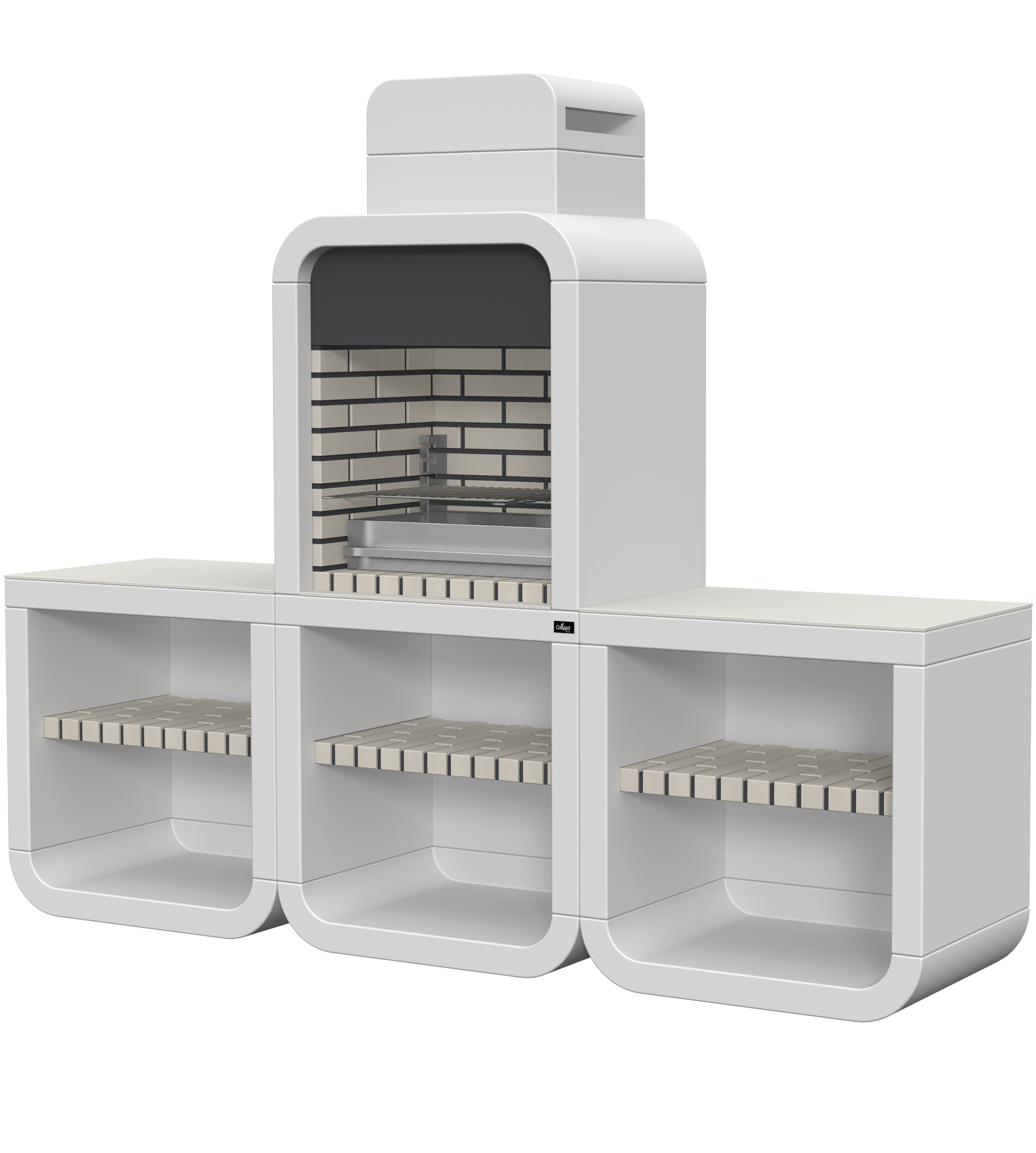 Micro betão liso branco; peças com pintura preta; bancadas em DEKTON branco; zona de fogo em tijolo e cimento refractário.