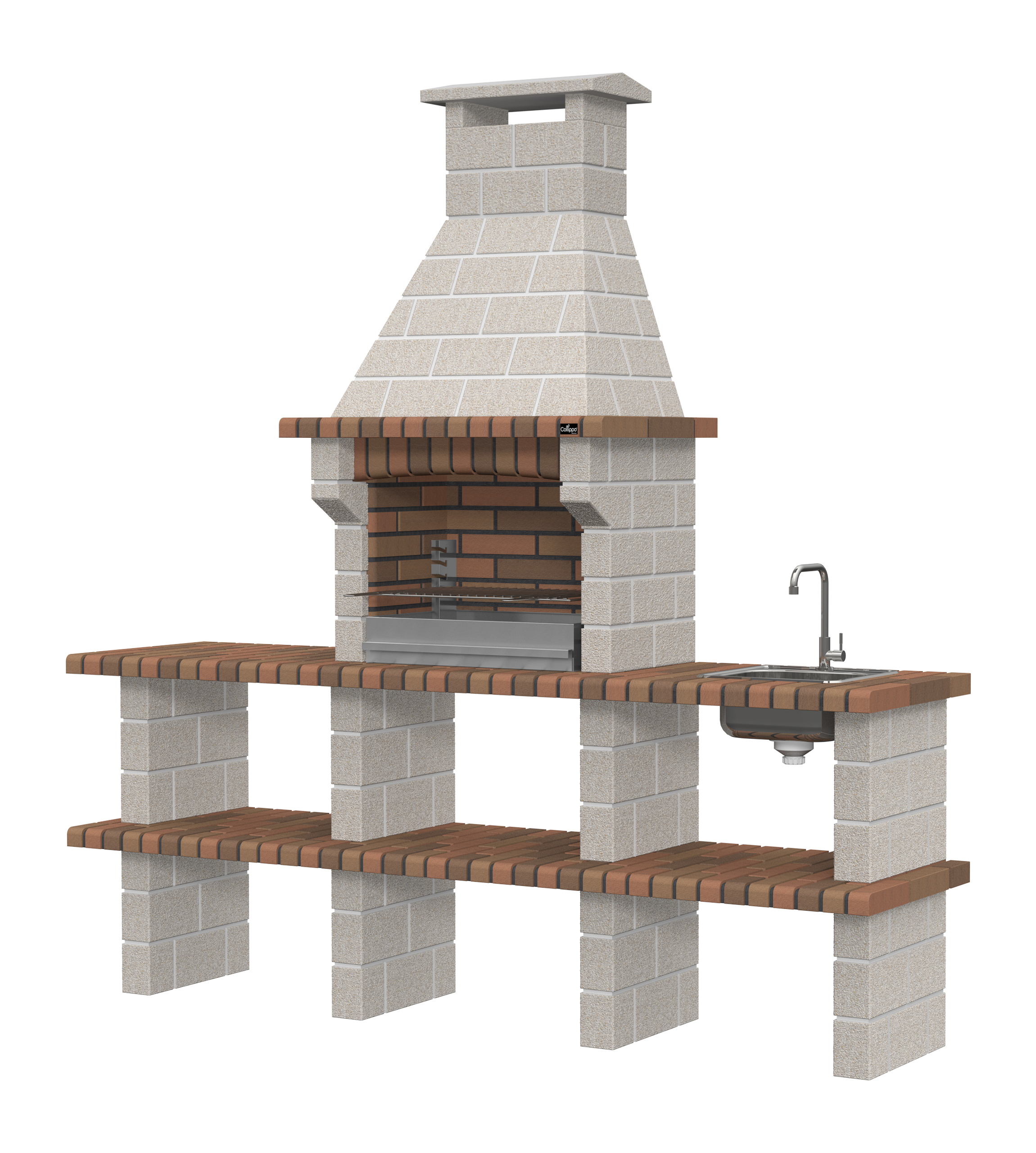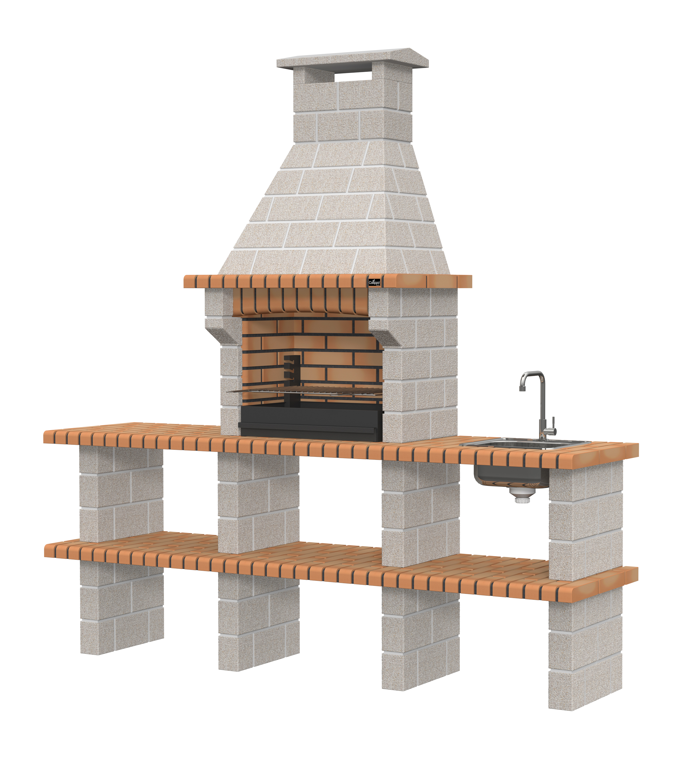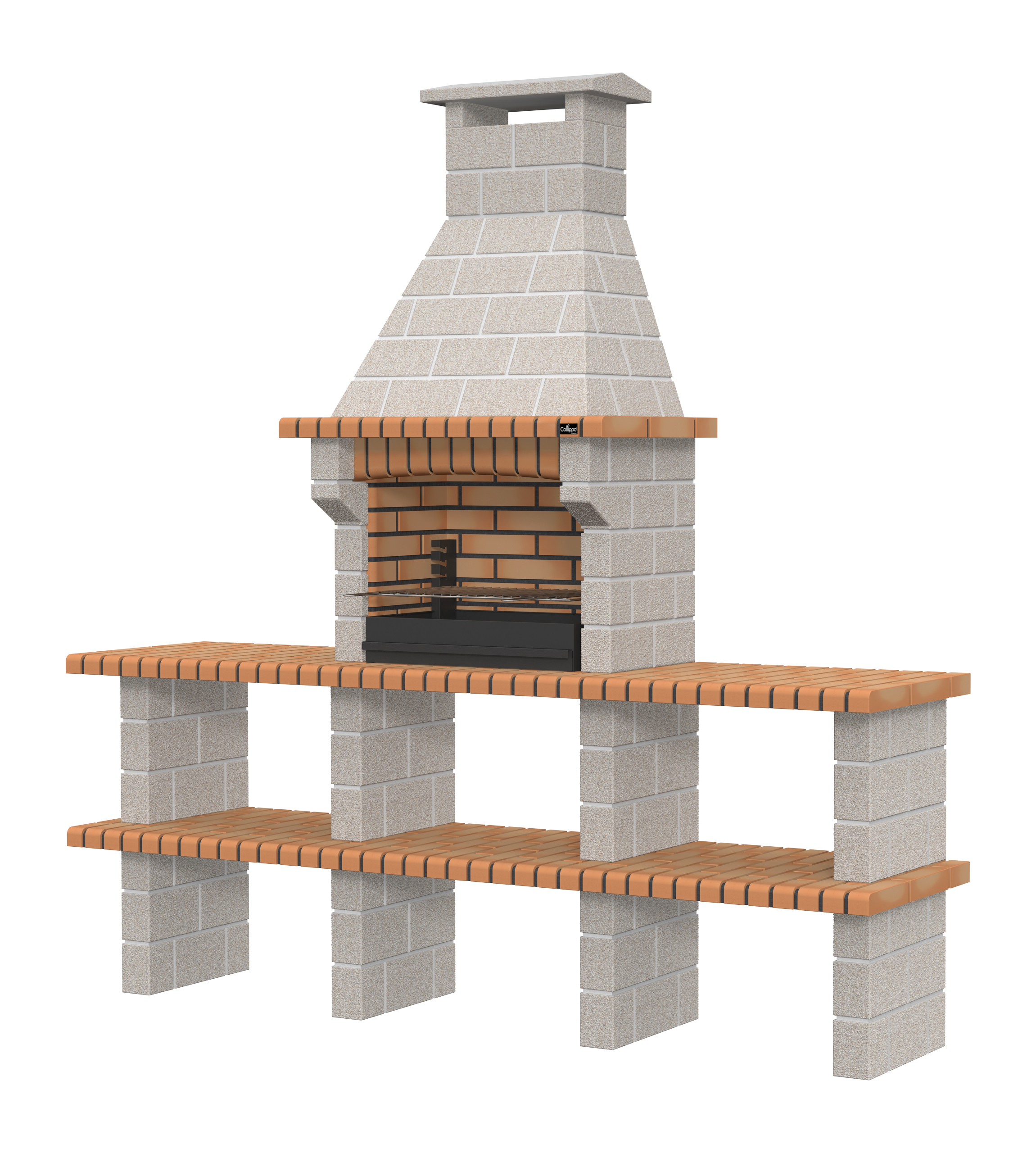Micro betão branco escovado com brita creme; bancadas em tijolo.