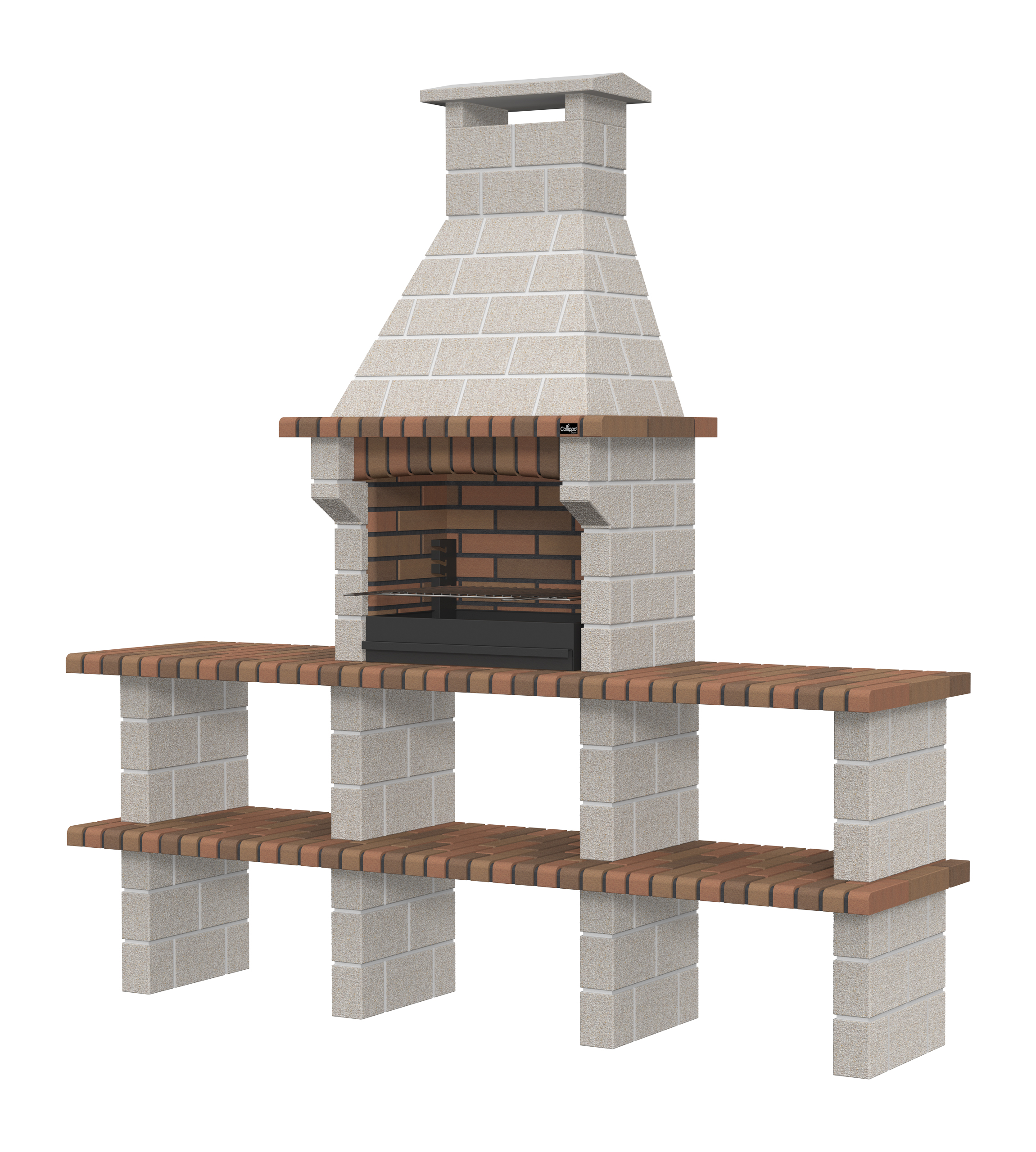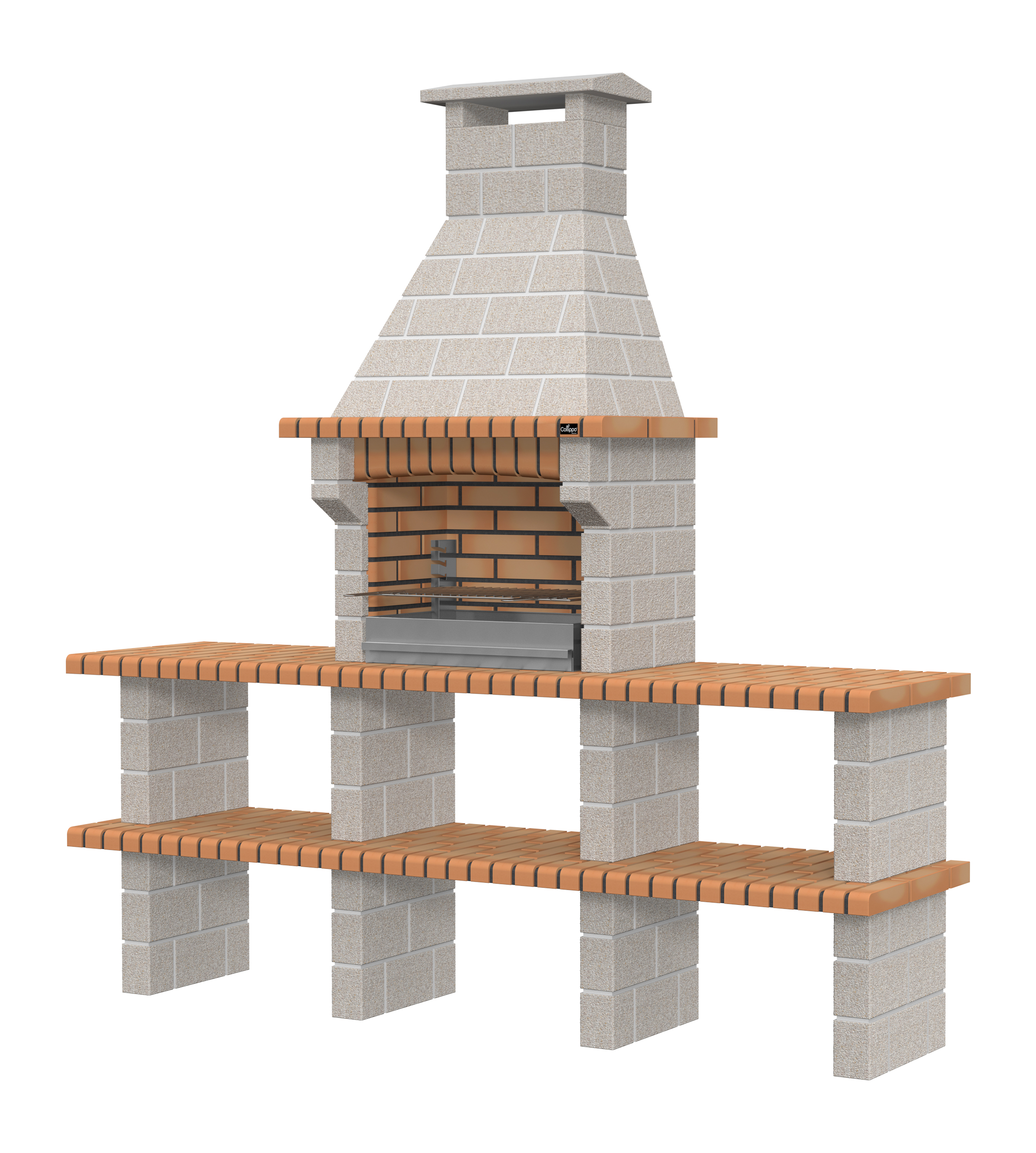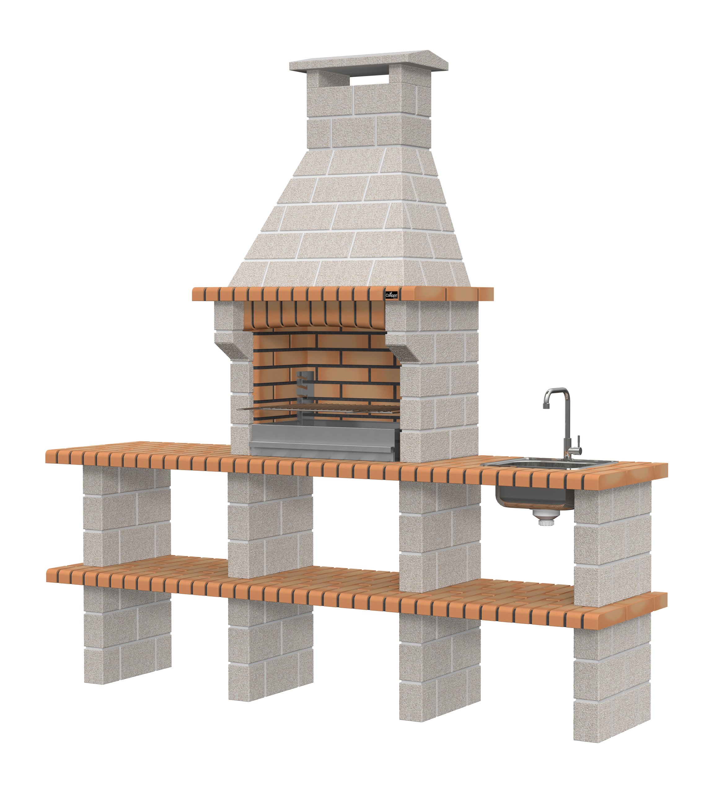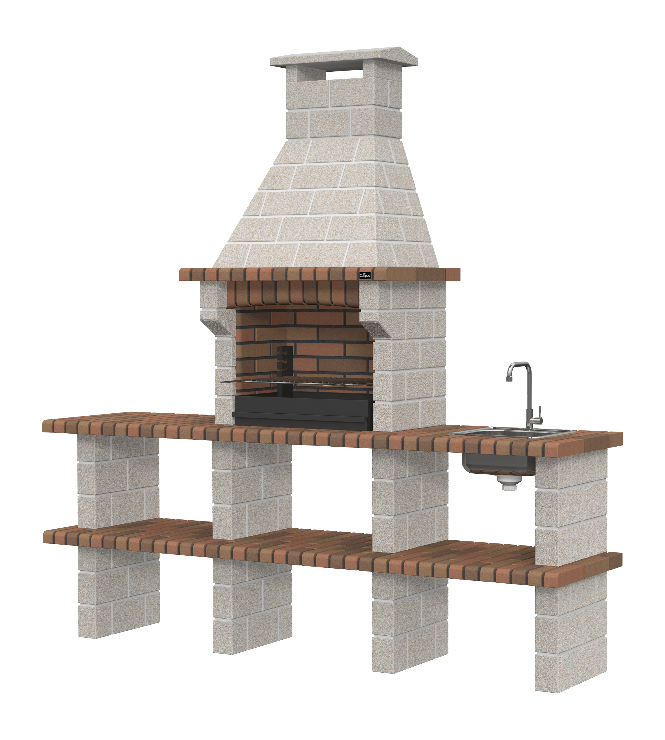 Micro betão branco escovado com brita creme; bancadas em tijolo.
