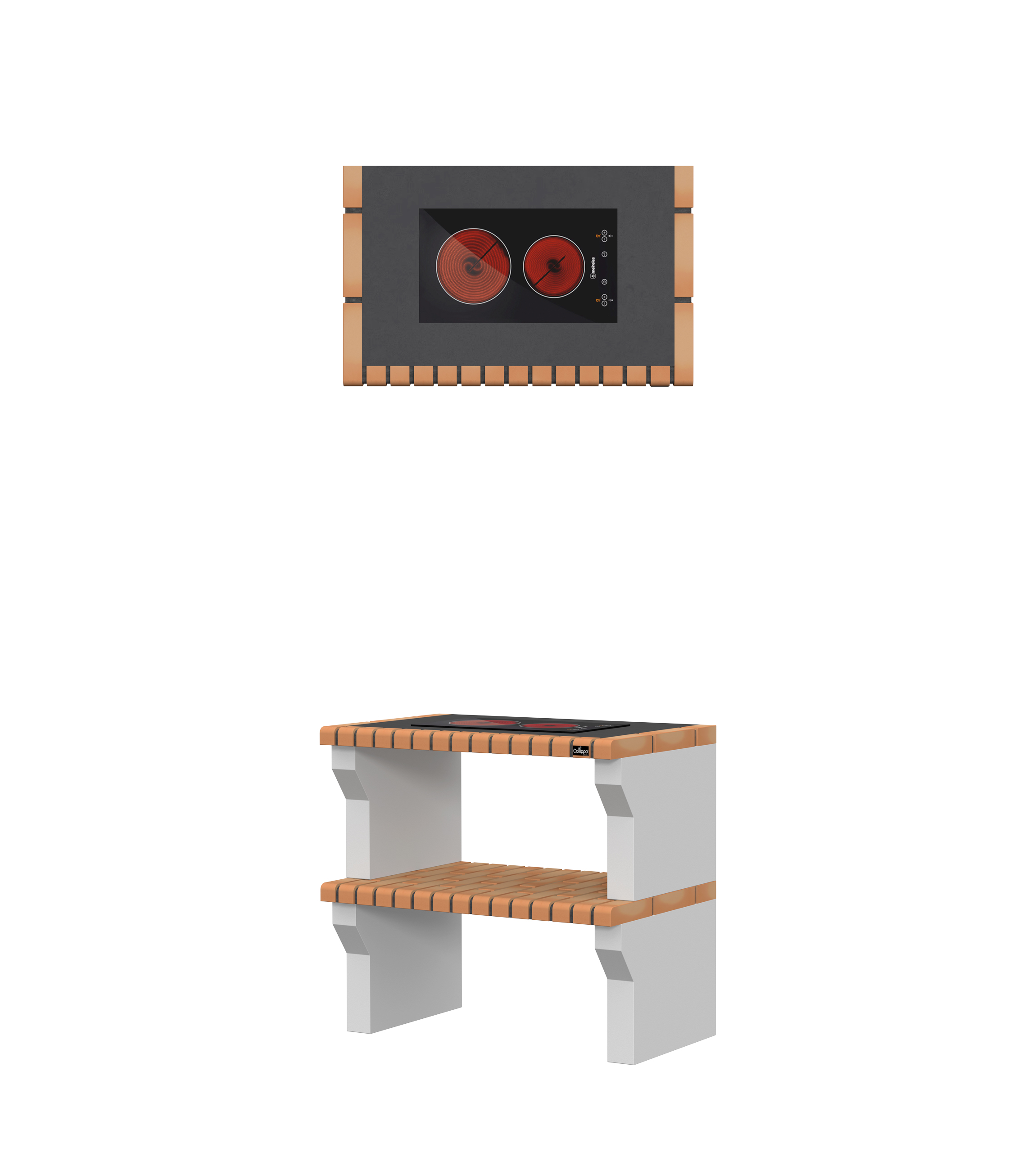 Micro betão cinzento liso; bancada em tijolo e em pedra preta.