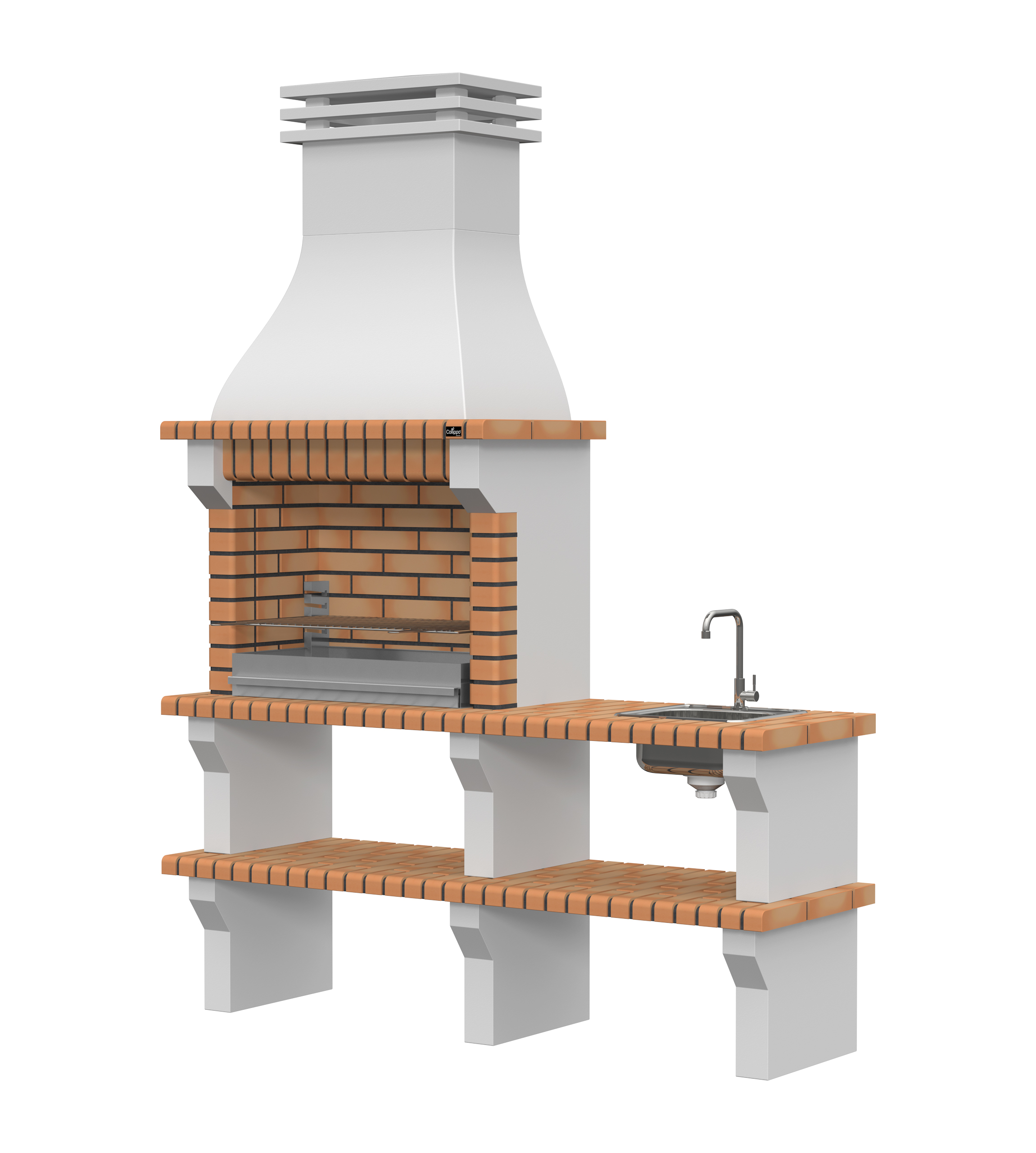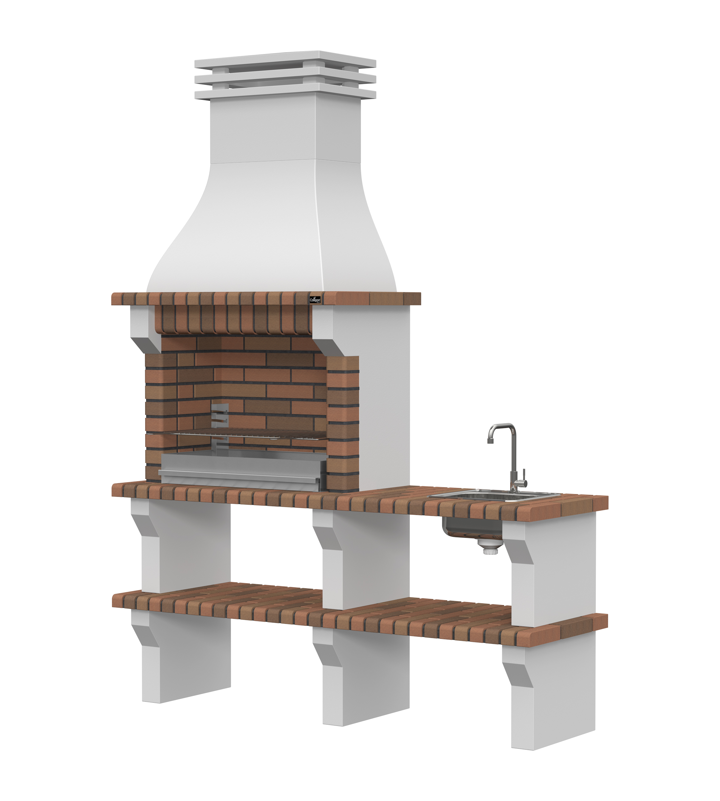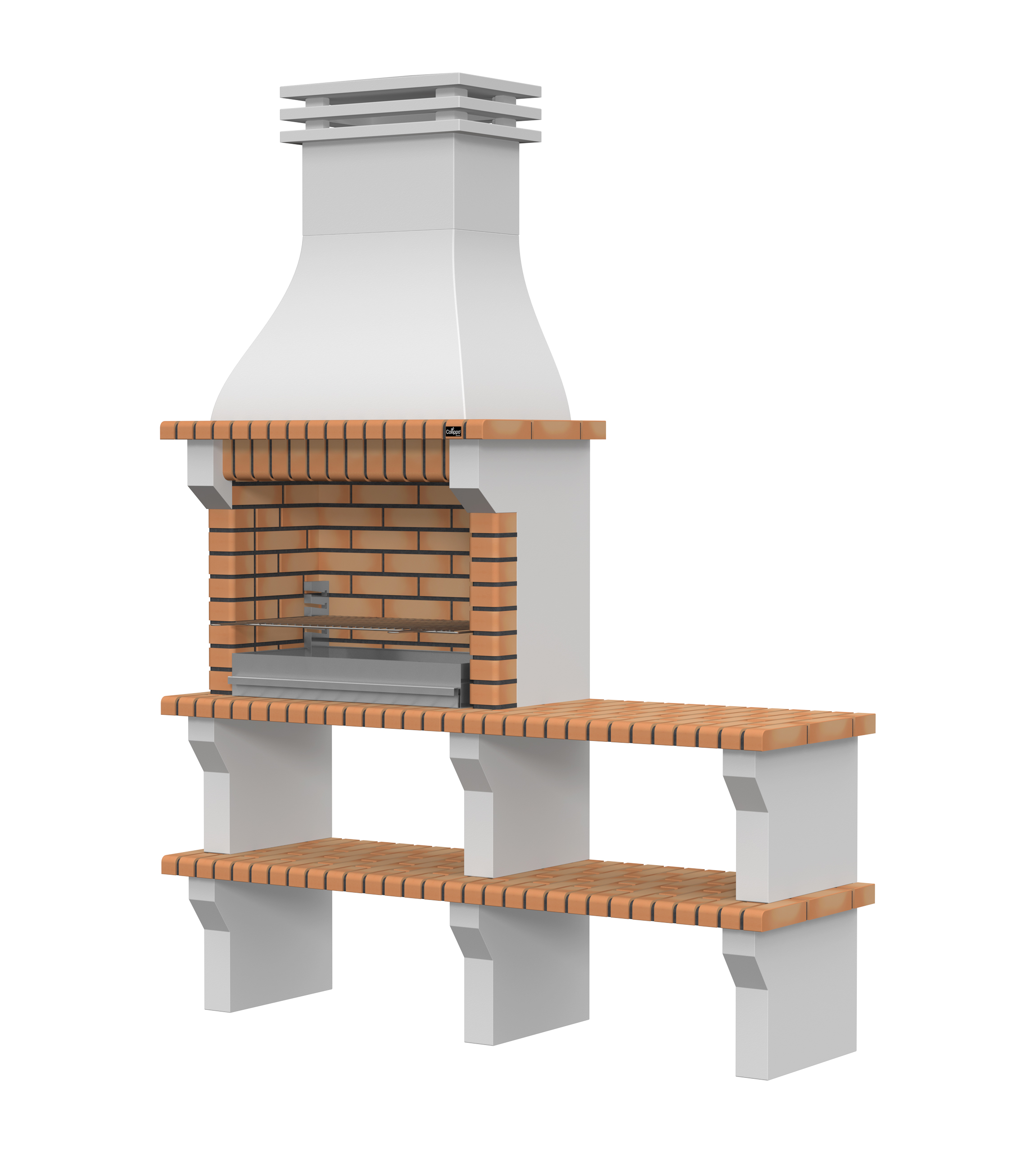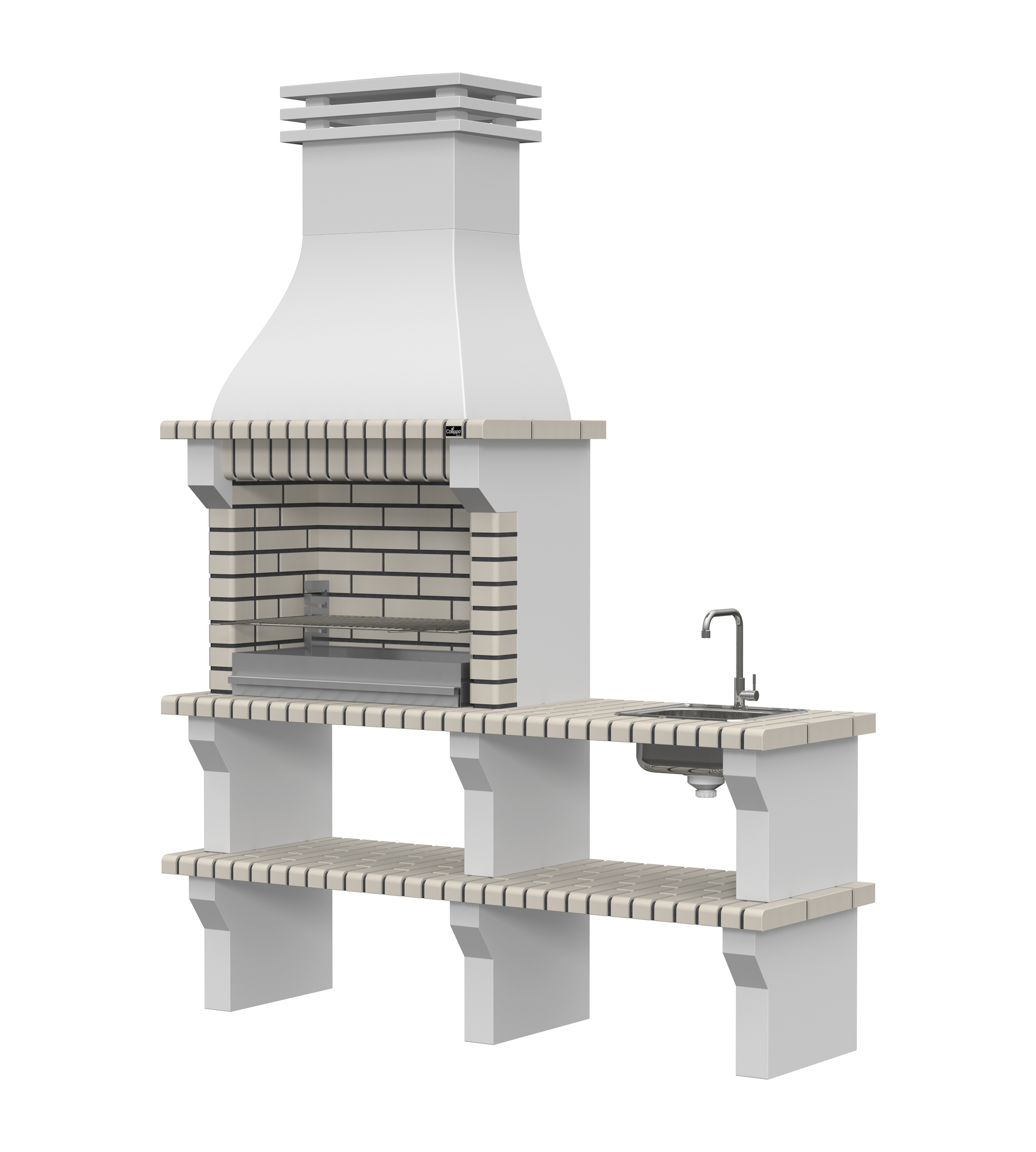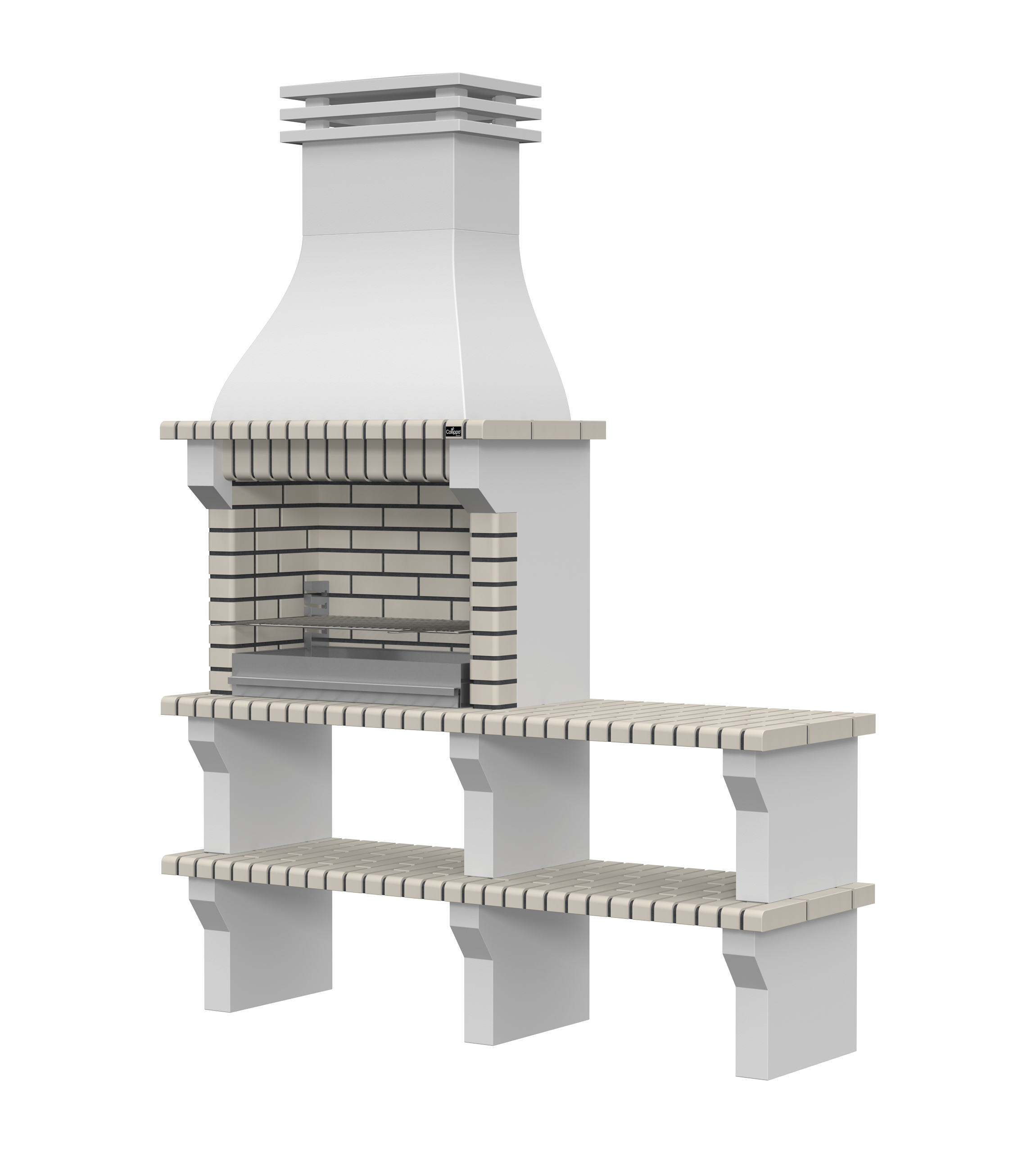 Peças em micro betão cinzento liso e micro betão cinzento texturado; zona de fogo em tijolo e cimento refractário.