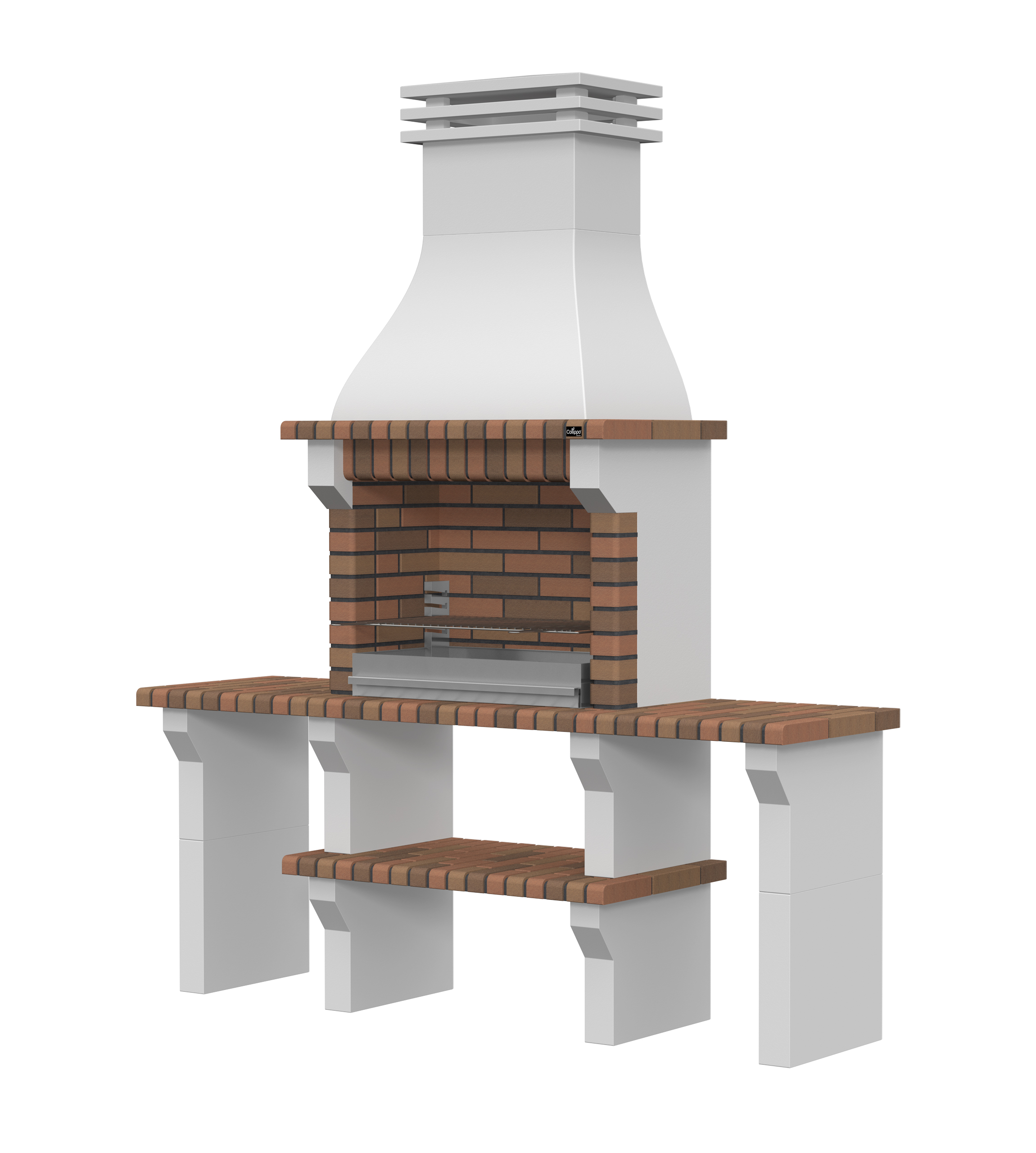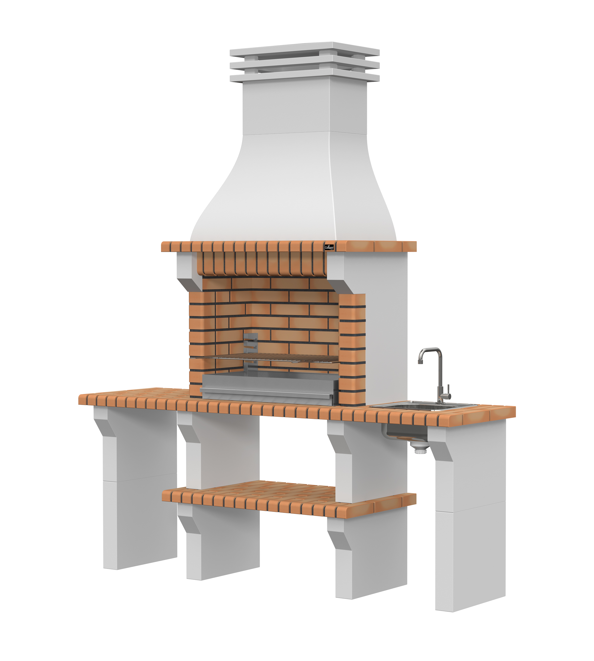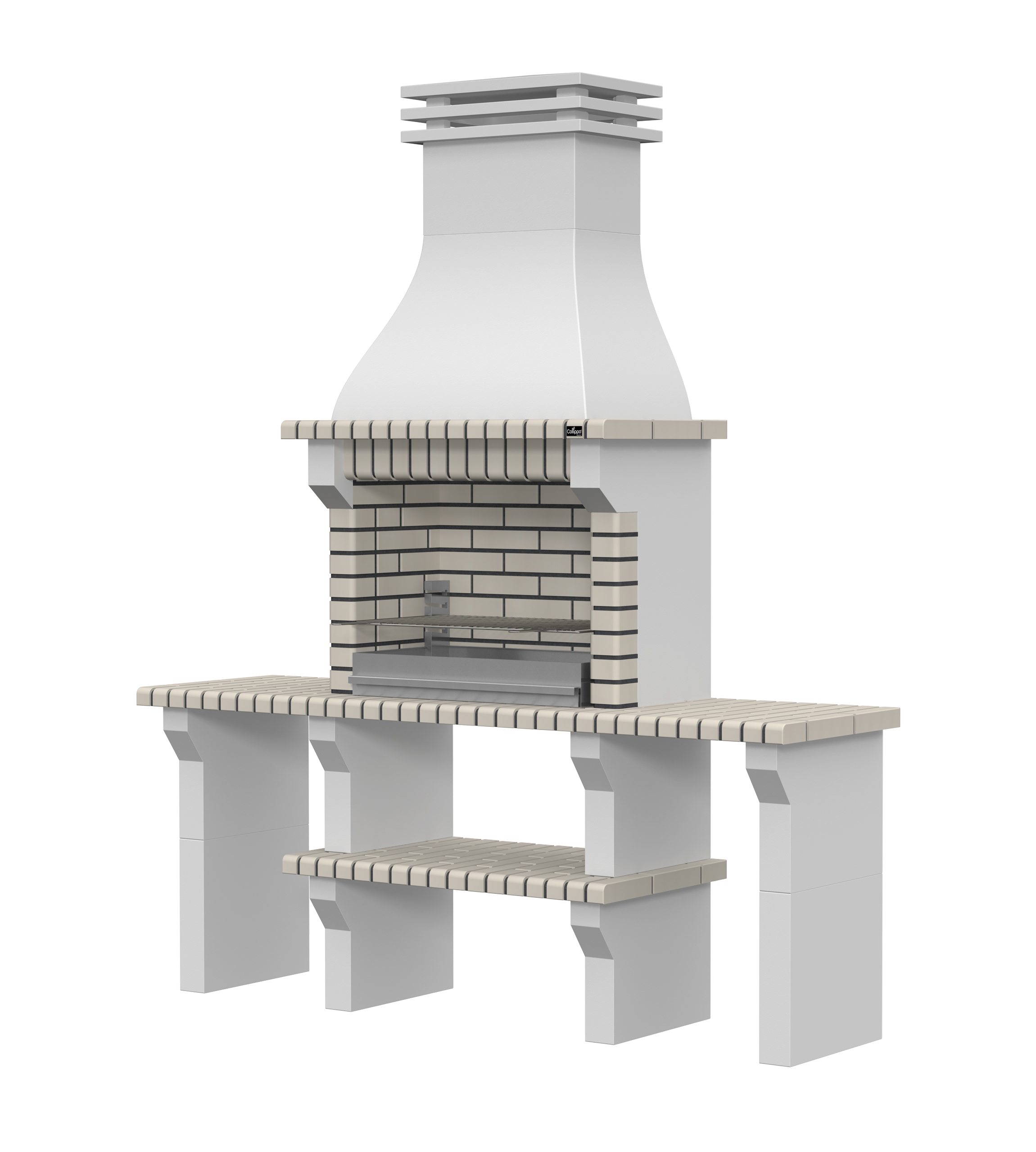 Peças em micro betão cinzento liso e micro betão cinzento texturado; zona de fogo em tijolo e cimento refractário.