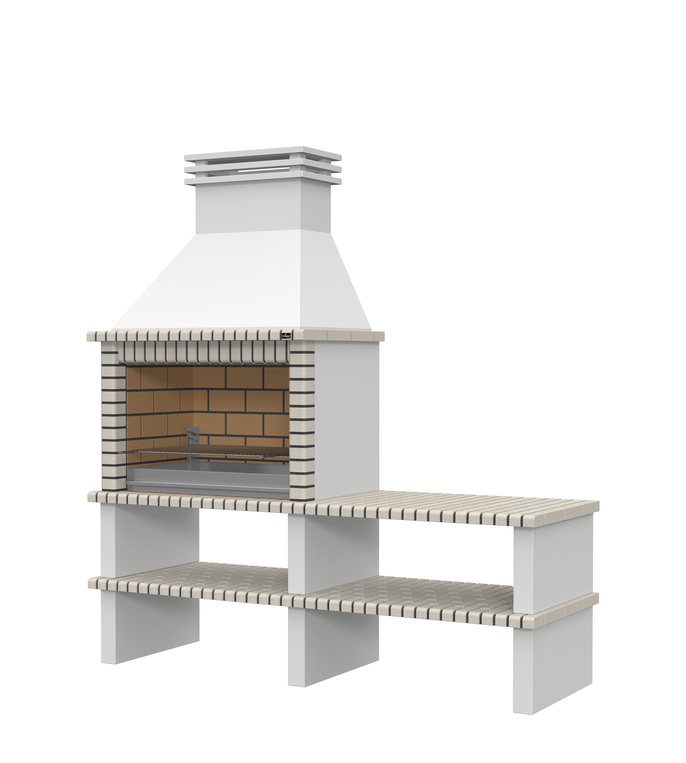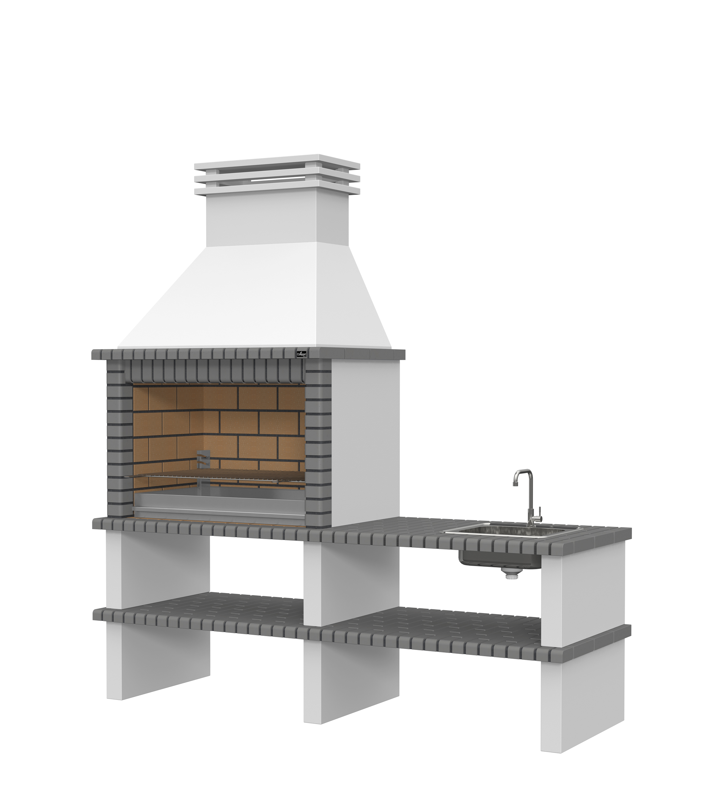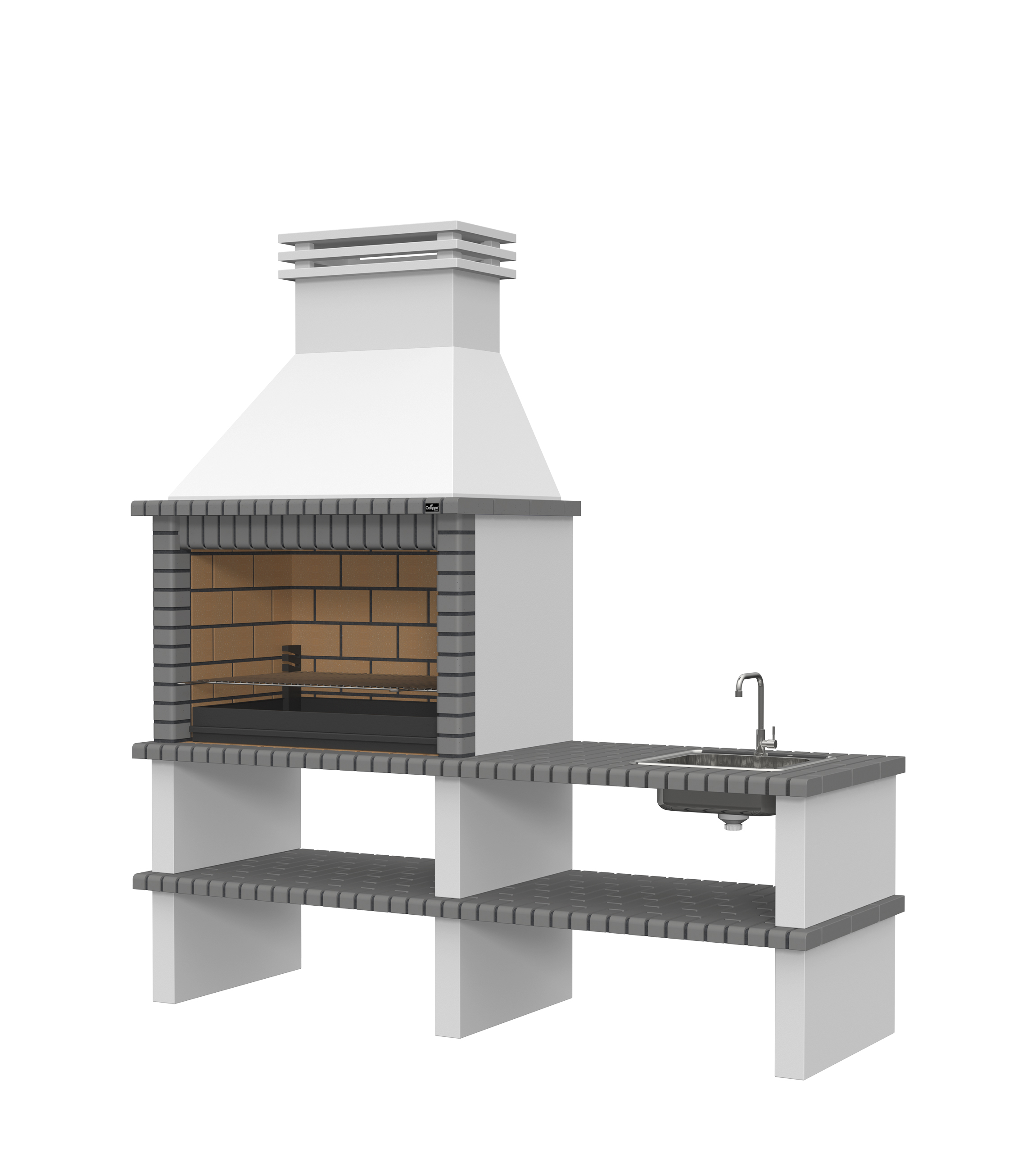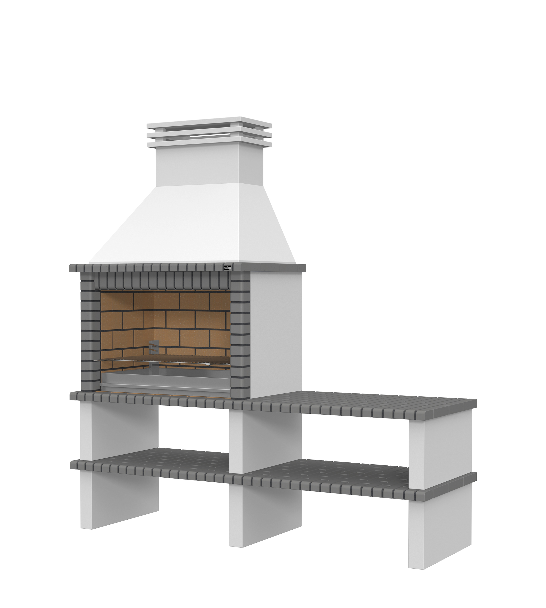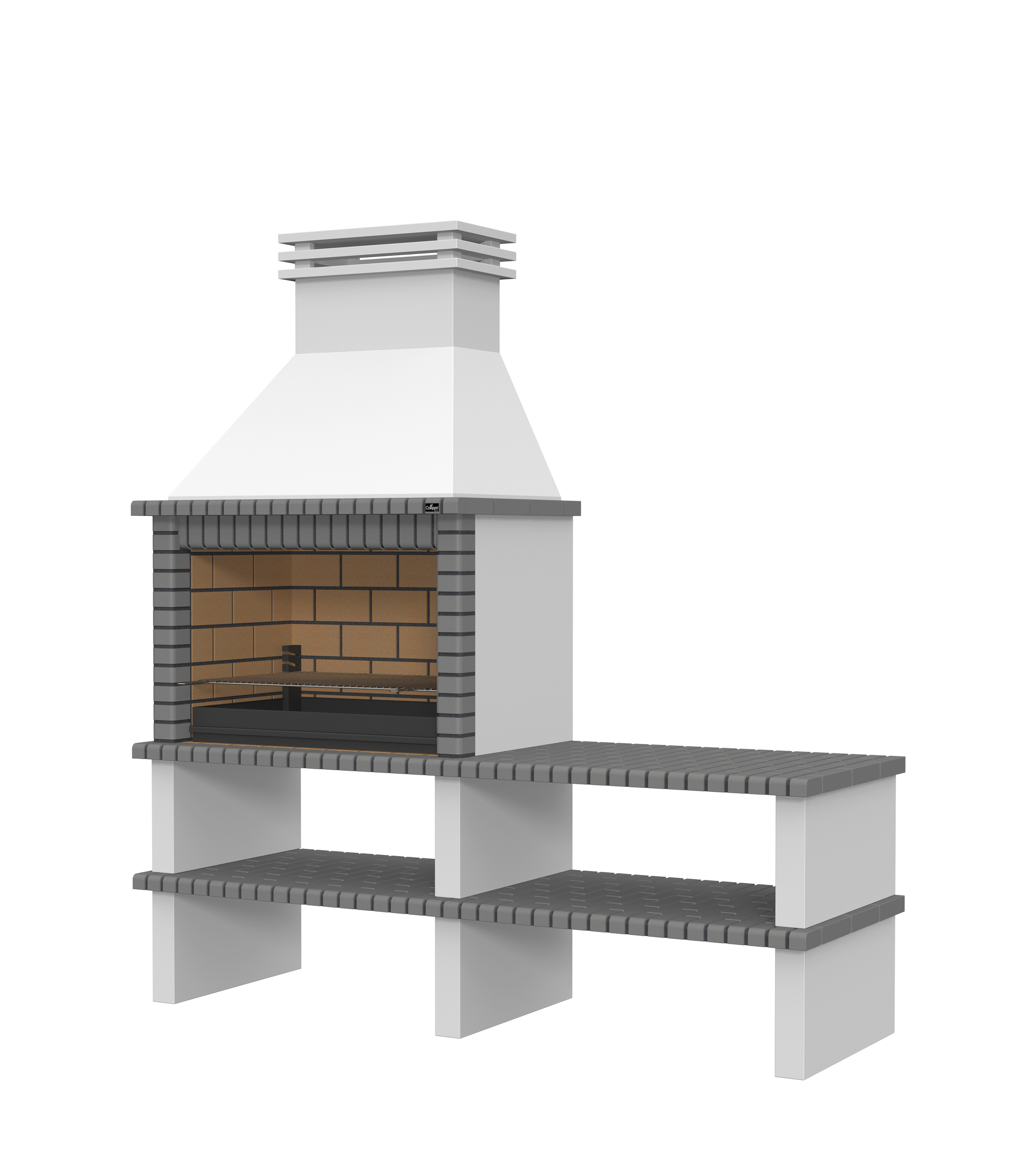 Chaminé e pés em micro betão cinzento liso; laterais em micro betão cinzento texturado; zona de fogo em tijoleira refractária e cimento refractário.