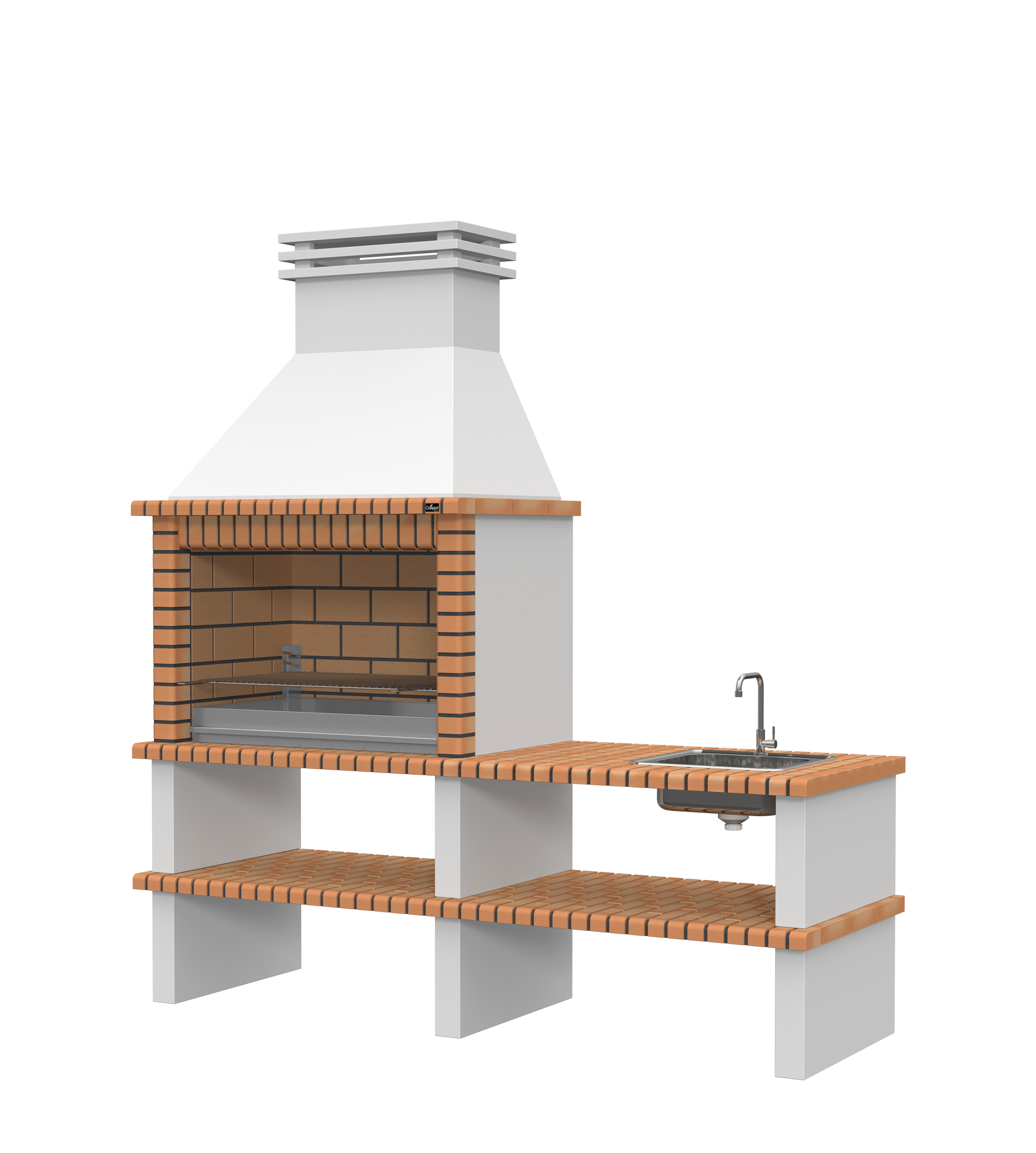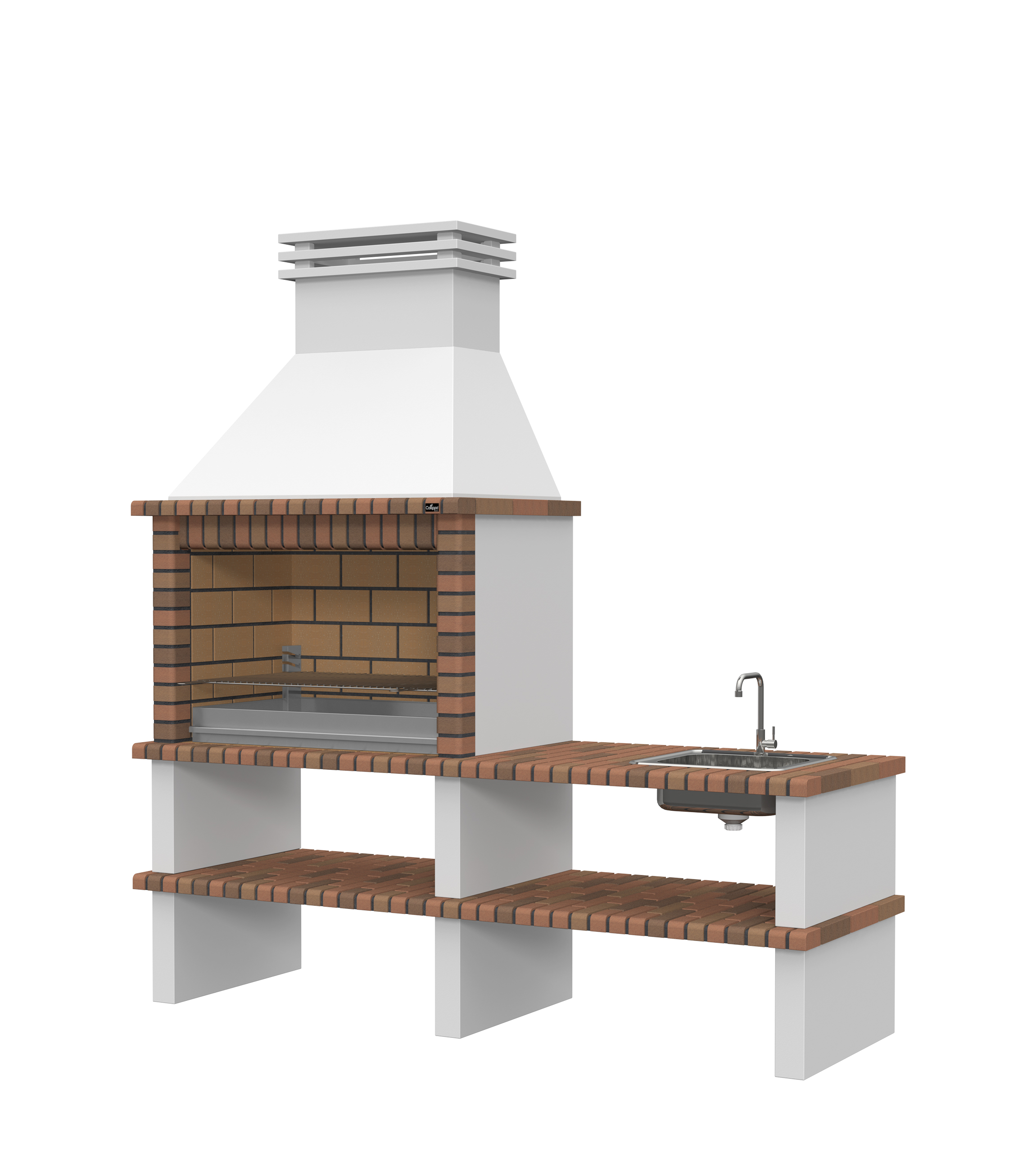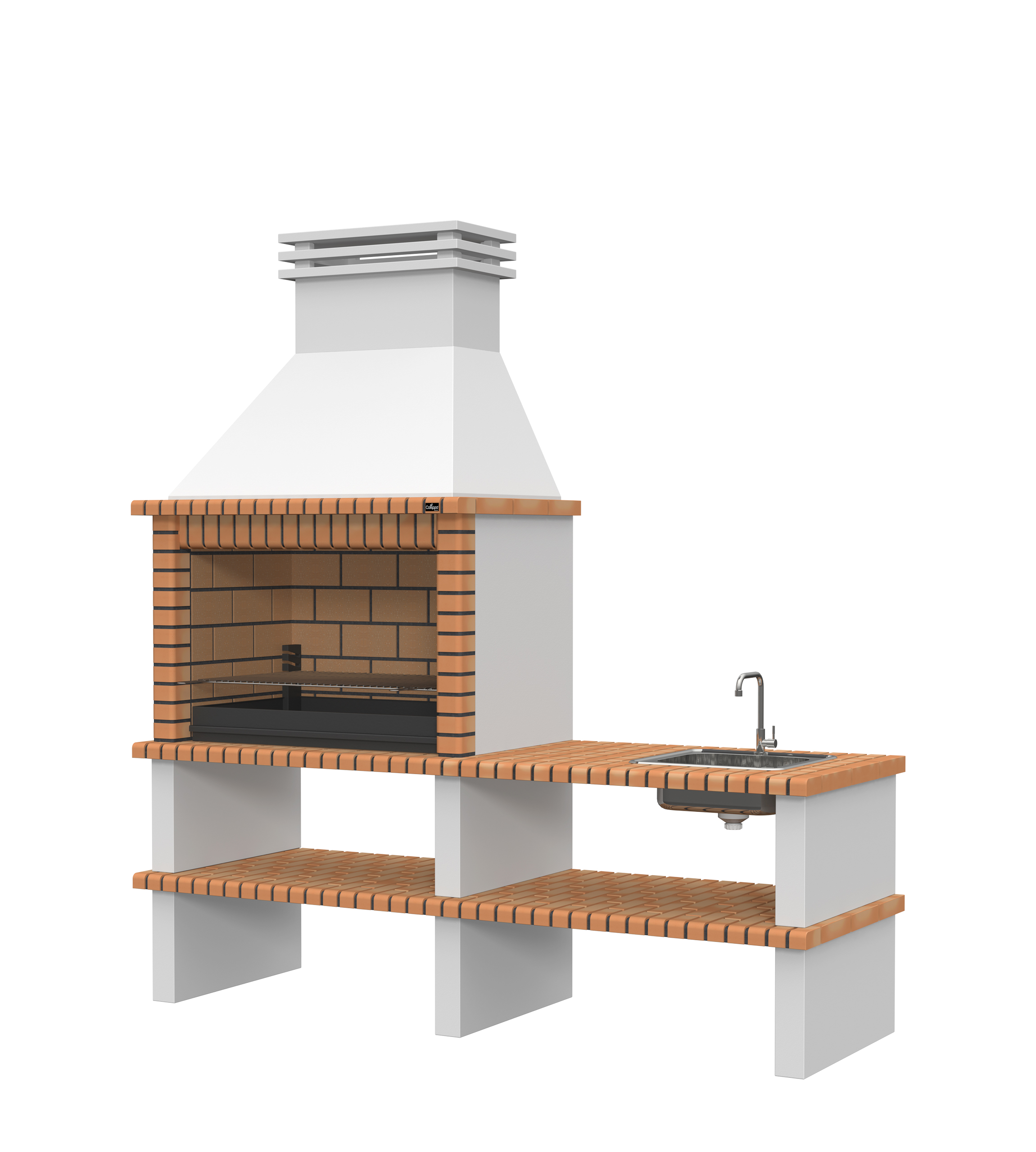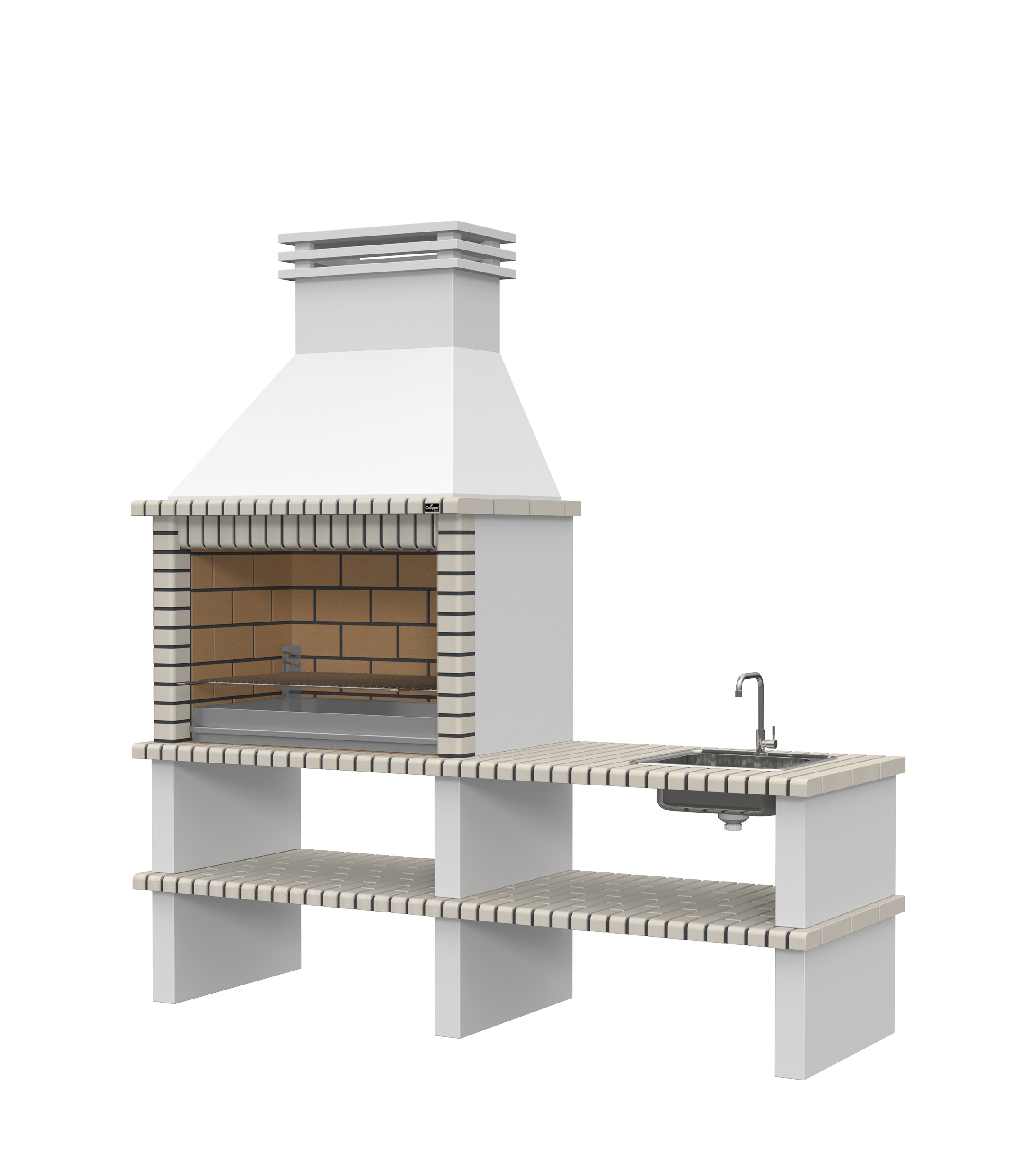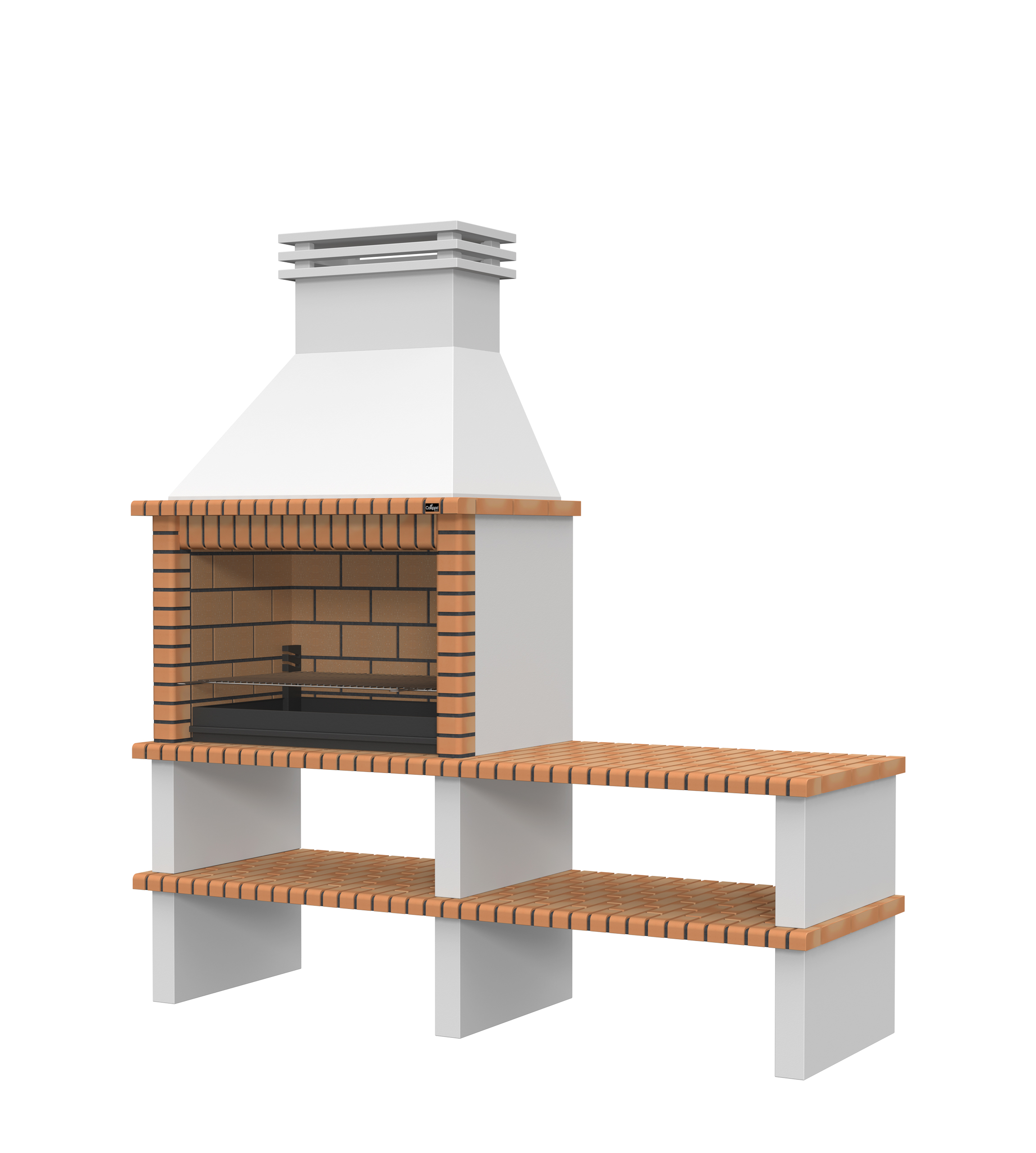 Chaminé e pés em micro betão cinzento liso; laterais em micro betão cinzento texturado; zona de fogo em tijoleira refractária e cimento refractário.