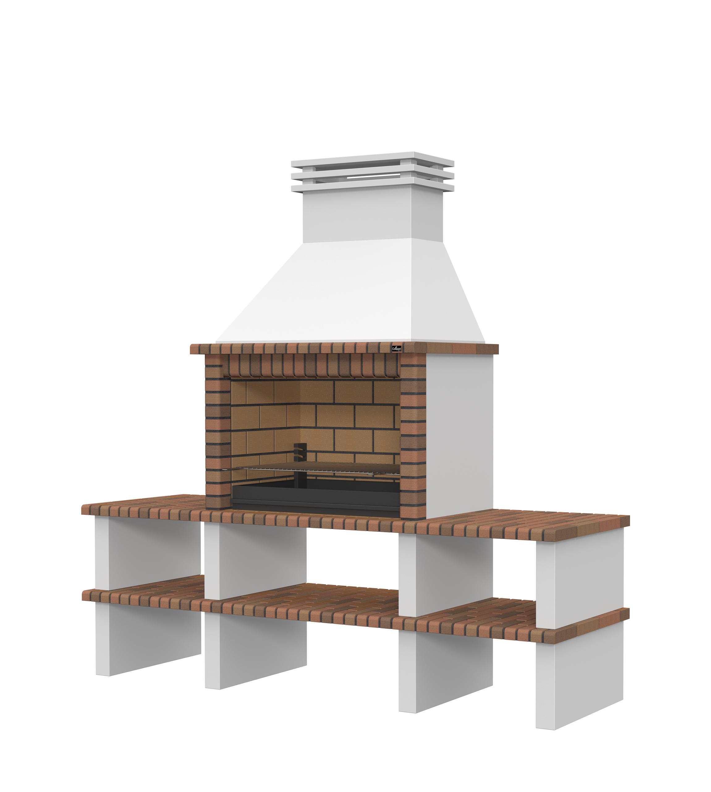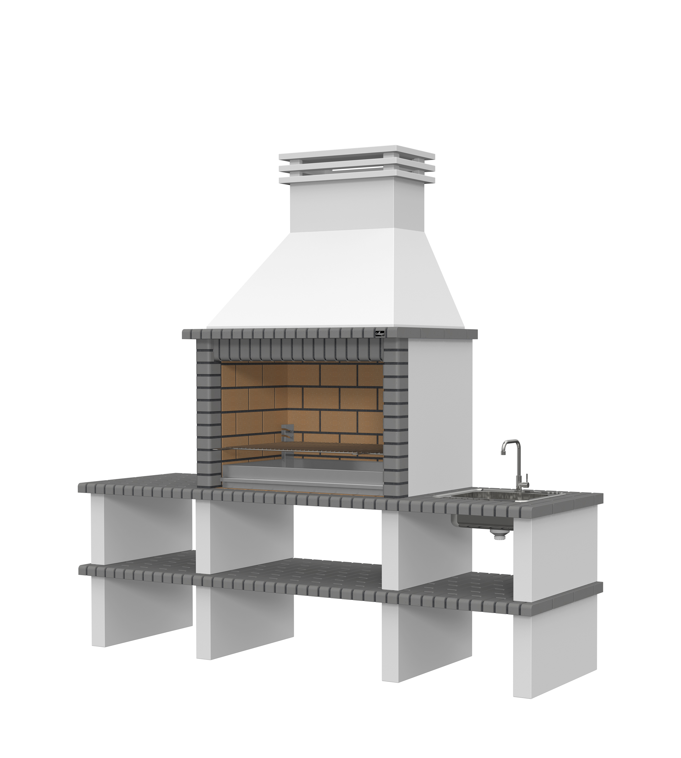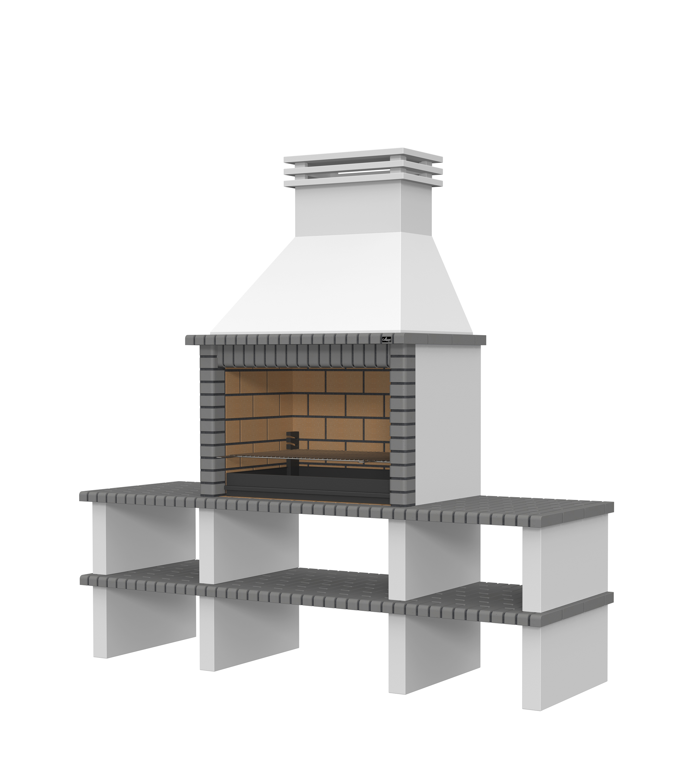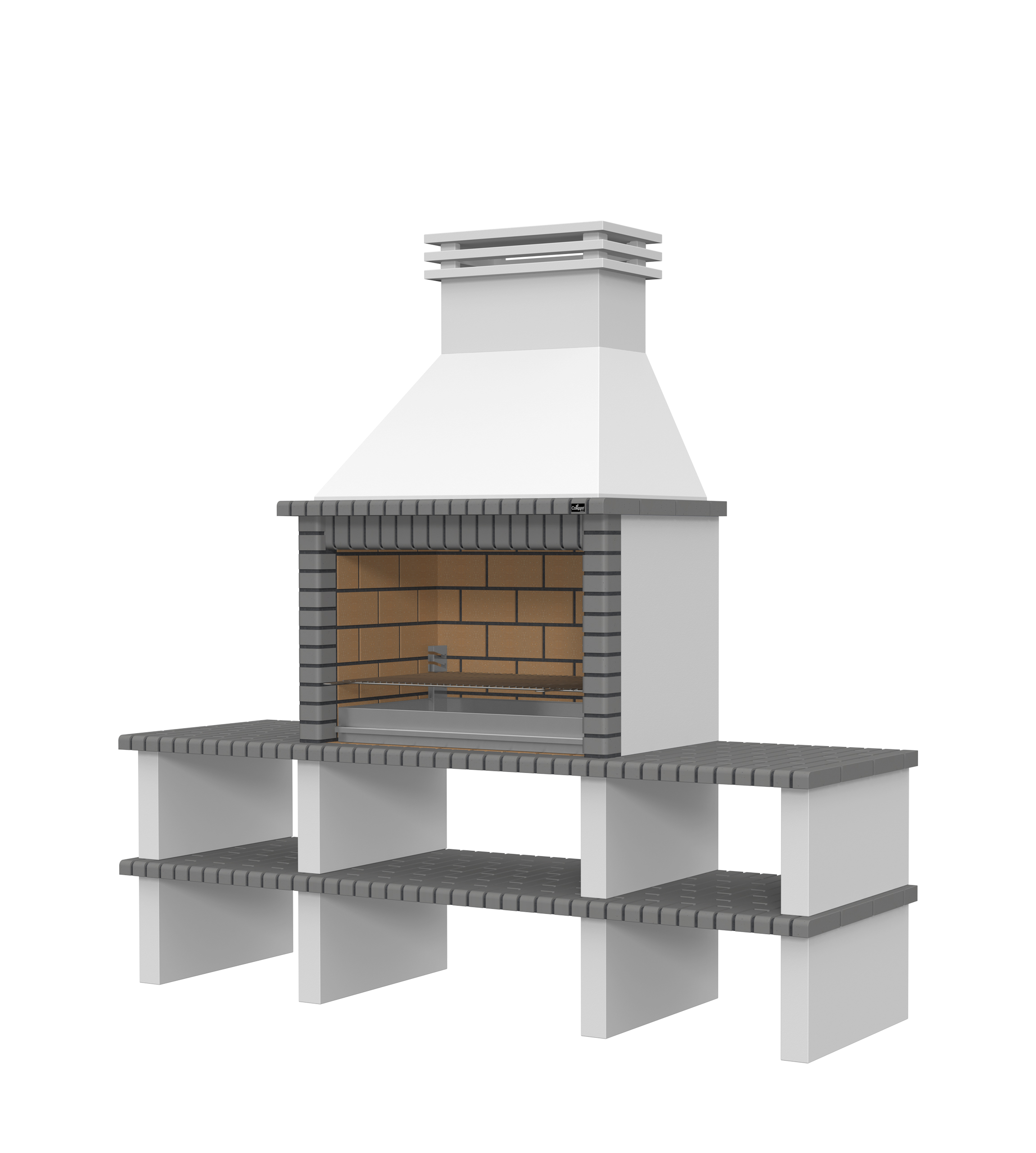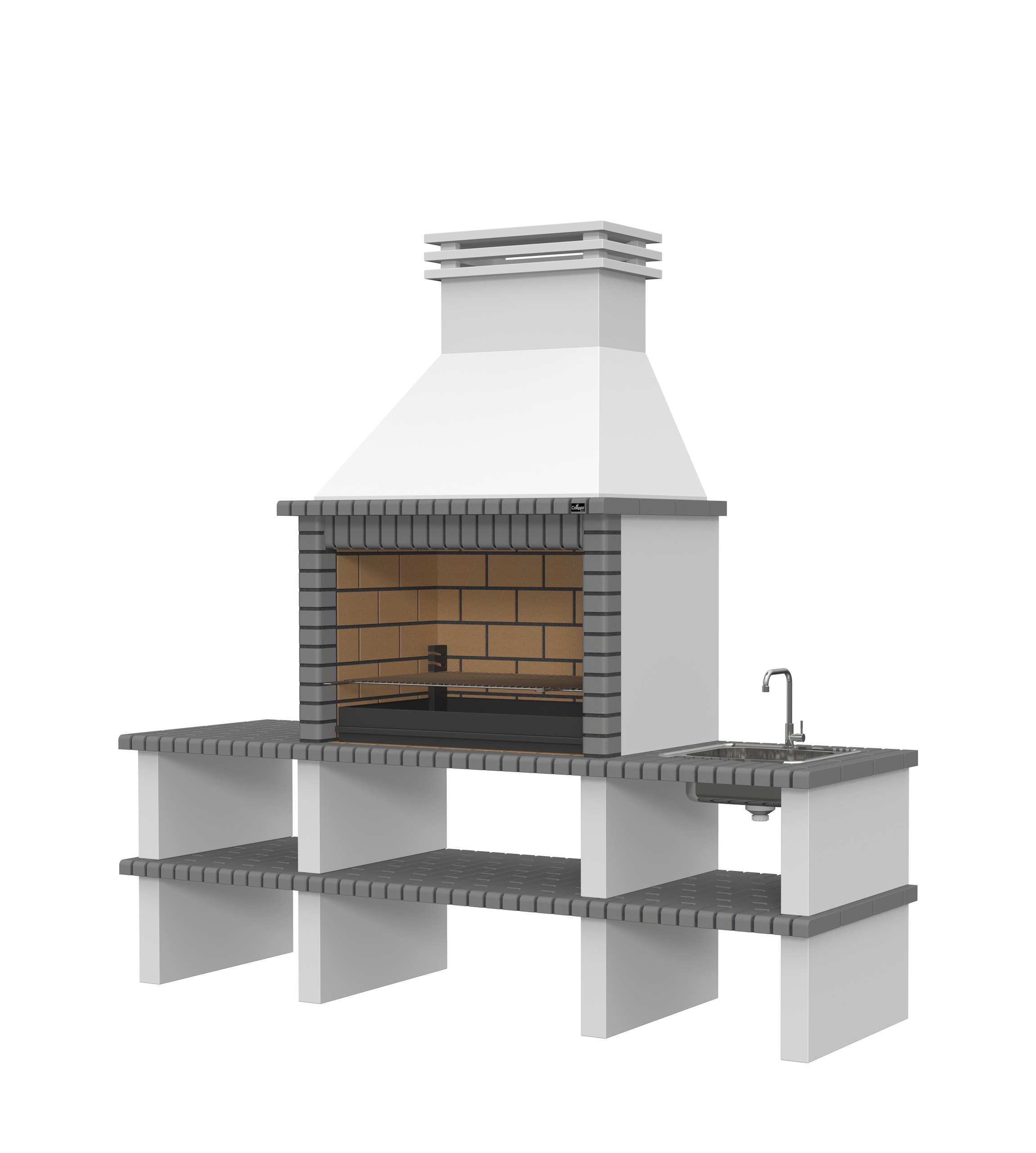Chaminé e pés em micro betão cinzento liso; laterais em micro betão cinzento texturado; zona de fogo em tijoleira refractária e cimento refractário.
