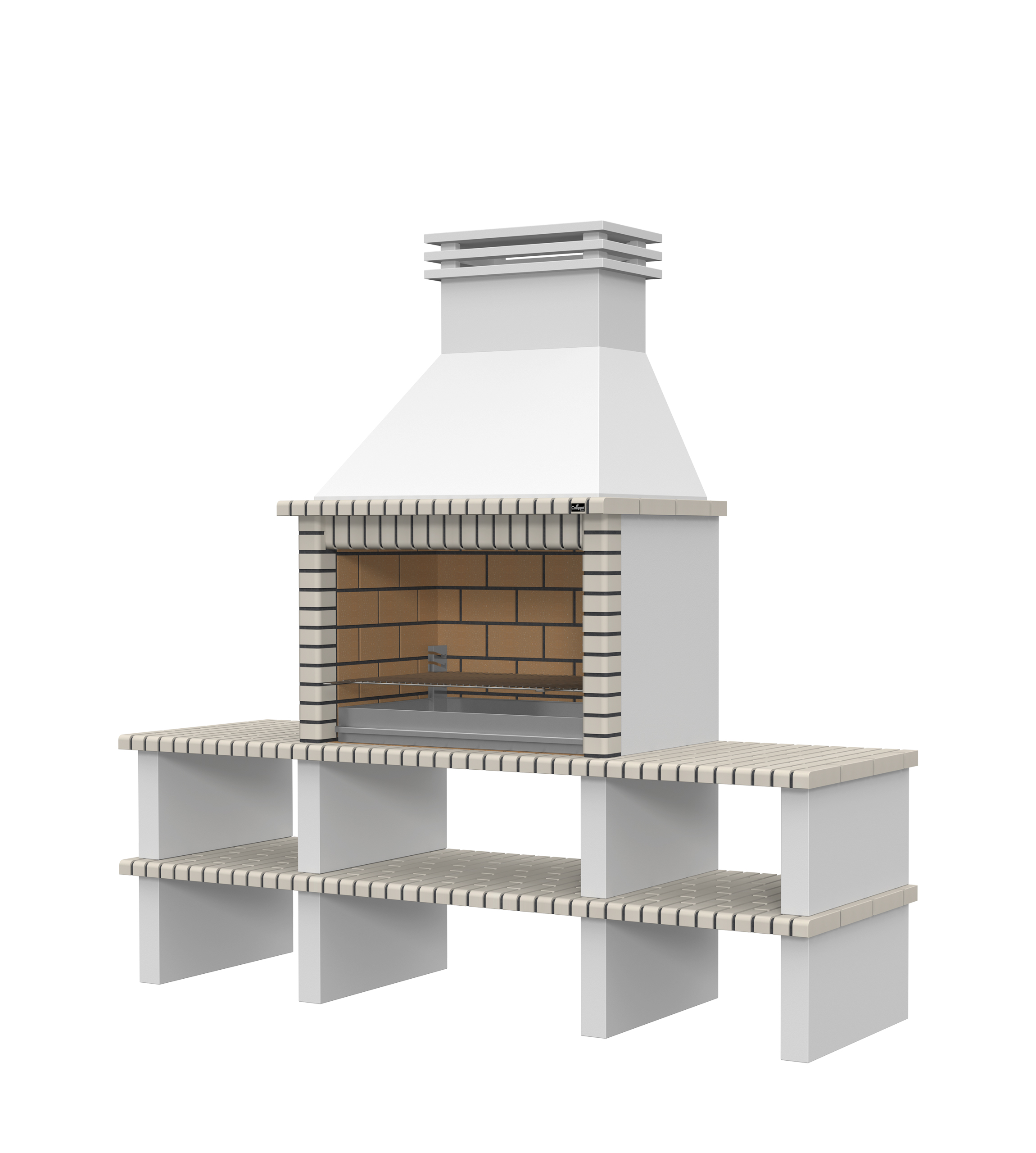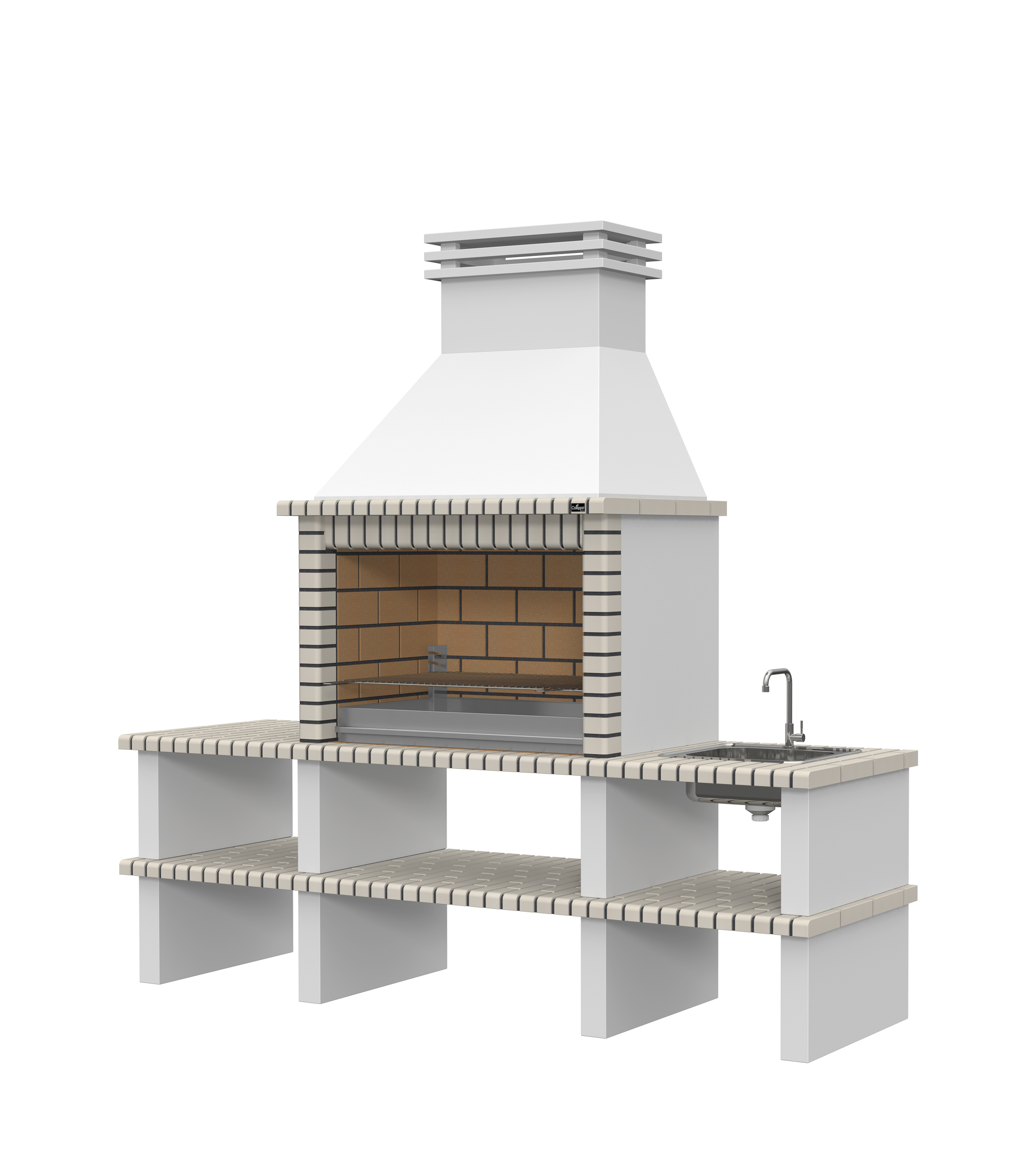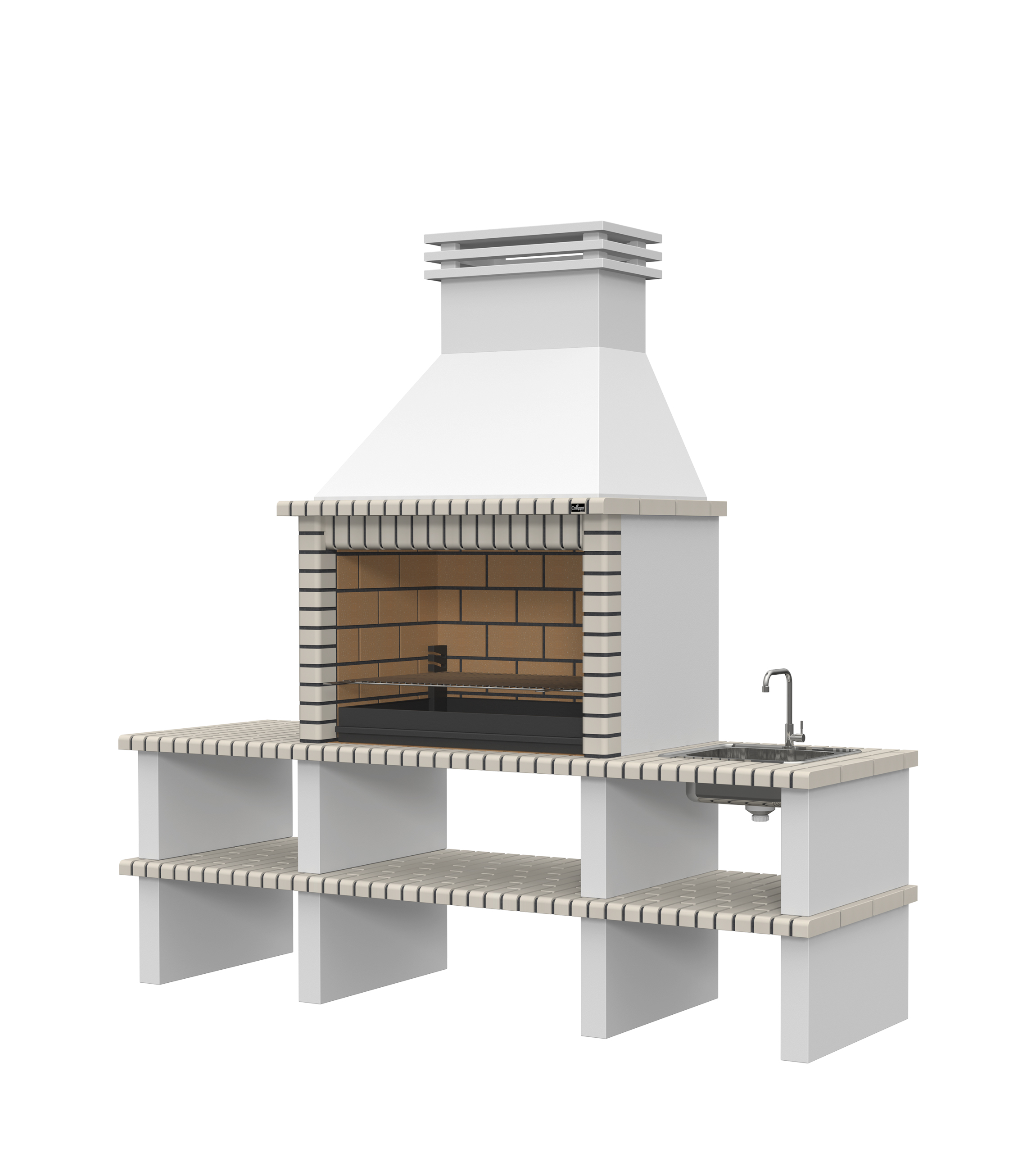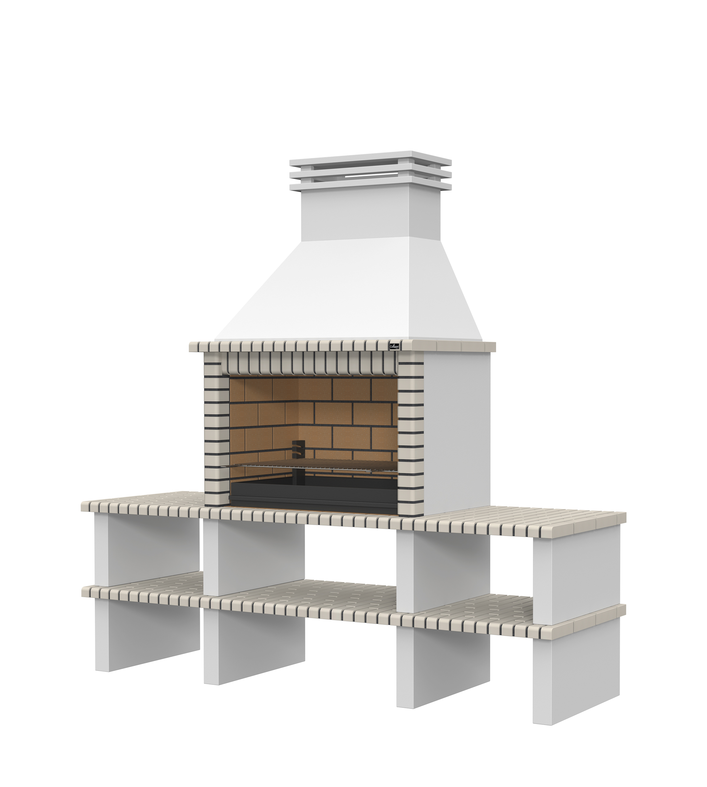 Chaminé e pés em micro betão cinzento liso; laterais em micro betão cinzento texturado; zona de fogo em tijoleira refractária e cimento refractário.