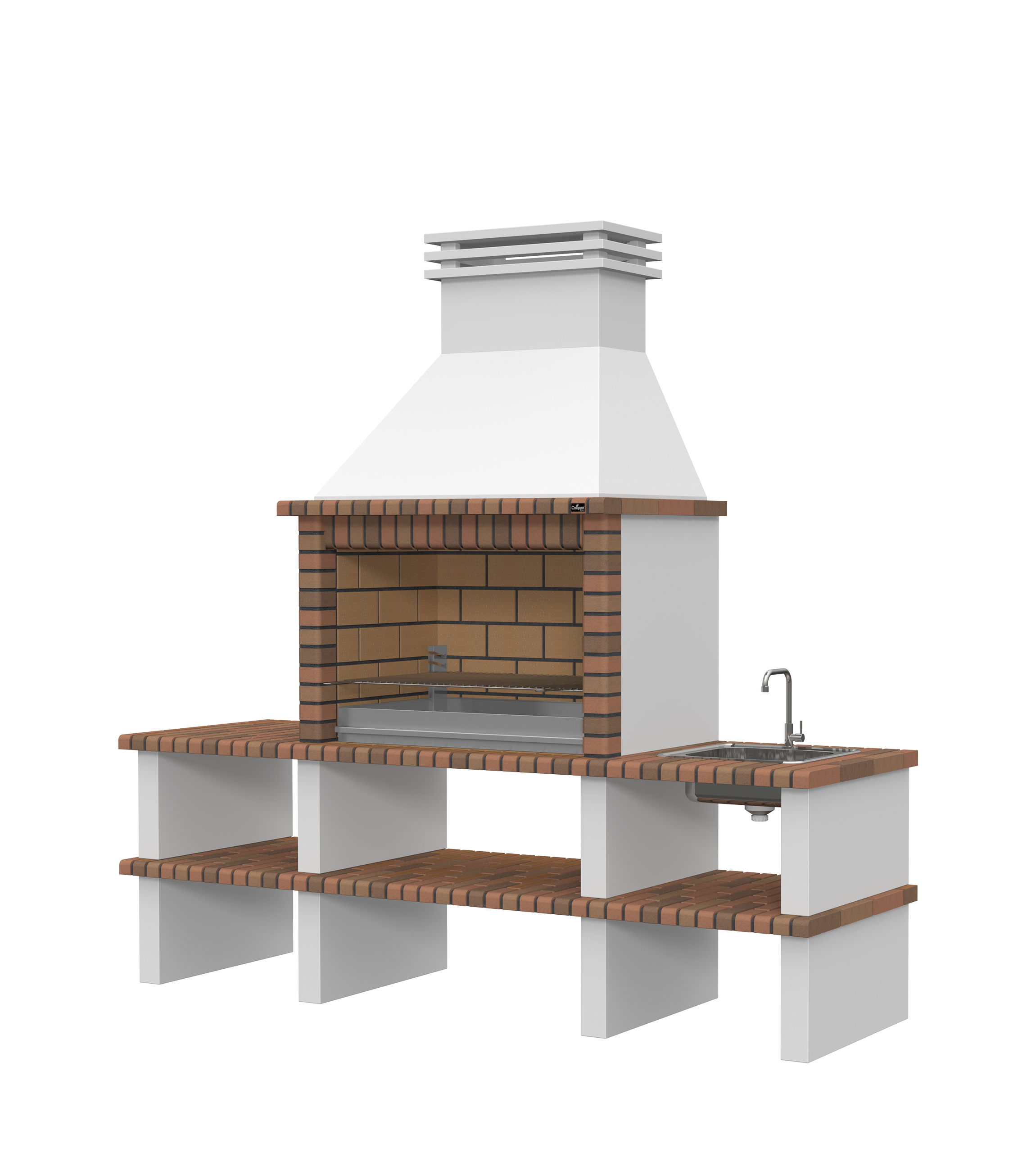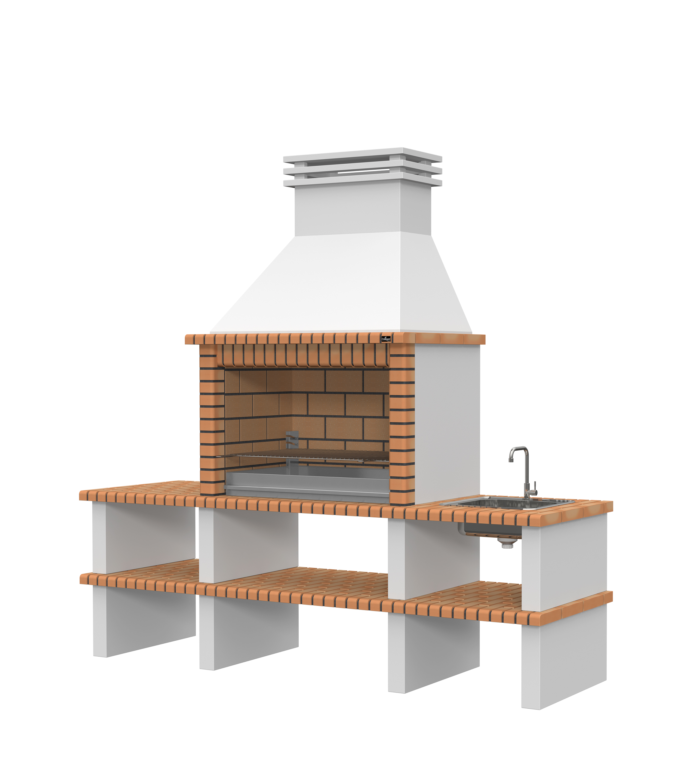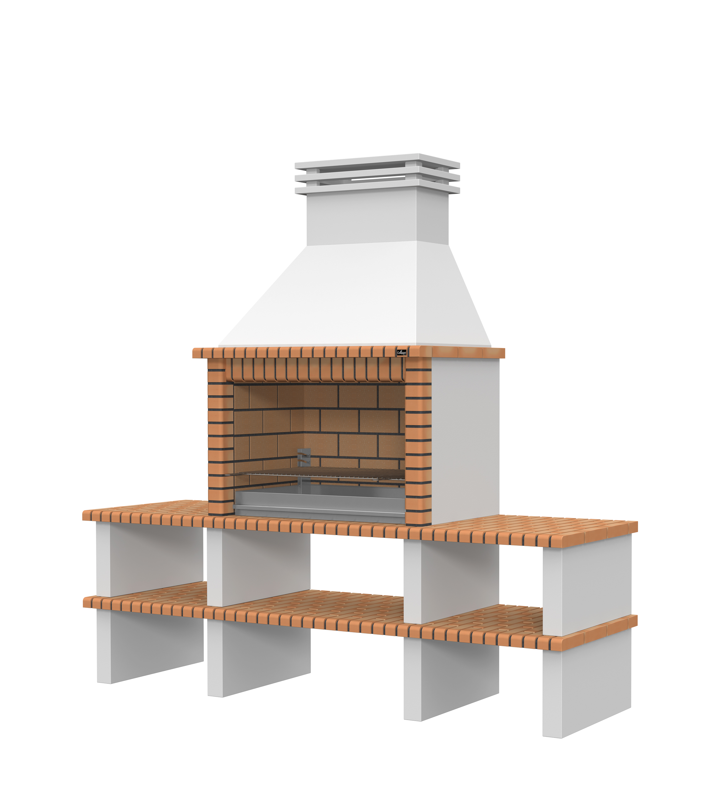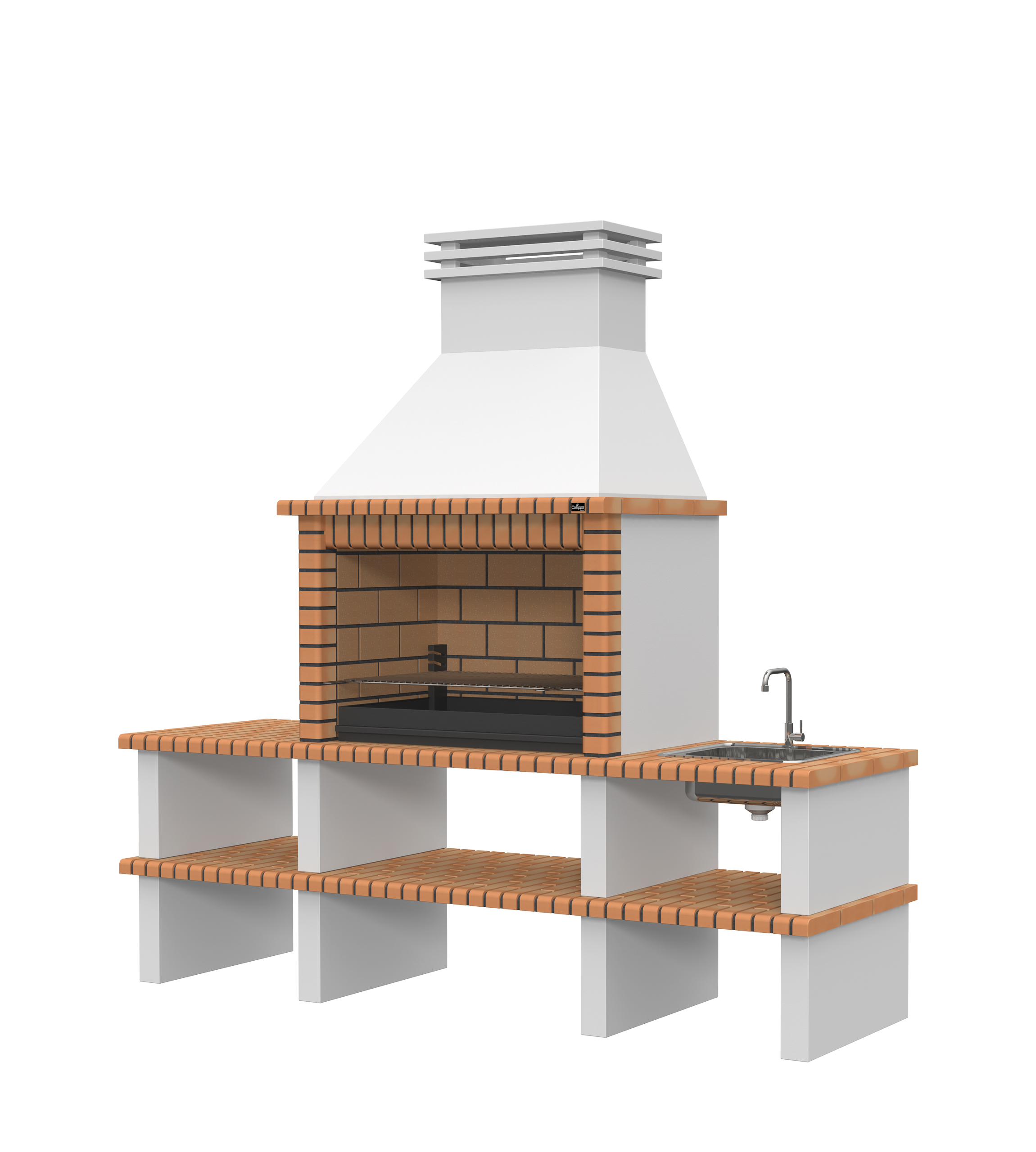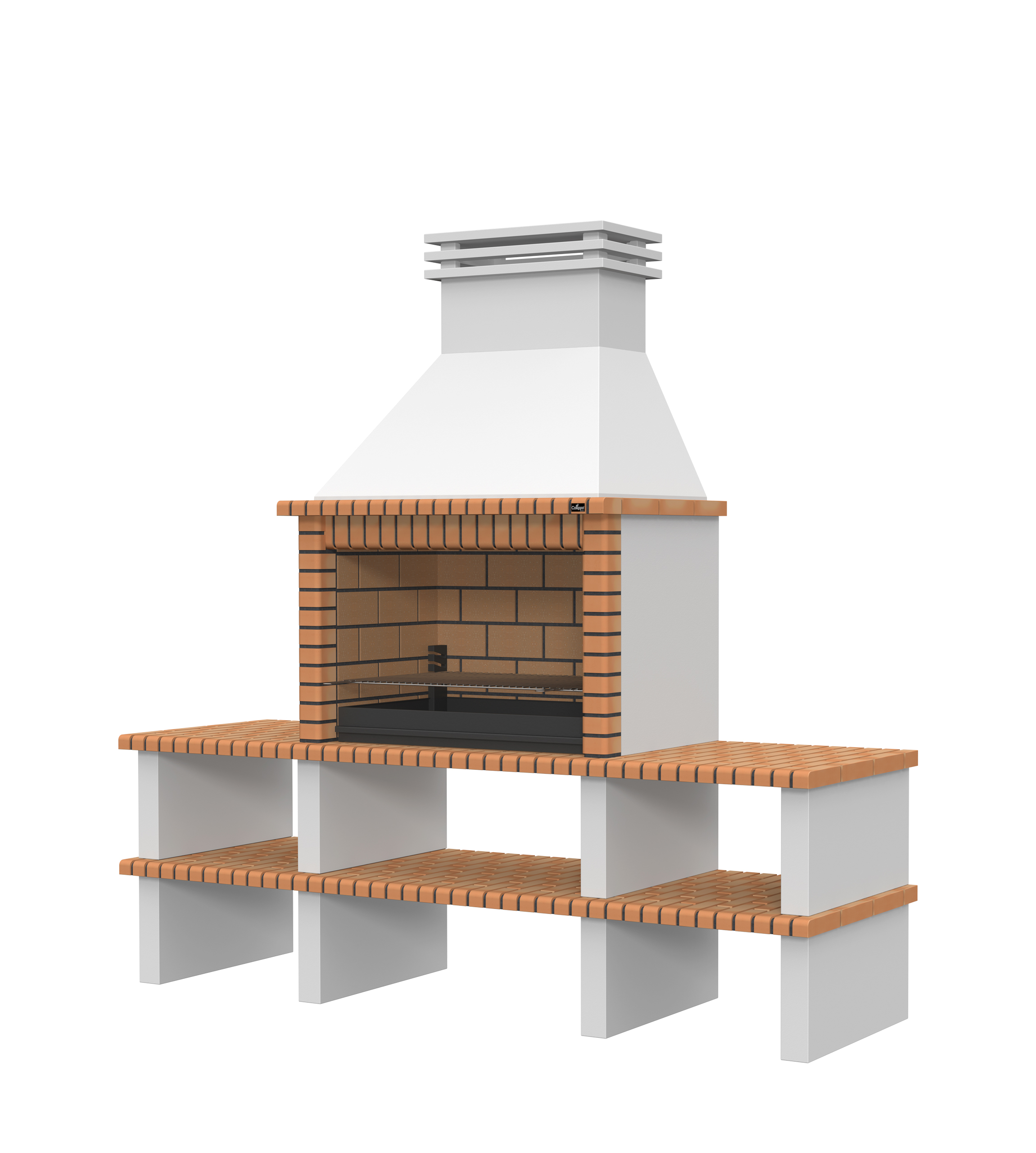 Chaminé e pés em micro betão cinzento liso; laterais em micro betão cinzento texturado; zona de fogo em tijoleira refractária e cimento refractário.
