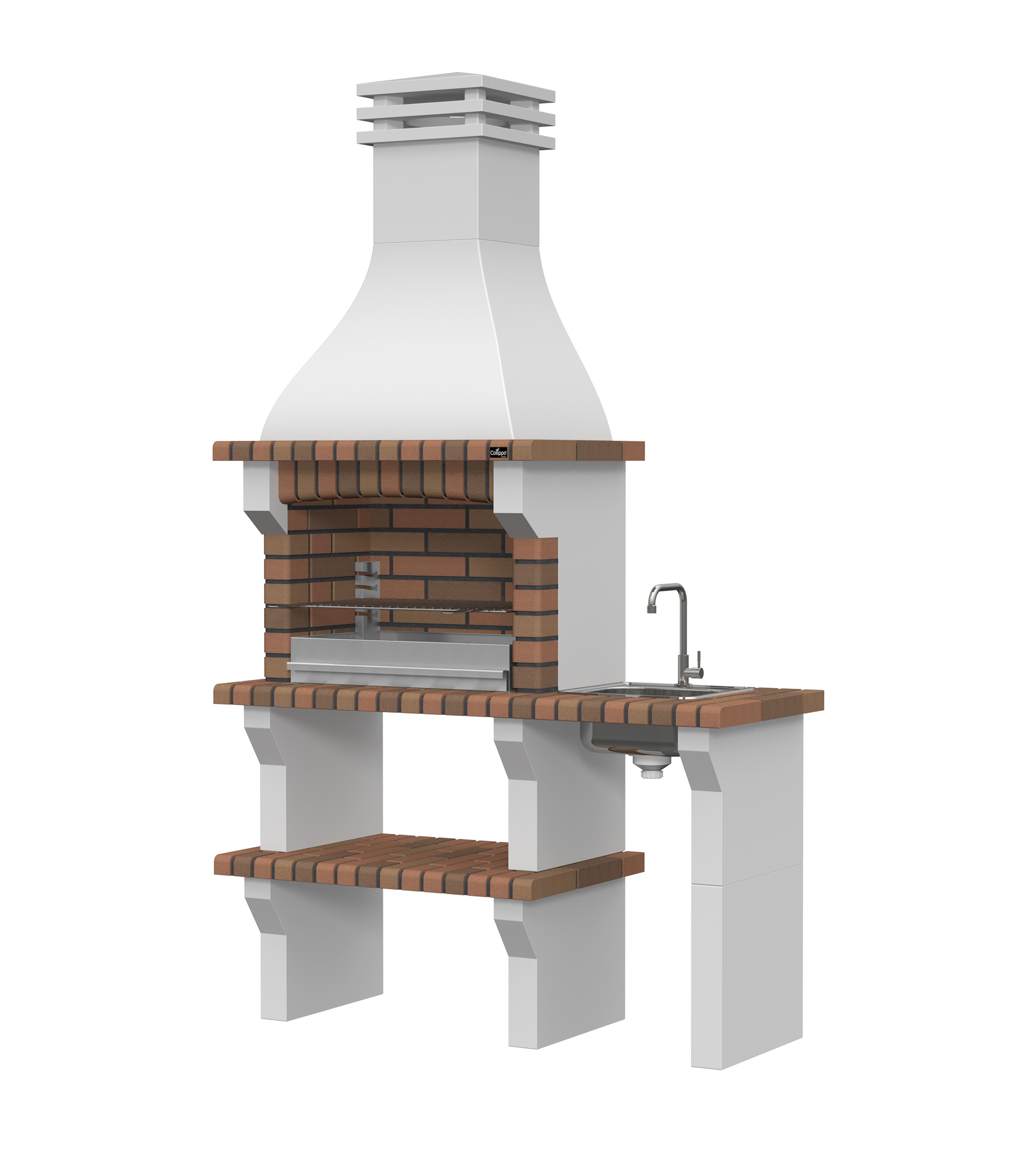Peças em micro betão cinzento liso e micro betão cinzento texturado; zona de fogo em tijolo e cimento refractário