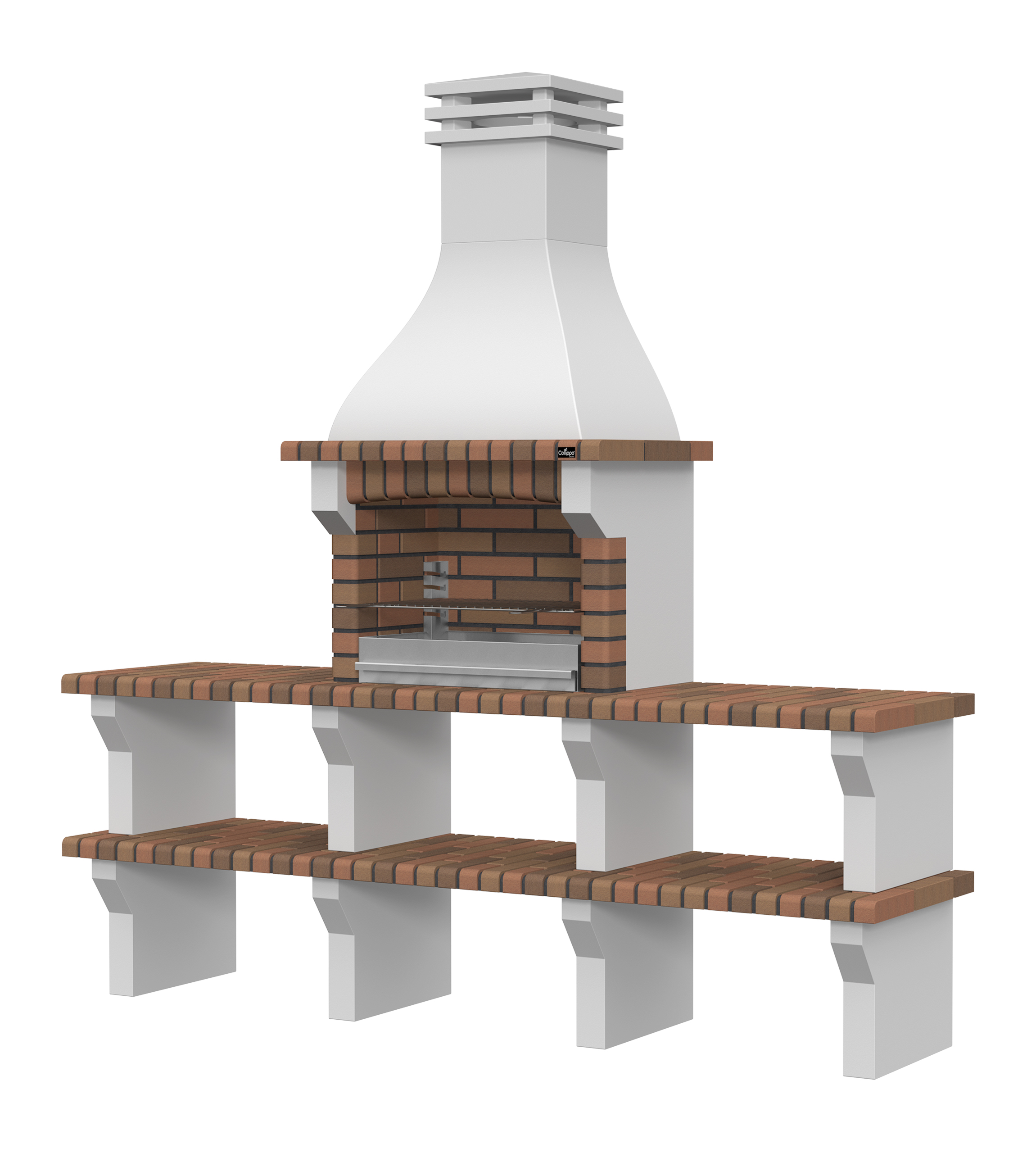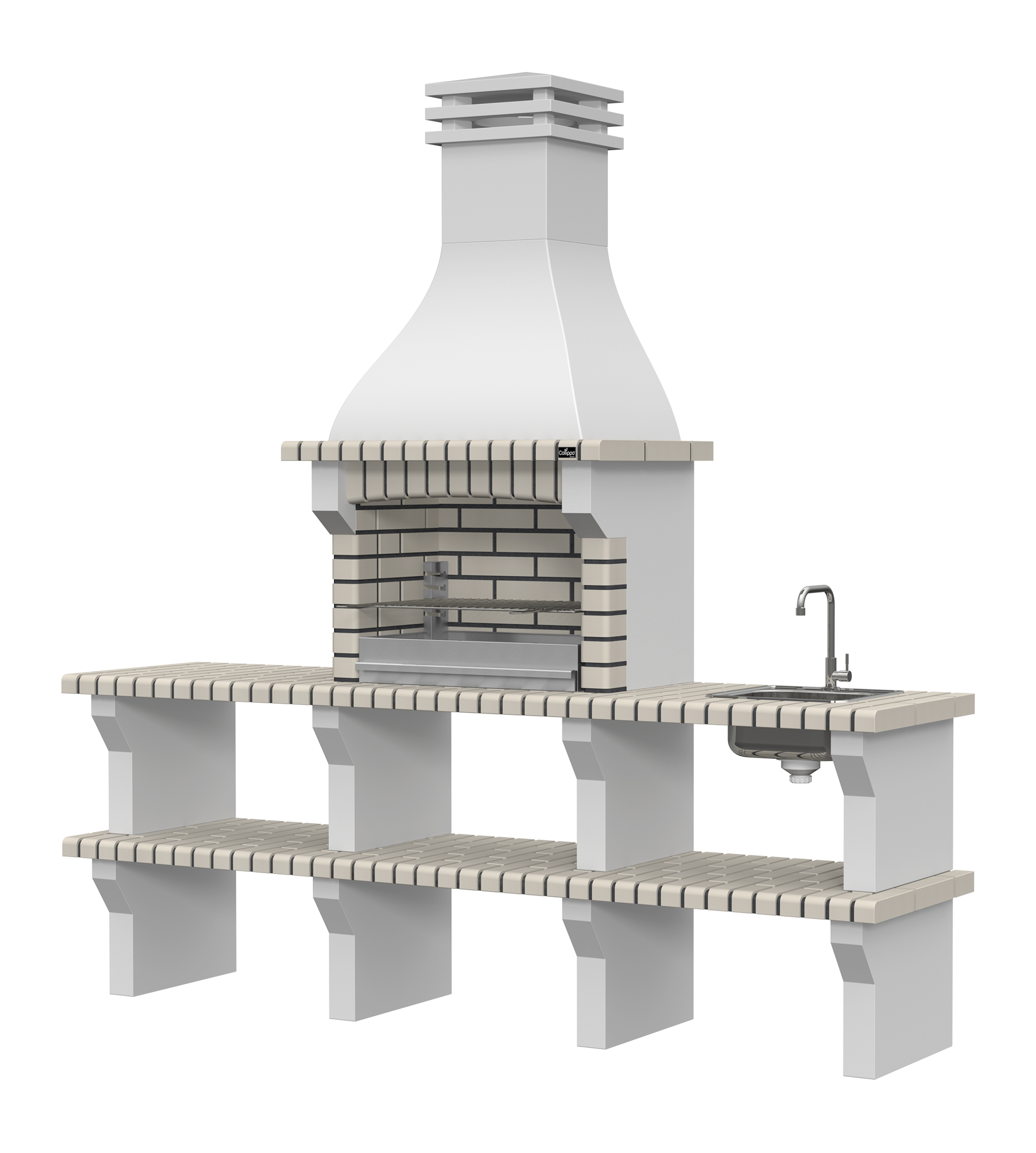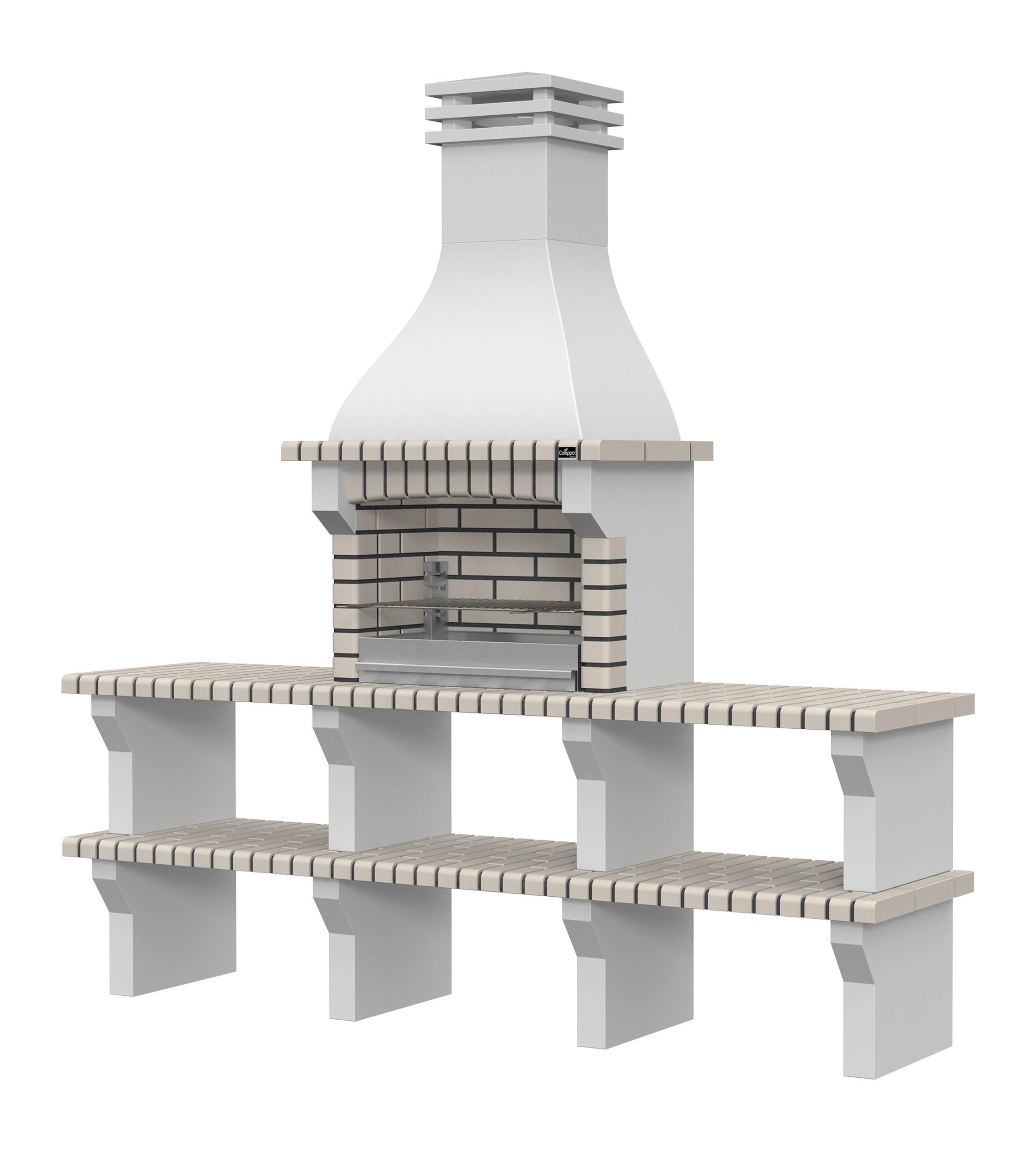 Peças em micro betão cinzento liso e micro betão cinzento texturado; zona de fogo em tijolo e cimento refractário