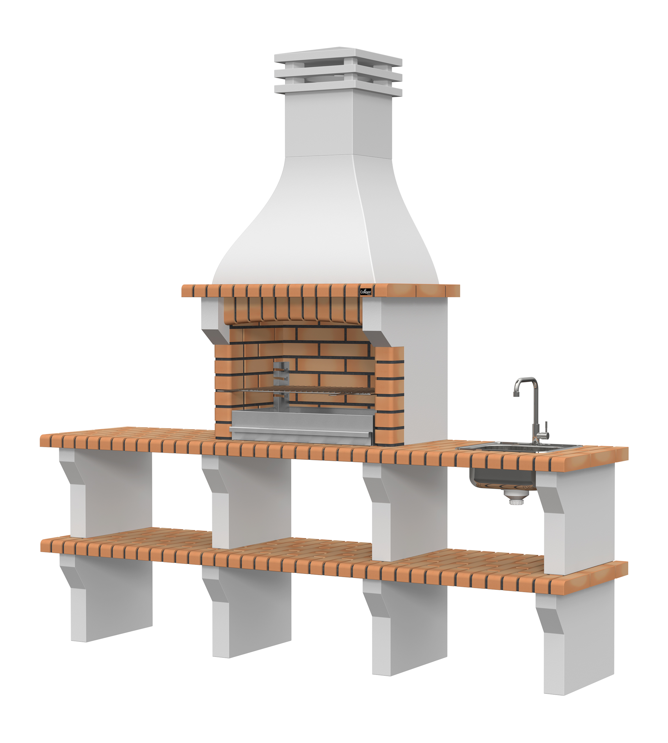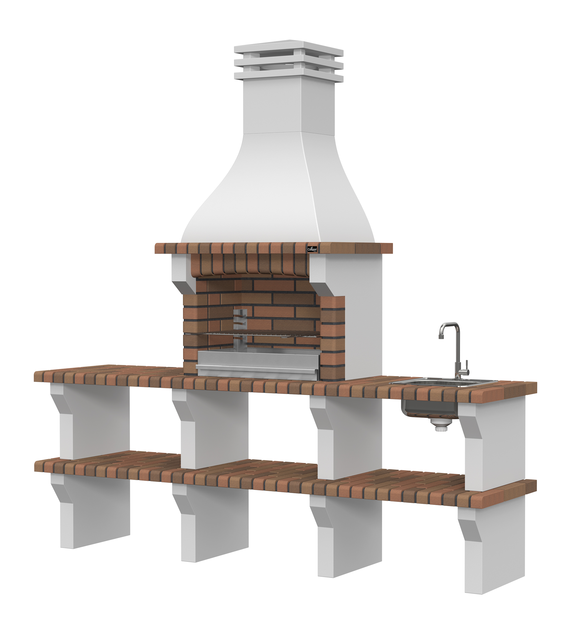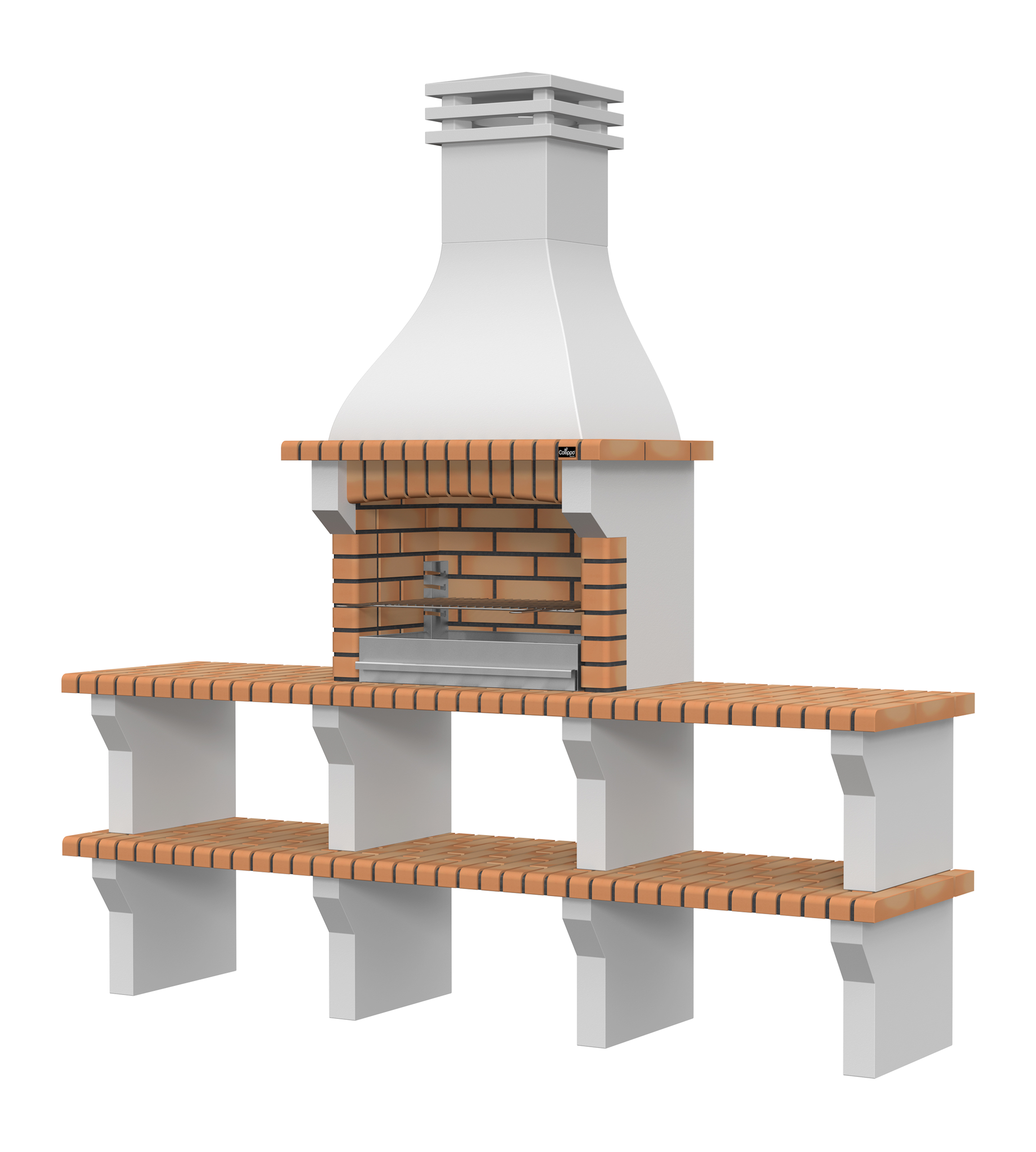 Peças em micro betão cinzento liso e micro betão cinzento texturado; zona de fogo em tijolo e cimento refractário