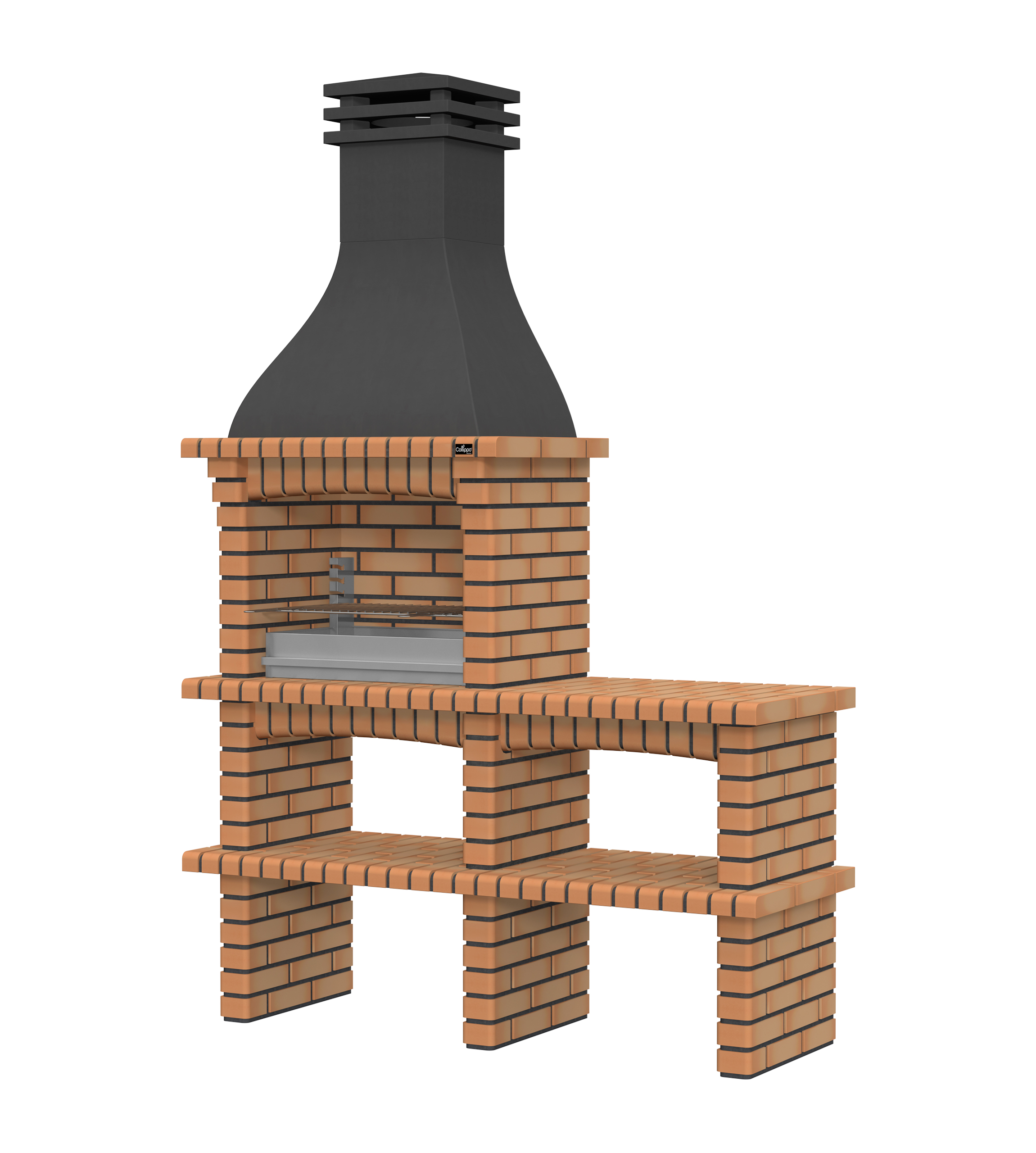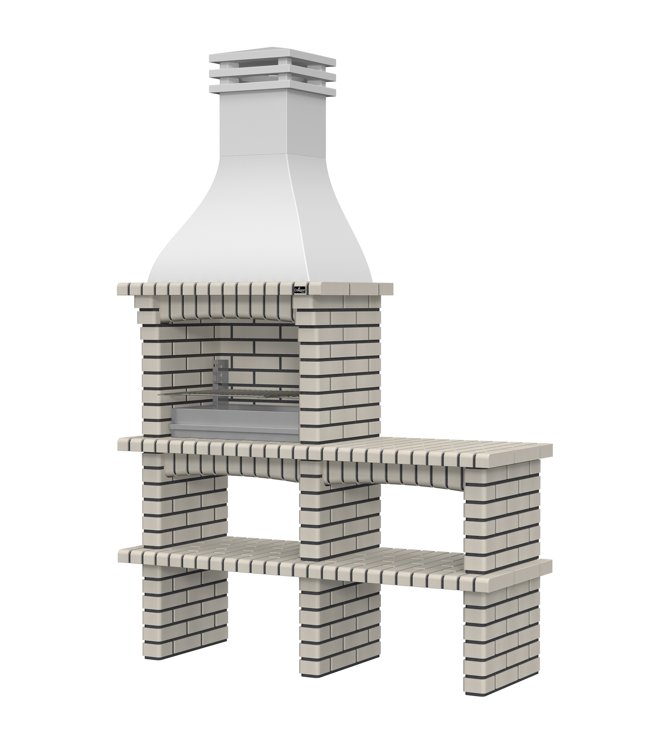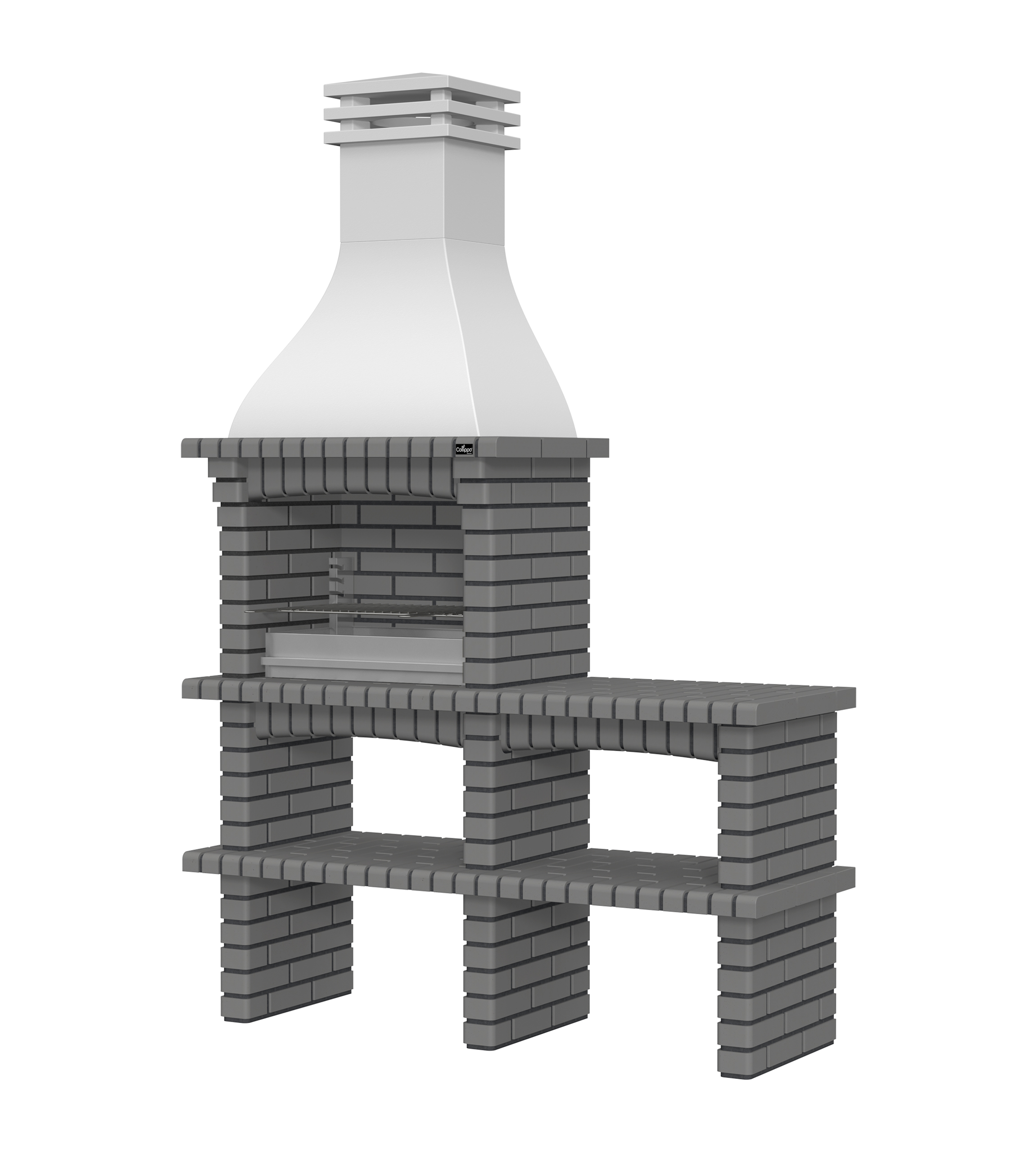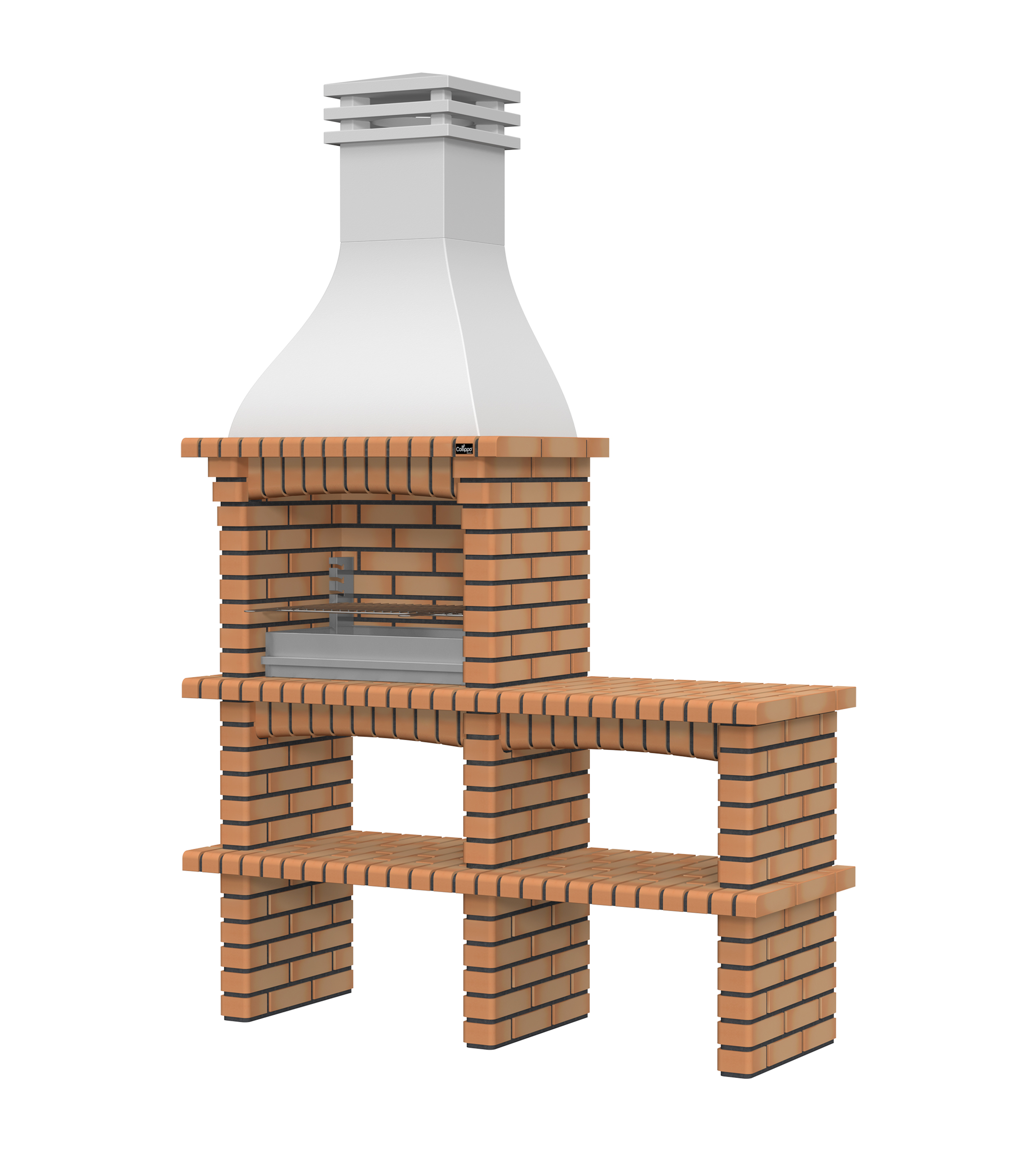 Chaminé em branco liso ou com pintura preta; zona de fogo em tijolo e cimento refractário.