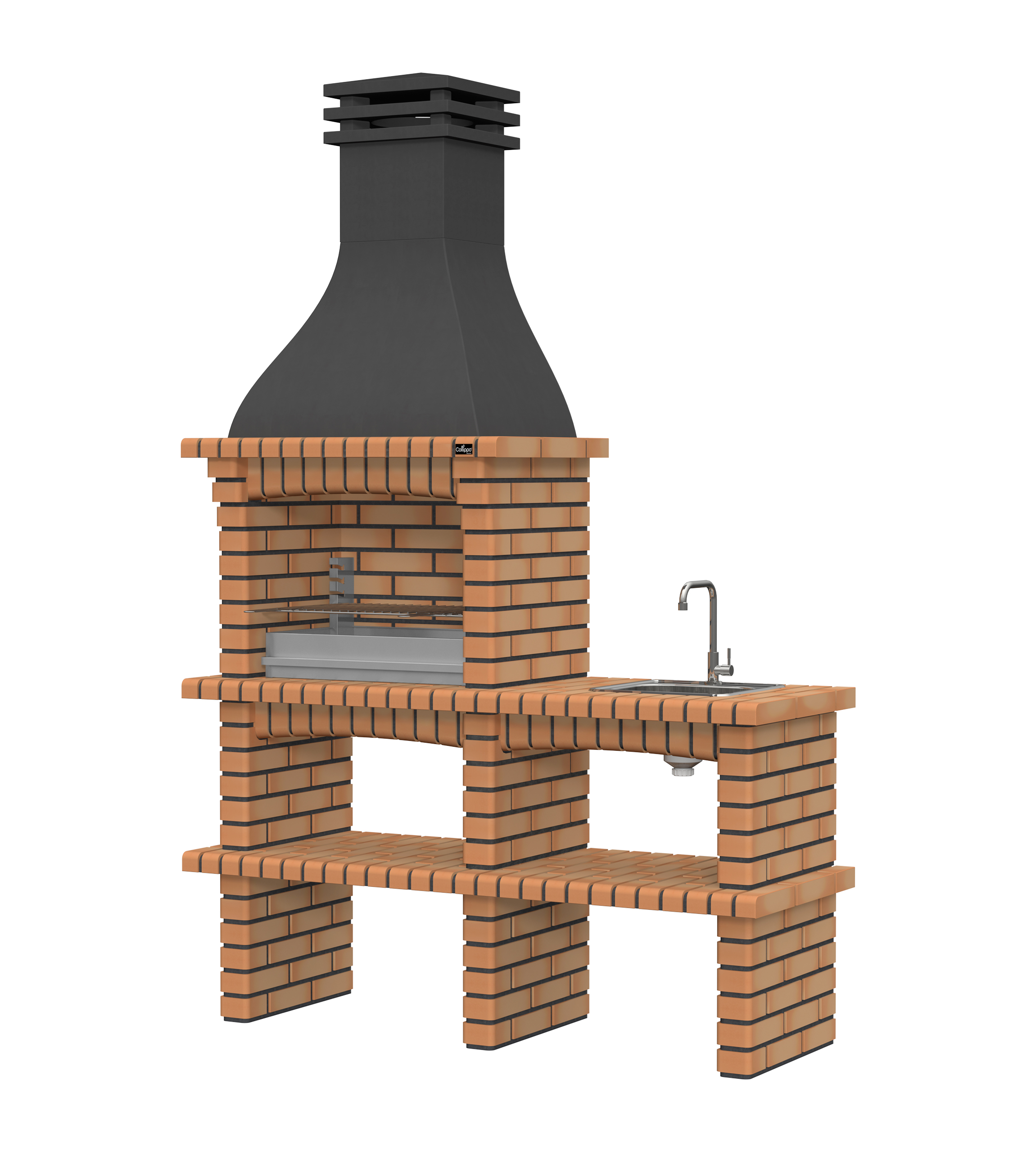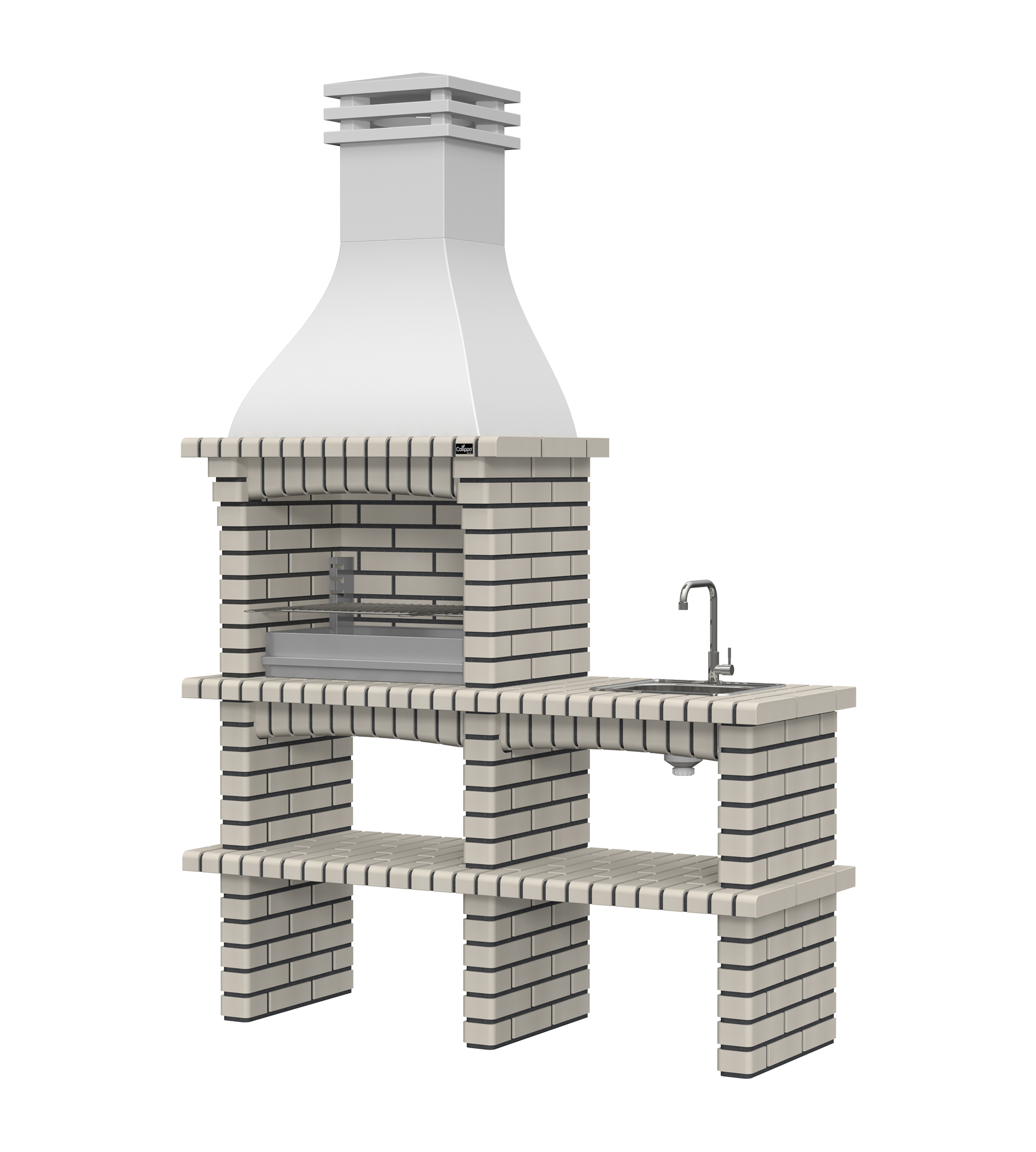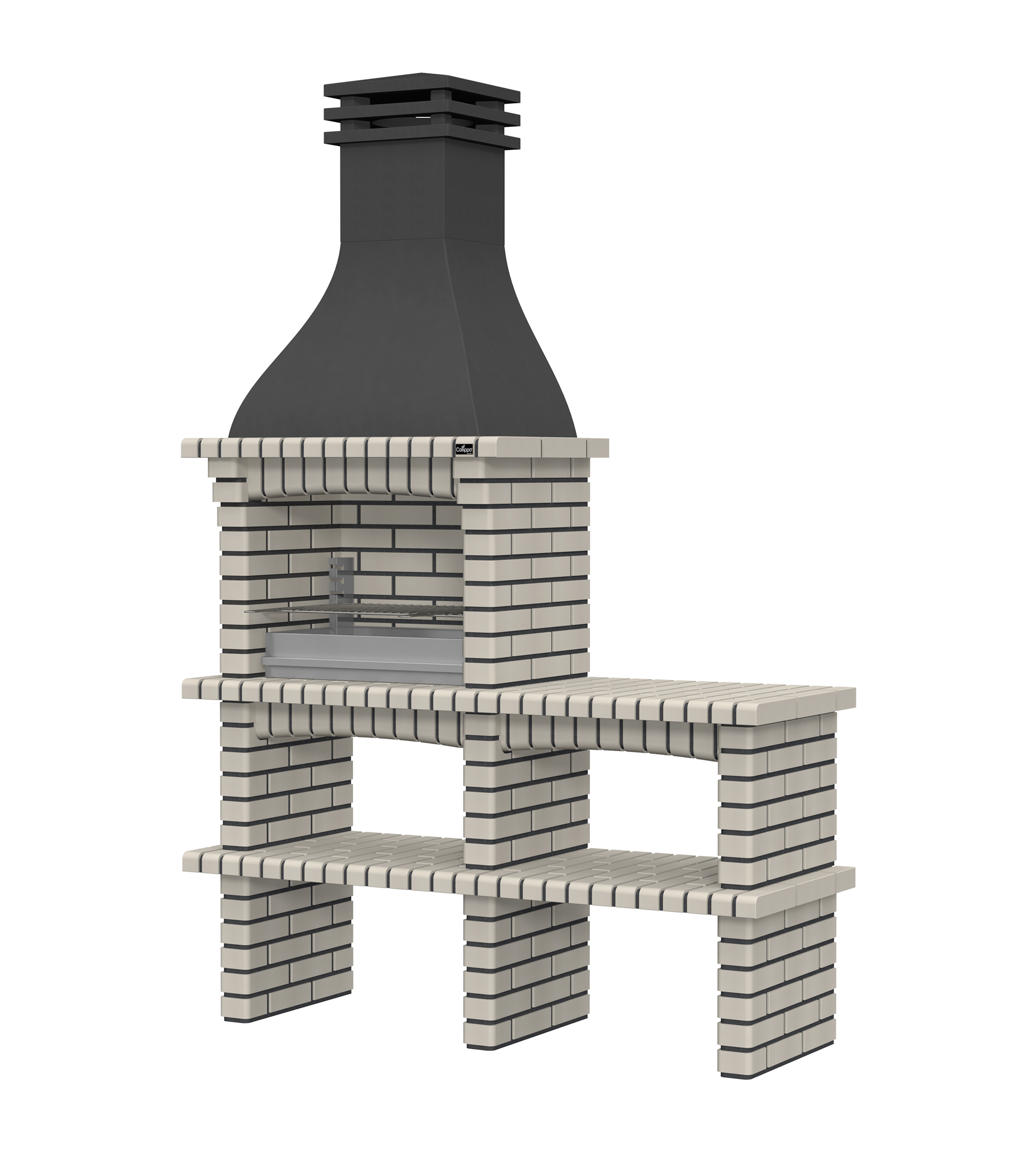 Chaminé em branco liso ou com pintura preta; zona de fogo em tijolo e cimento refractário.