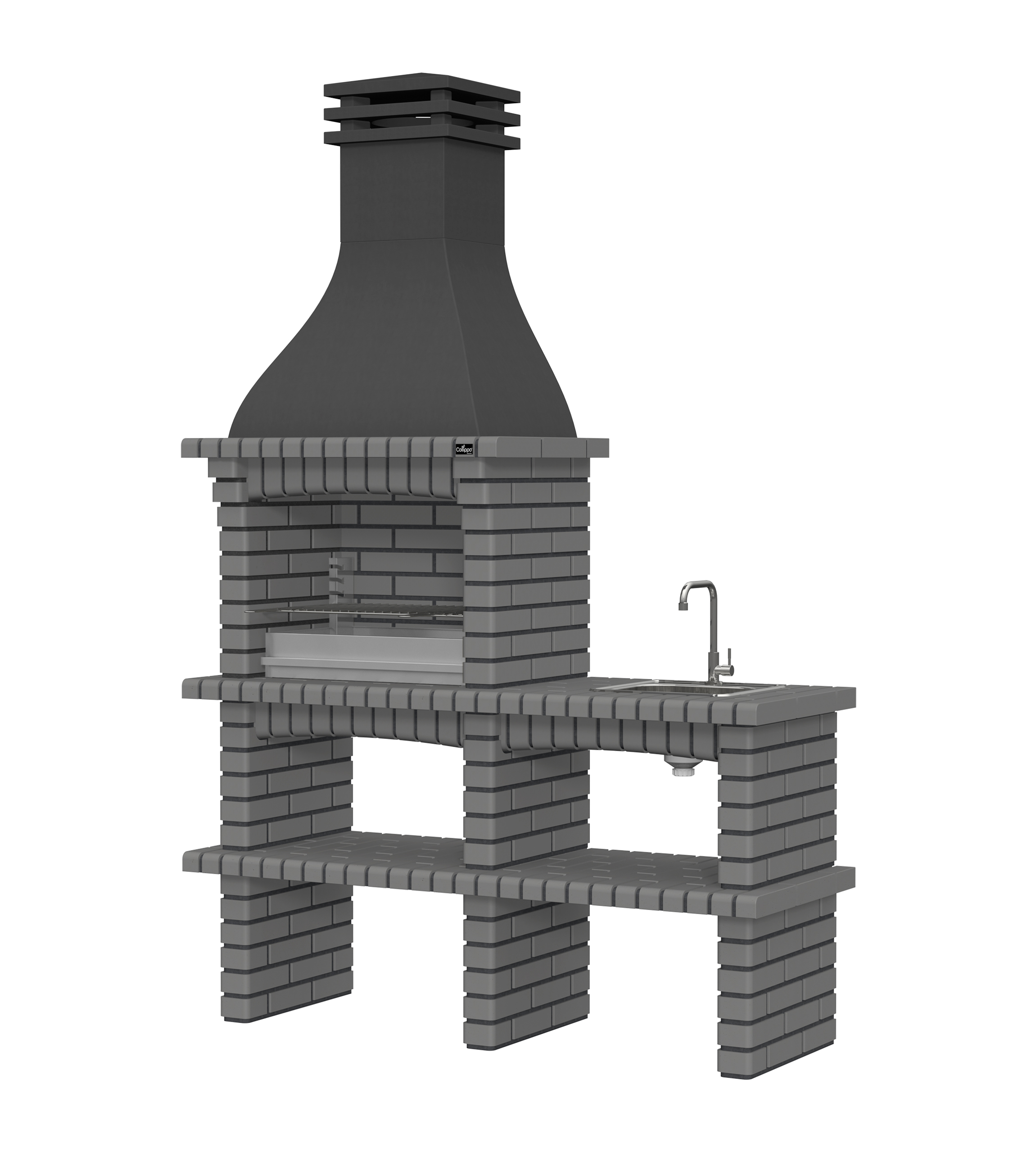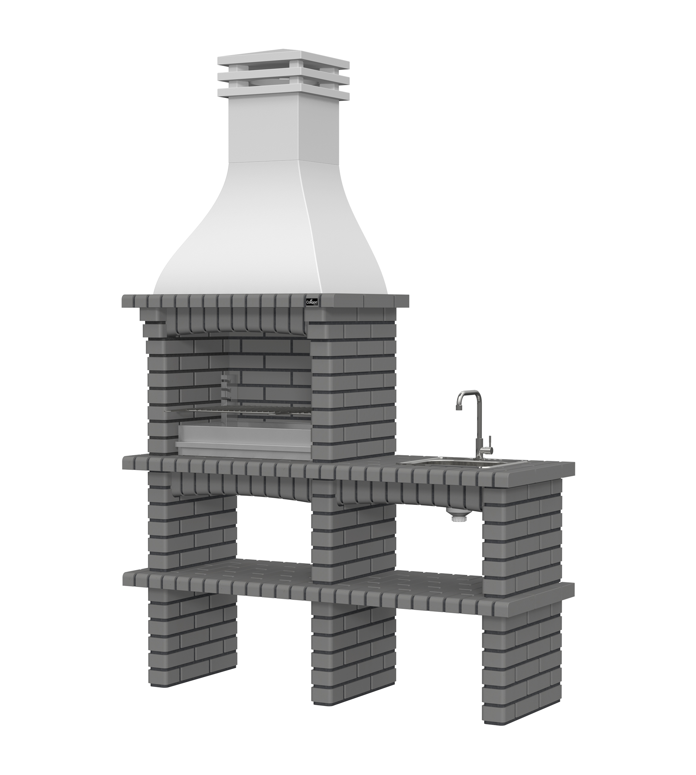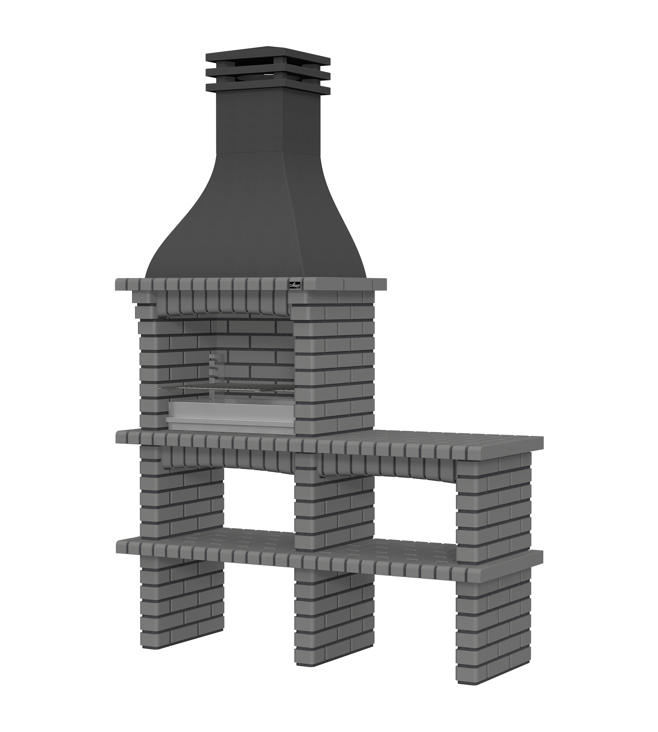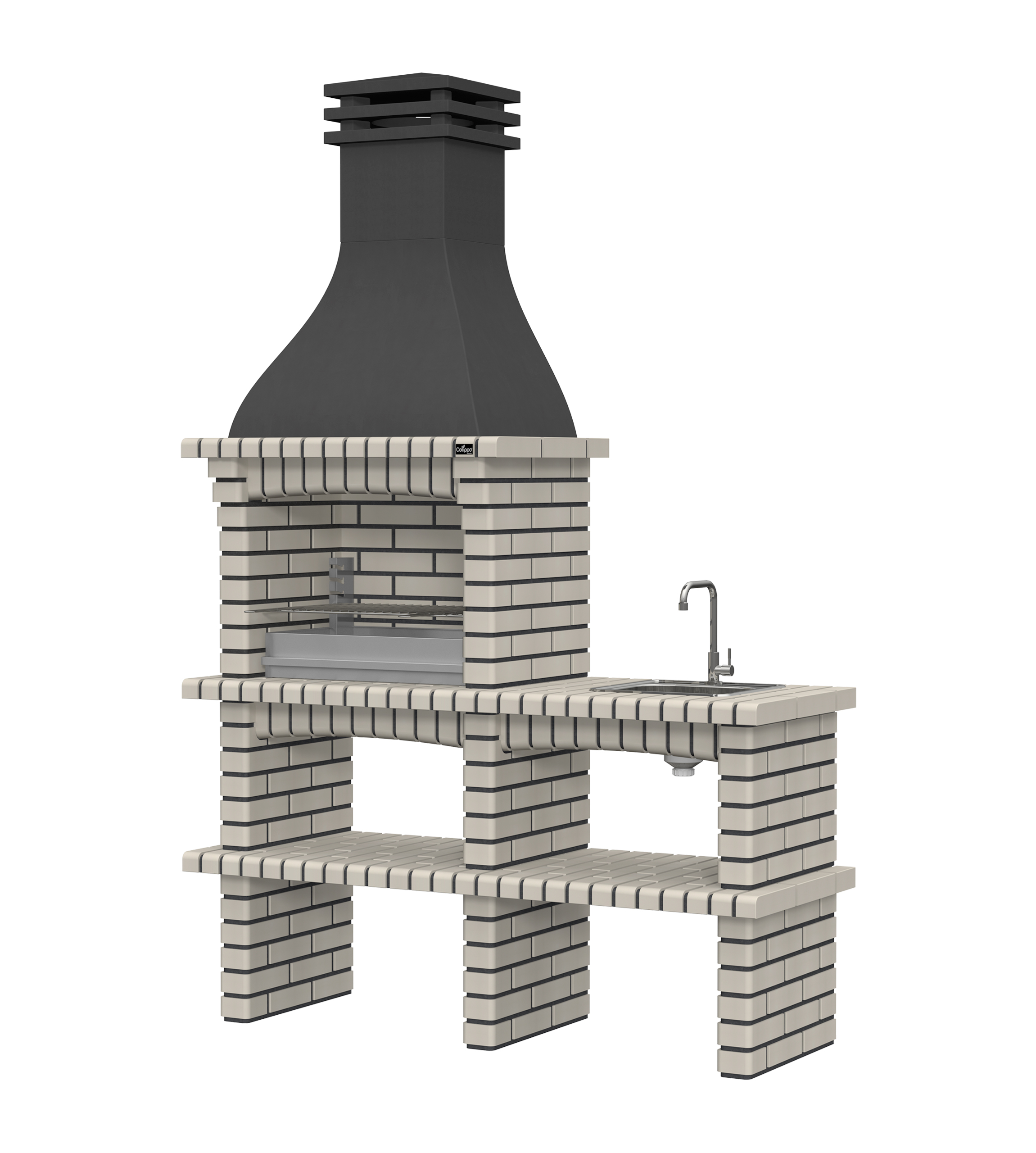 Chaminé em branco liso ou com pintura preta; zona de fogo em tijolo e cimento refractário.