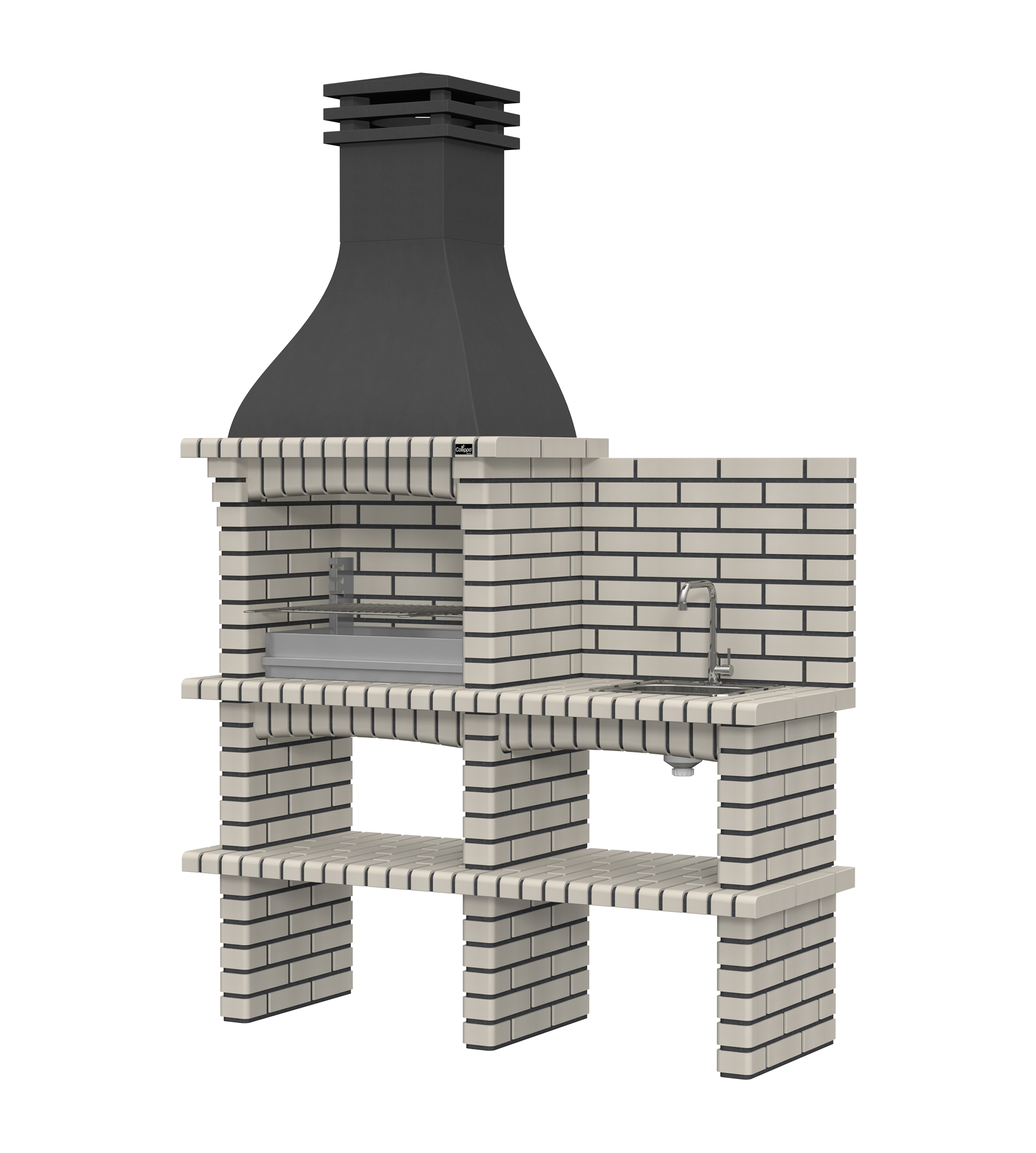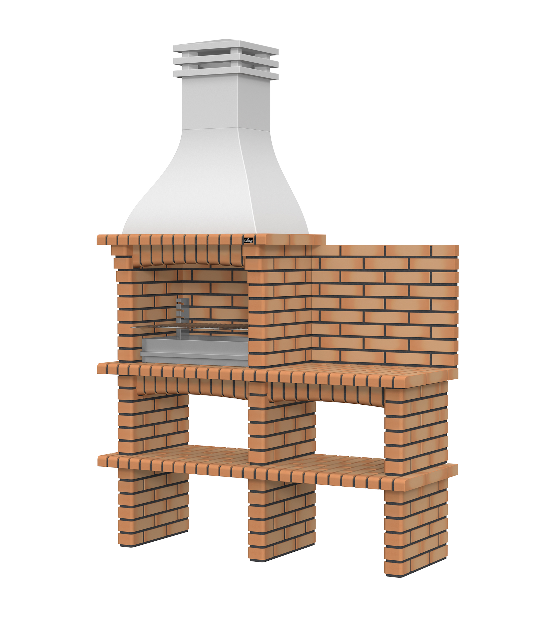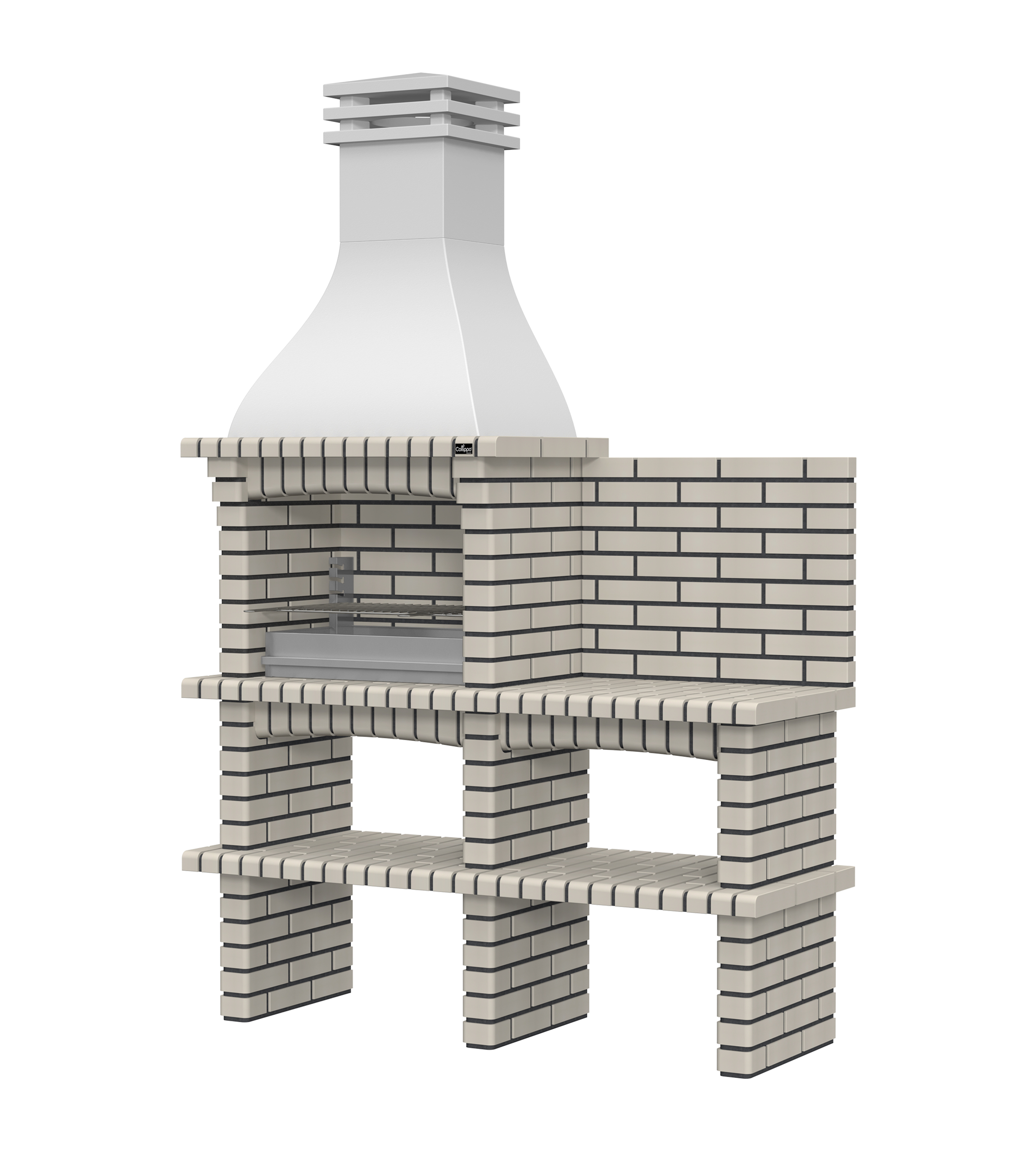 Chaminé em branco liso ou com pintura preta; zona de fogo em tijolo e cimento refractário.