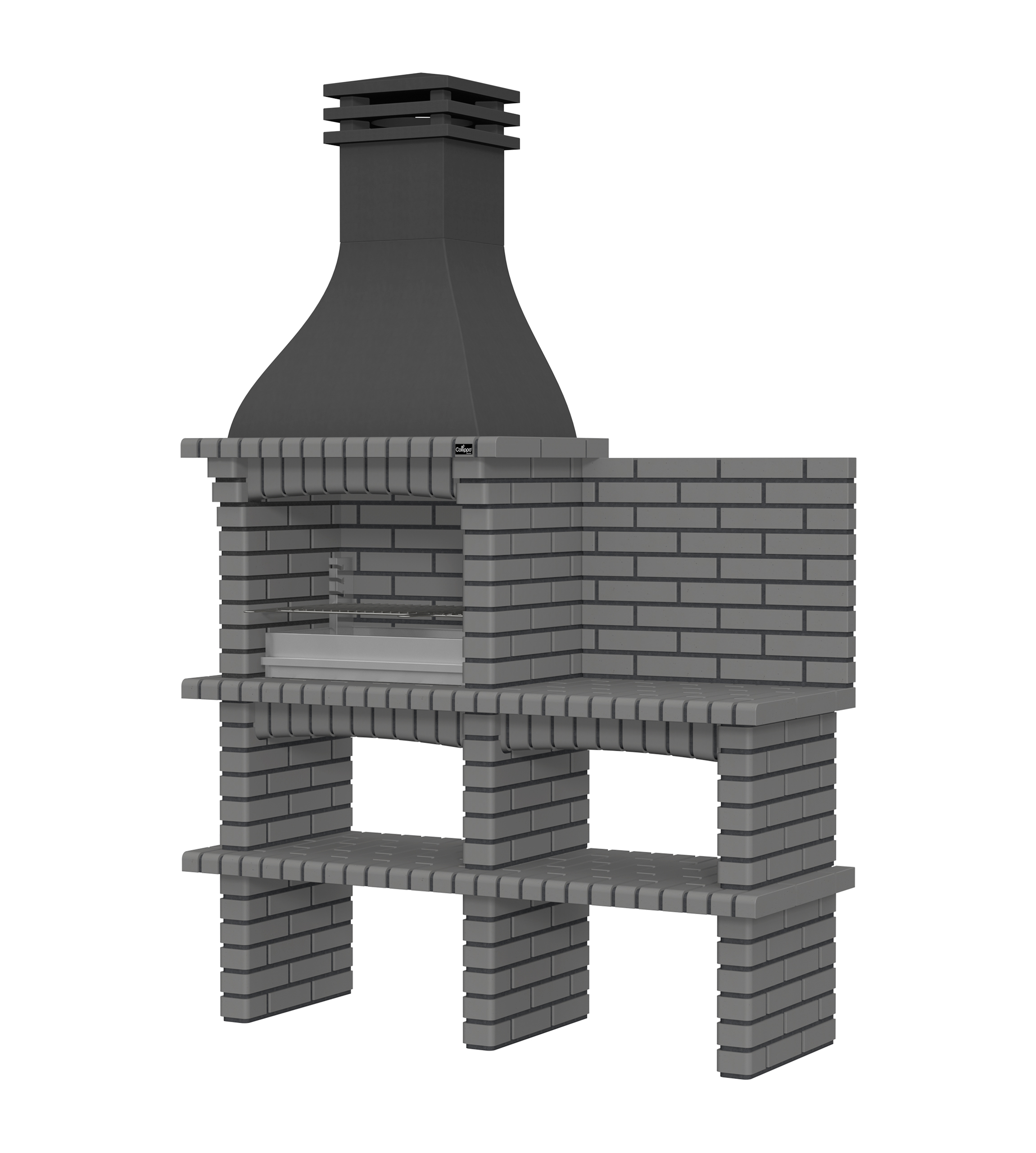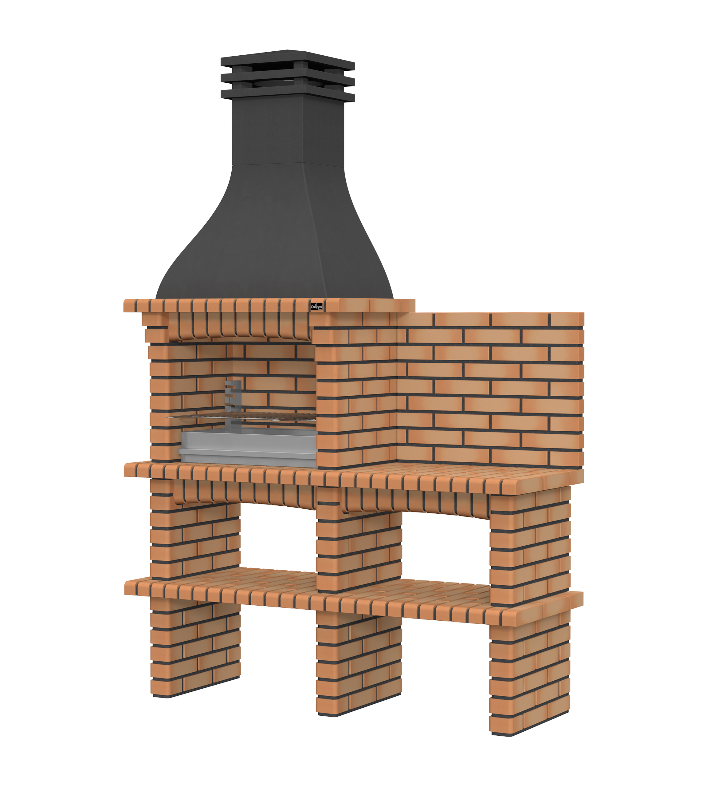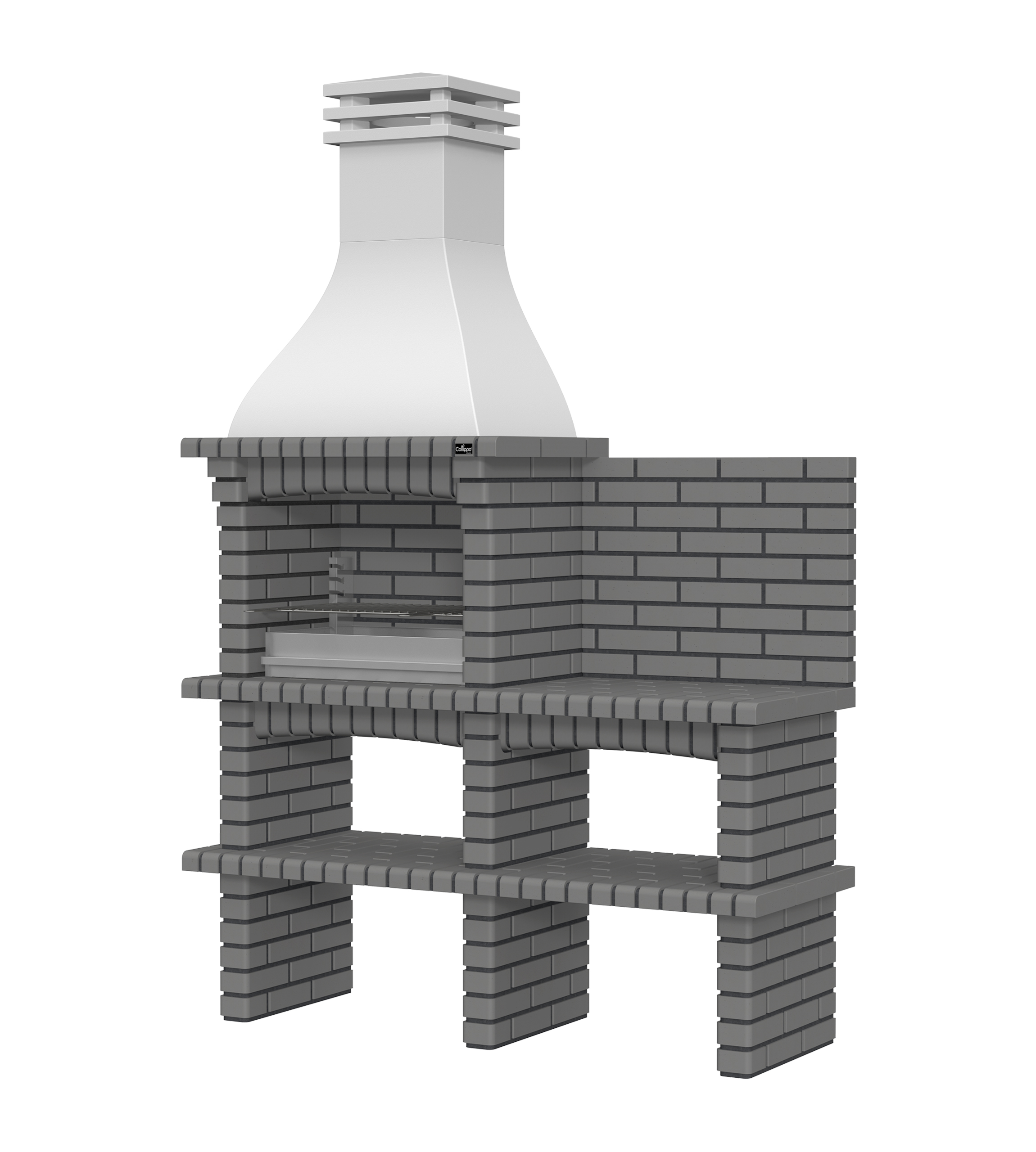 Chaminé em branco liso ou com pintura preta; zona de fogo em tijolo e cimento refractário.