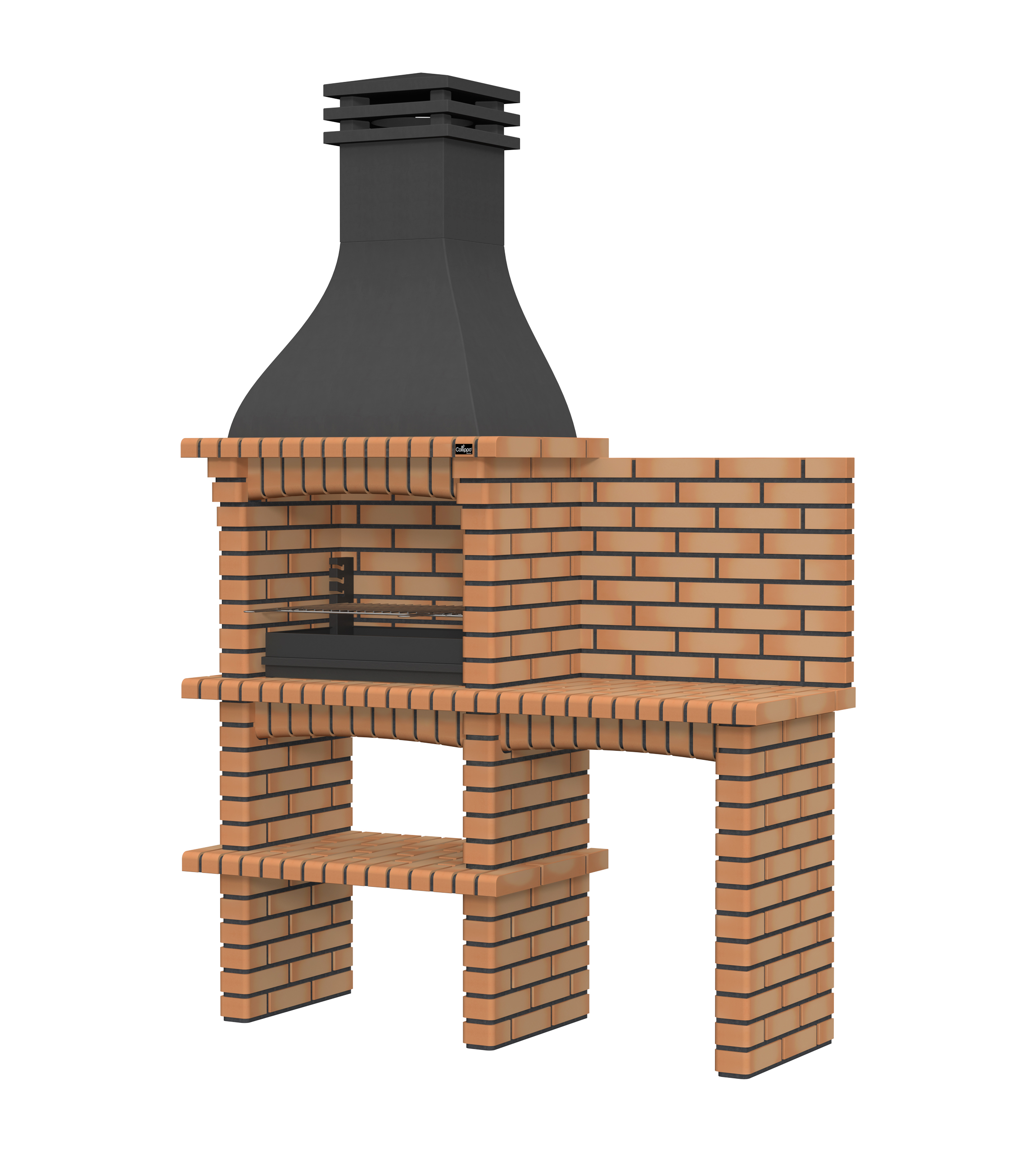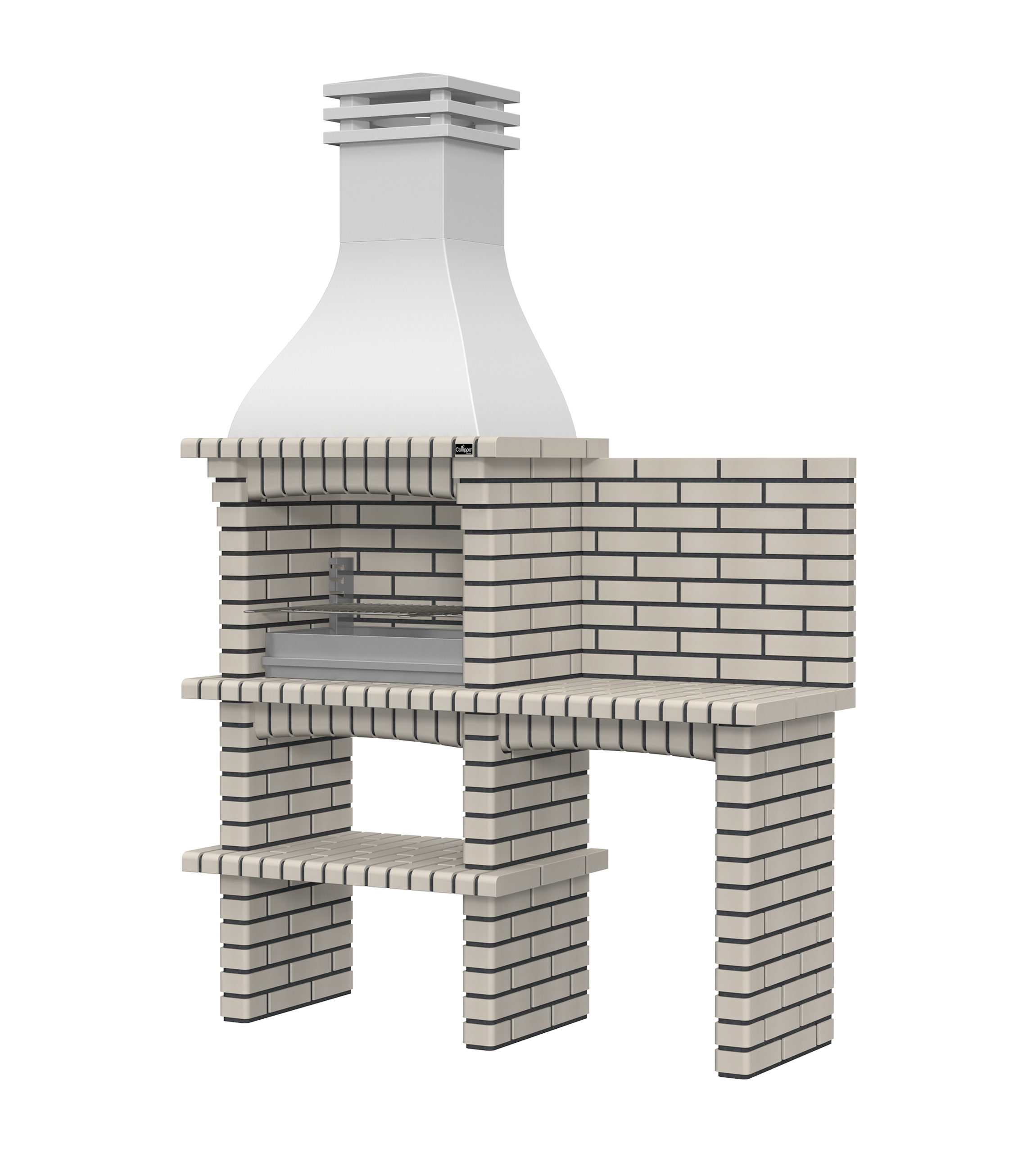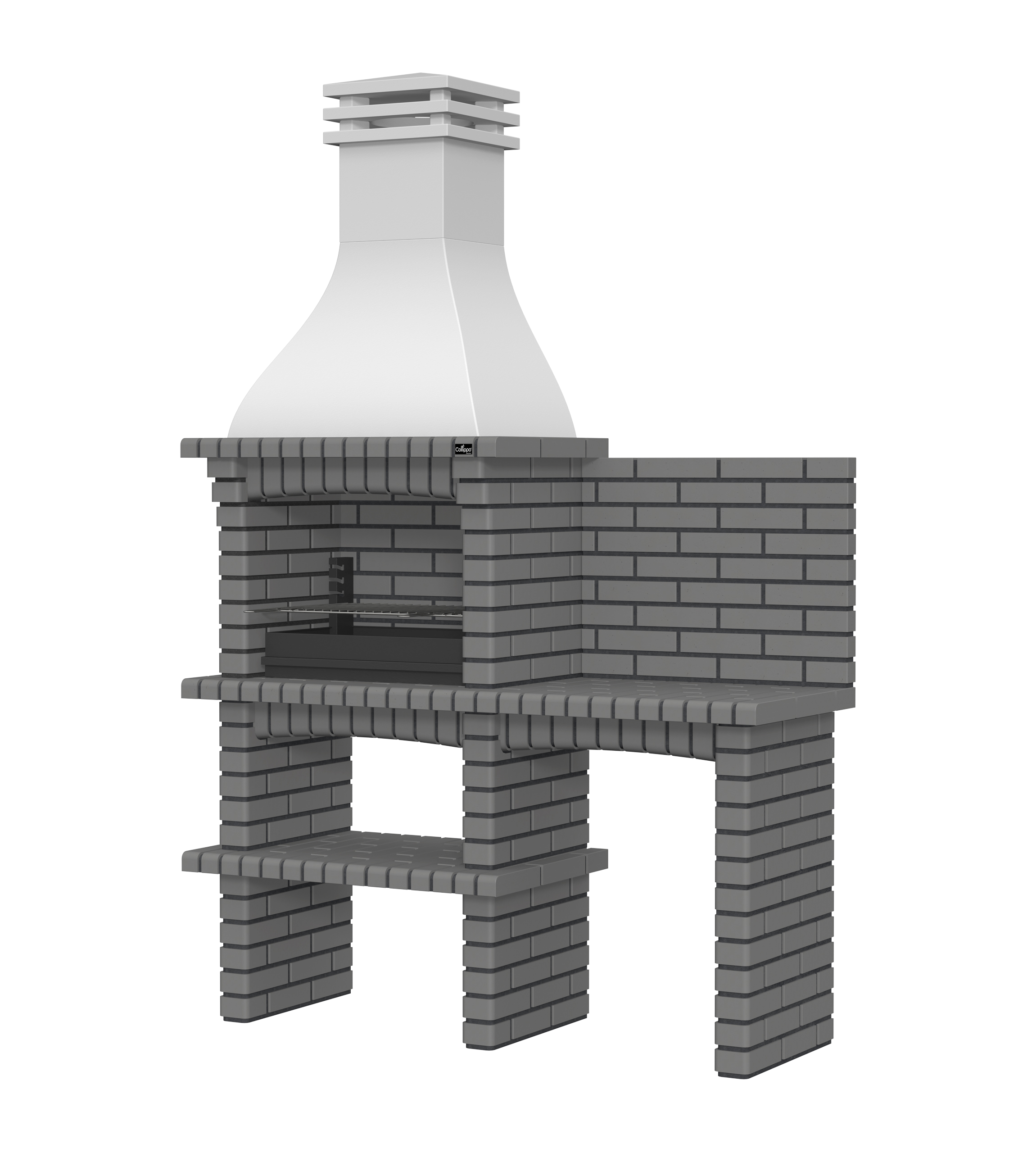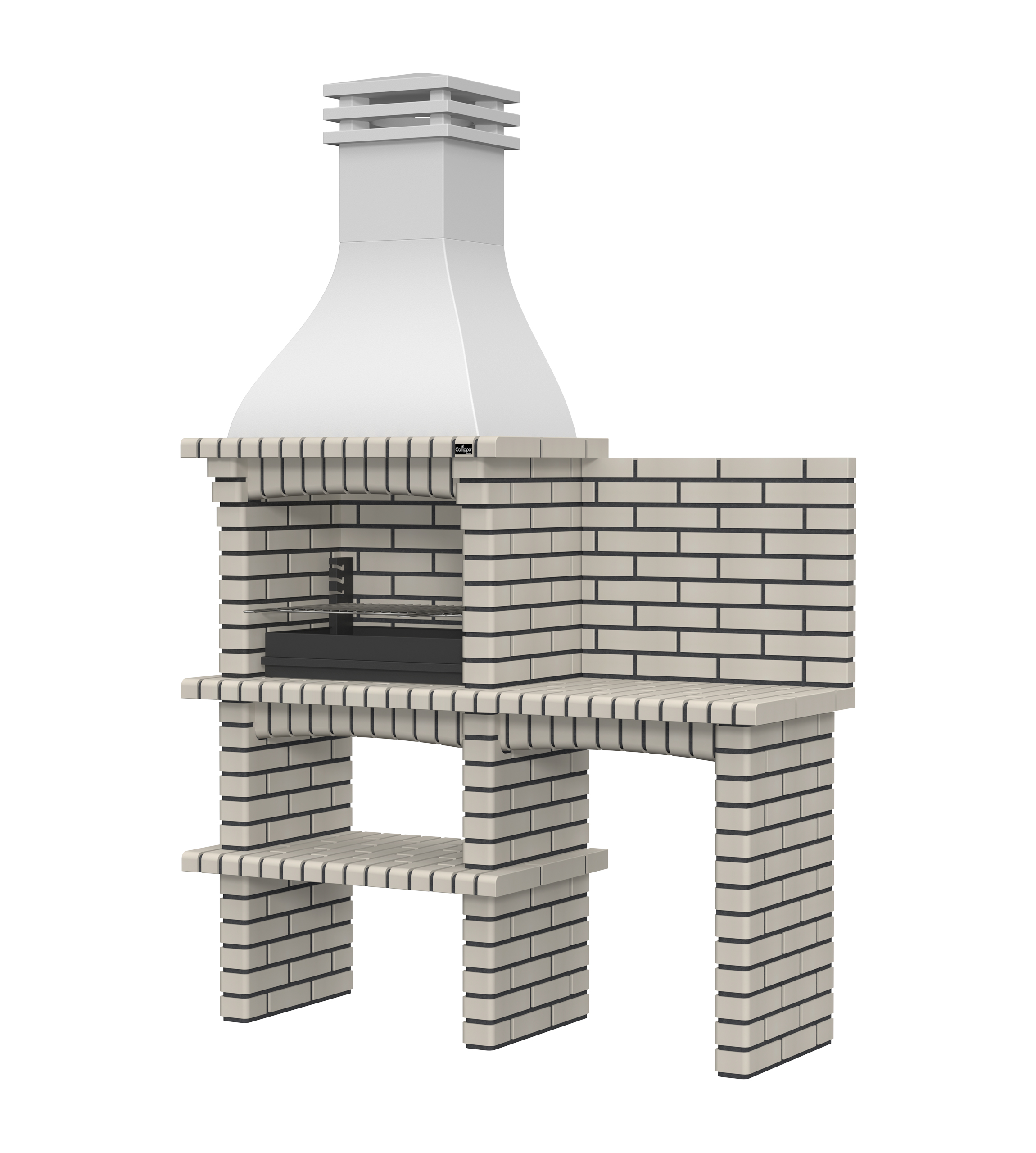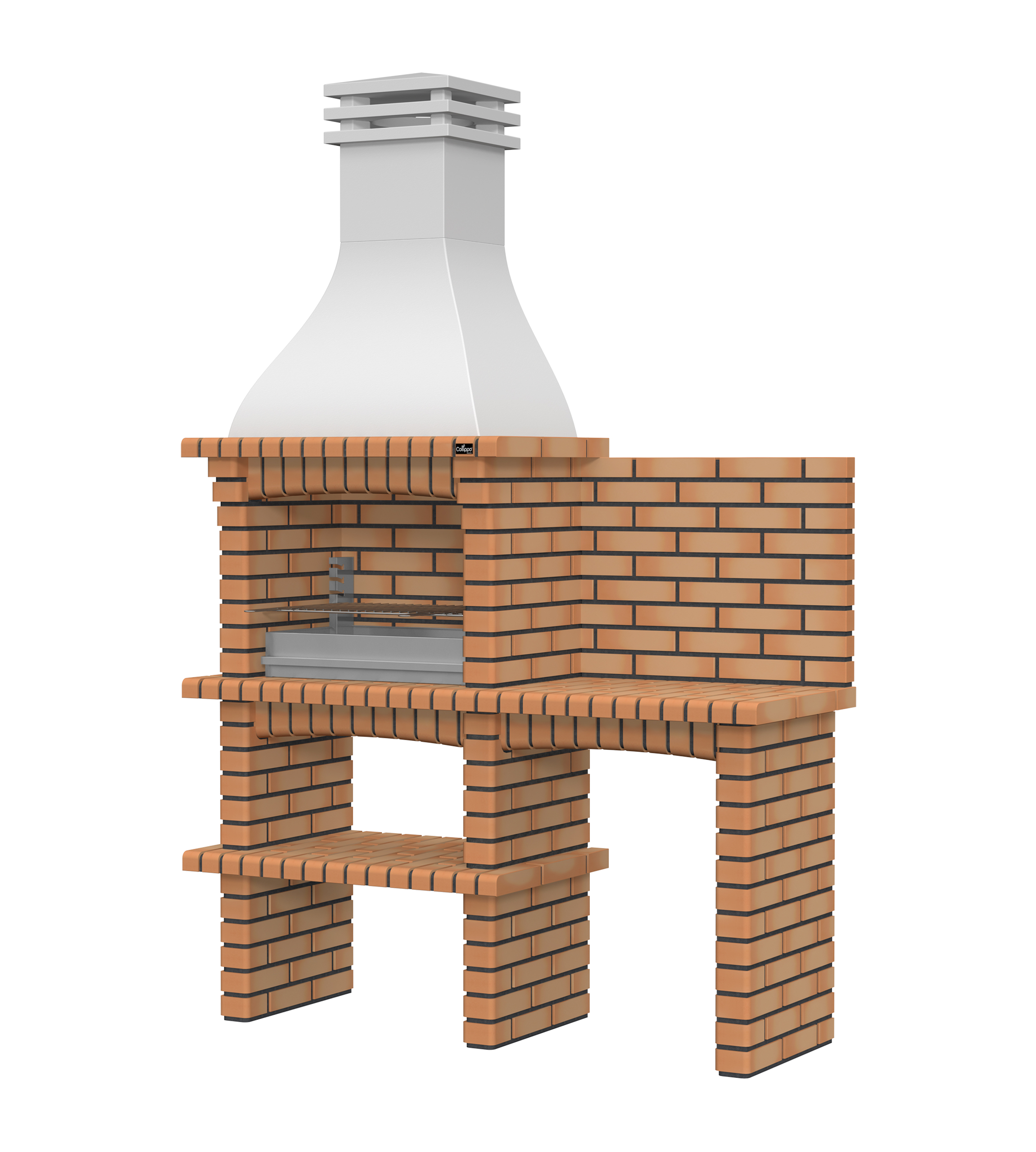 Chaminé em branco liso ou com pintura preta; zona de fogo em tijolo e cimento refractário.