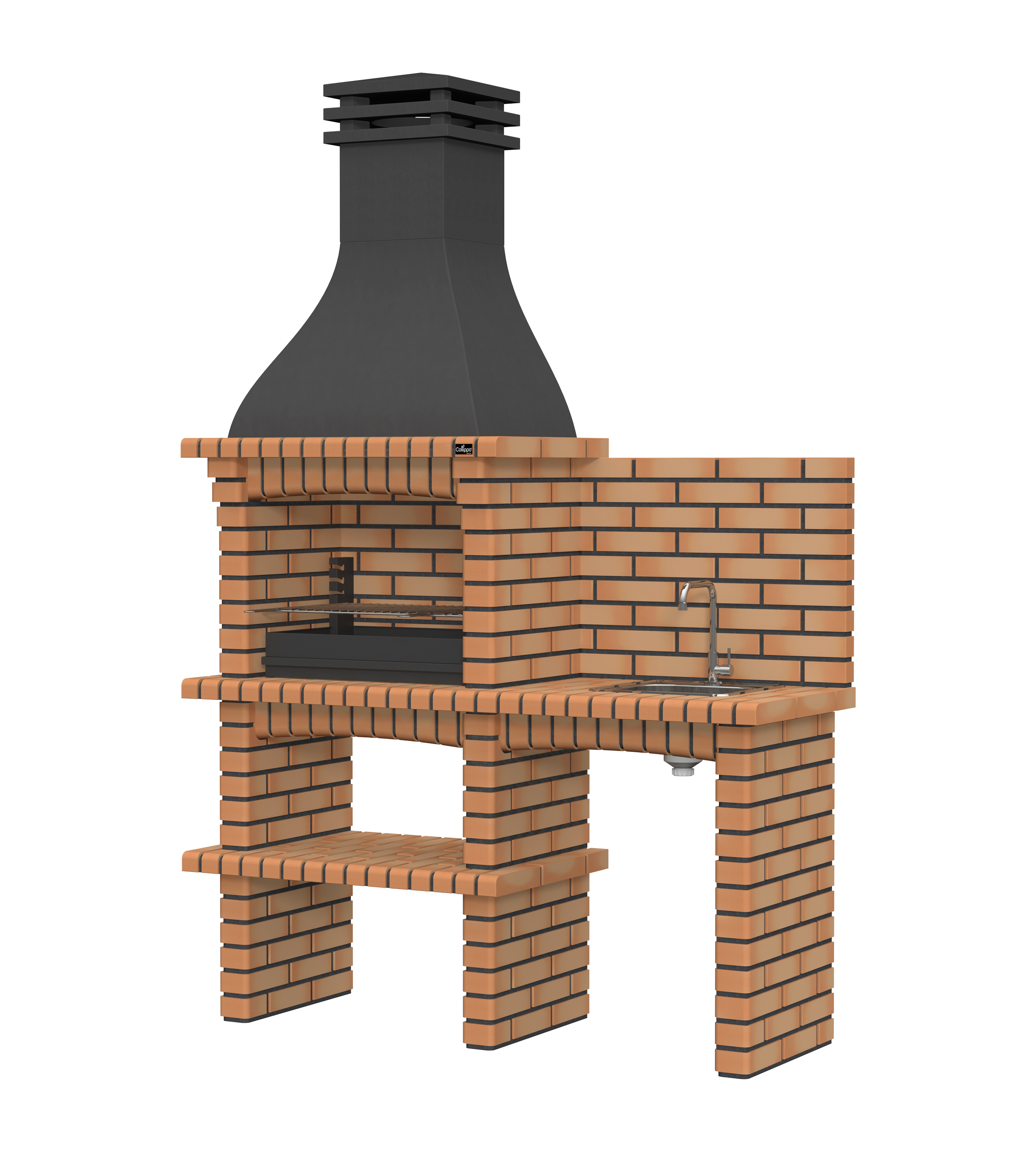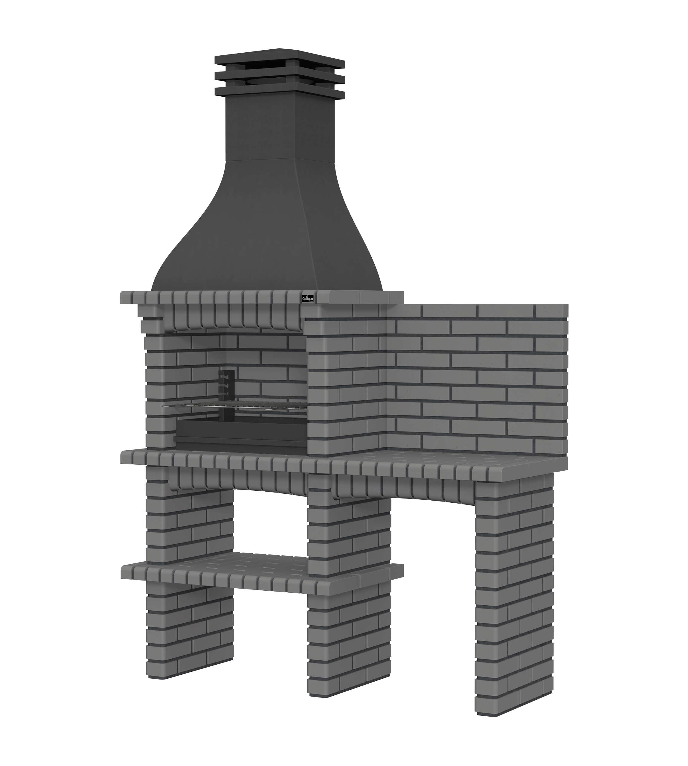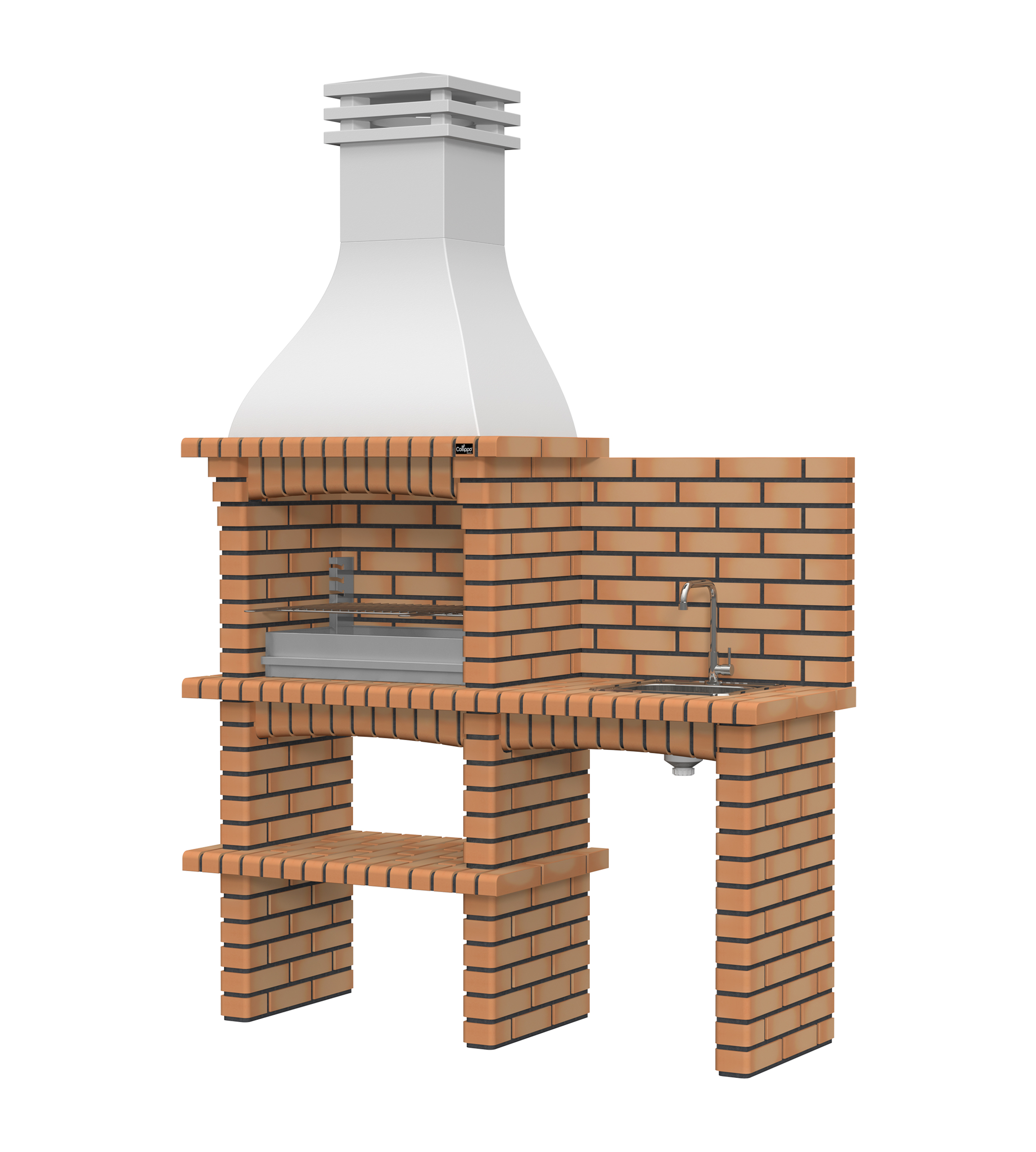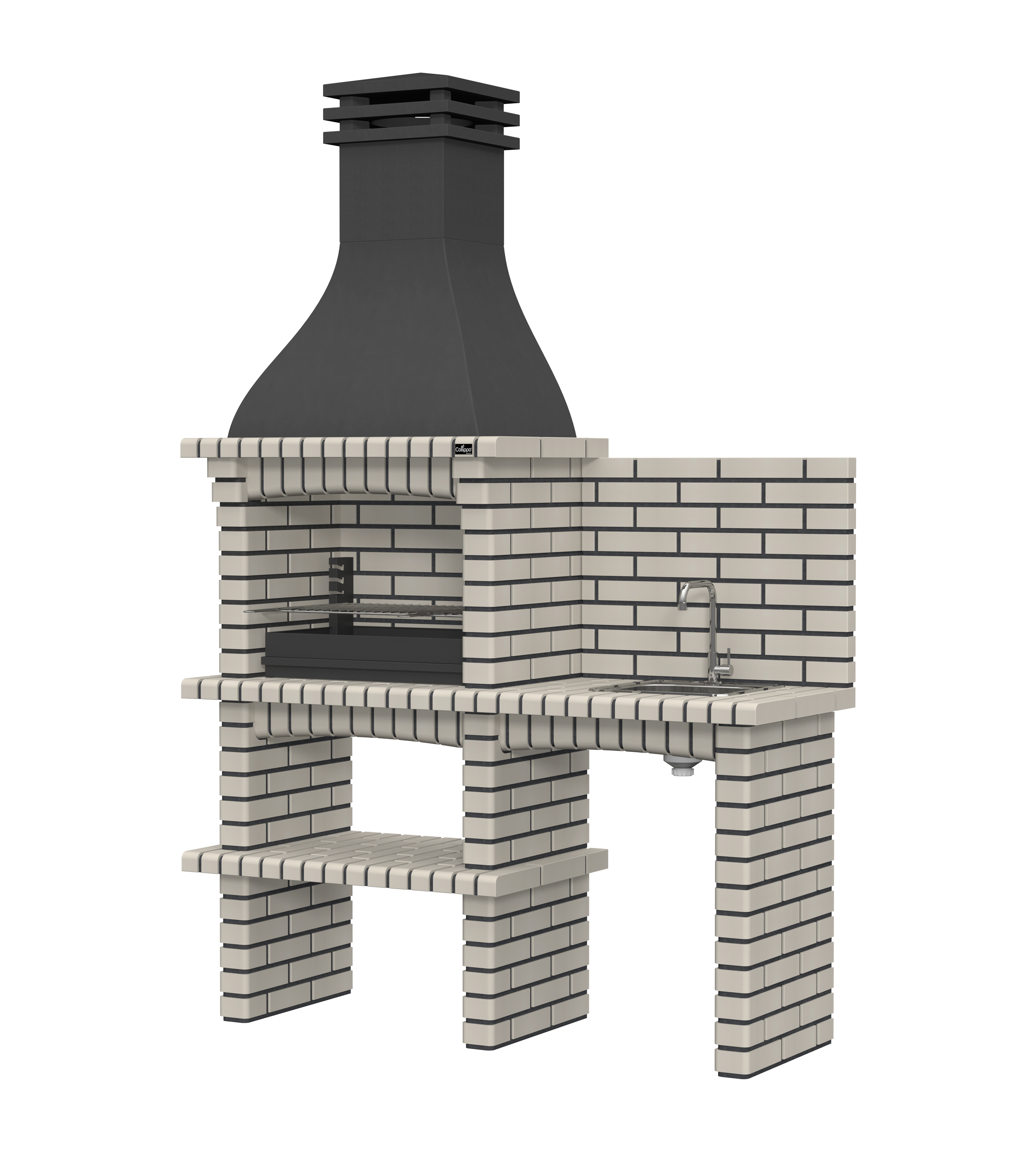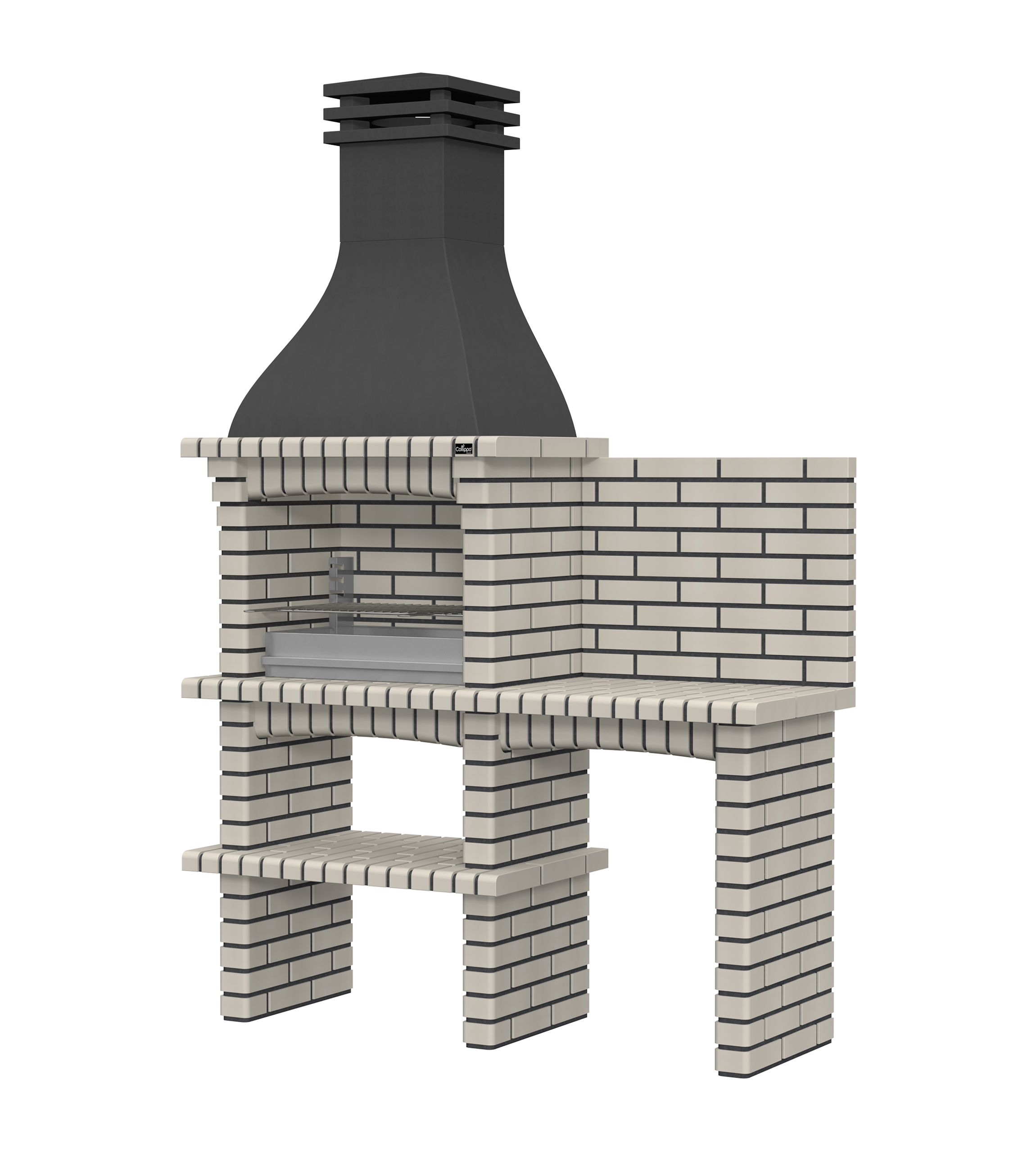 Chaminé em branco liso ou com pintura preta; zona de fogo em tijolo e cimento refractário.
