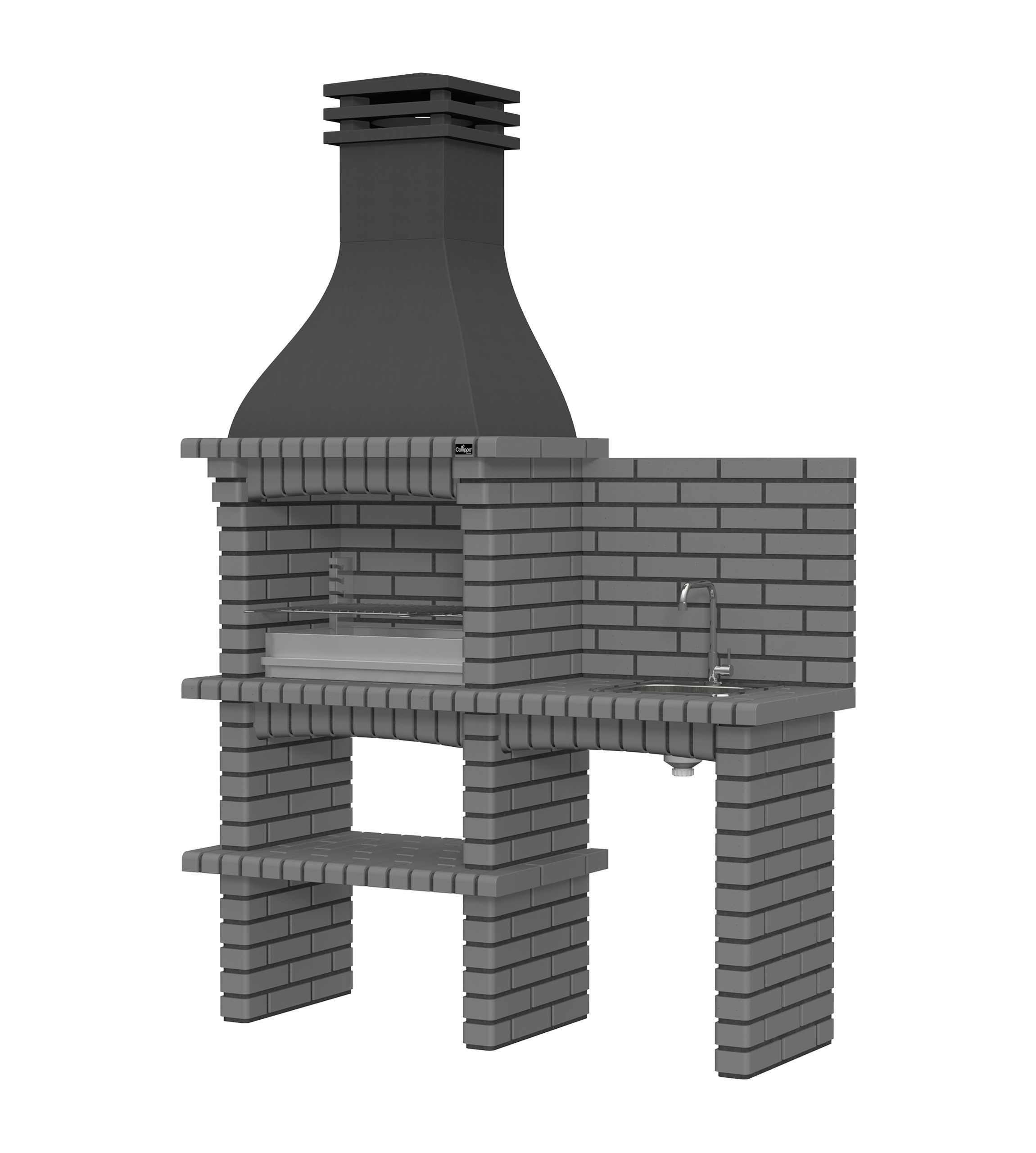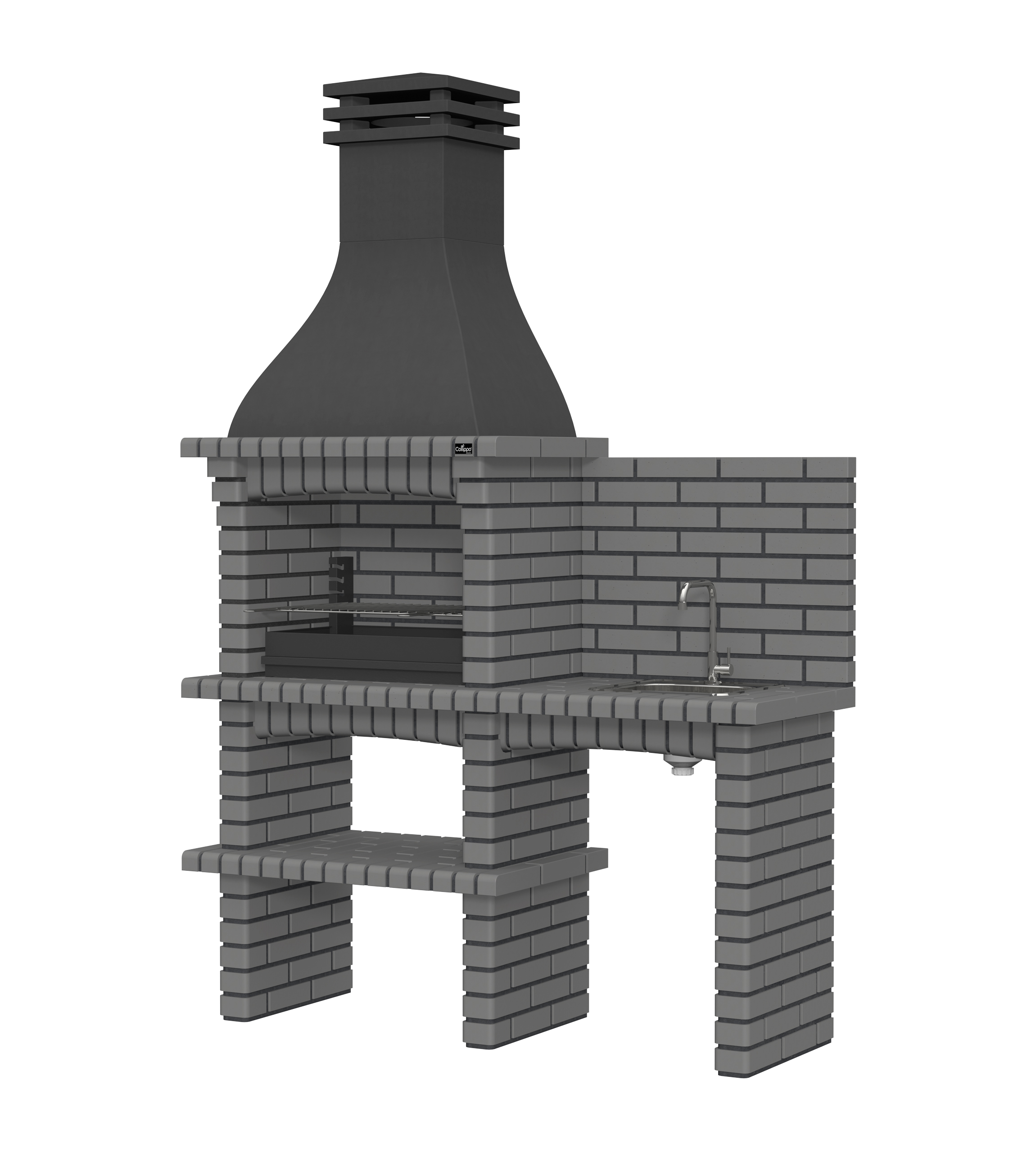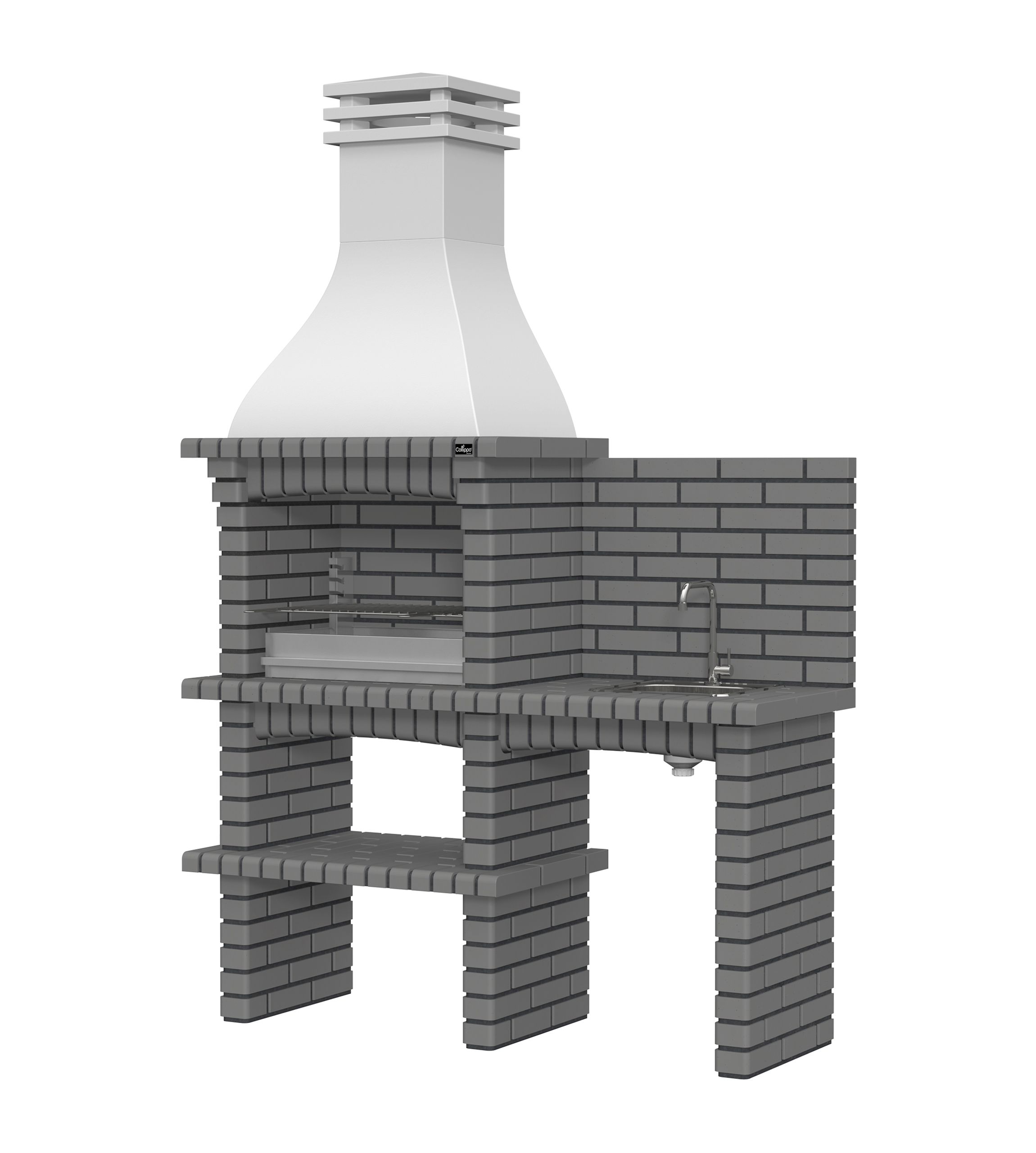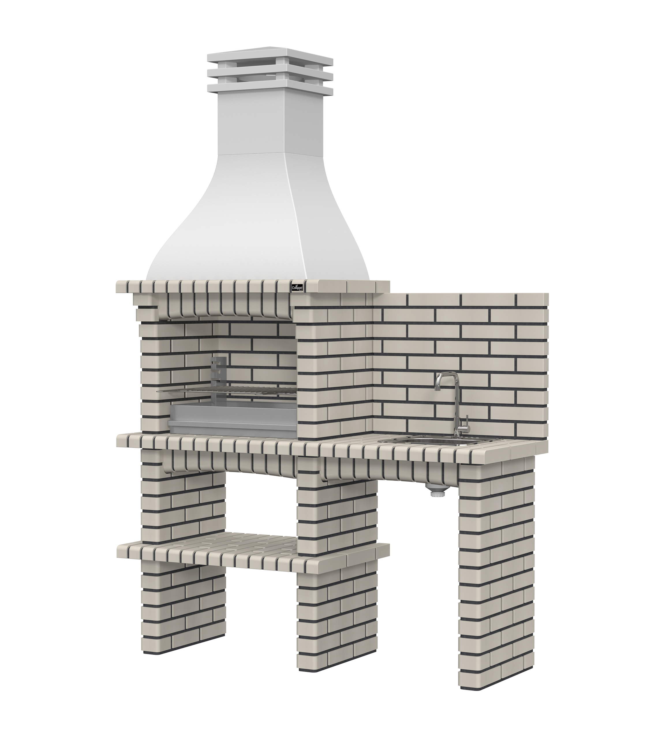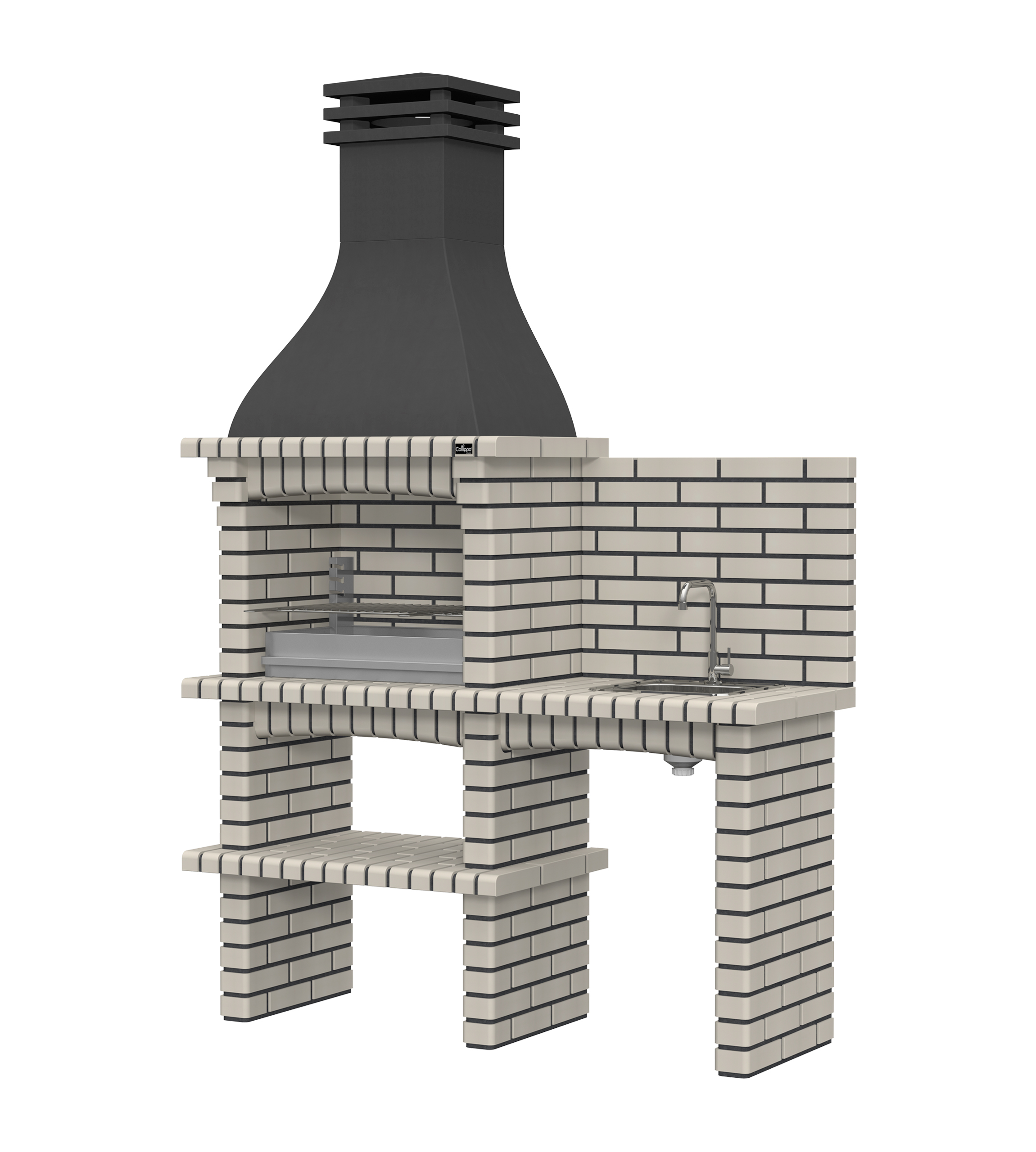 Chaminé em branco liso ou com pintura preta; zona de fogo em tijolo e cimento refractário.