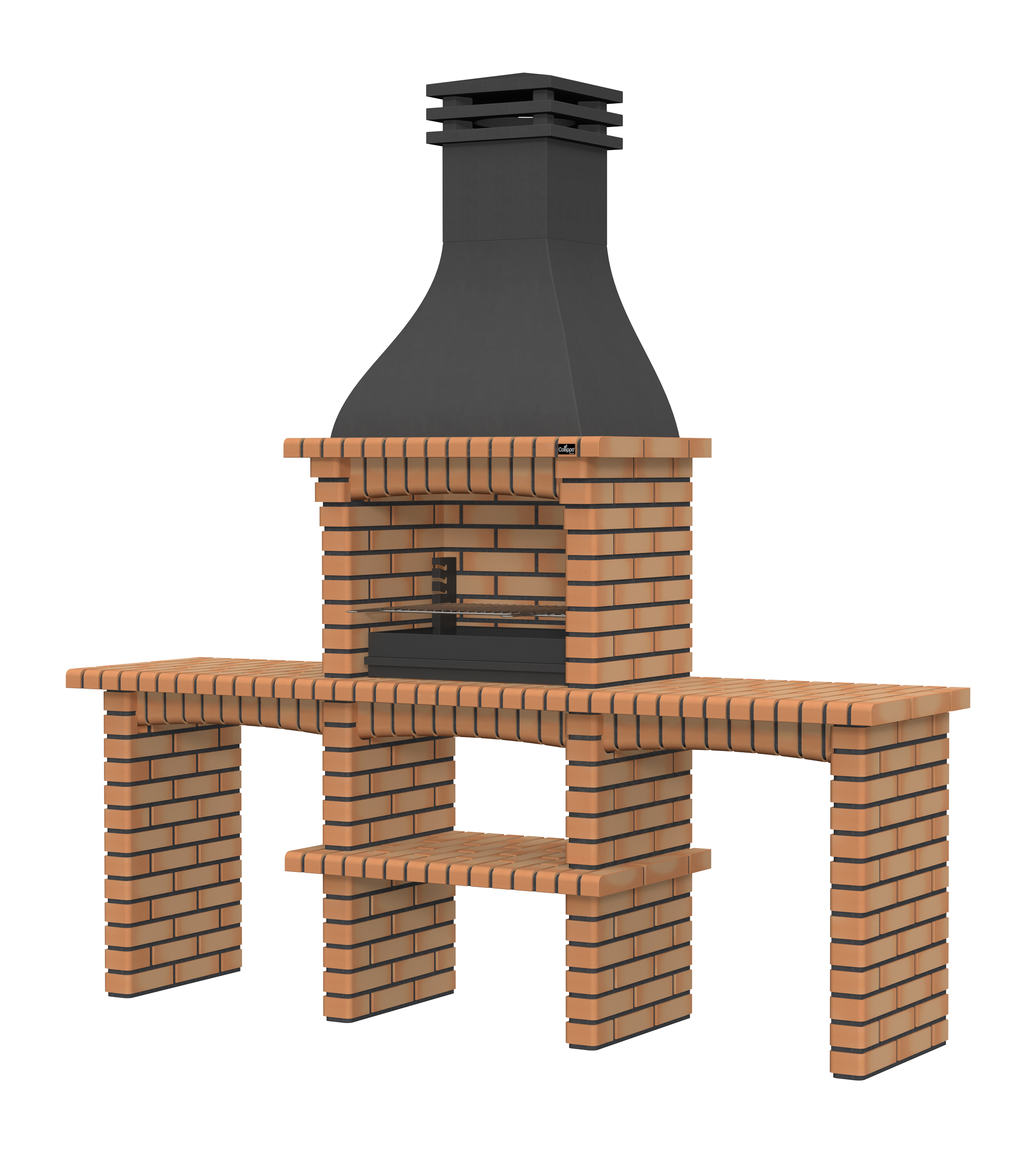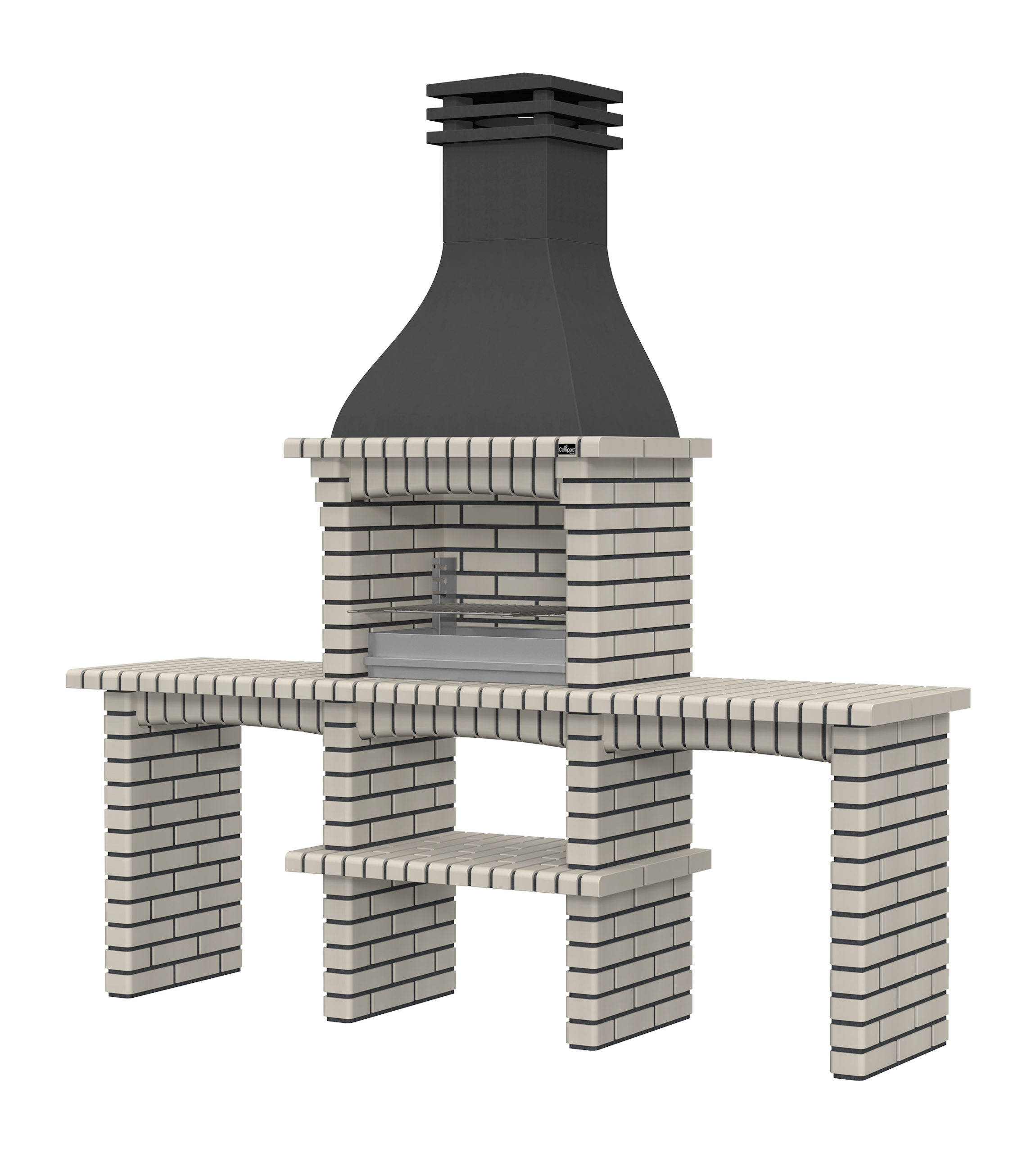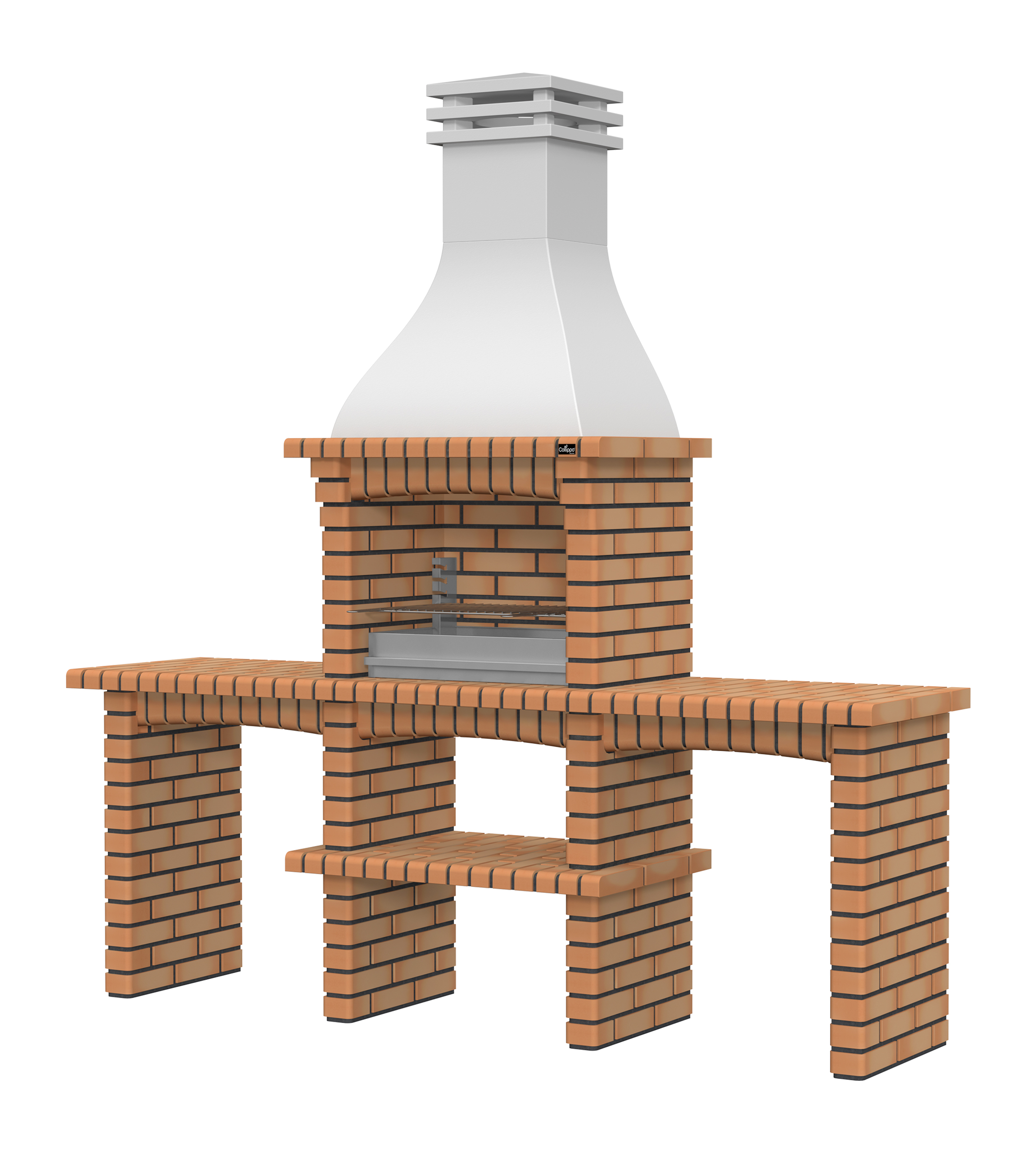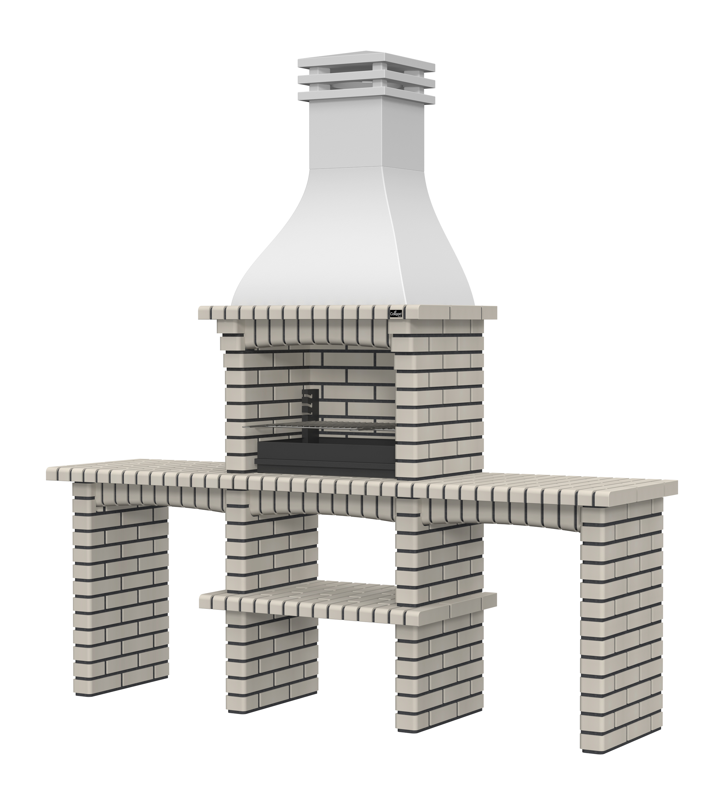 Chaminé em branco liso ou com pintura preta; zona de fogo em tijolo e cimento refractário