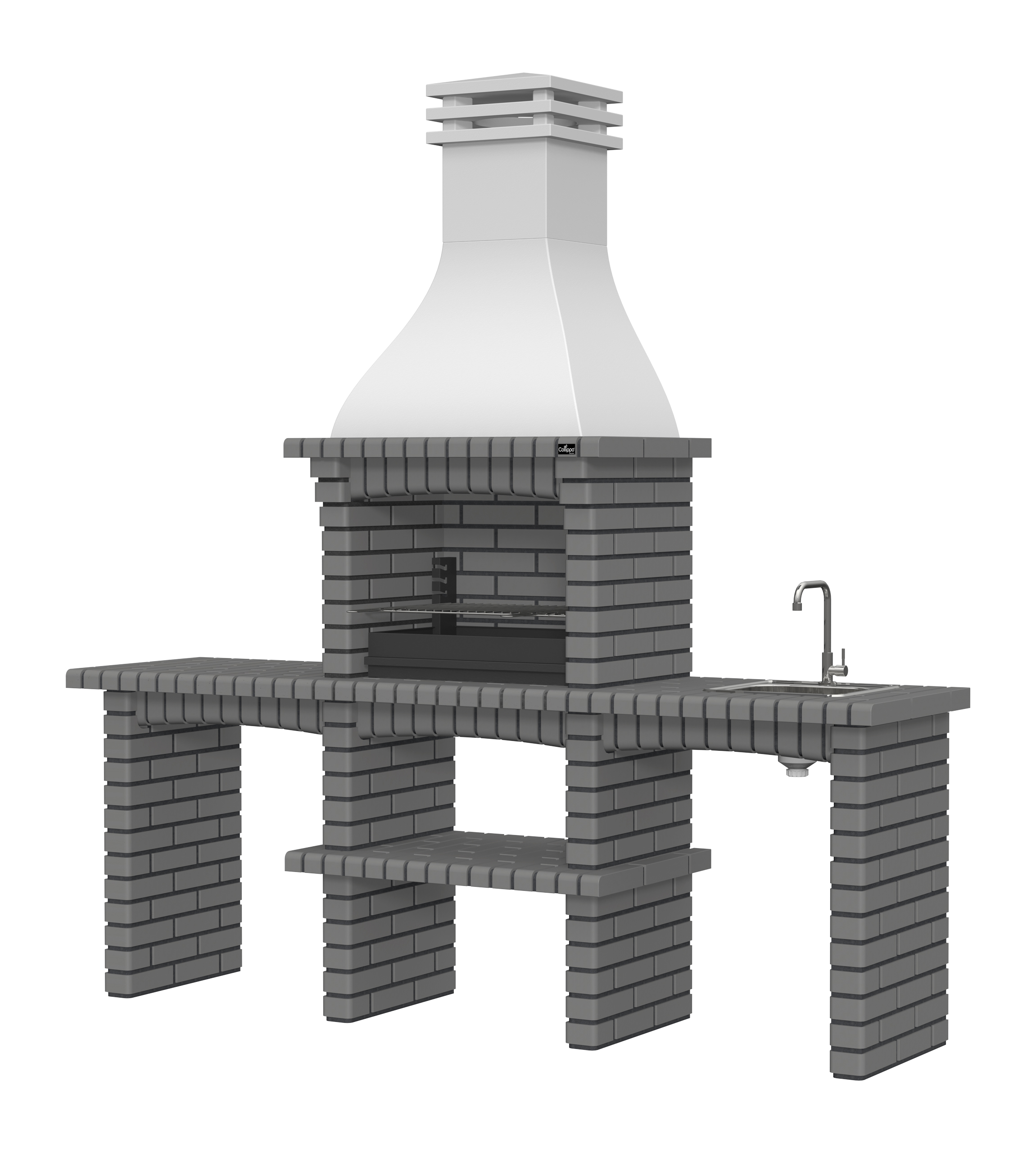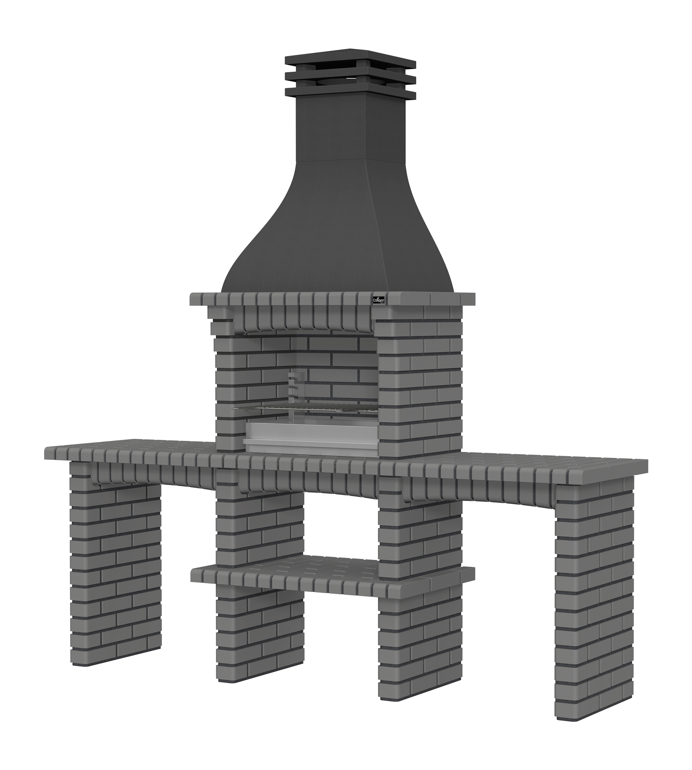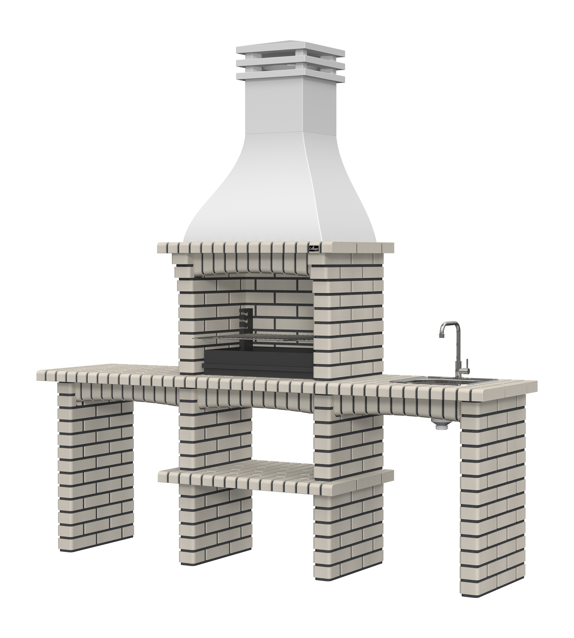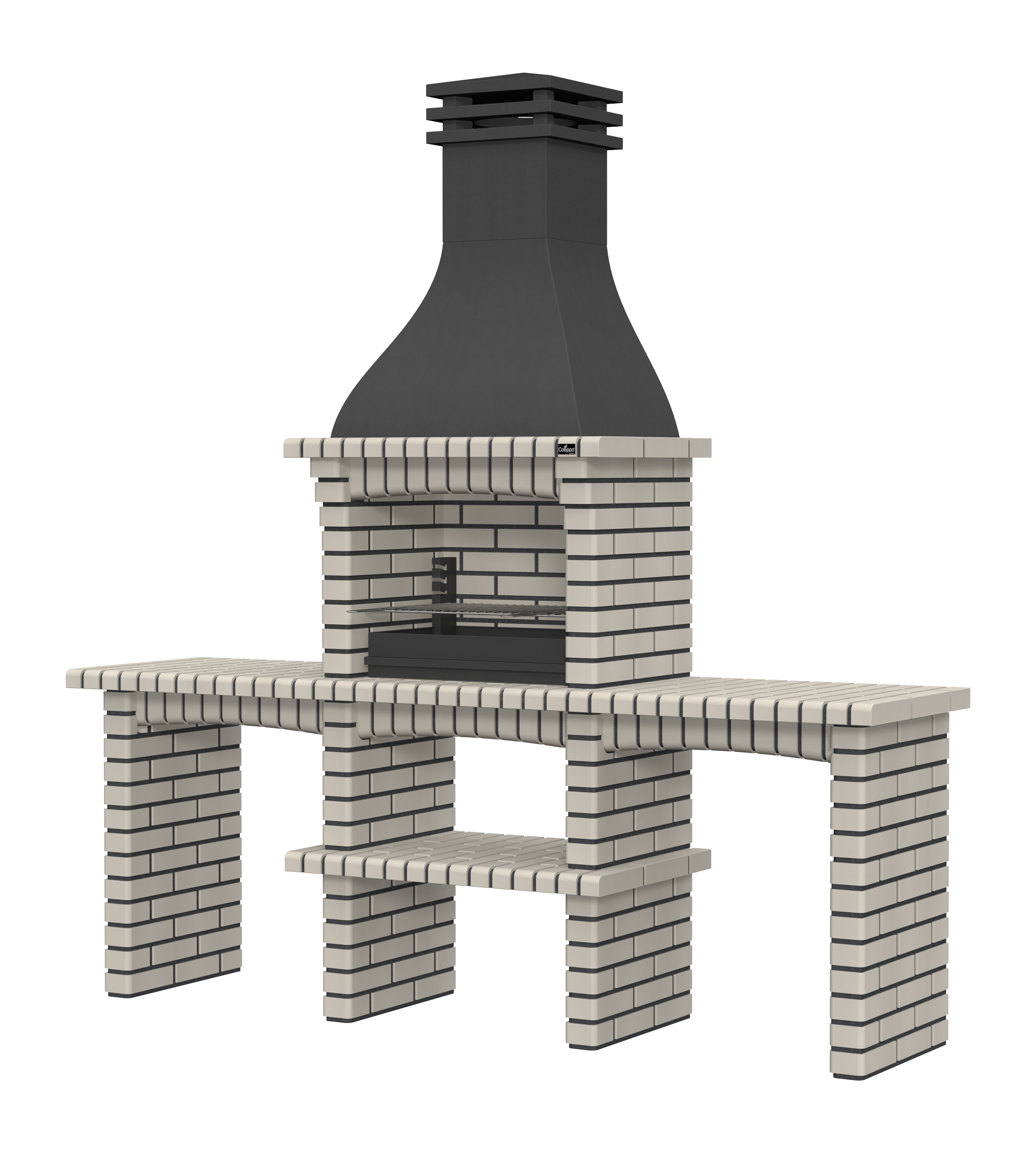 Chaminé em branco liso ou com pintura preta; zona de fogo em tijolo e cimento refractário