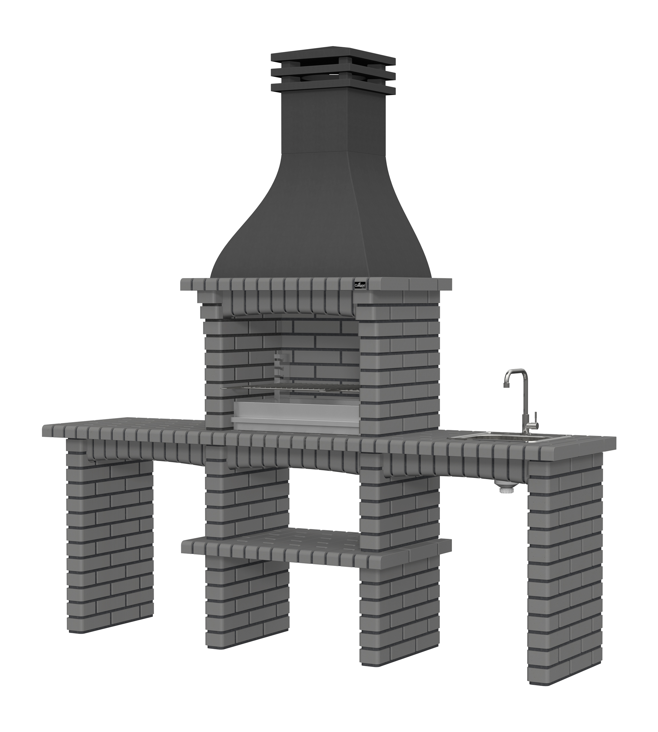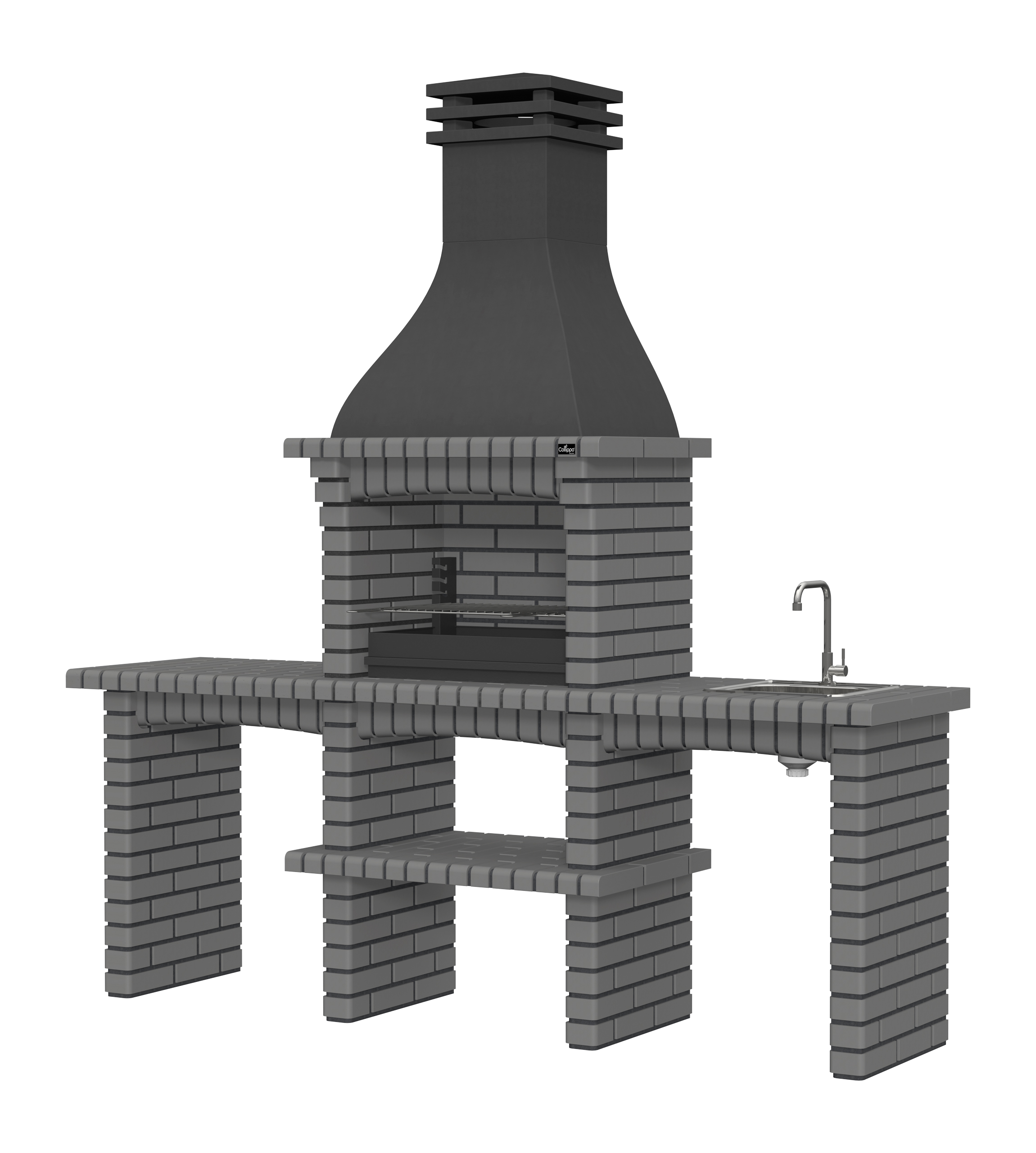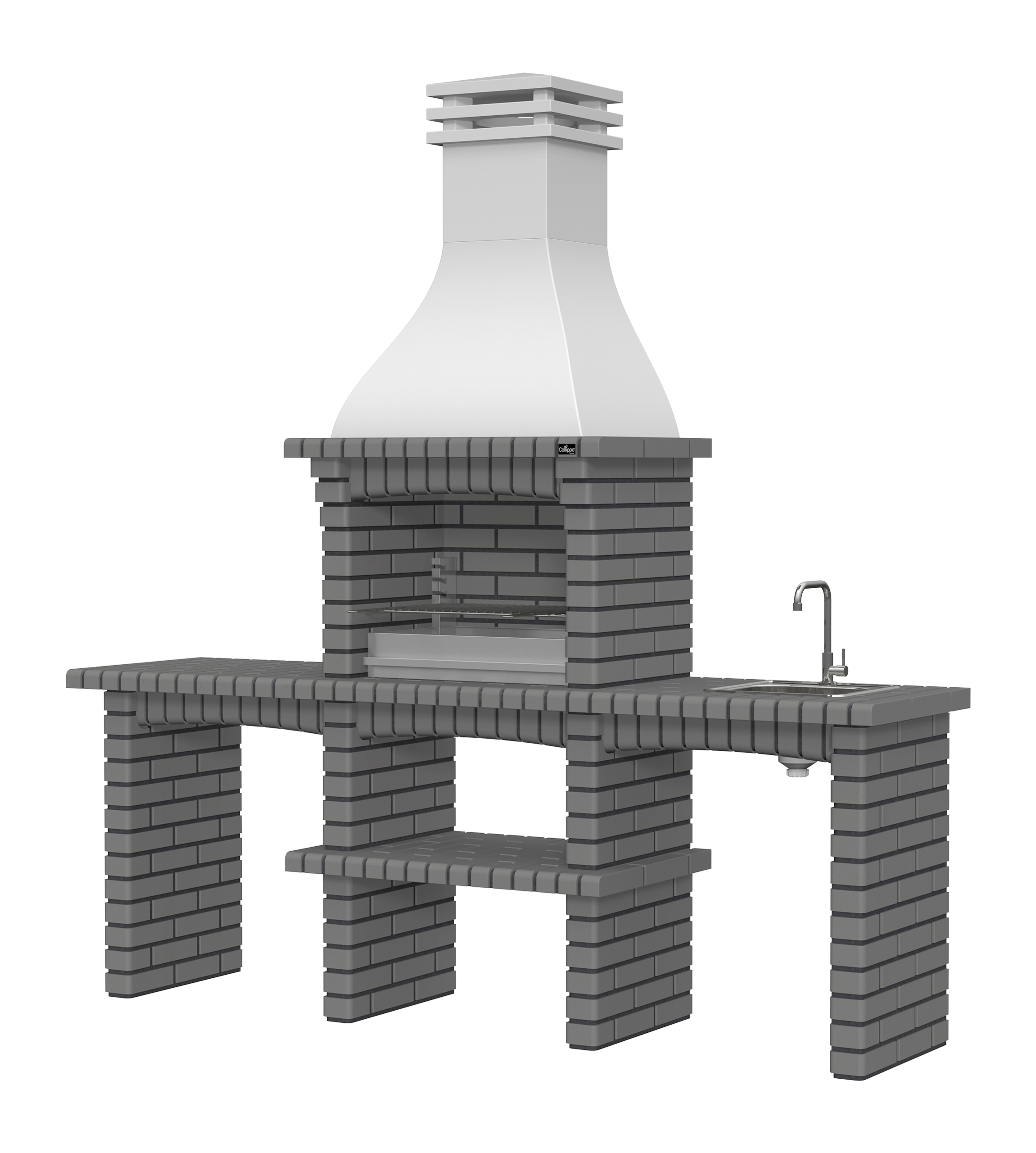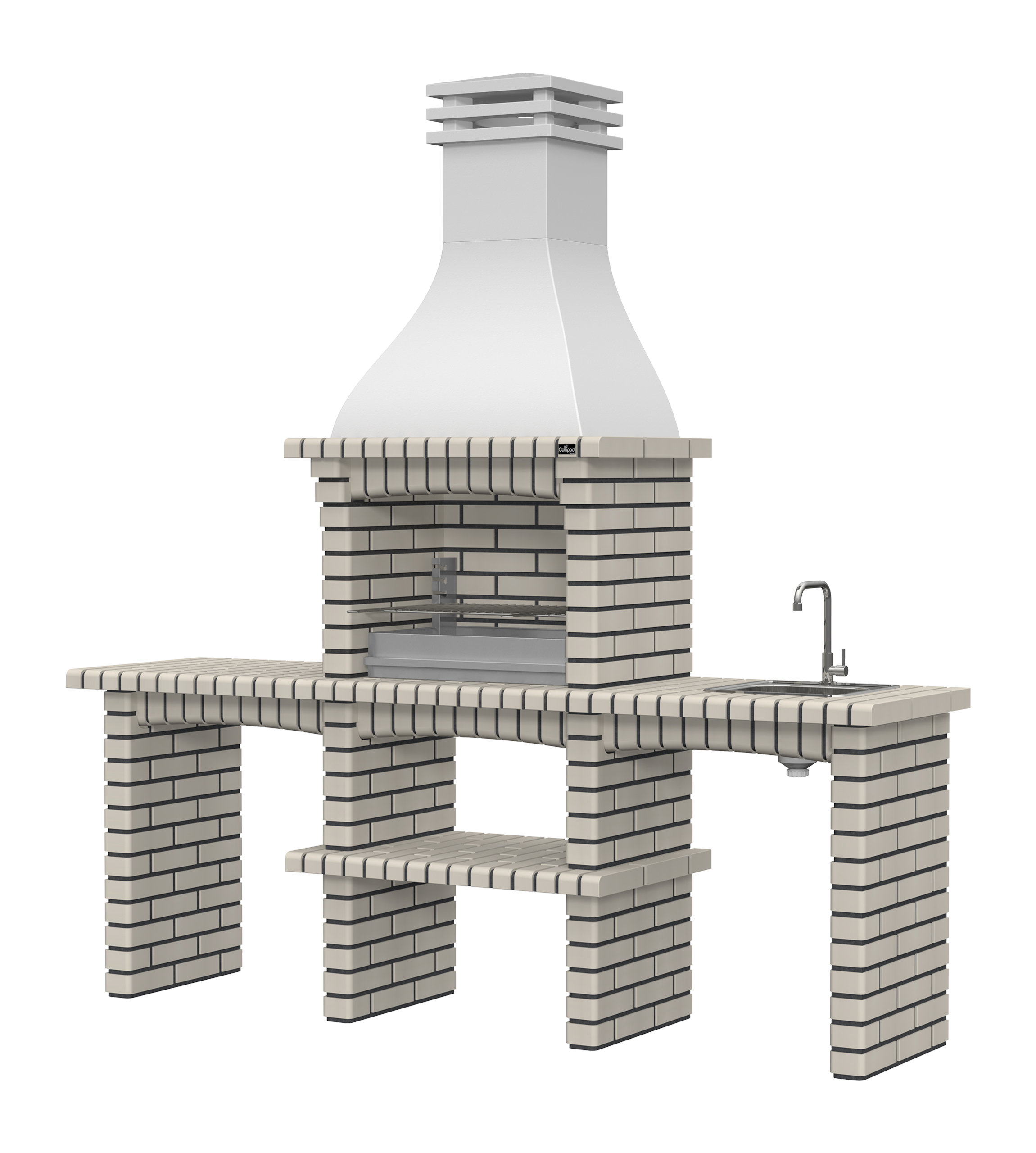 Chaminé em branco liso ou com pintura preta; zona de fogo em tijolo e cimento refractário