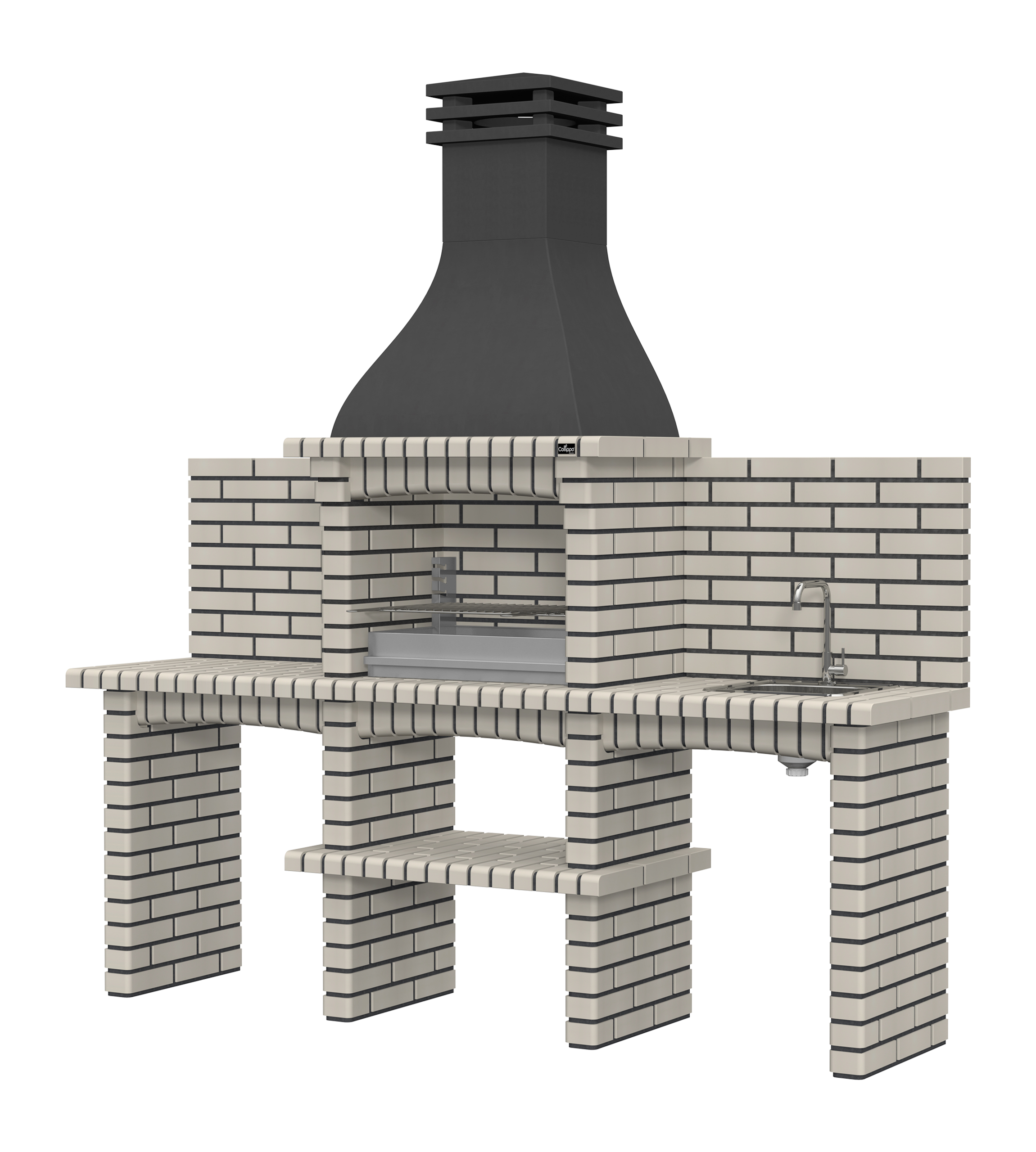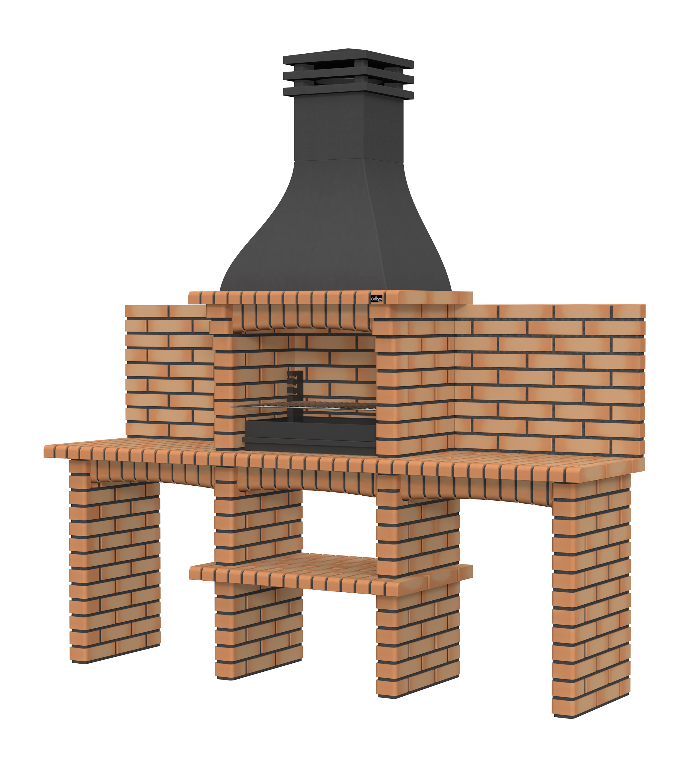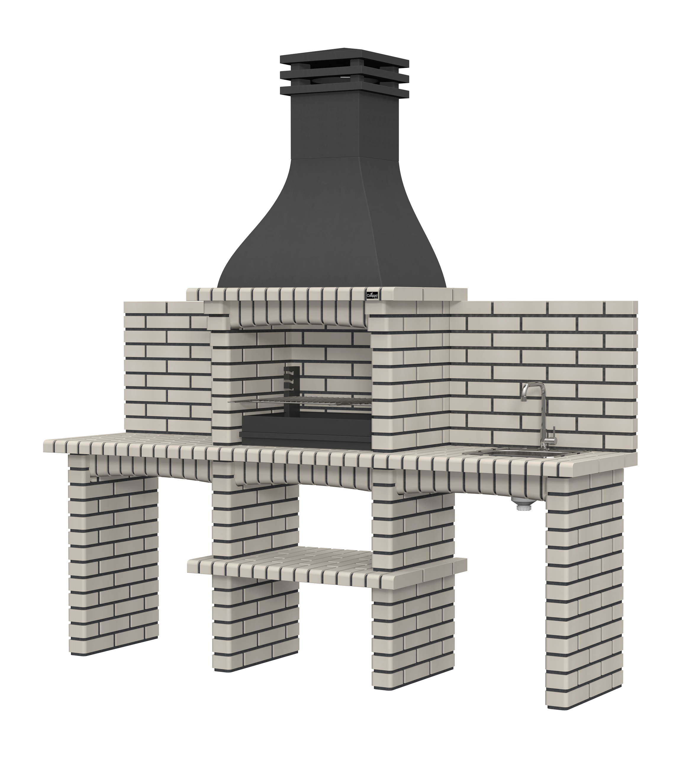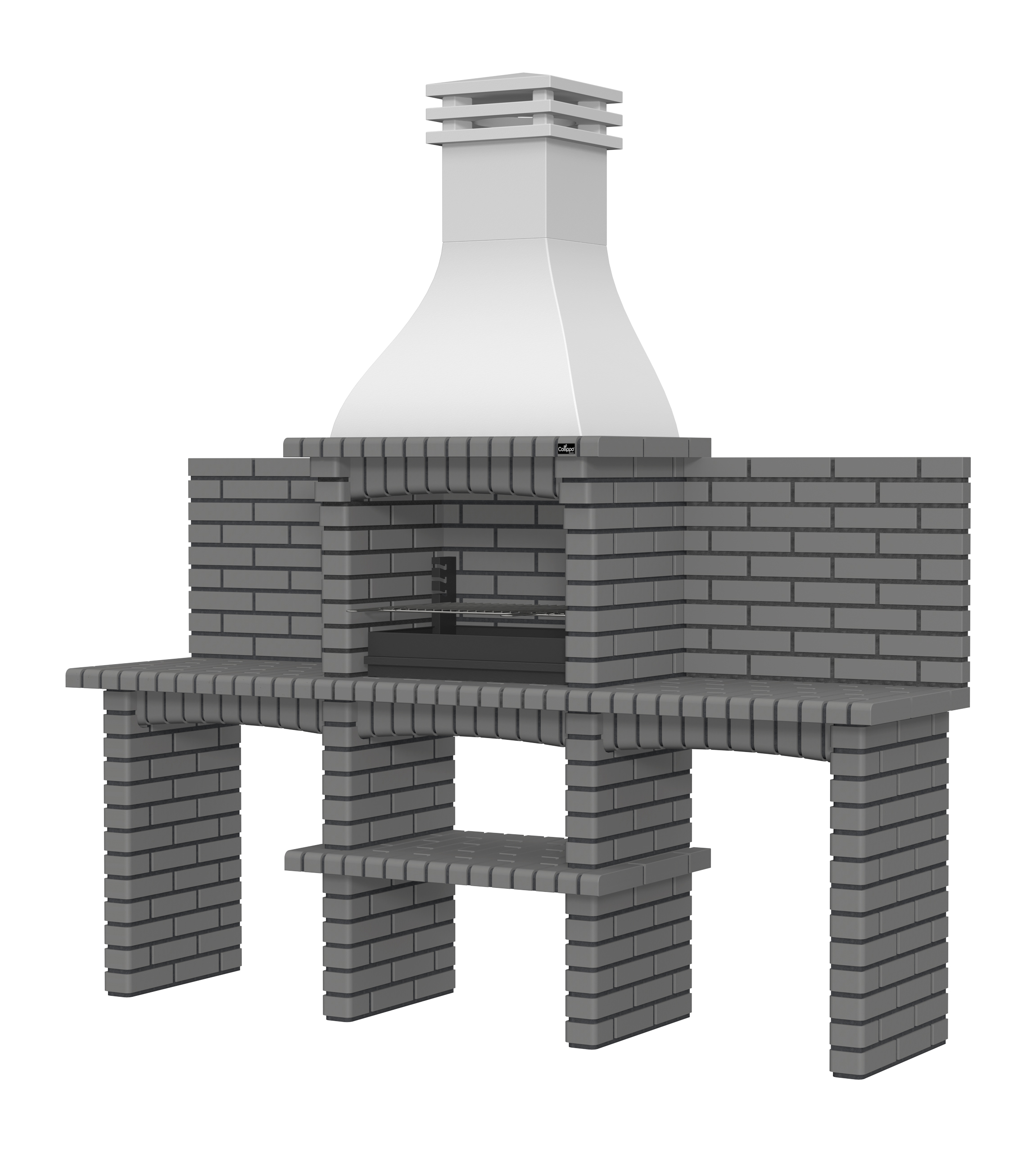 Chaminé em branco liso ou com pintura preta; zona de fogo em tijolo e cimento refractário.
