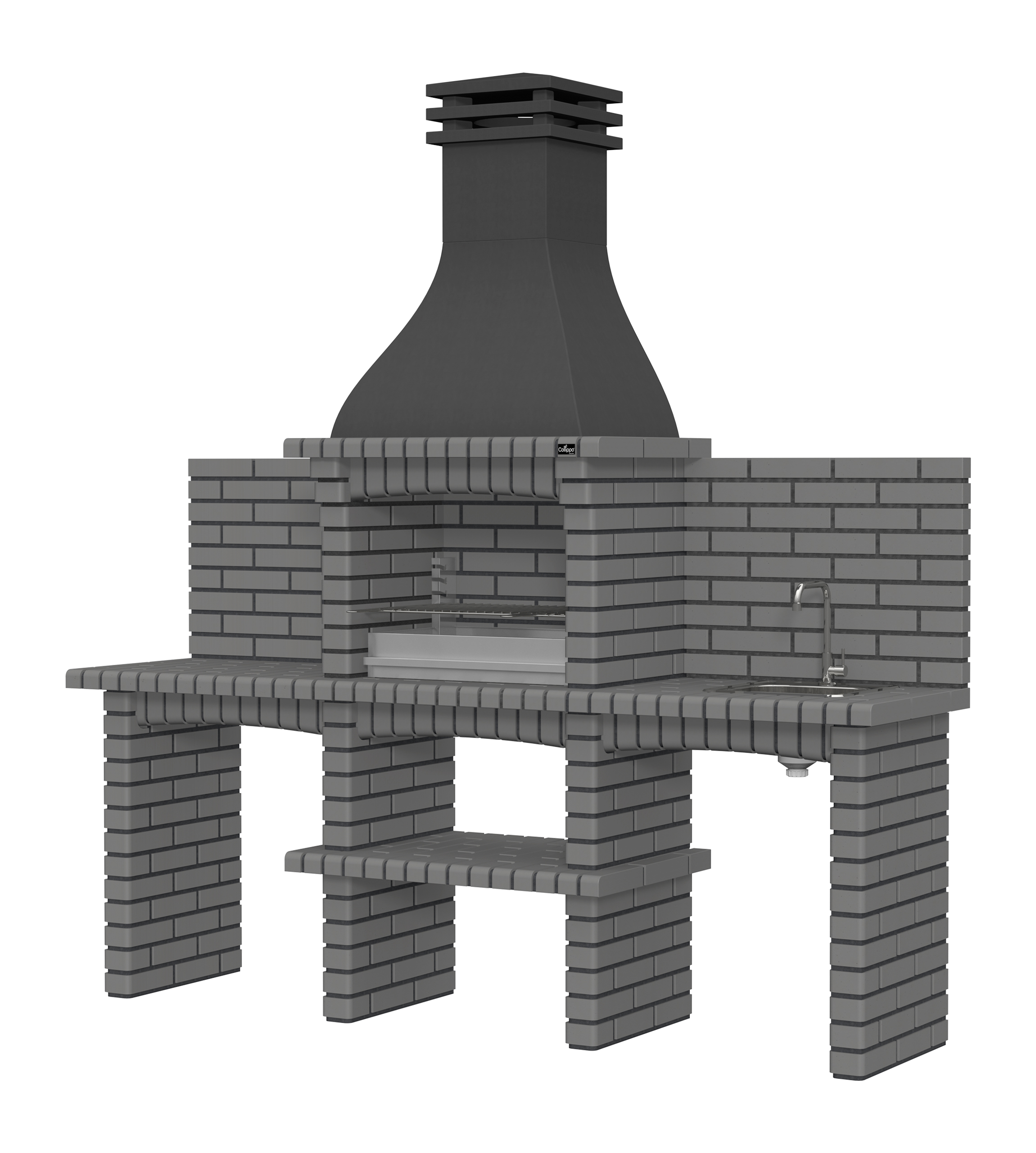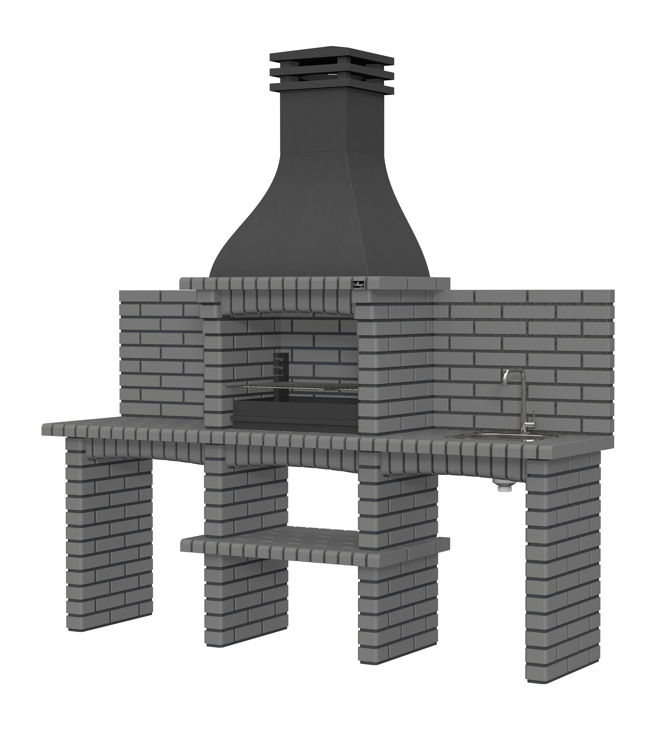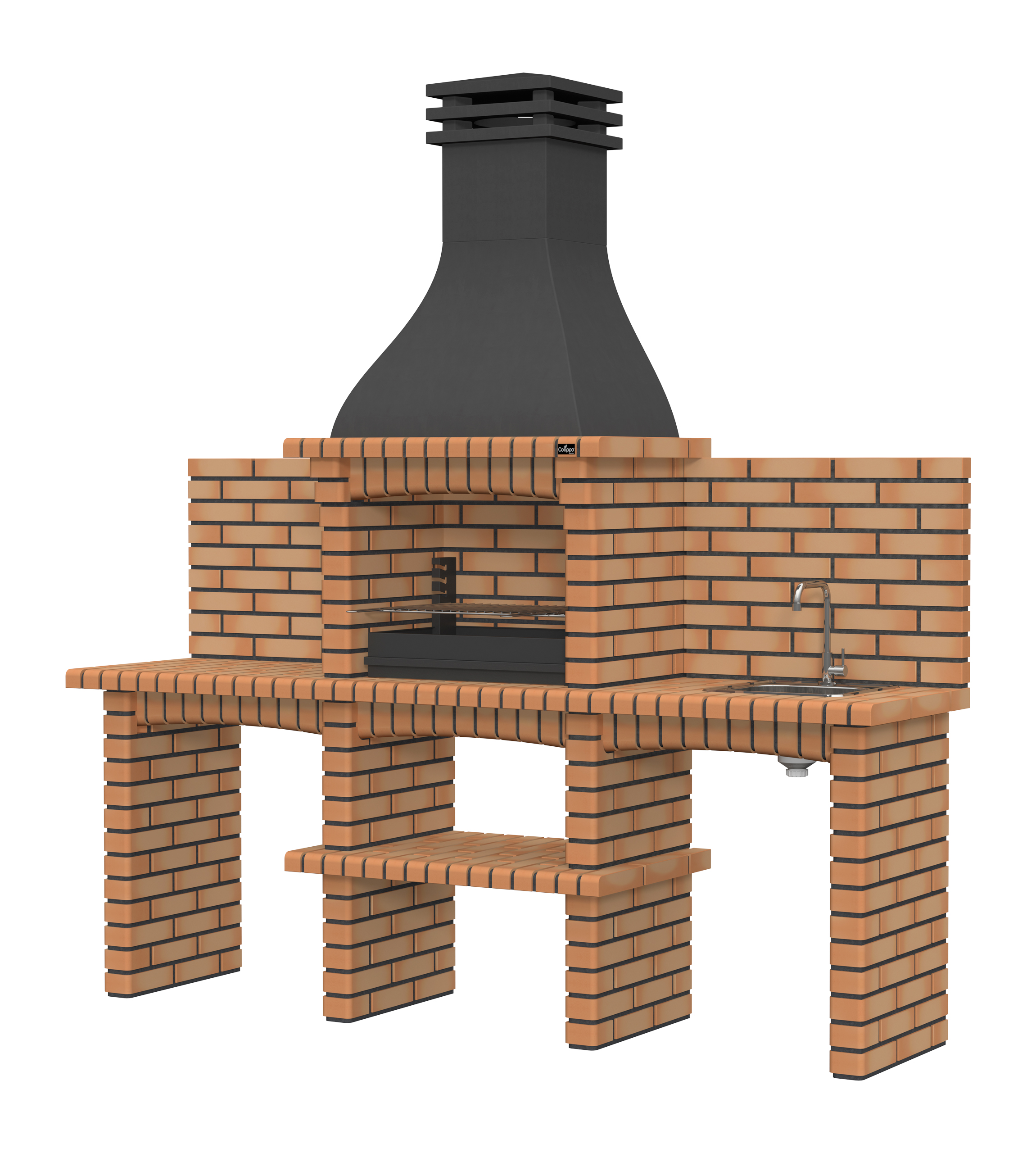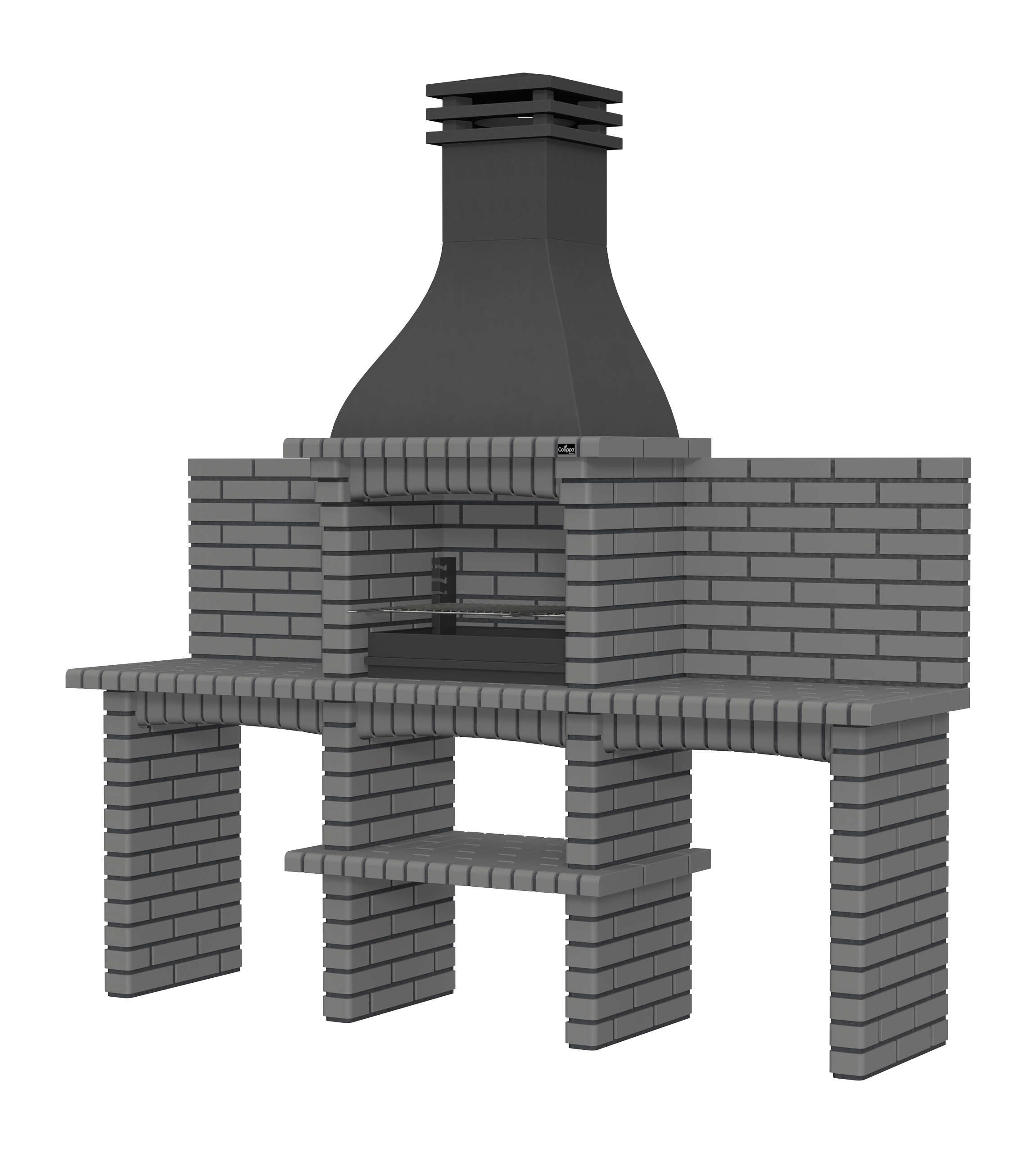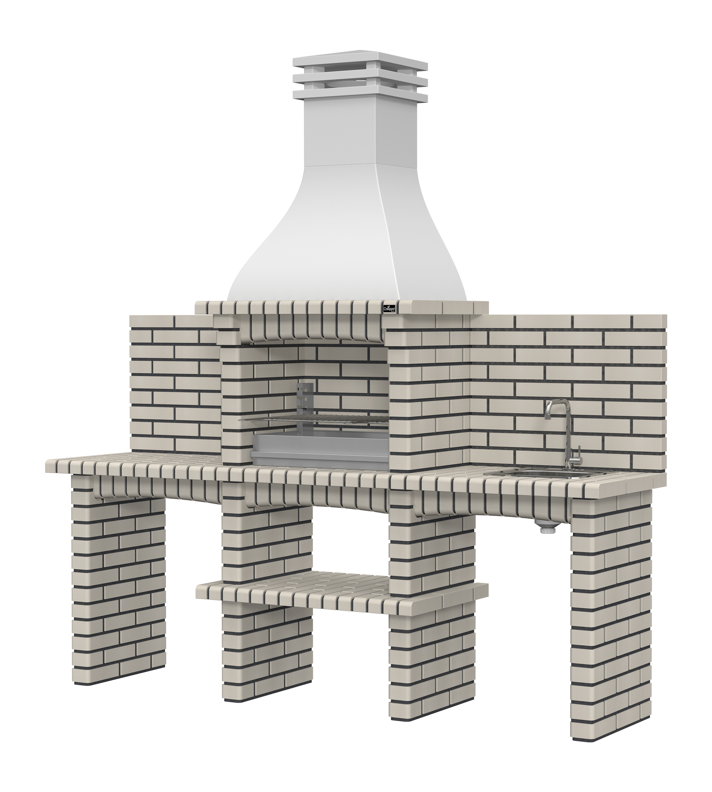 Chaminé em branco liso ou com pintura preta; zona de fogo em tijolo e cimento refractário.