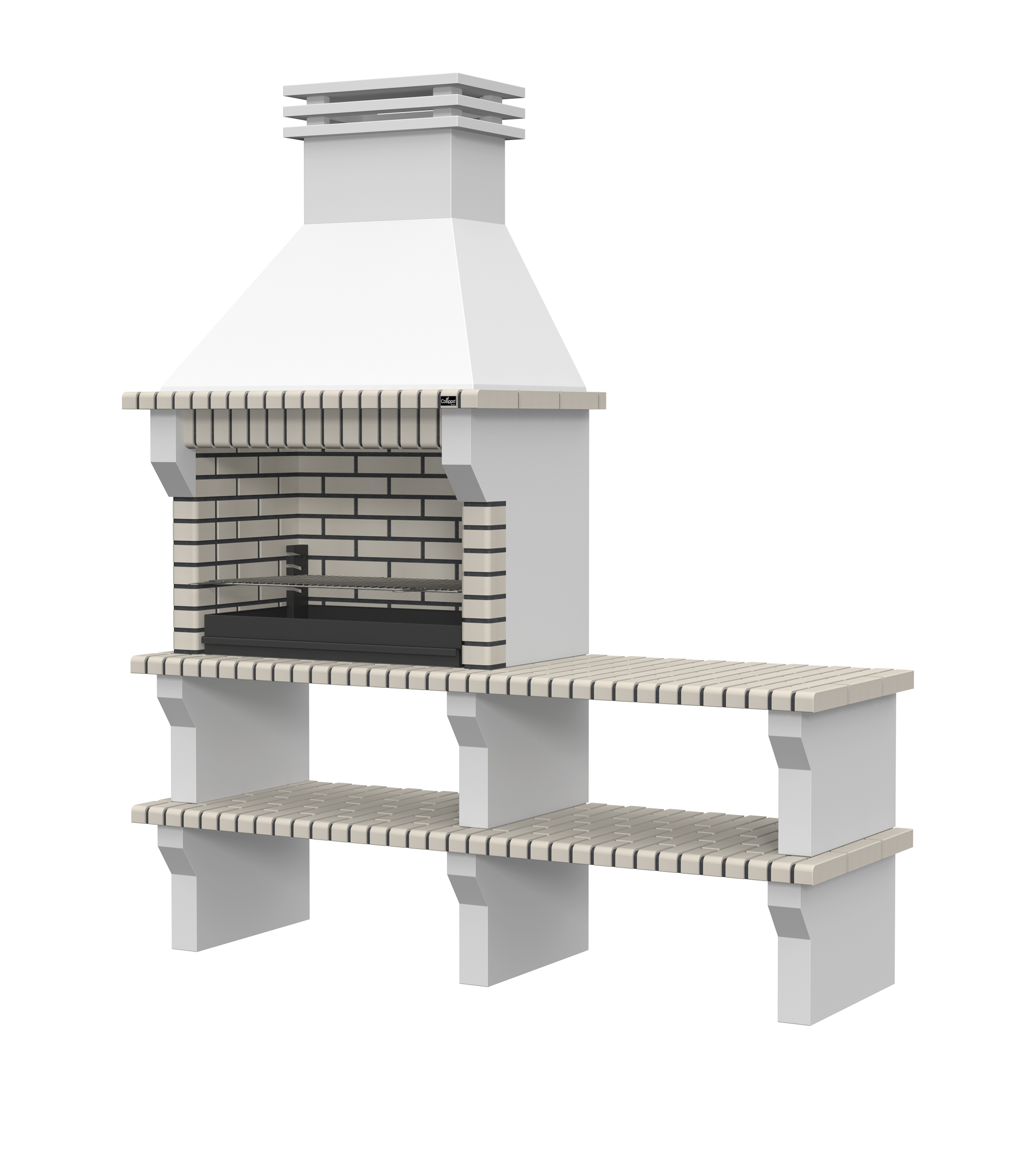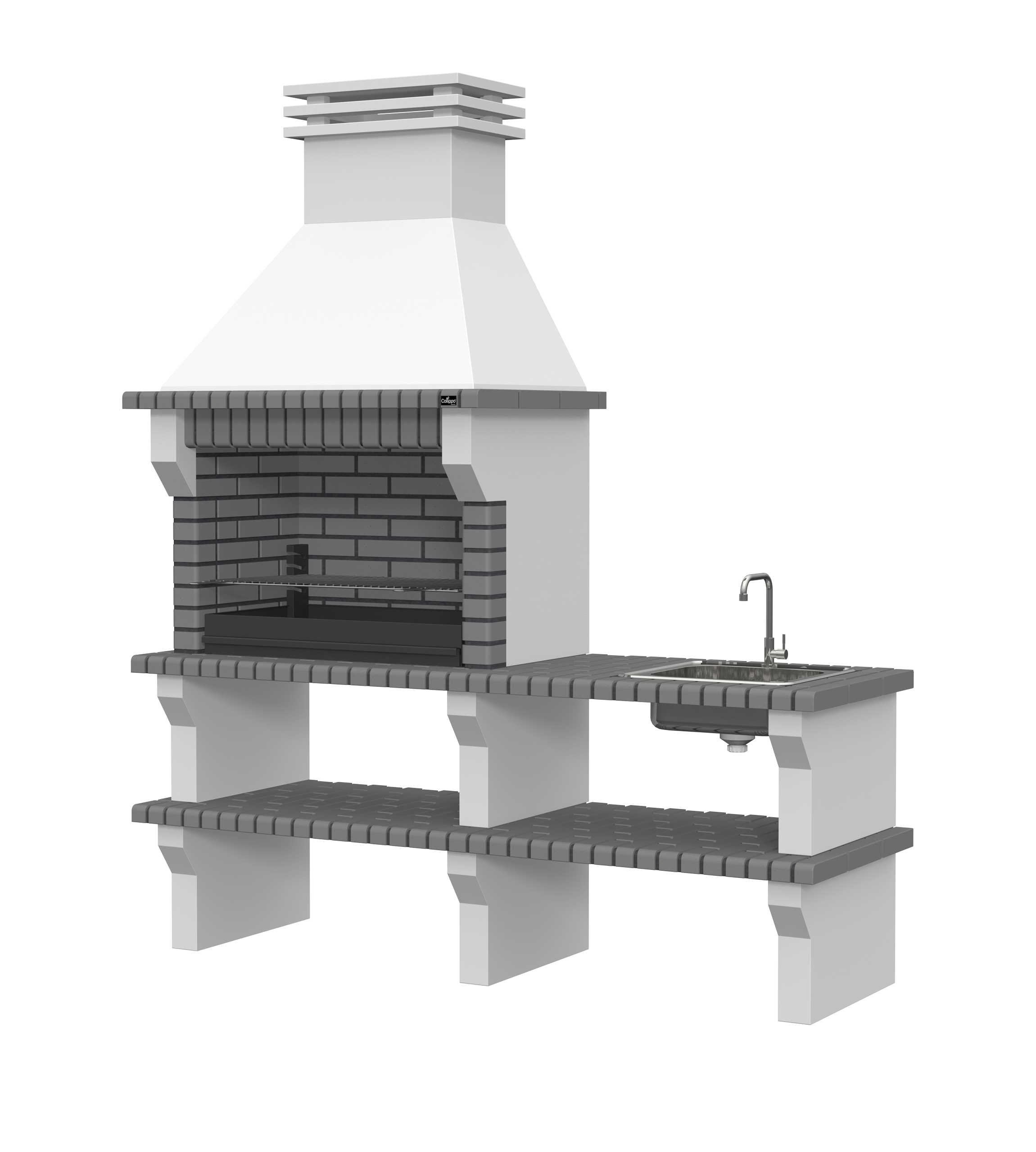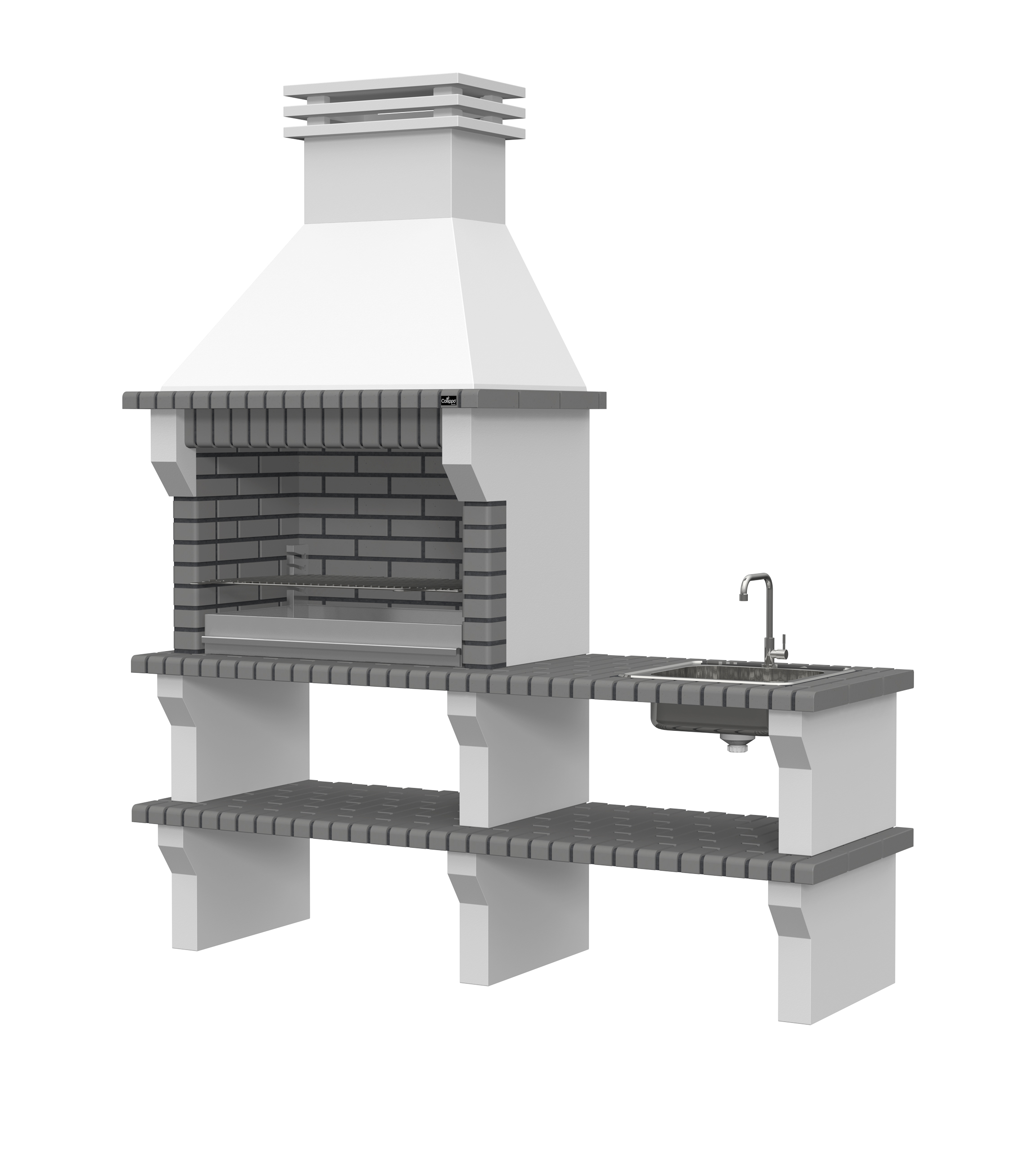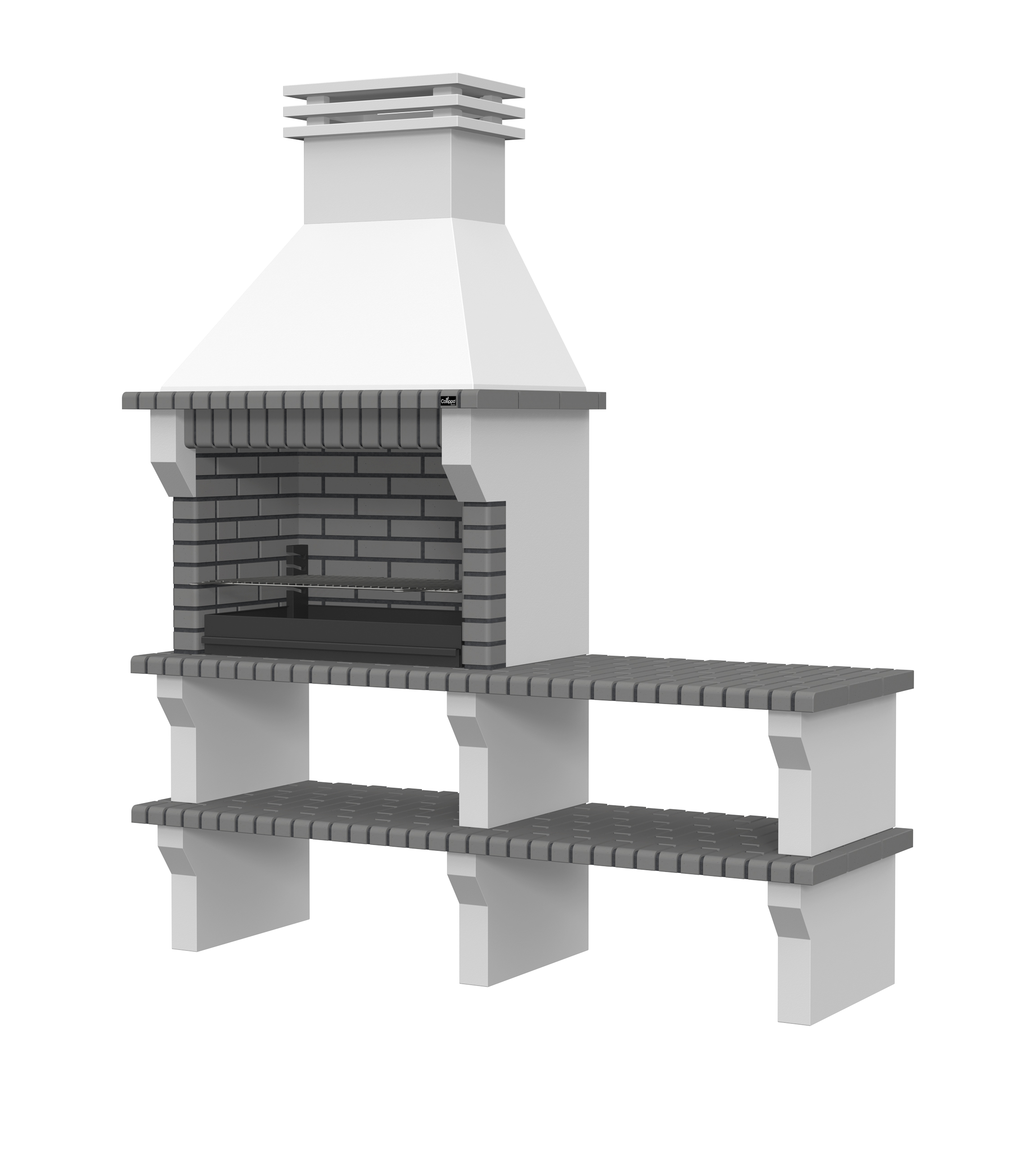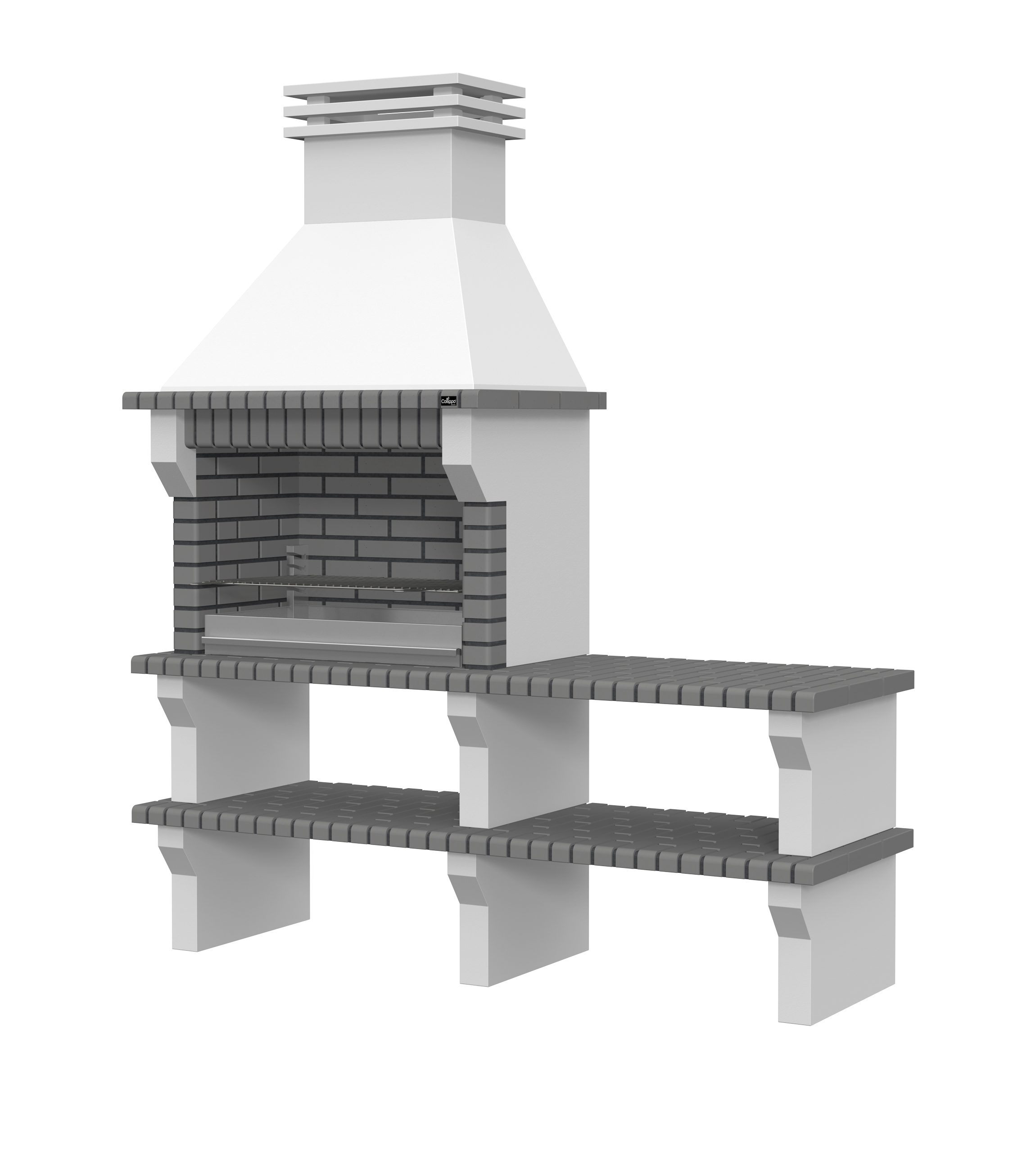 Chaminé e pés em micro betão cinzento liso; laterais em micro betão cinzento texturado; zona de fogo em tijolo e cimento refractário.