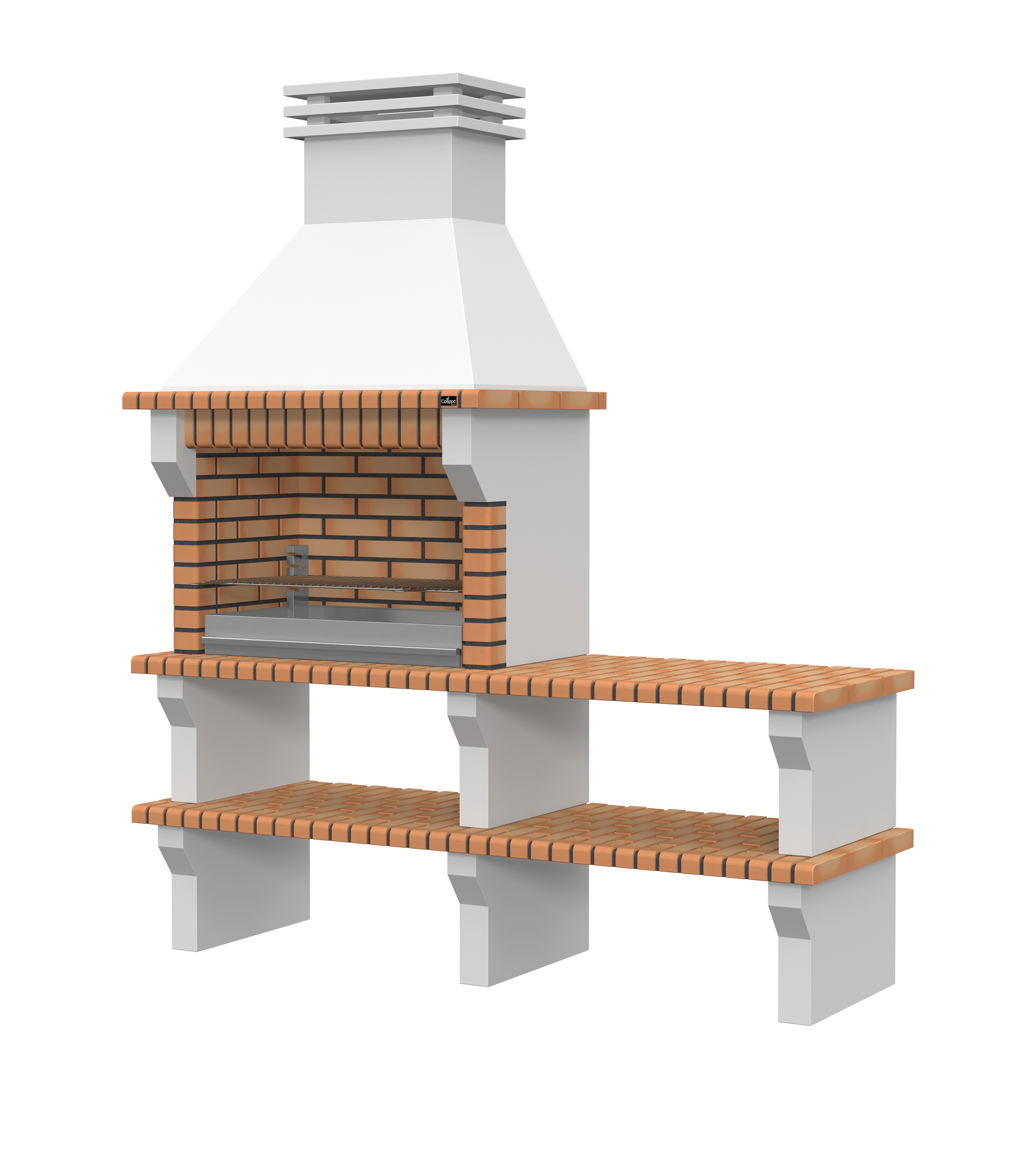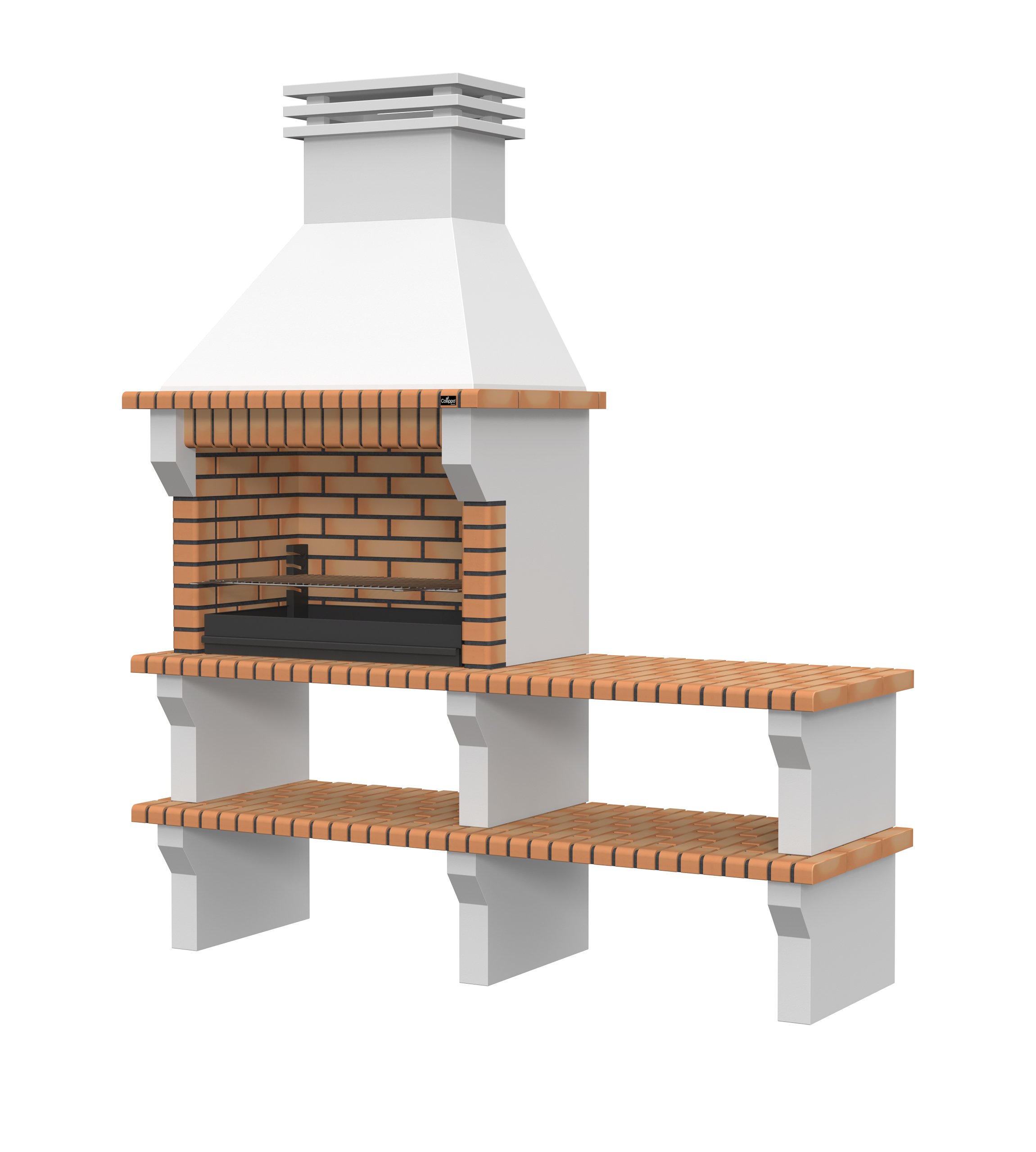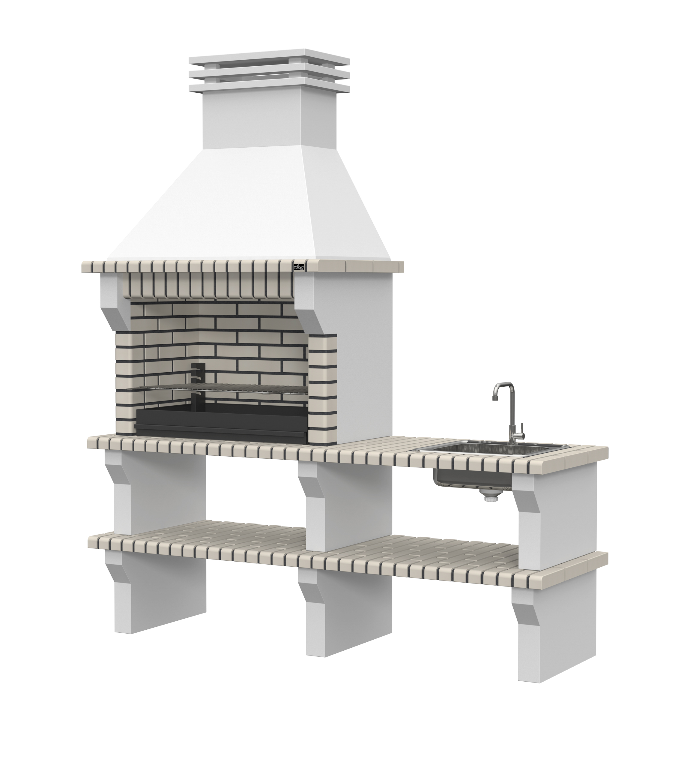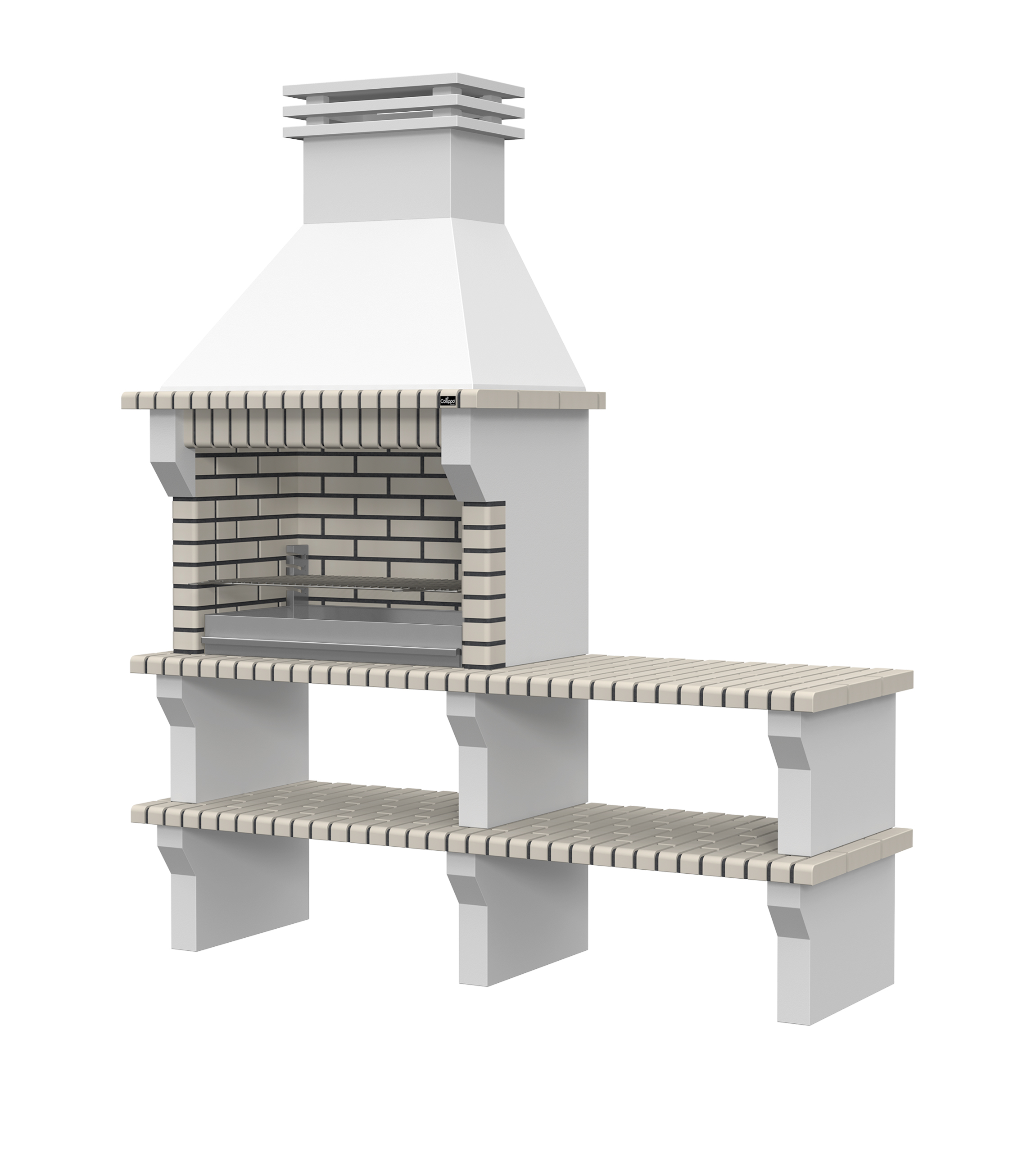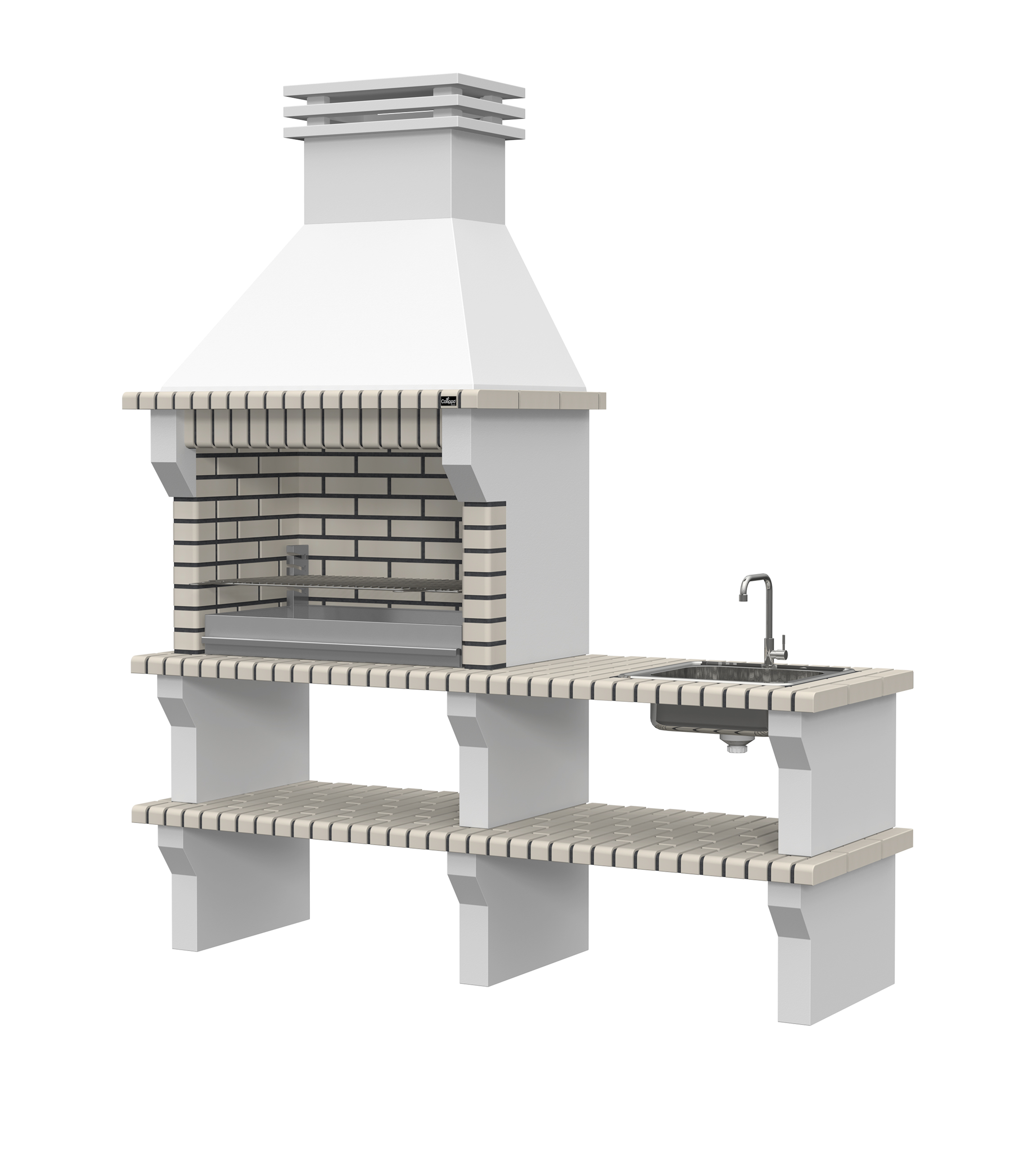 Chaminé e pés em micro betão cinzento liso; laterais em micro betão cinzento texturado; zona de fogo em tijolo e cimento refractário.