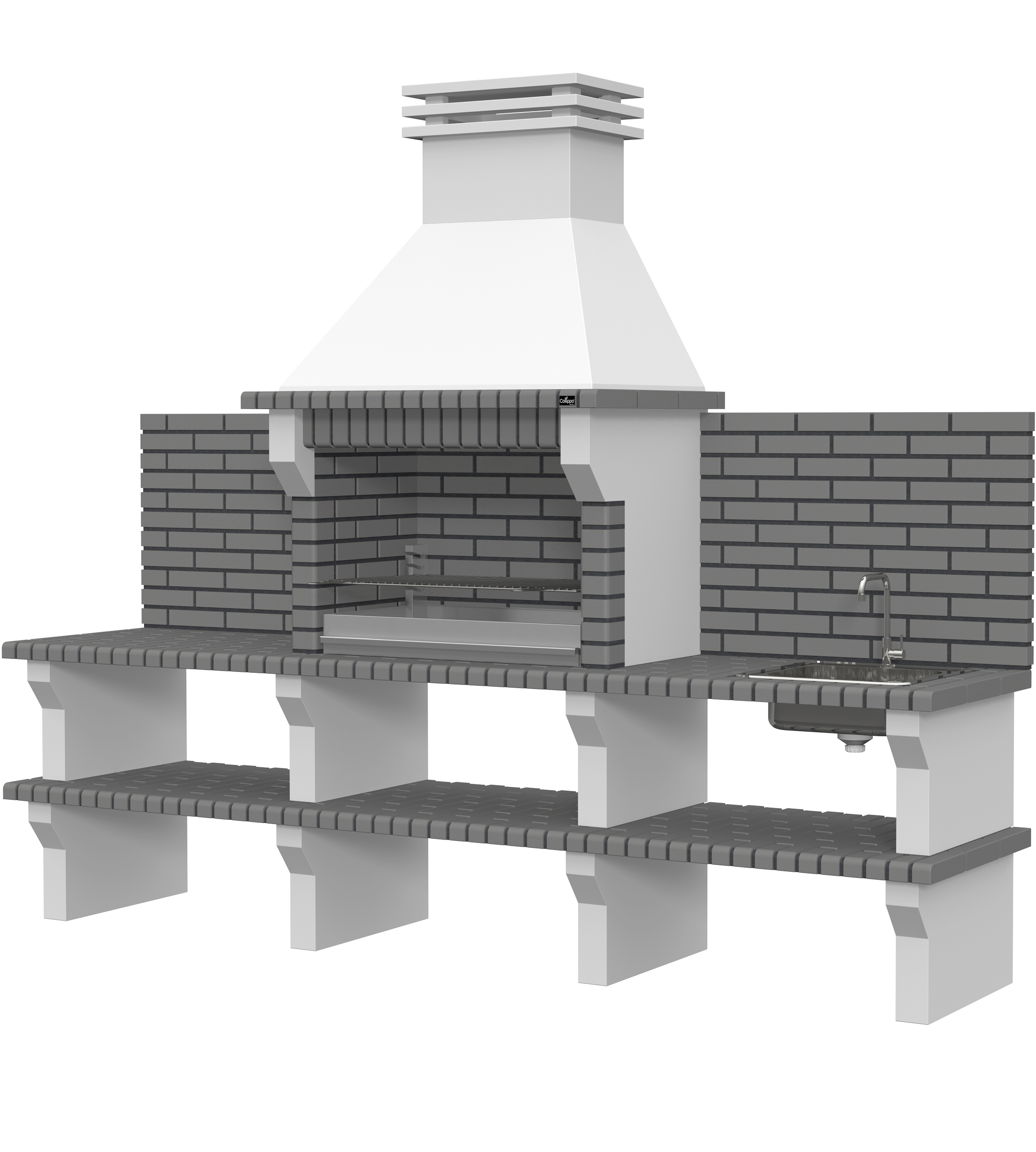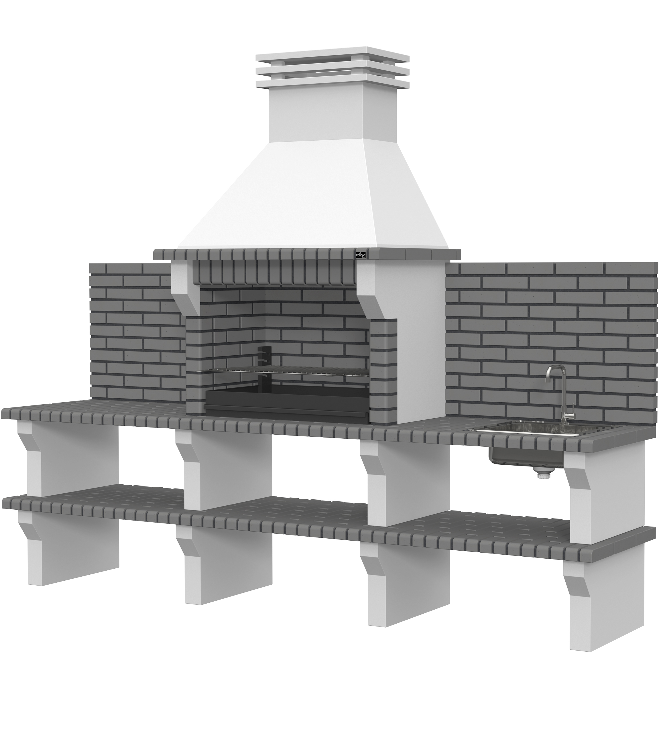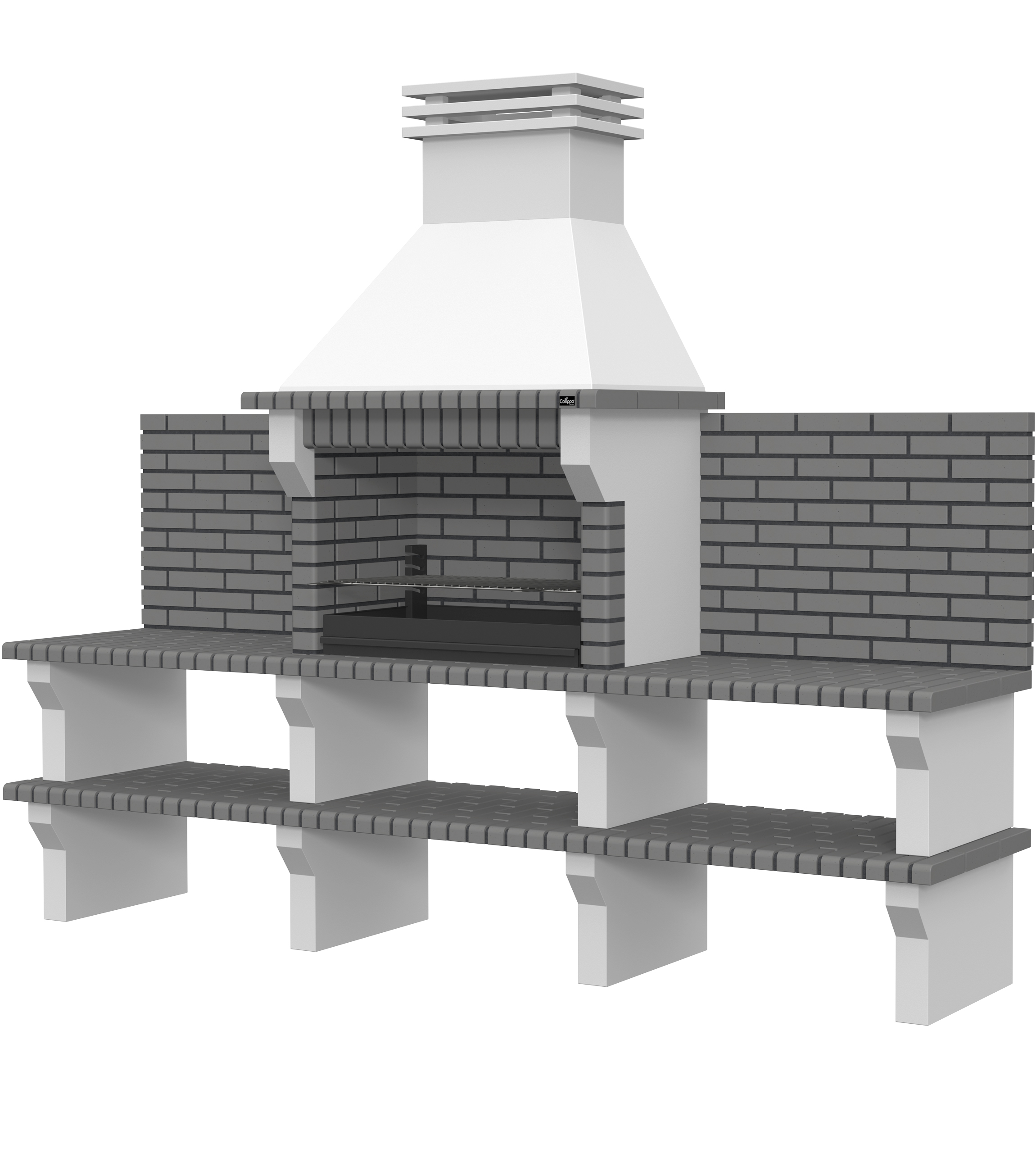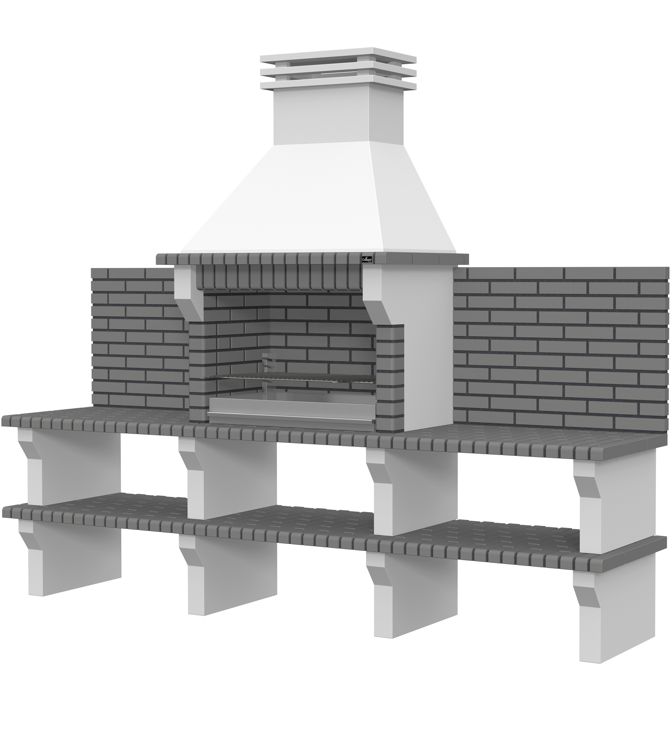 Chaminé e pés em micro betão cinzento liso; laterais em micro betão cinzento texturado; zona de fogo em tijolo e cimento refractário.