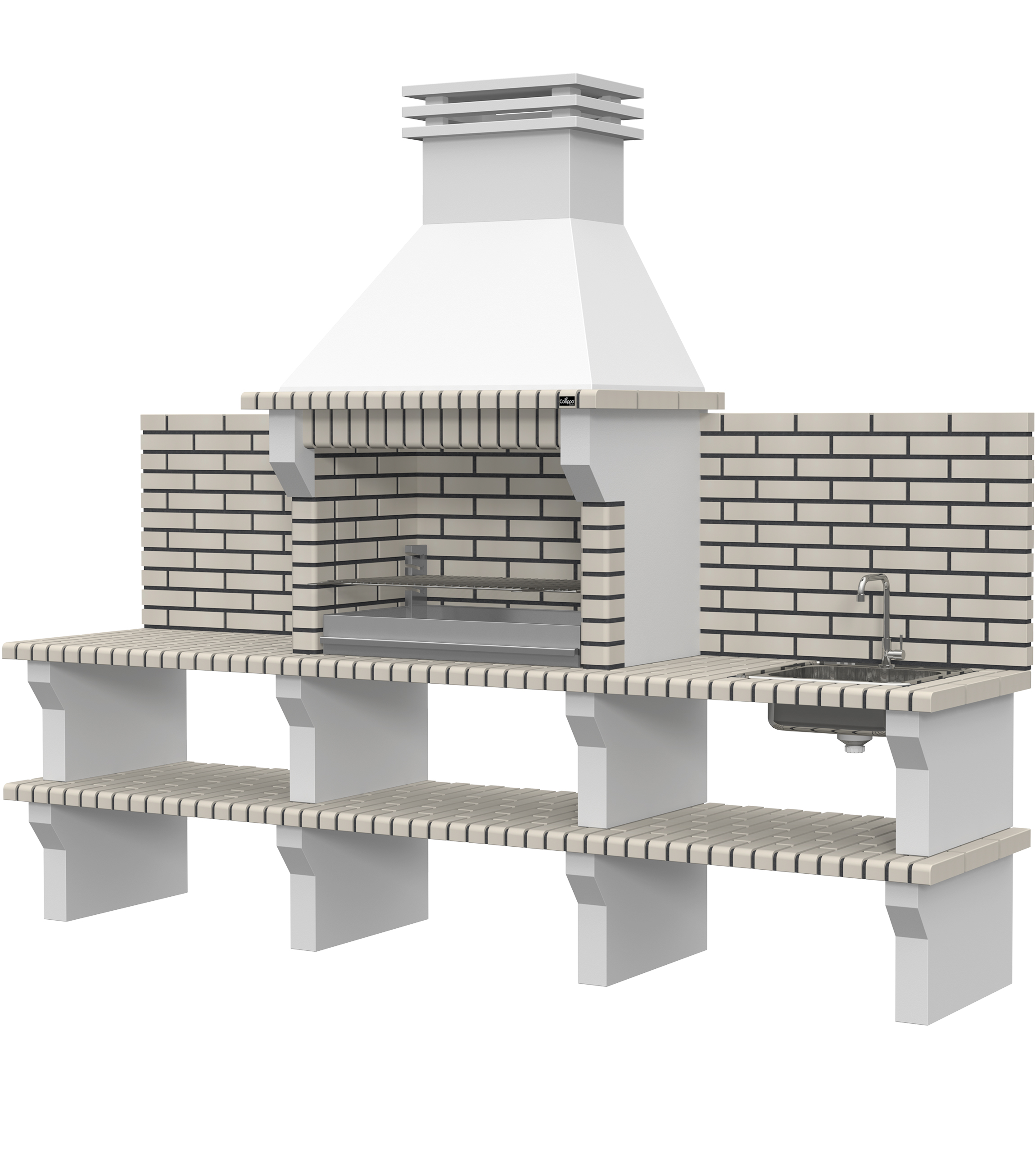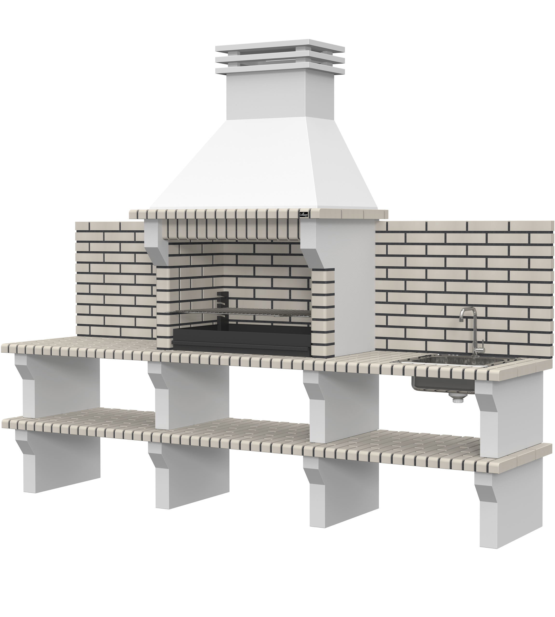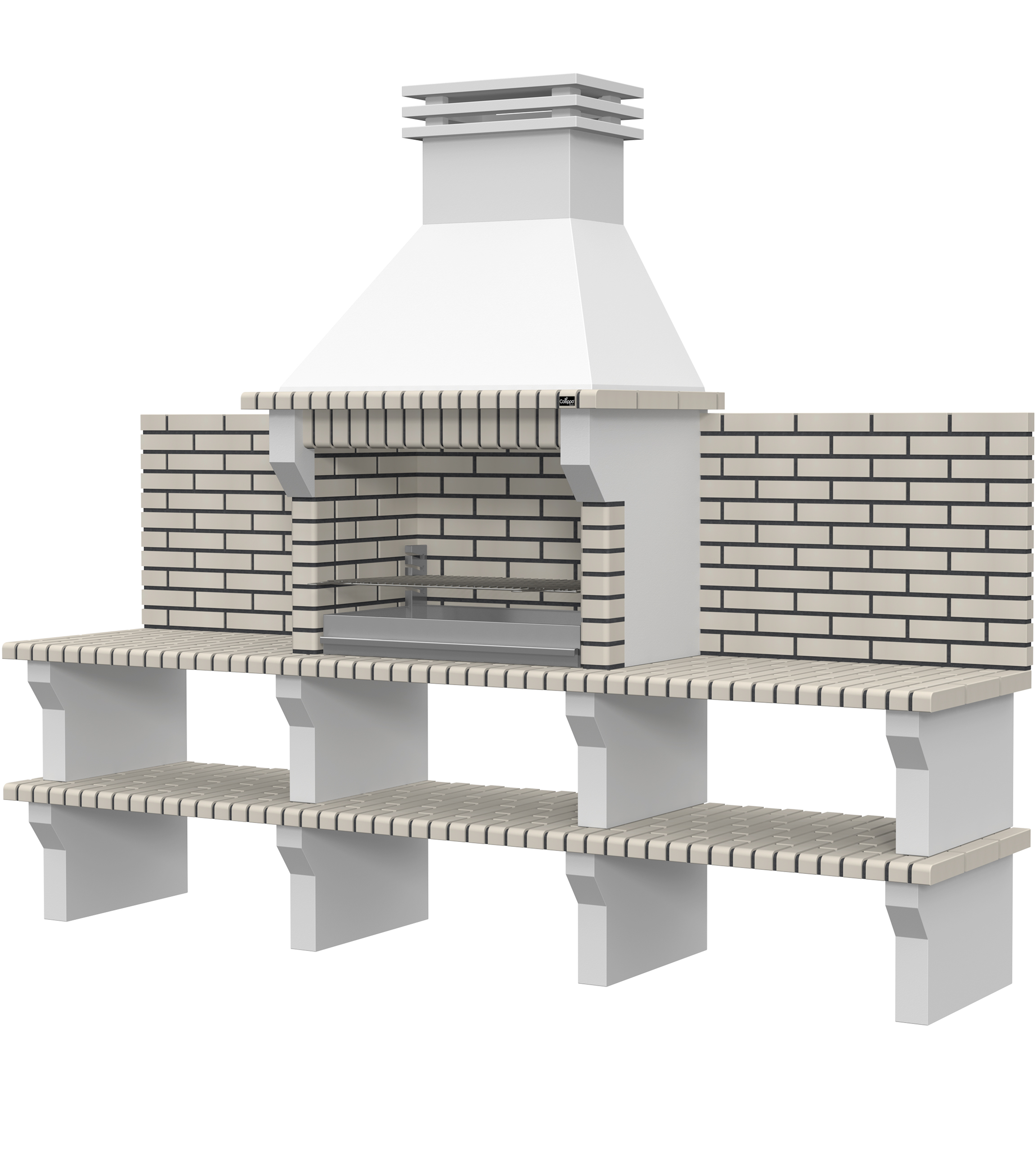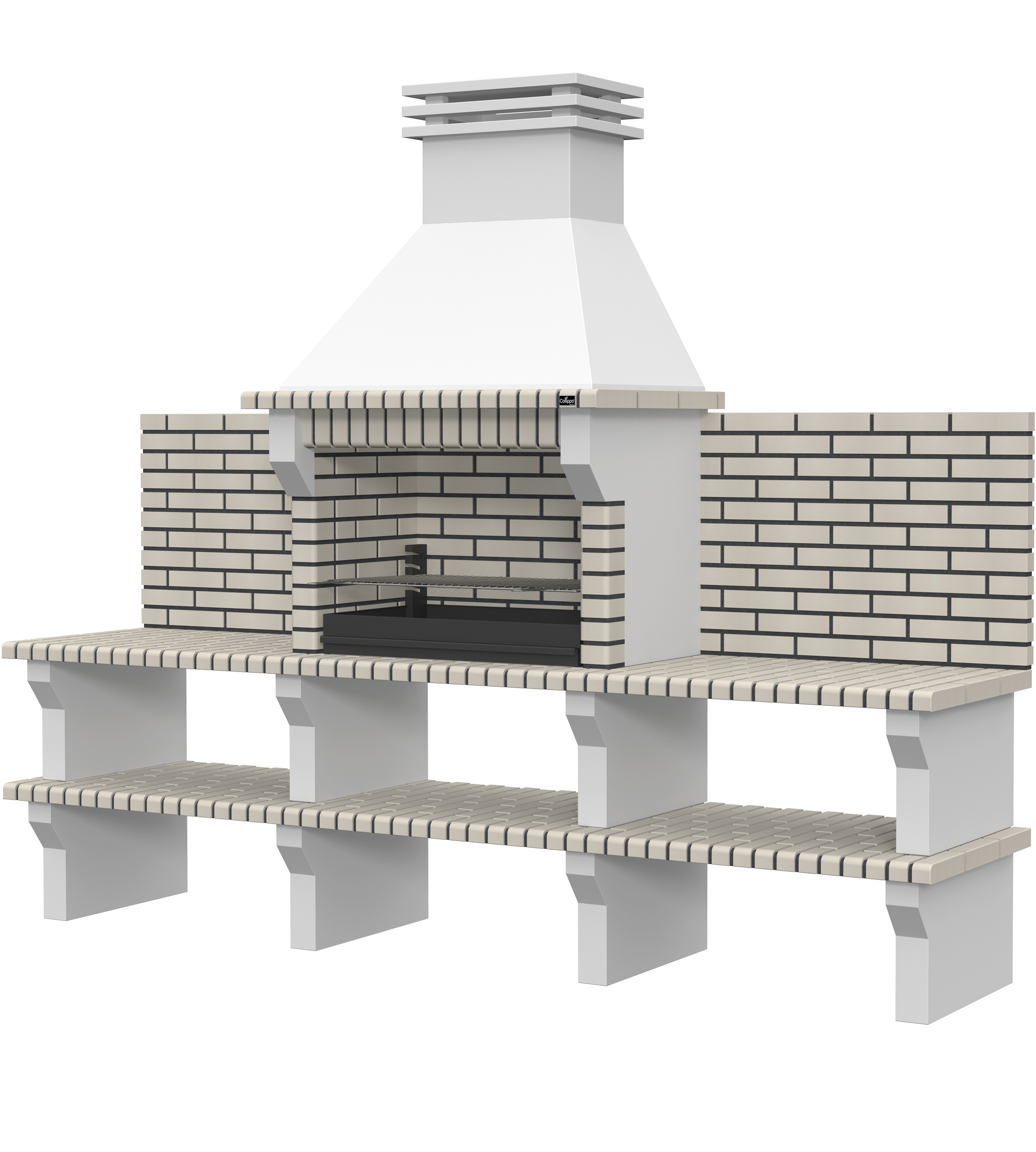 Chaminé e pés em micro betão cinzento liso; laterais em micro betão cinzento texturado; zona de fogo em tijolo e cimento refractário.