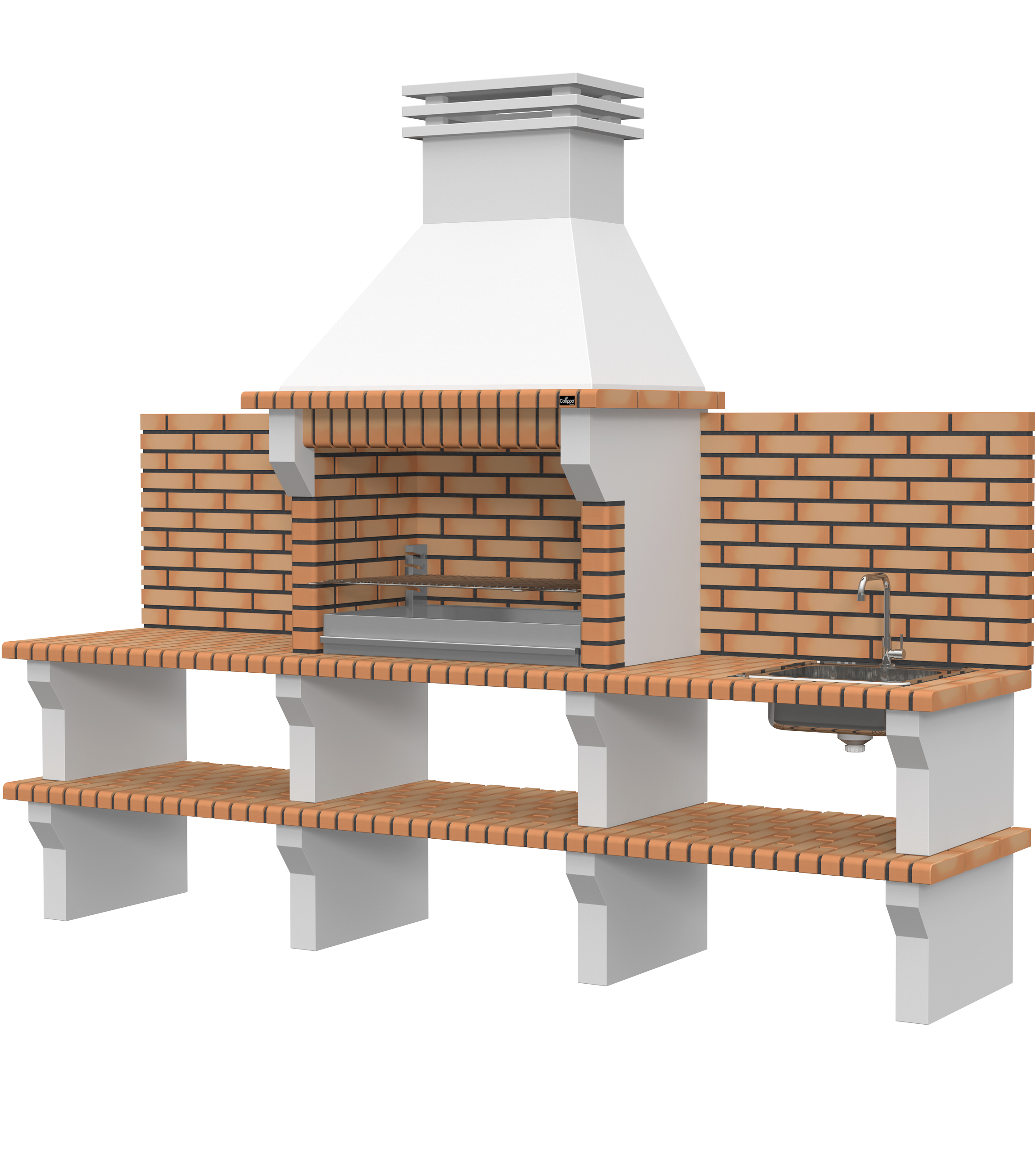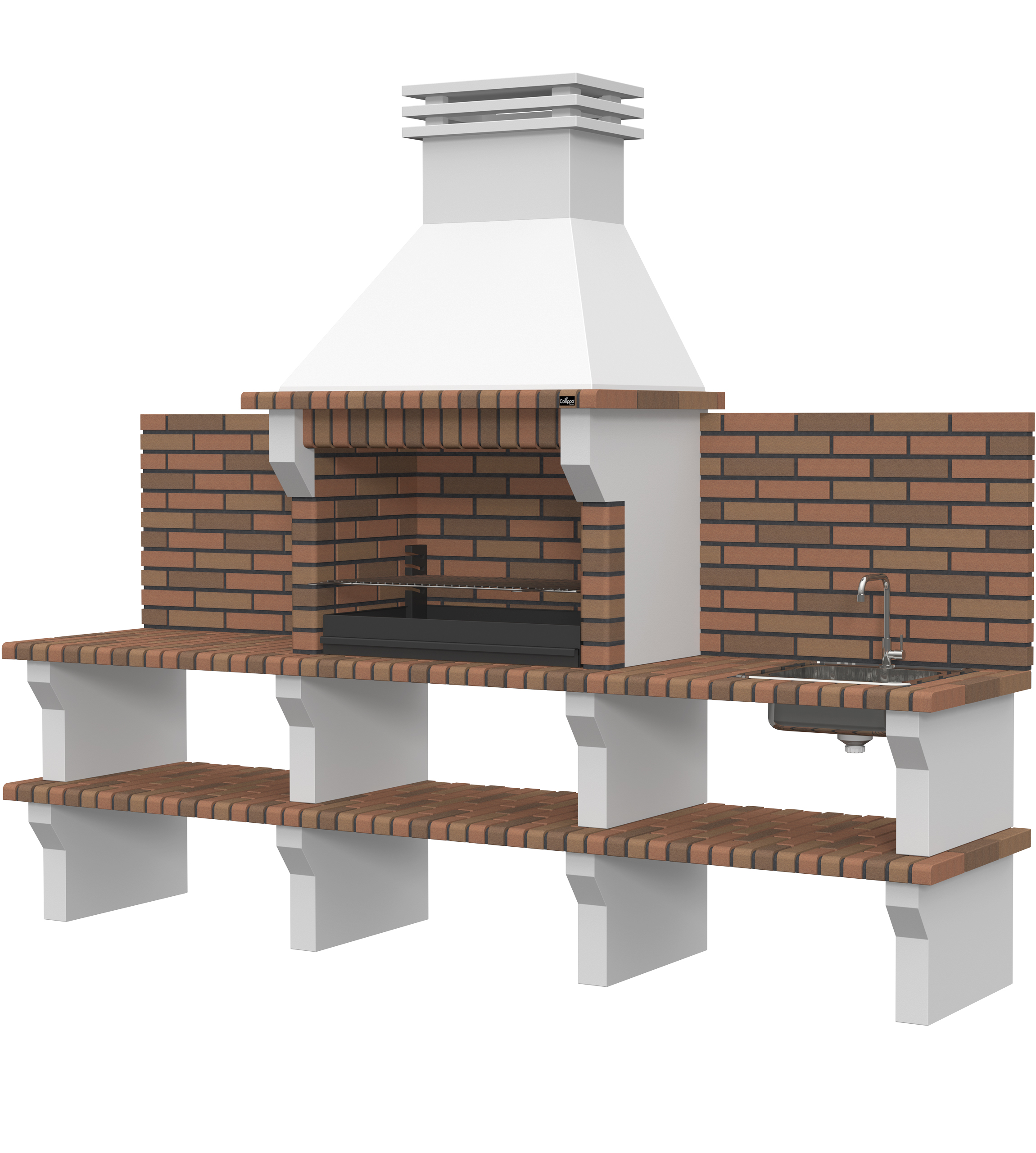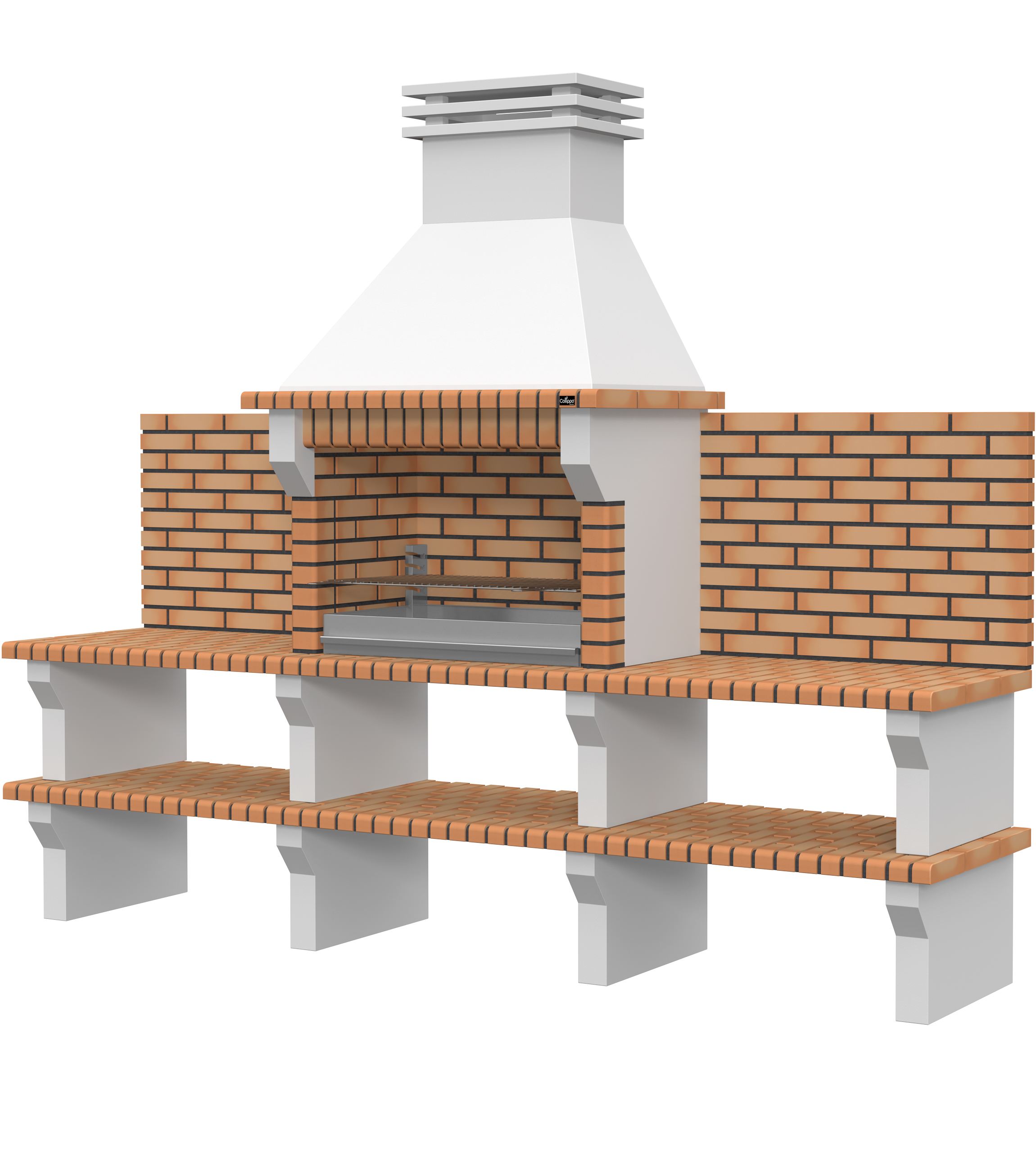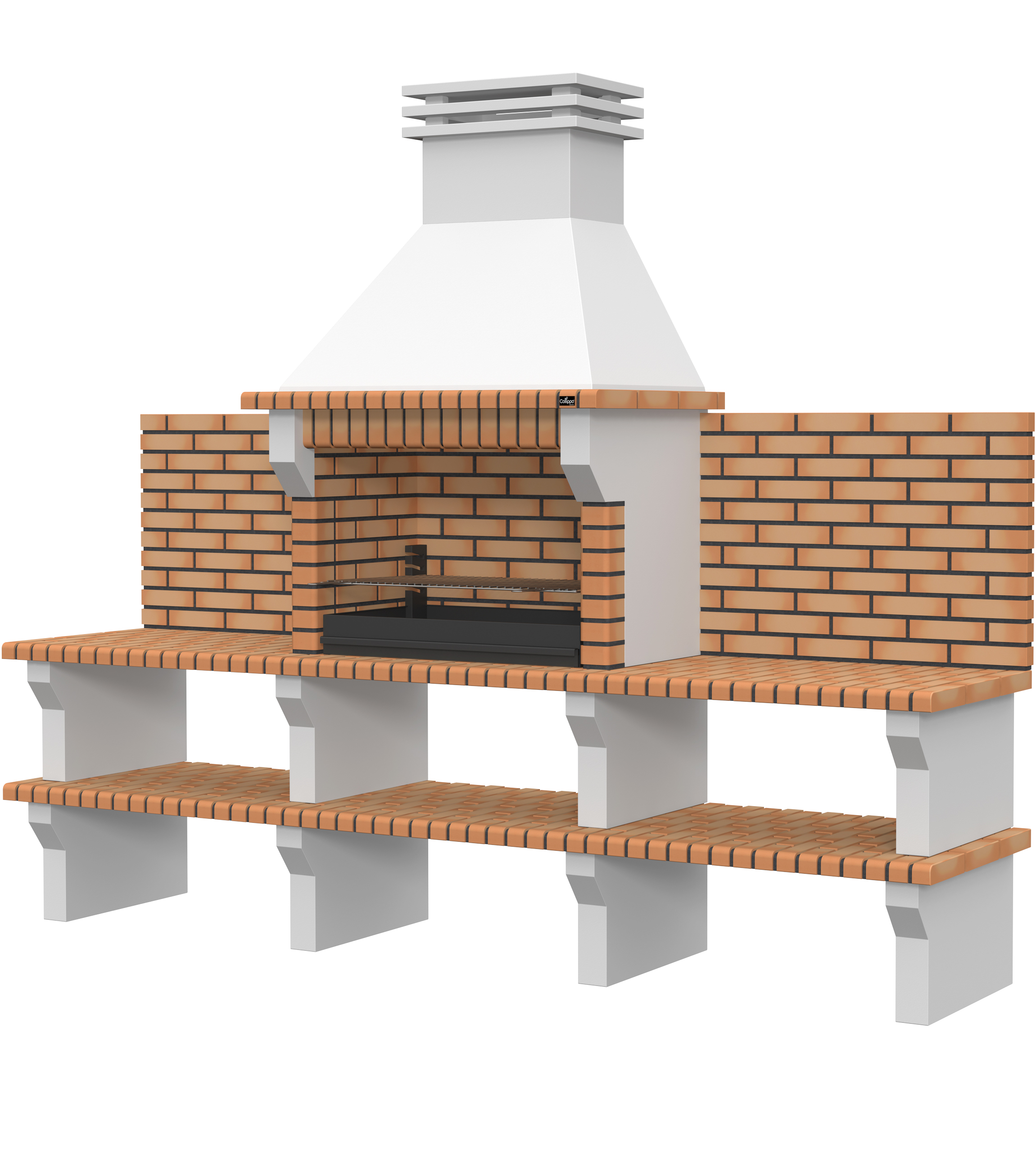Chaminé e pés em micro betão cinzento liso; laterais em micro betão cinzento texturado; zona de fogo em tijolo e cimento refractário.