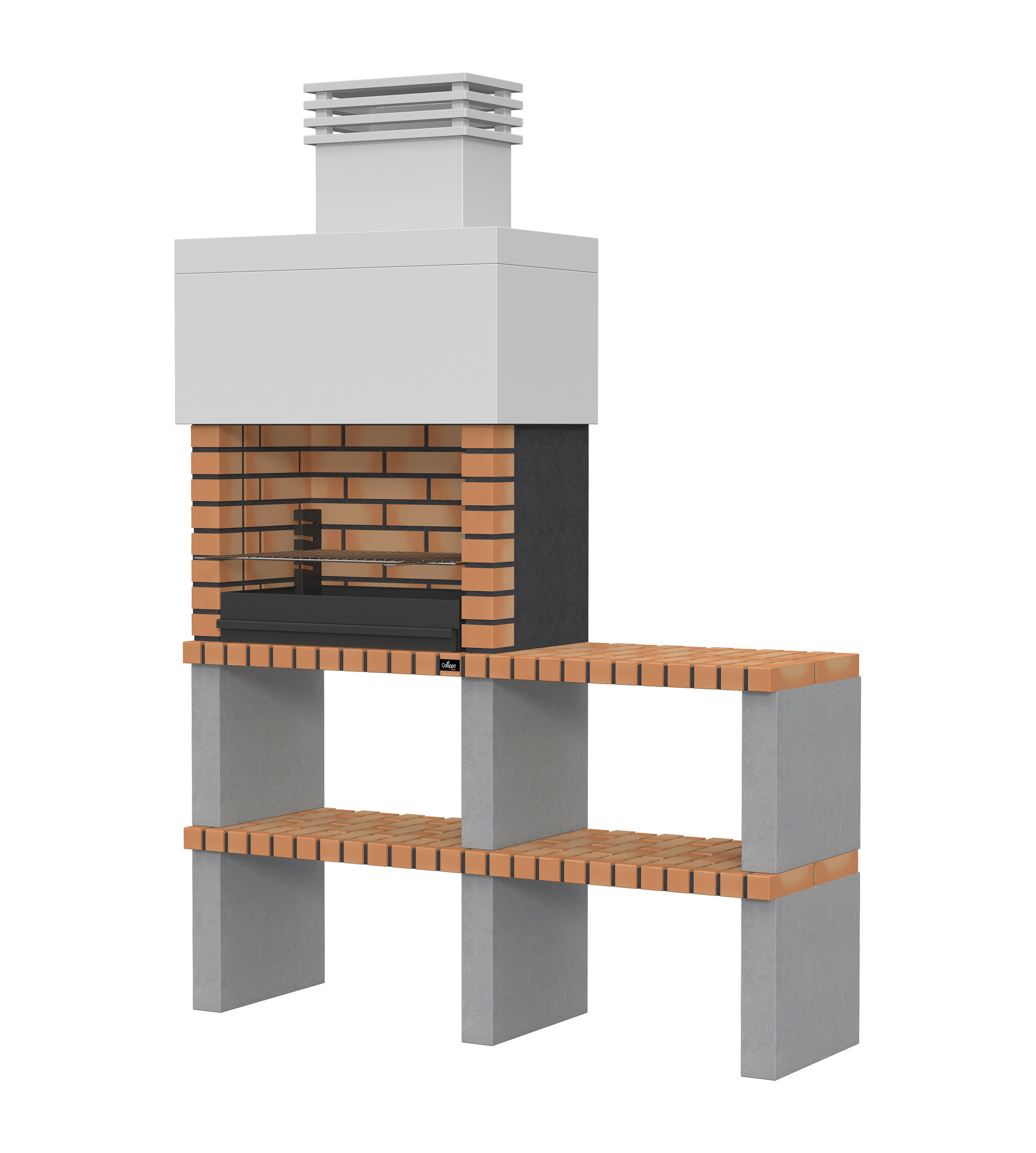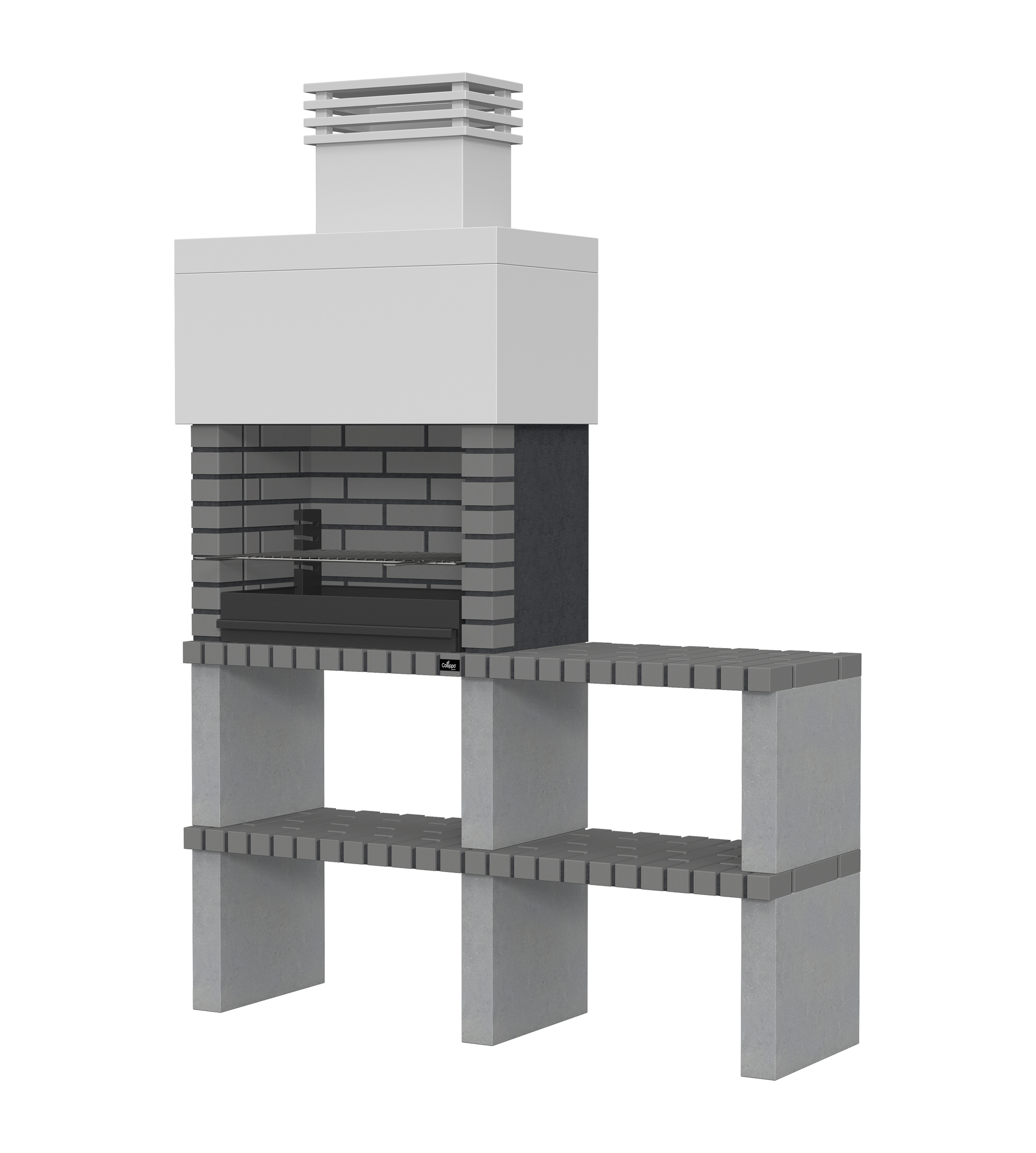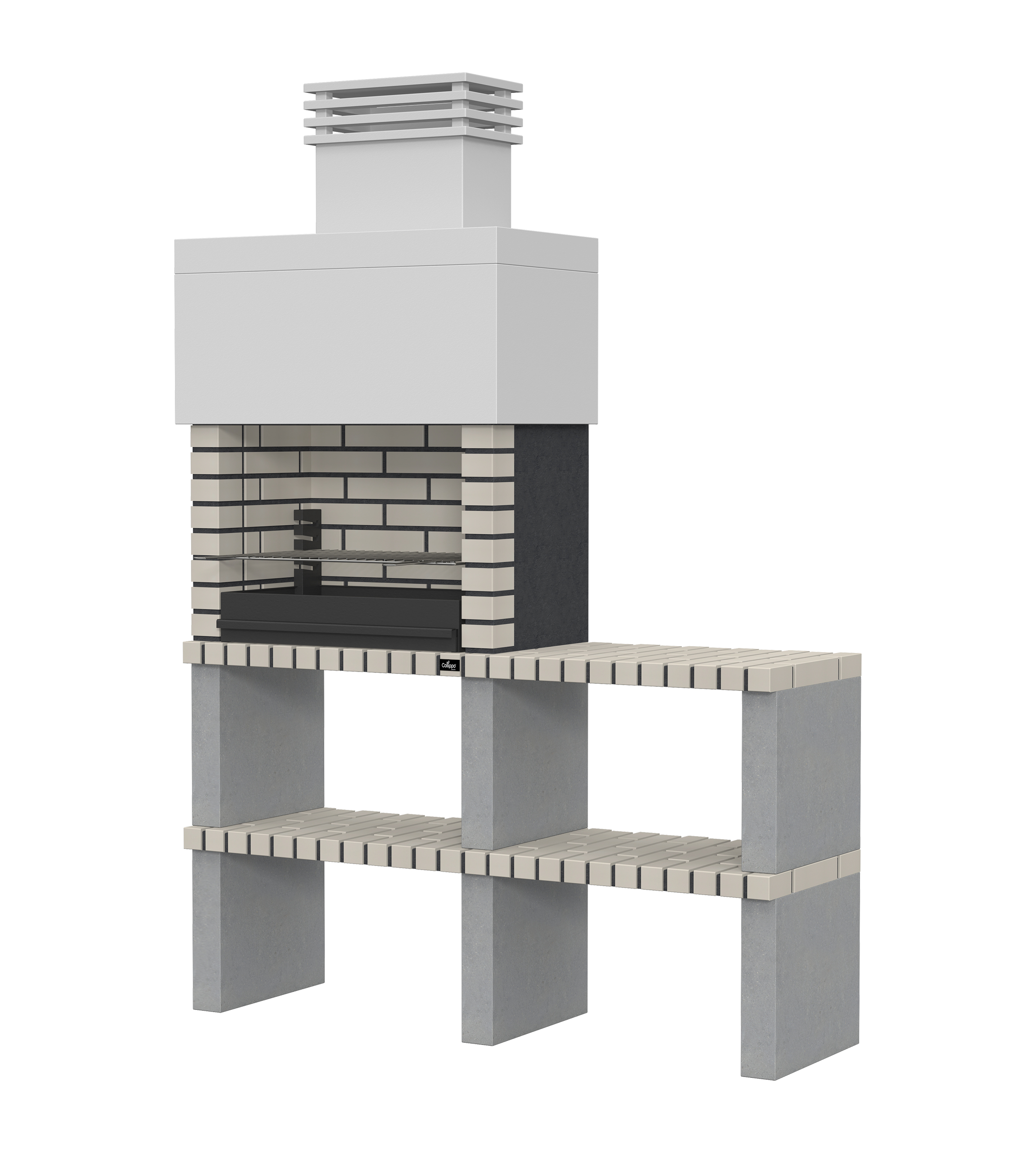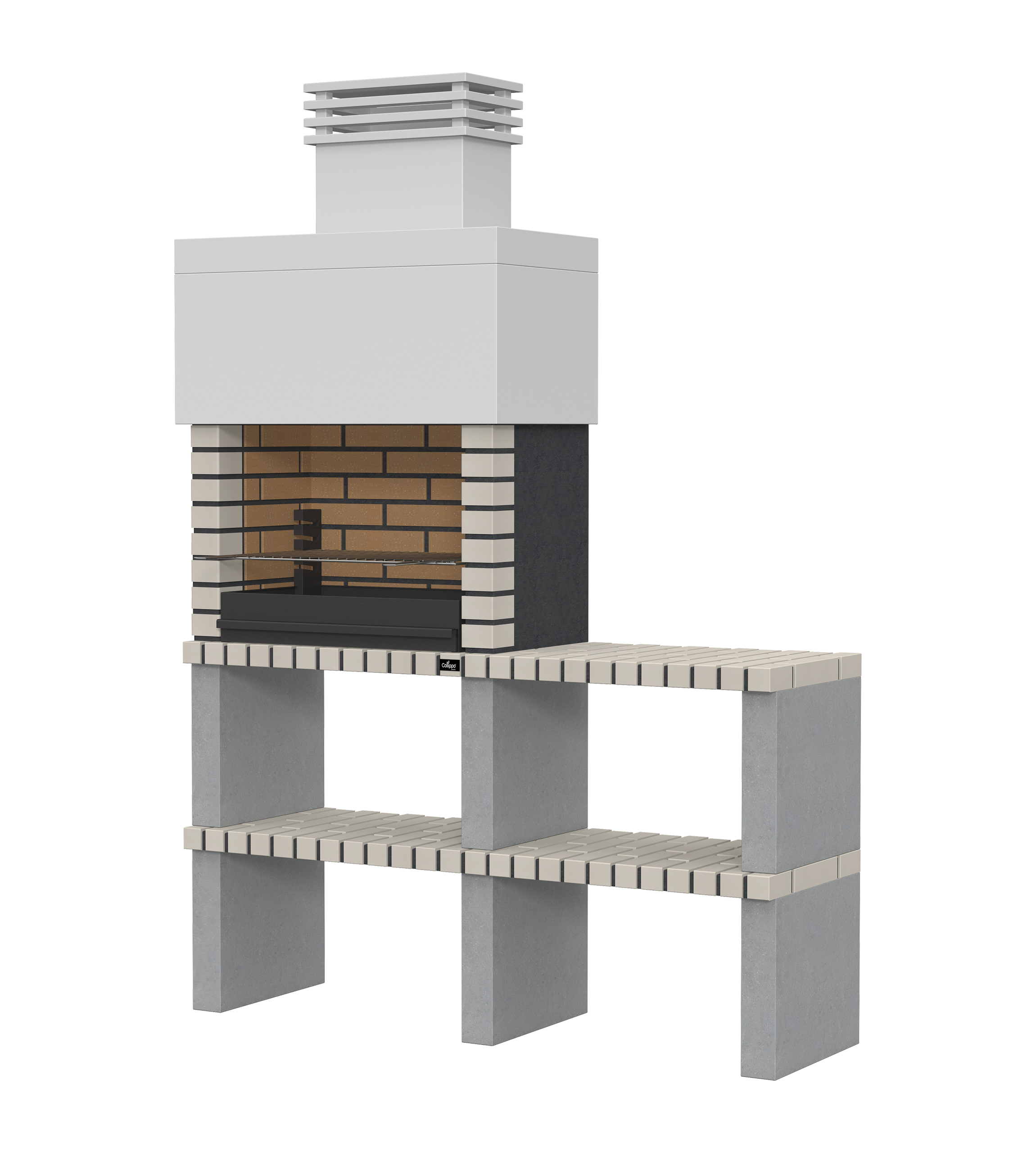 Micro betão liso branco; laterais e pés em micro betão texturado cinzento; zona de fogo em tijolo e cimento refractário