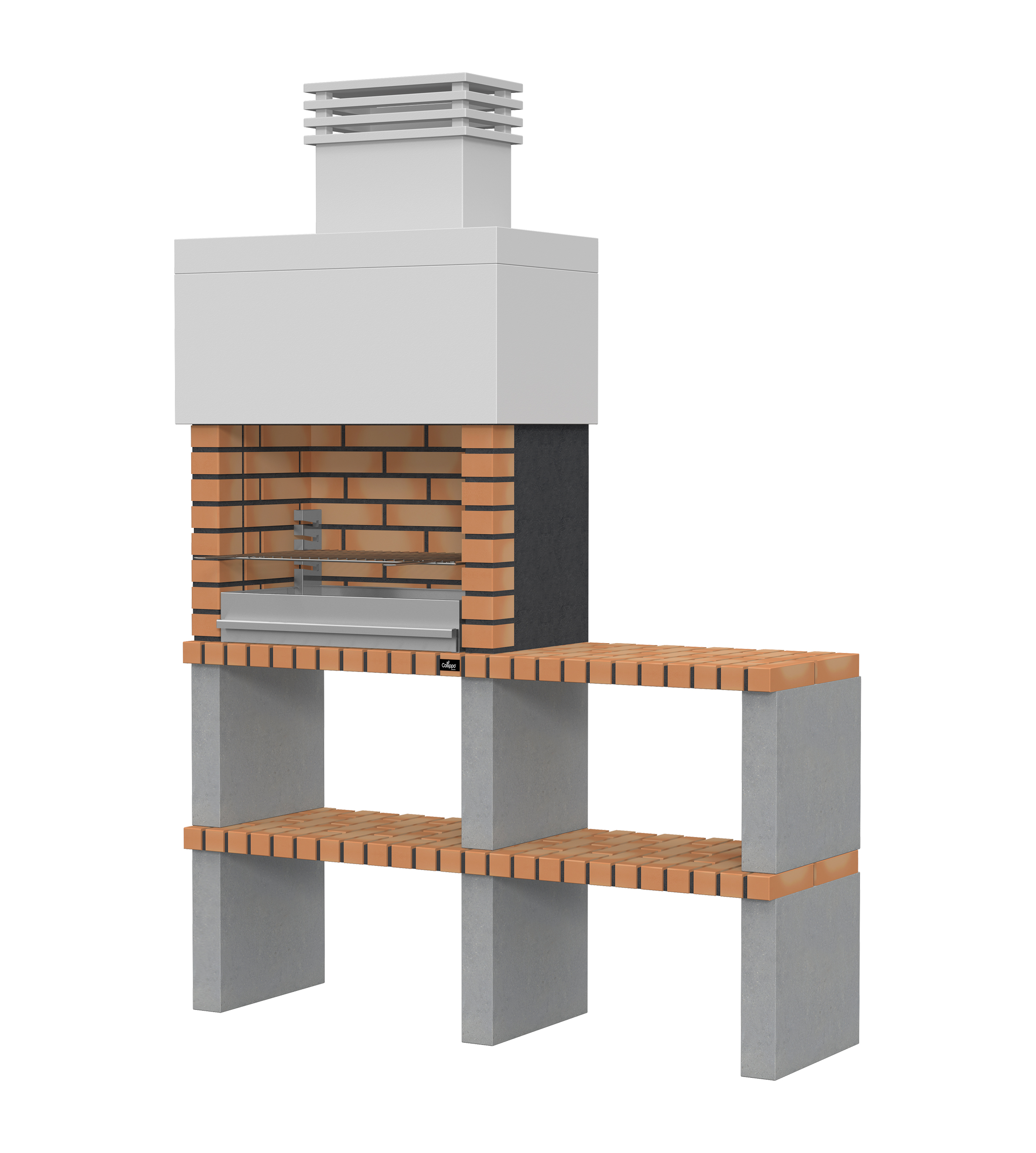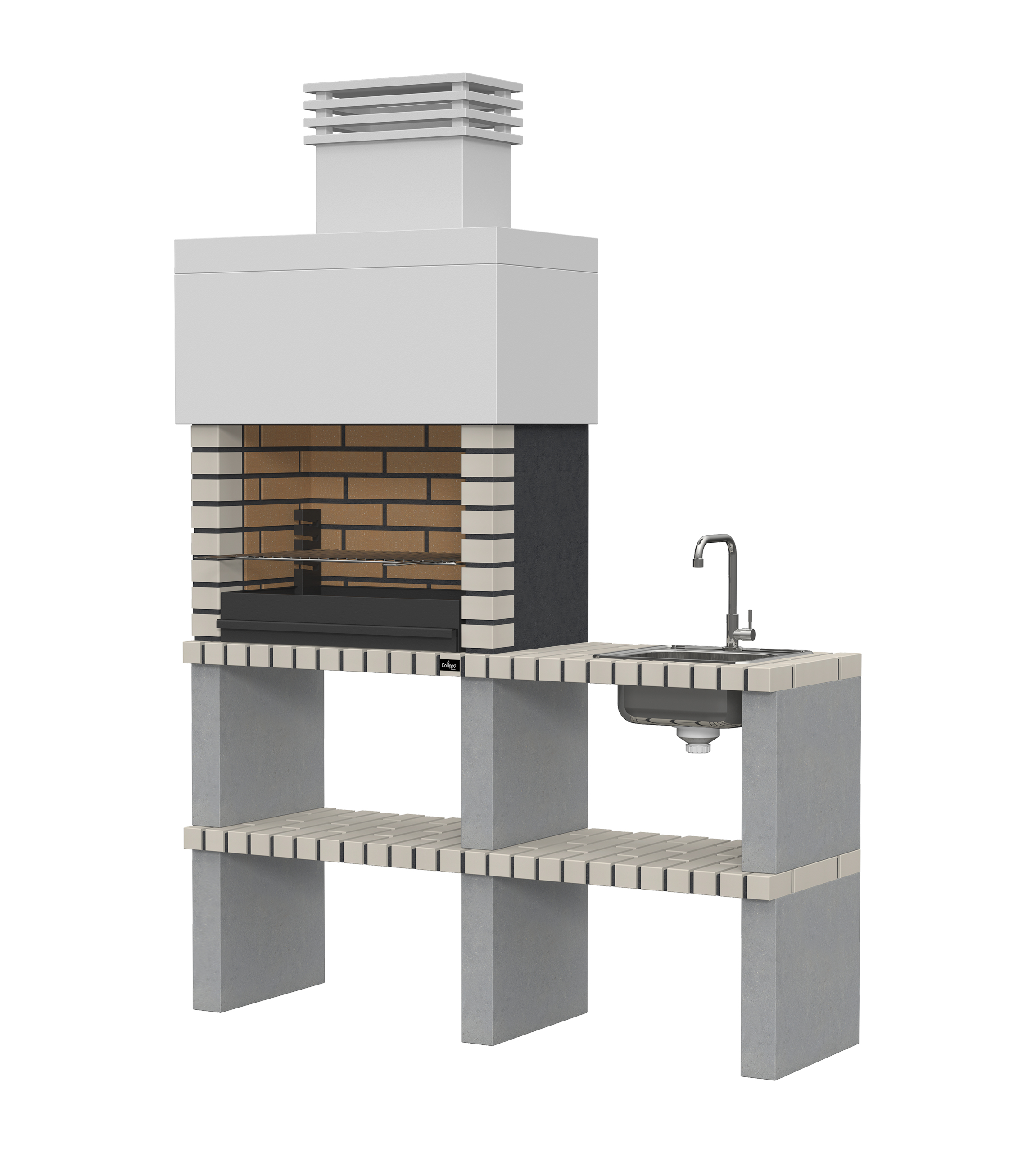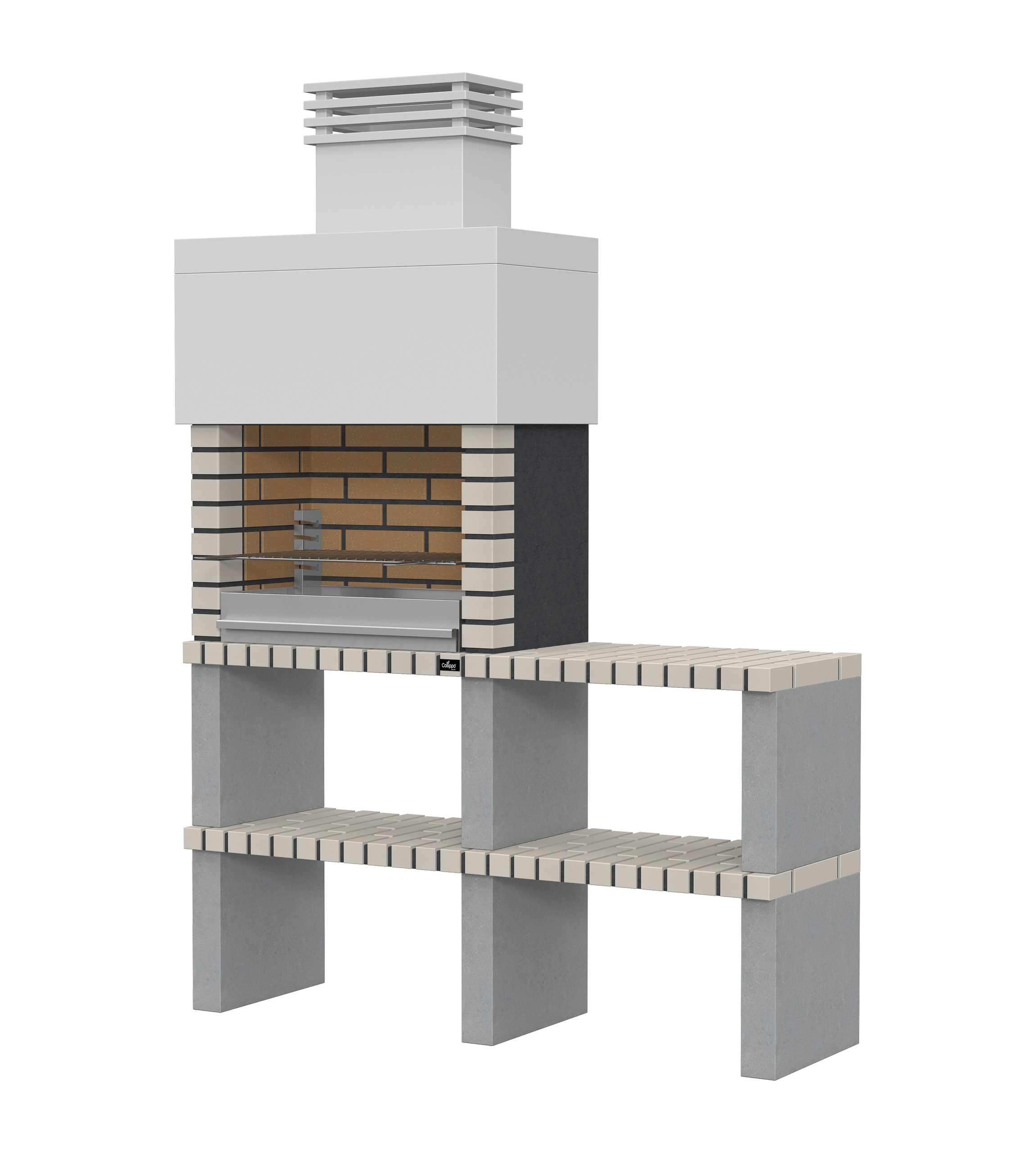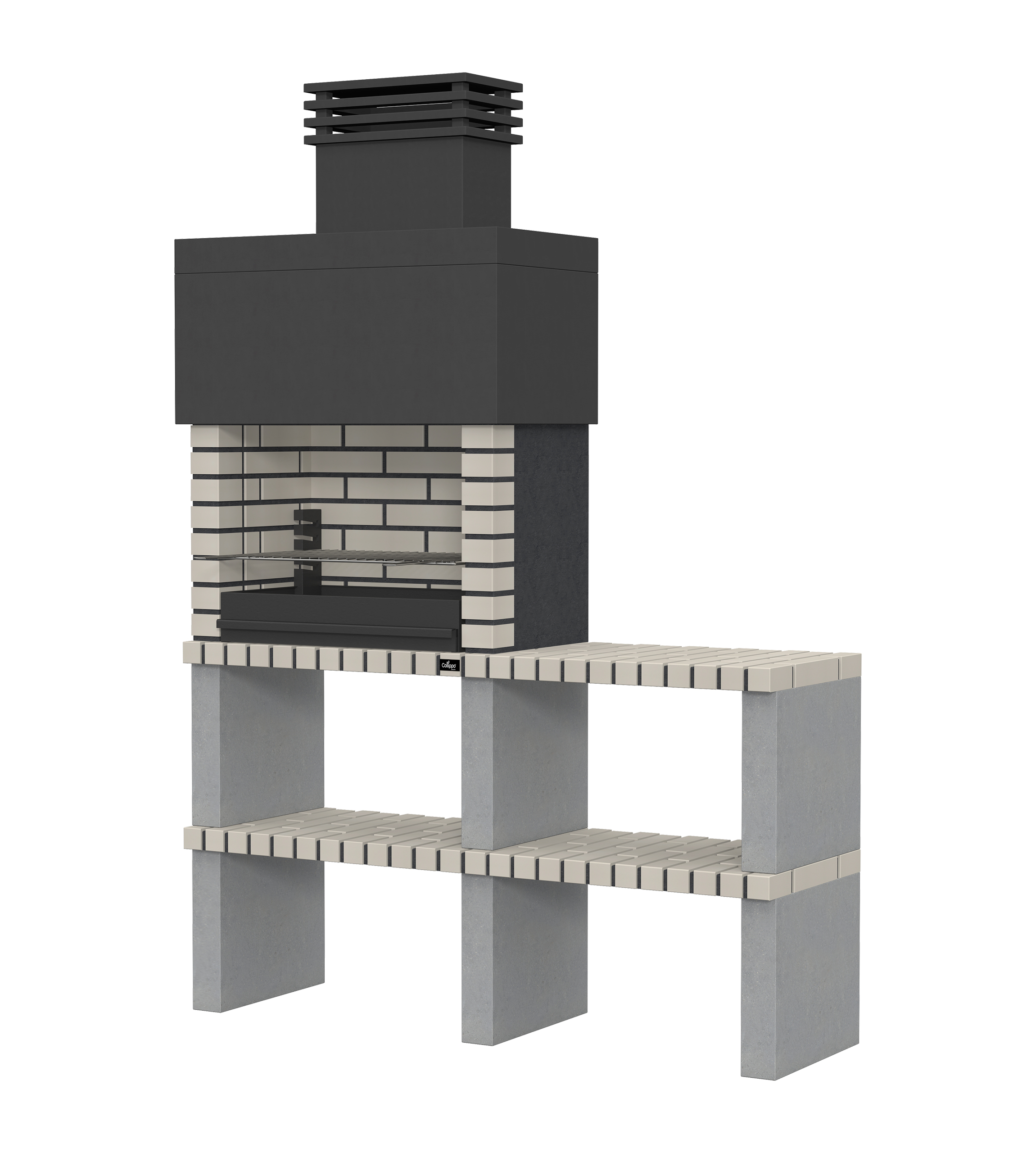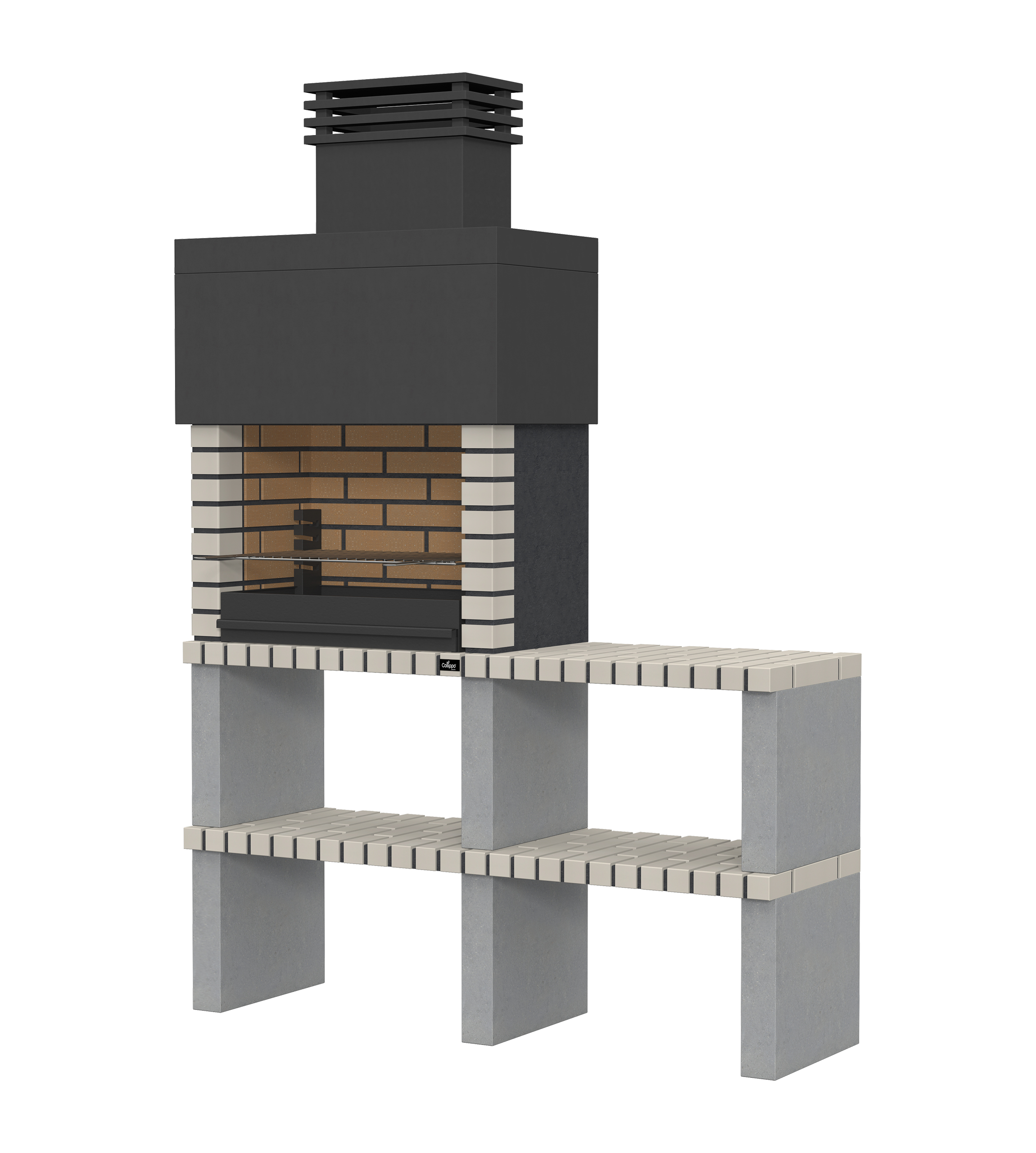 Micro betão liso branco; laterais e pés em micro betão texturado cinzento; zona de fogo em tijolo e cimento refractário