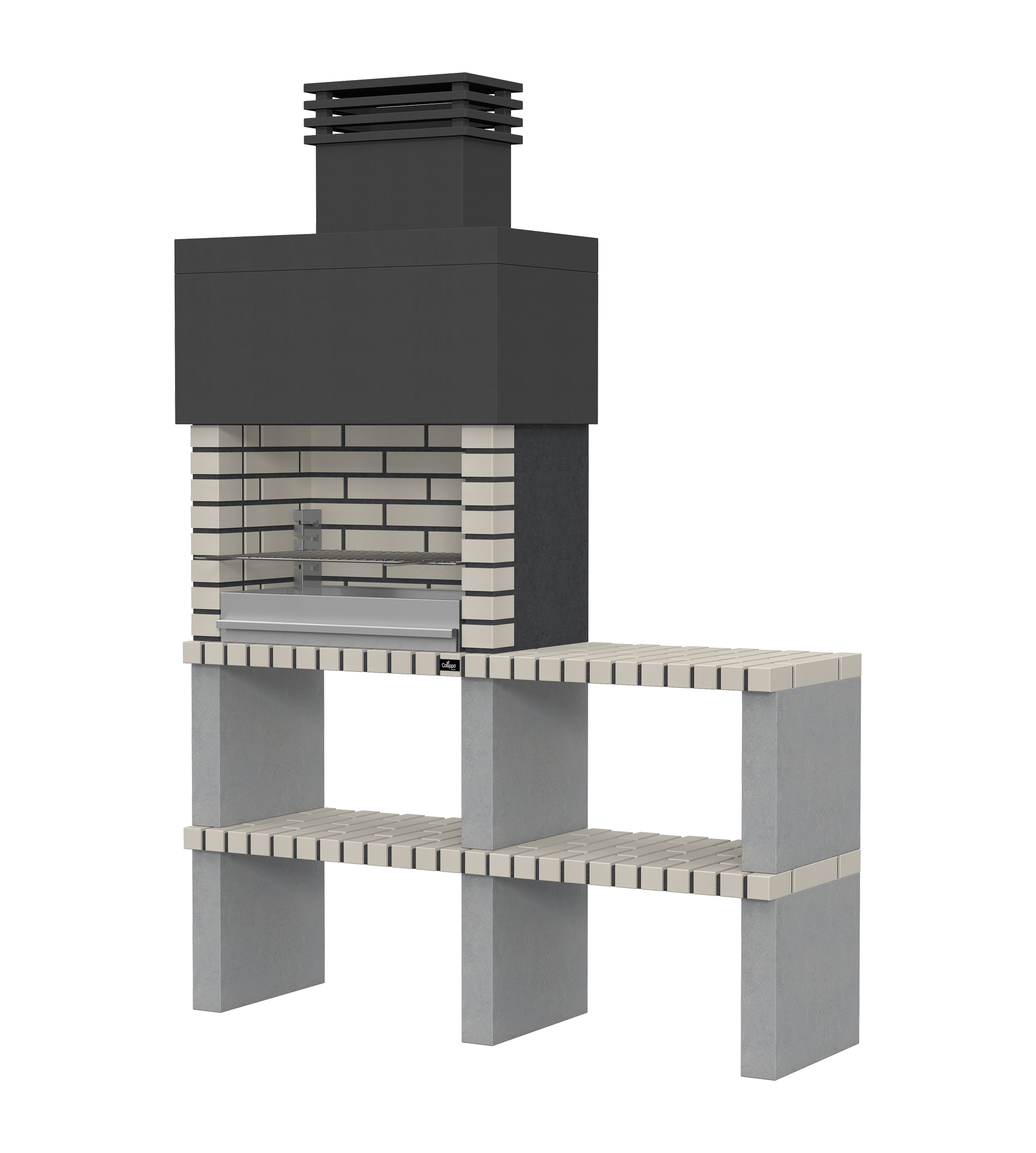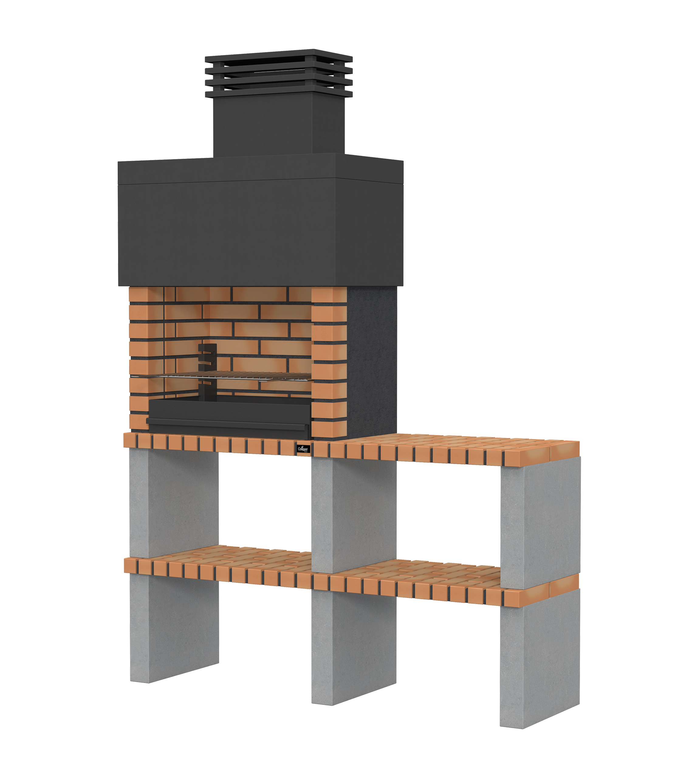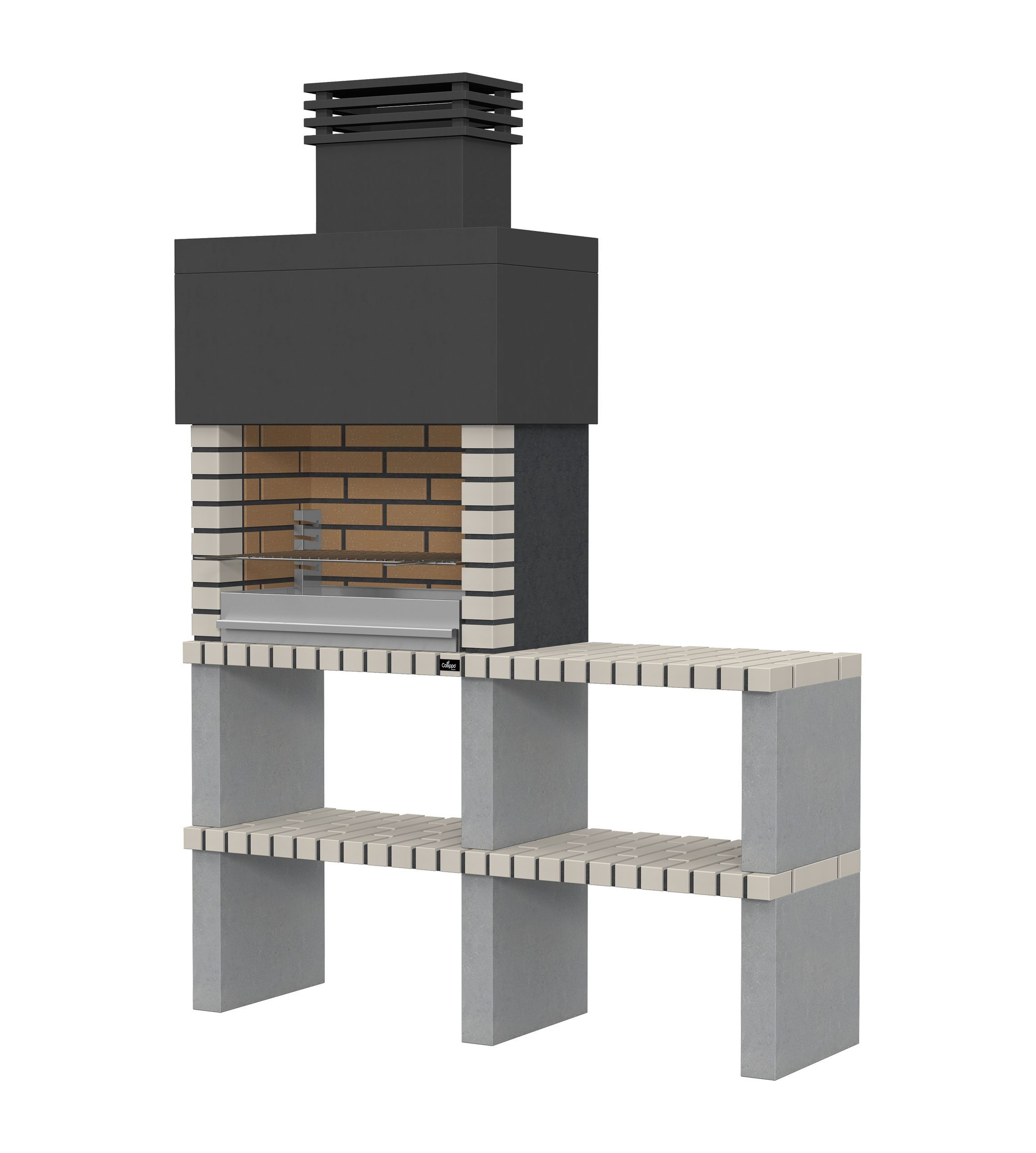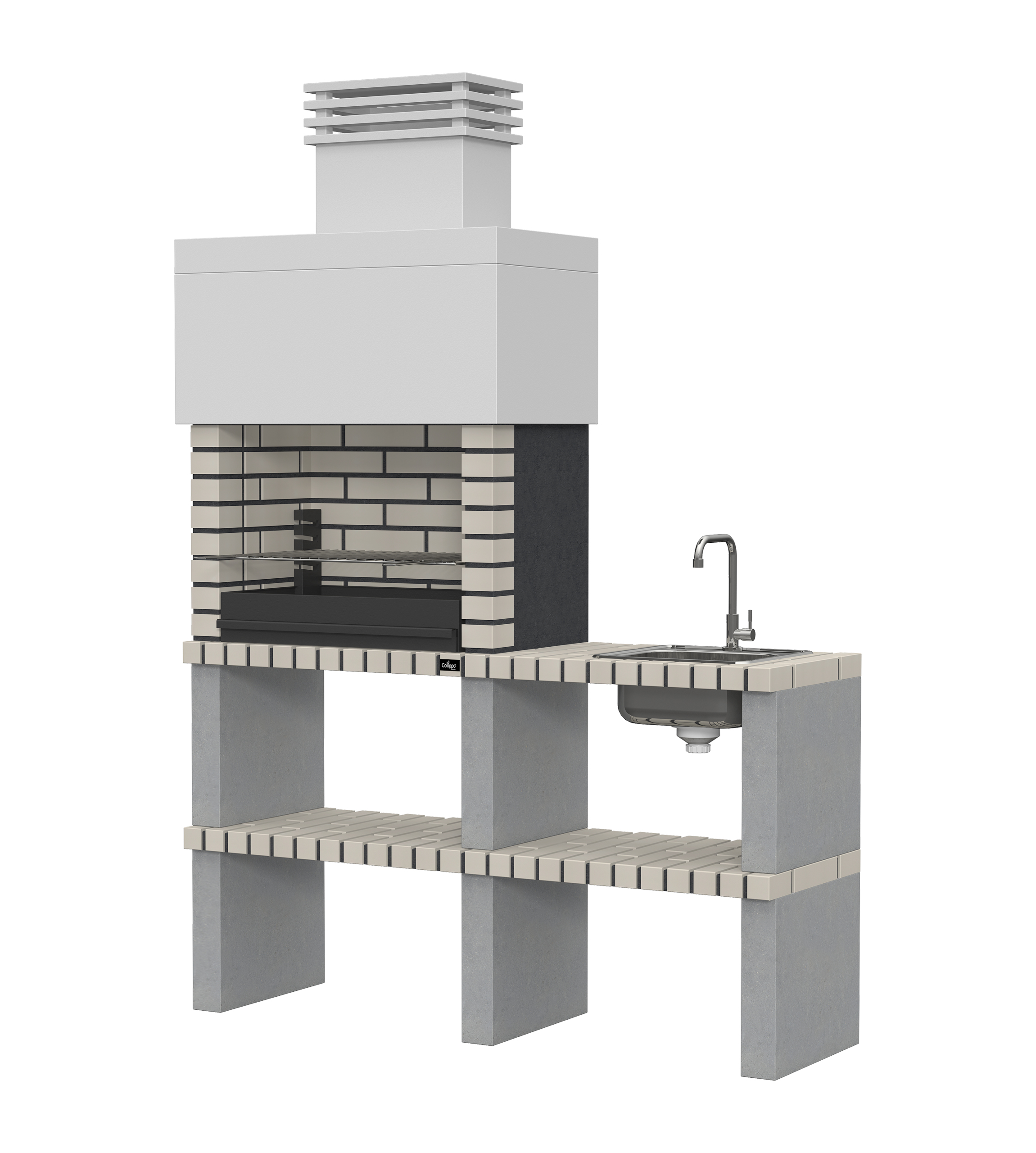Micro betão liso branco; laterais e pés em micro betão texturado cinzento; zona de fogo em tijolo e cimento refractário