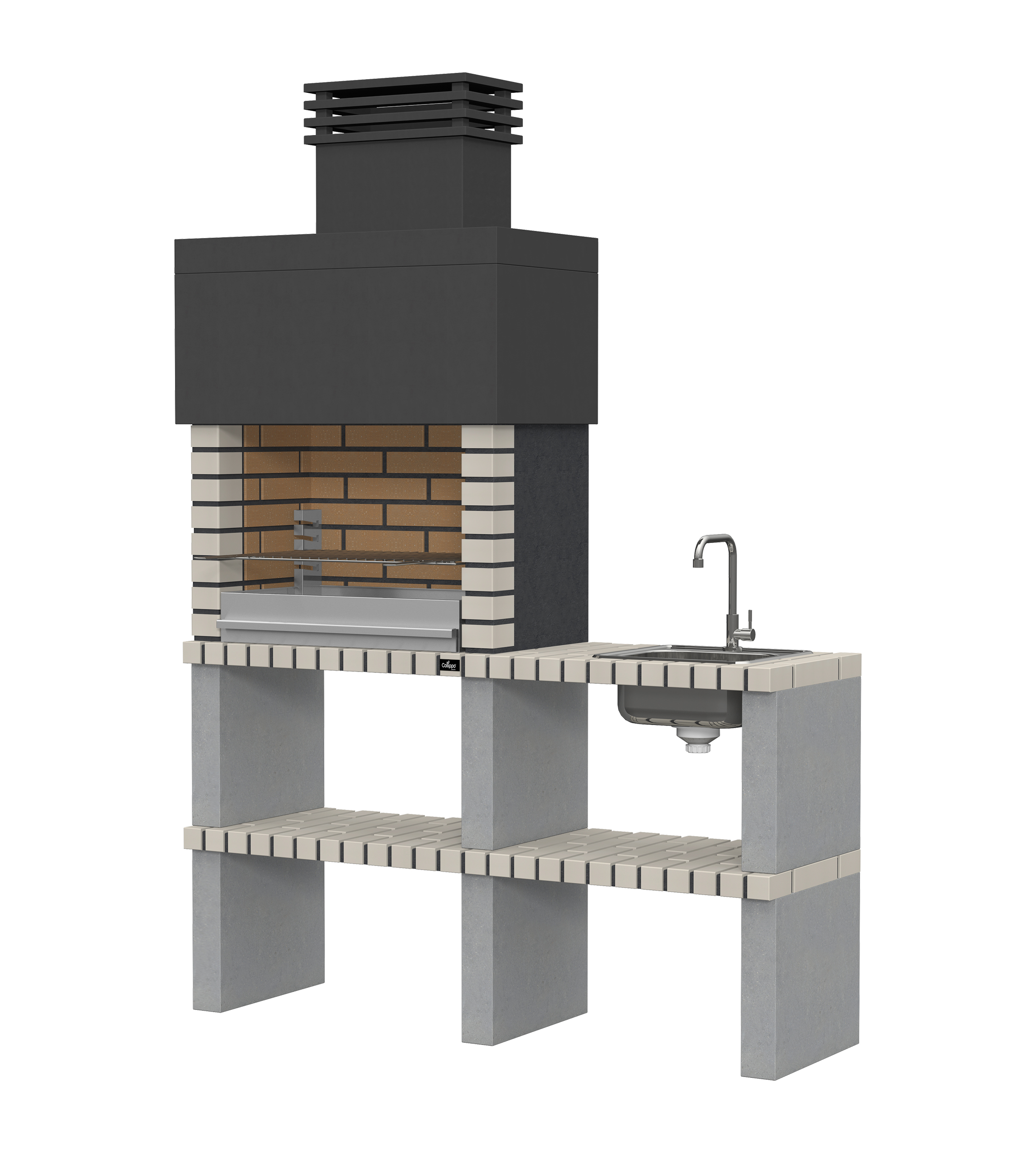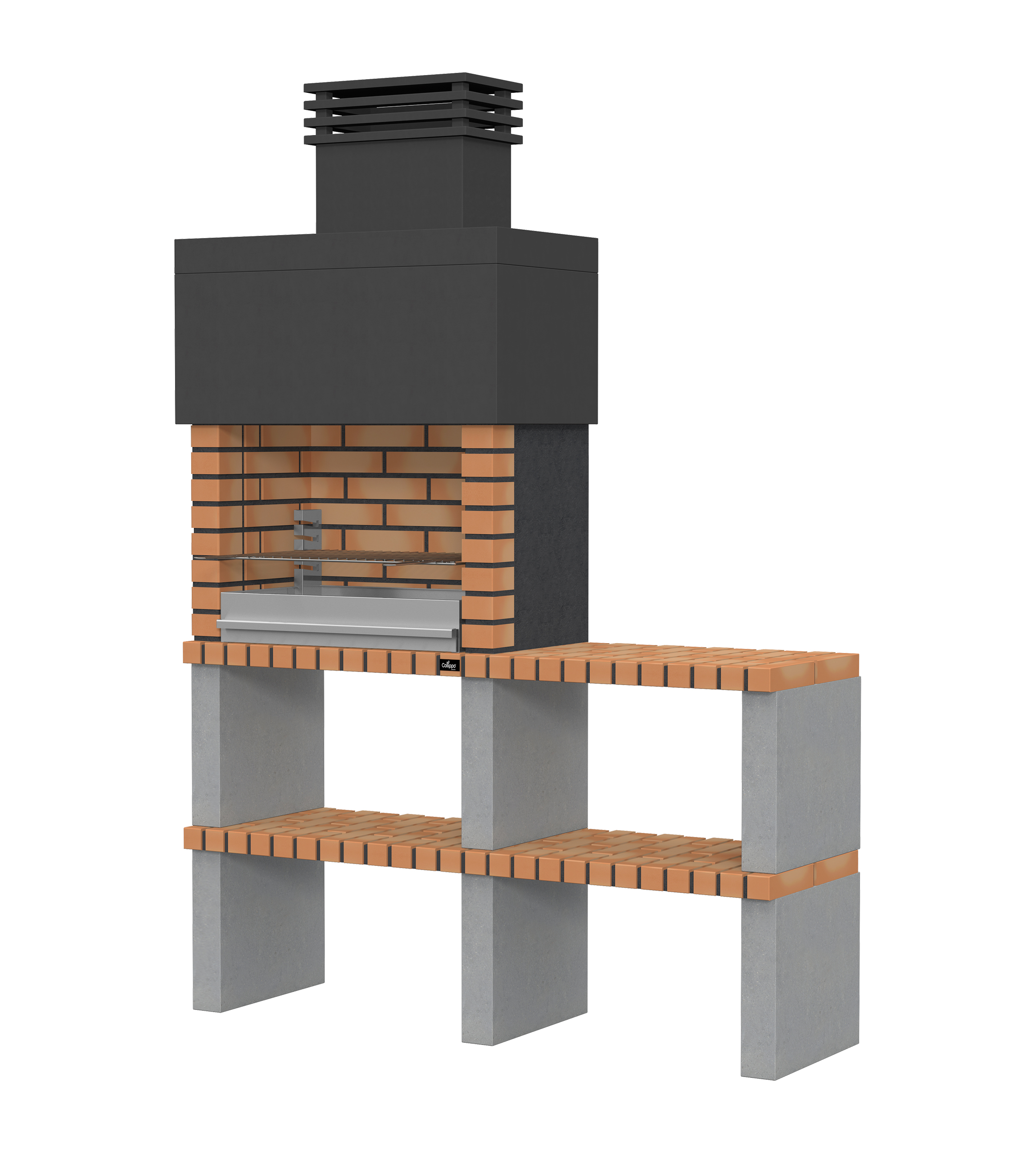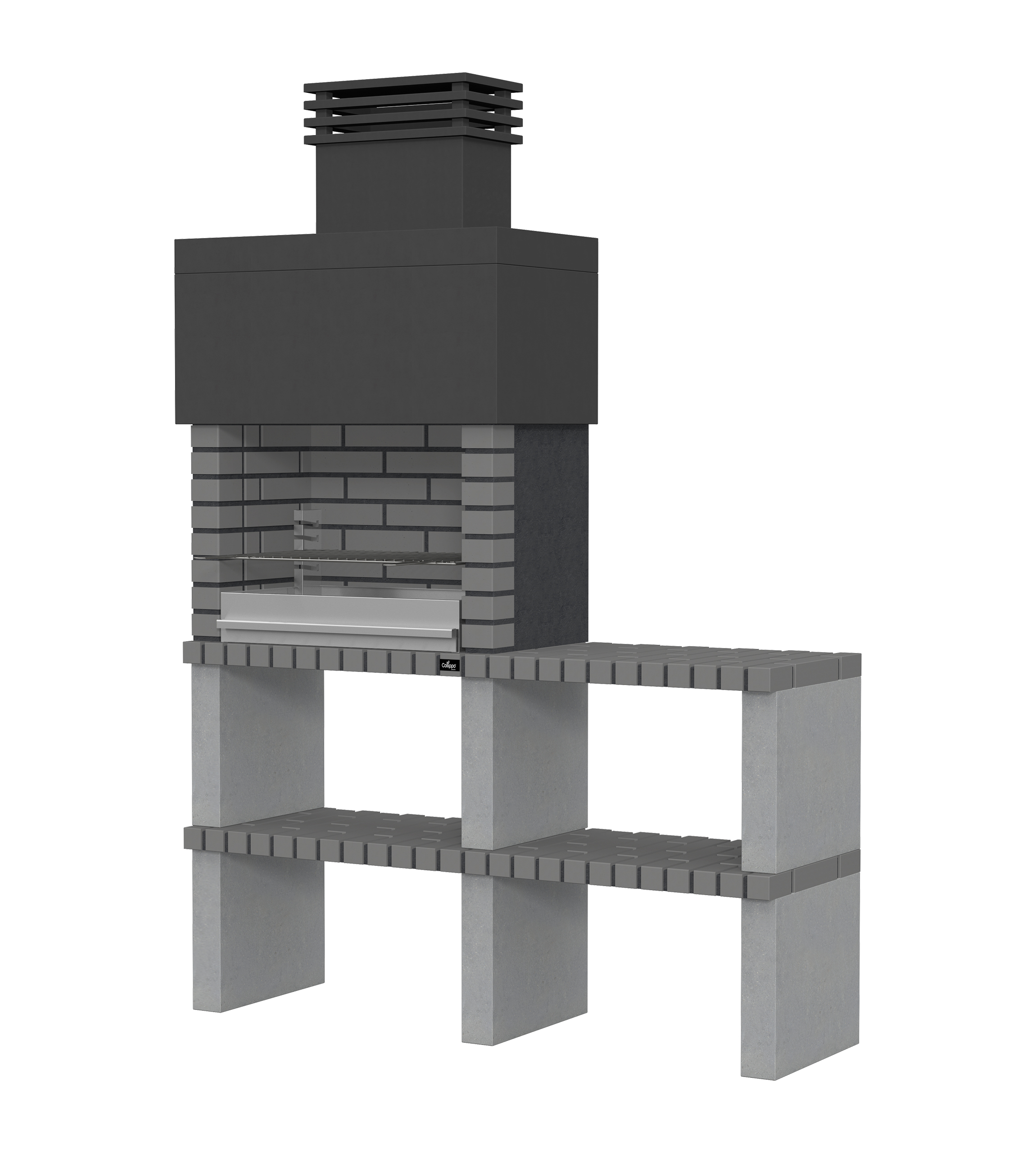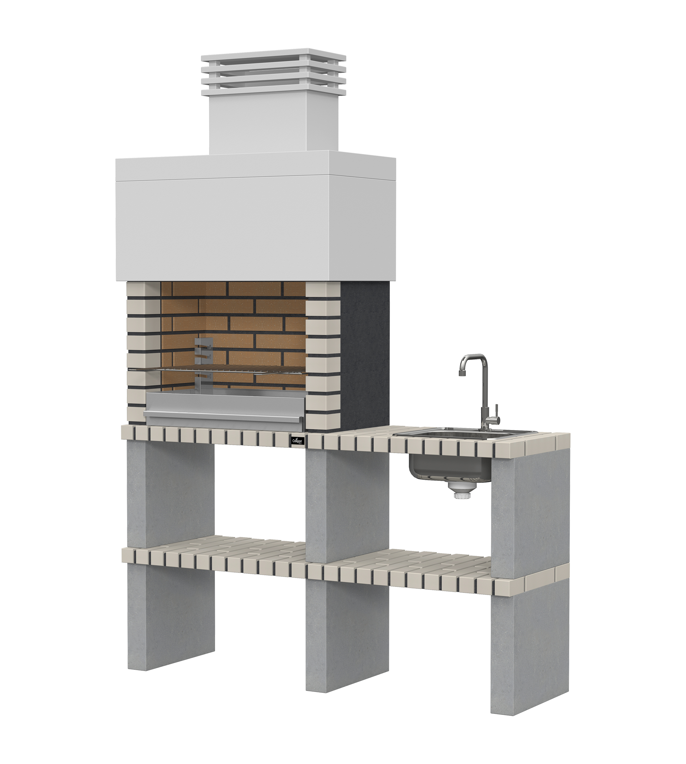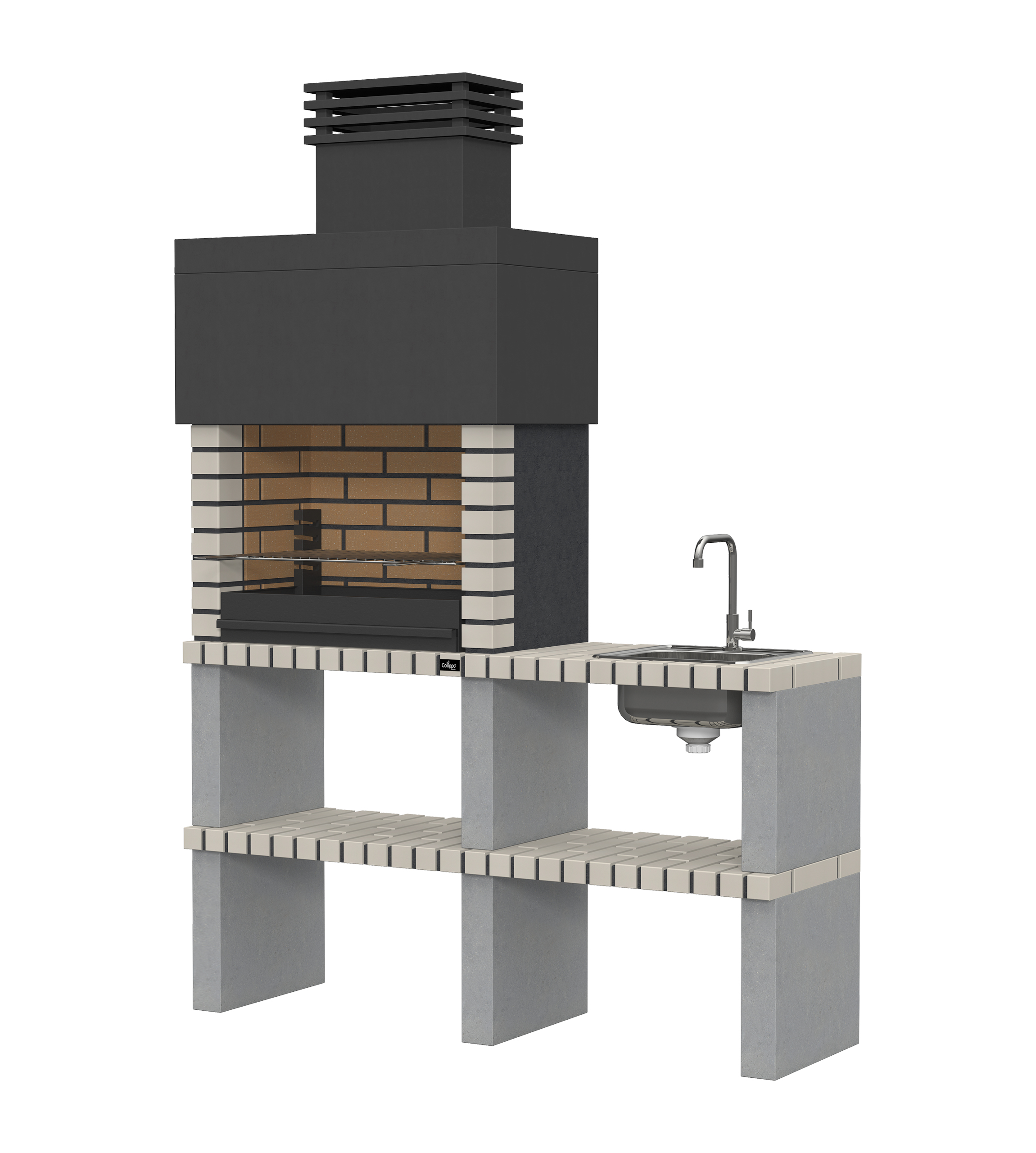 Micro betão liso branco; laterais e pés em micro betão texturado cinzento; zona de fogo em tijolo e cimento refractário