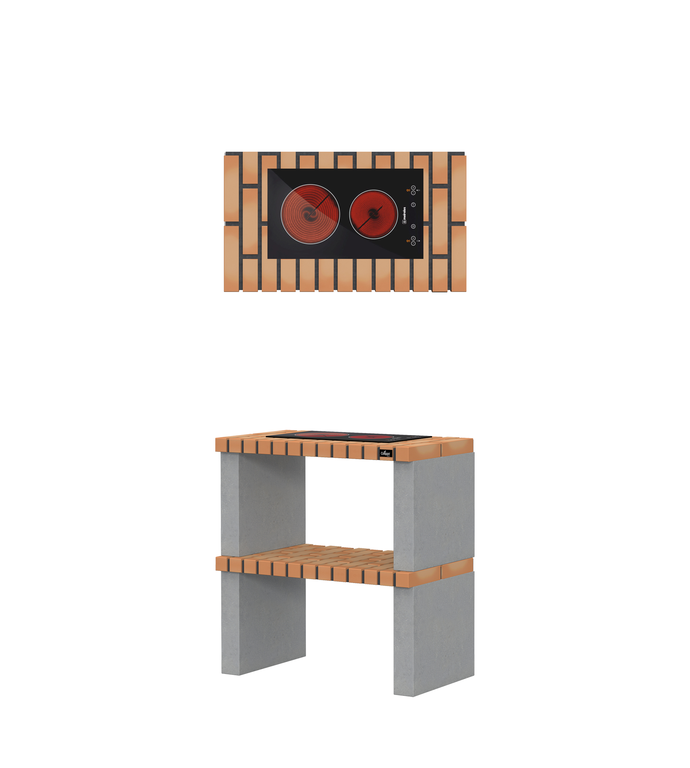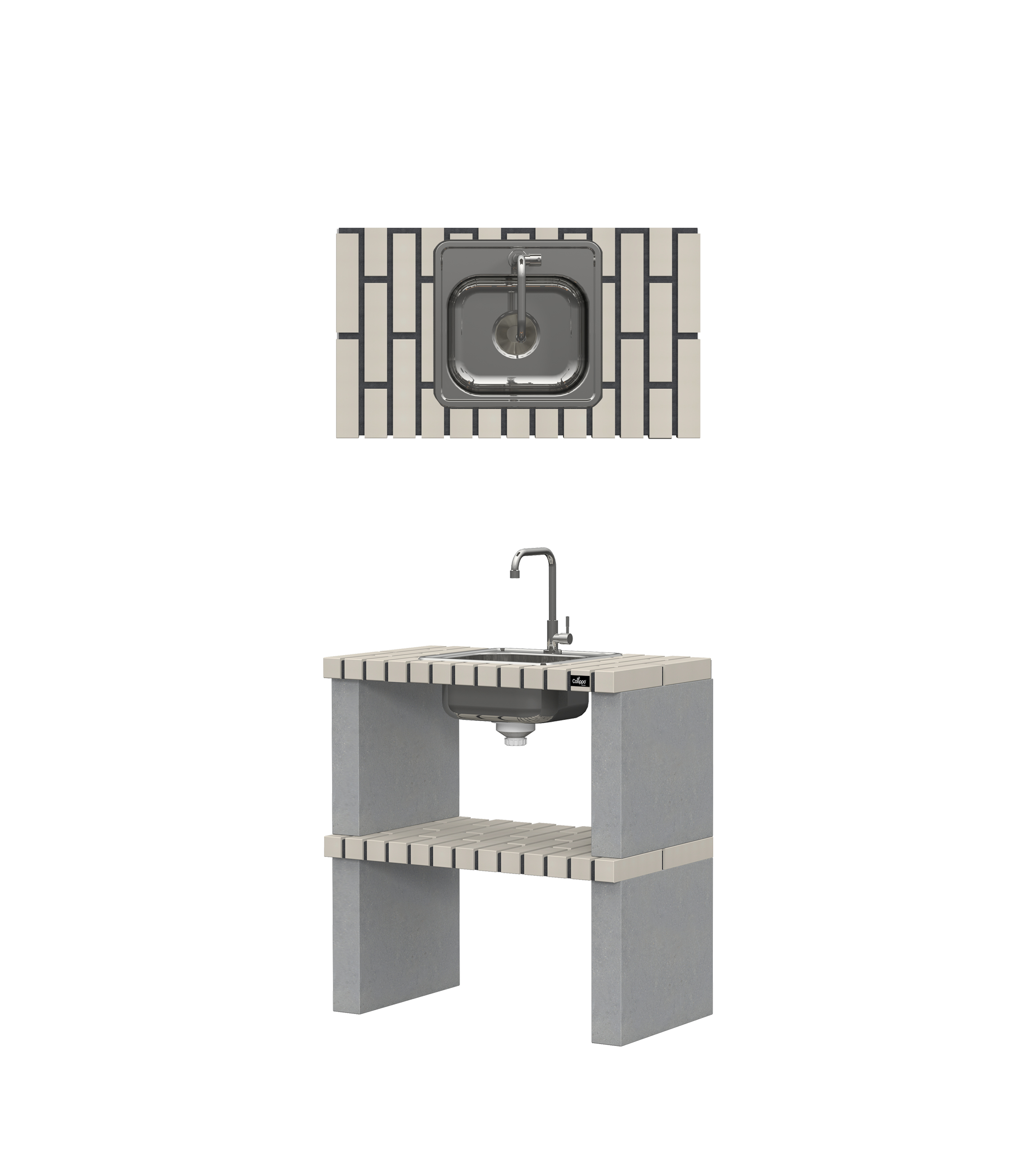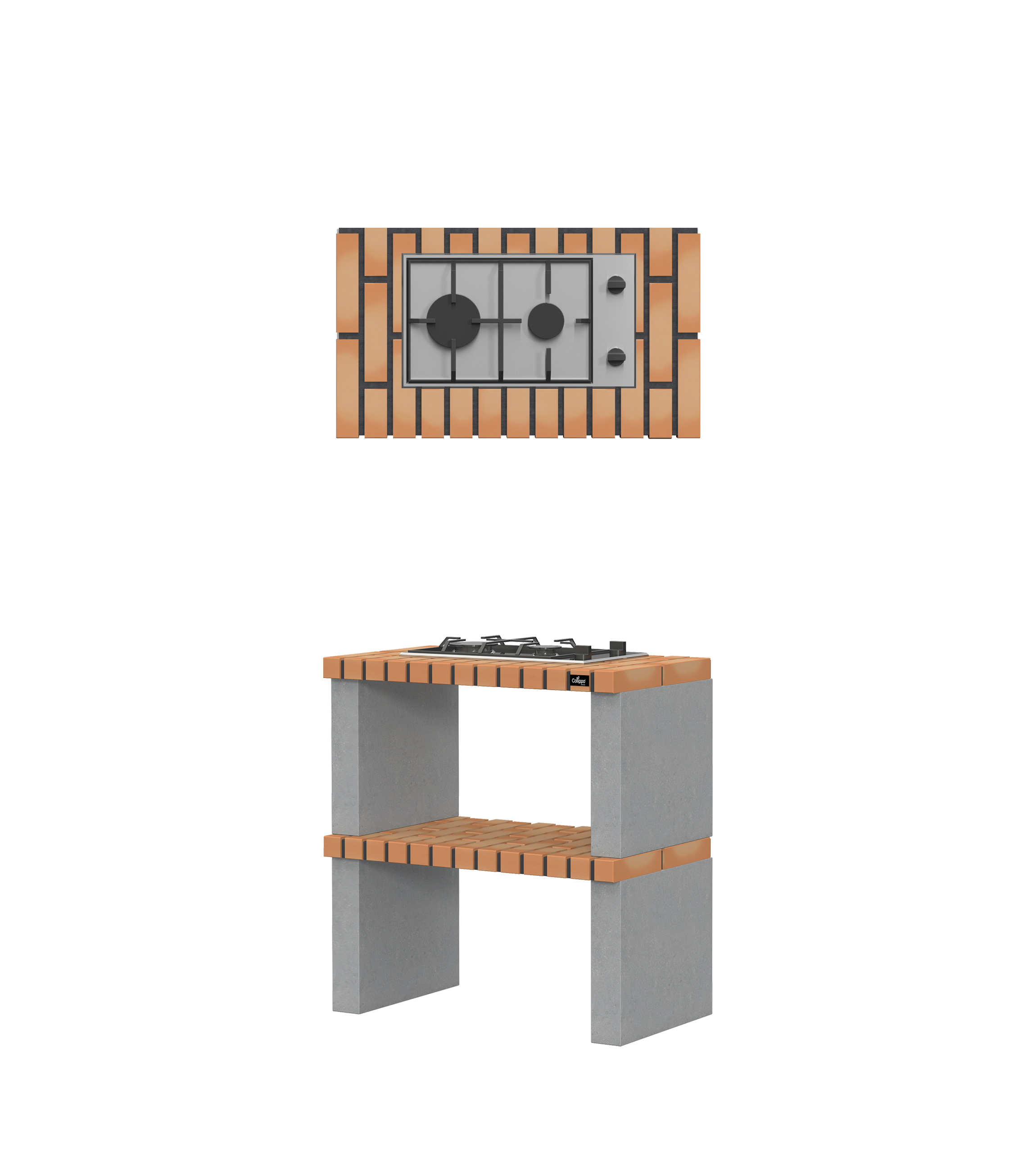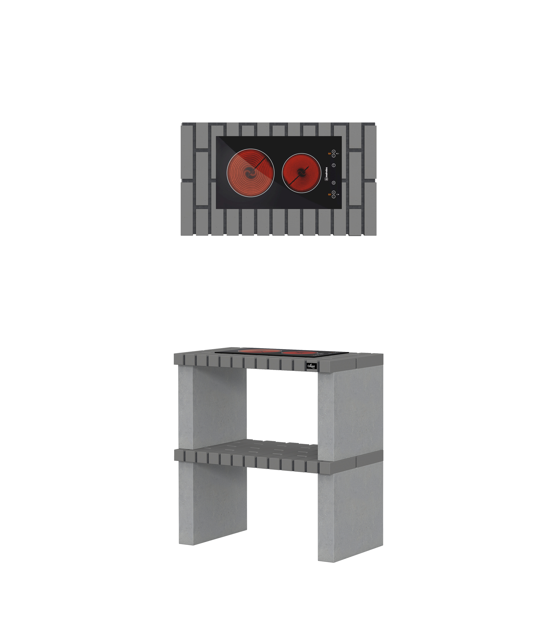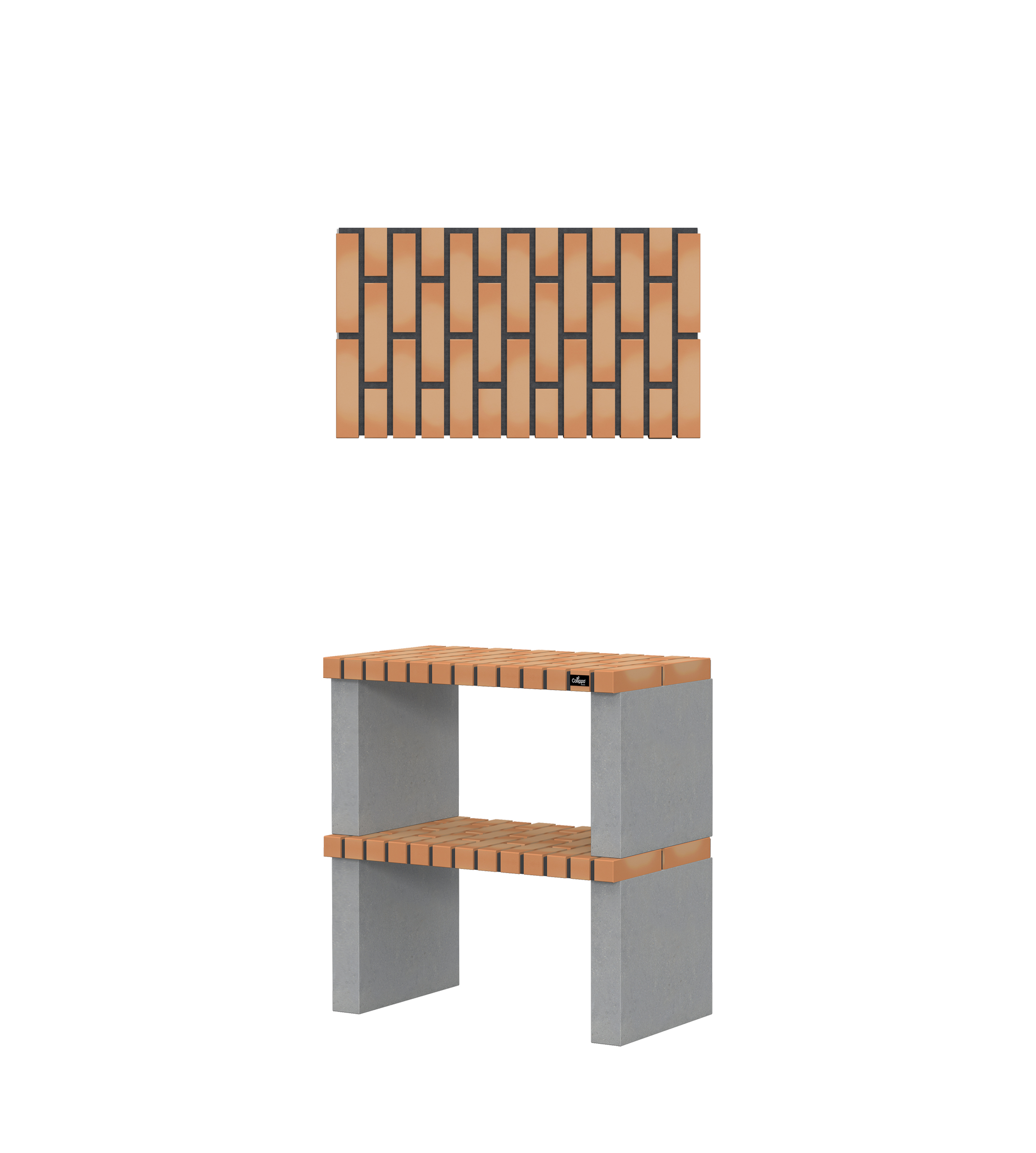 Micro betão texturado cinzento; bancadas em tijolo